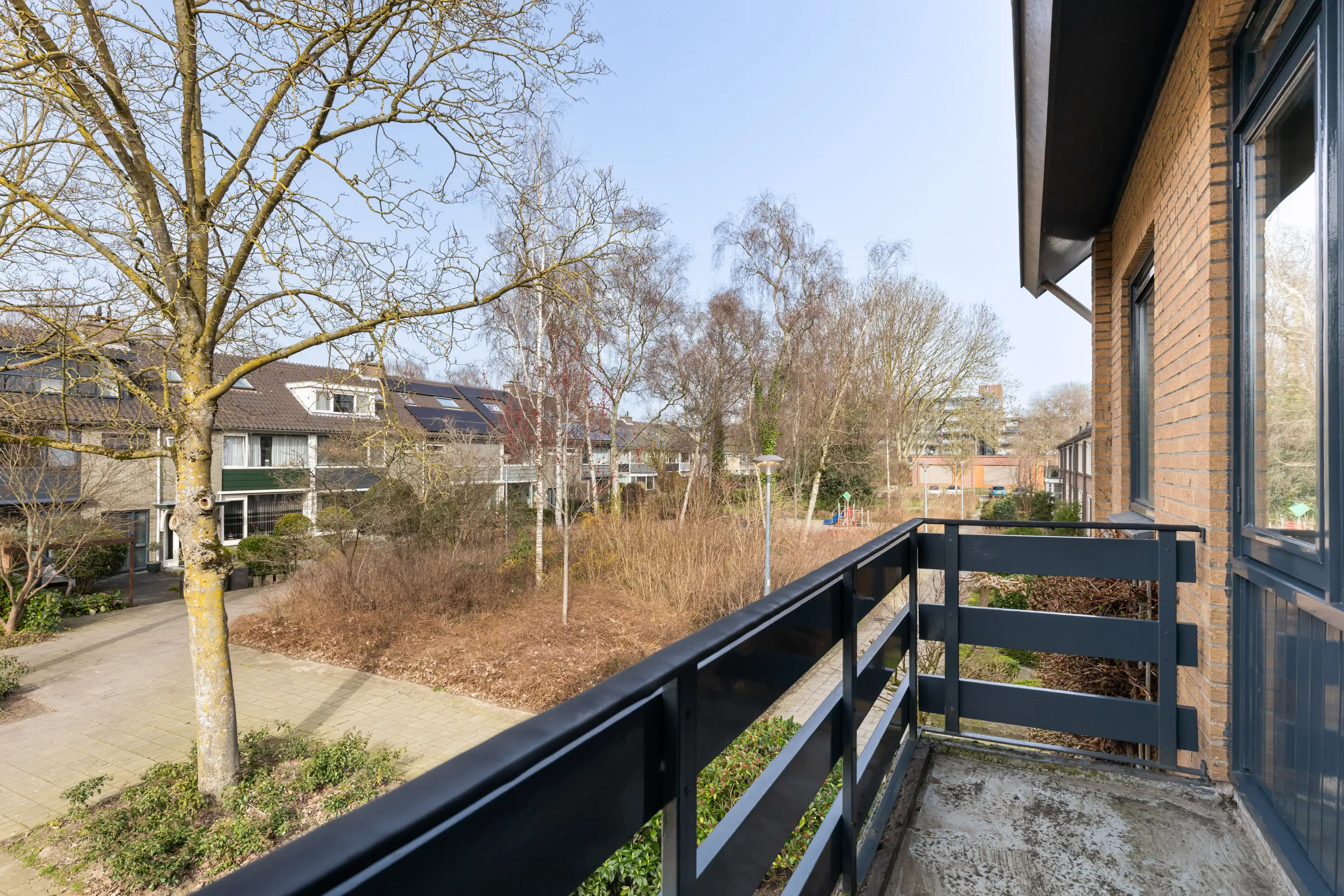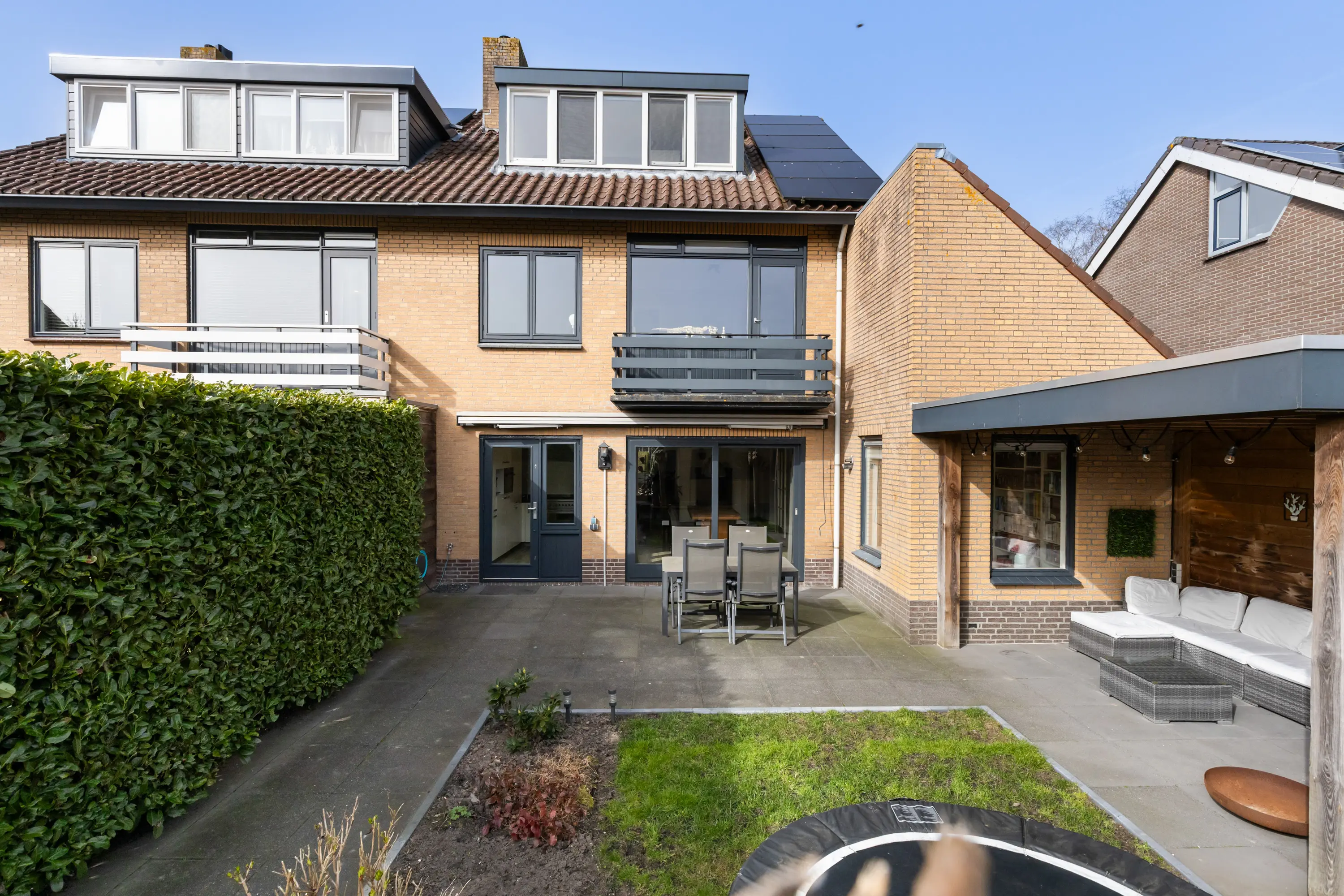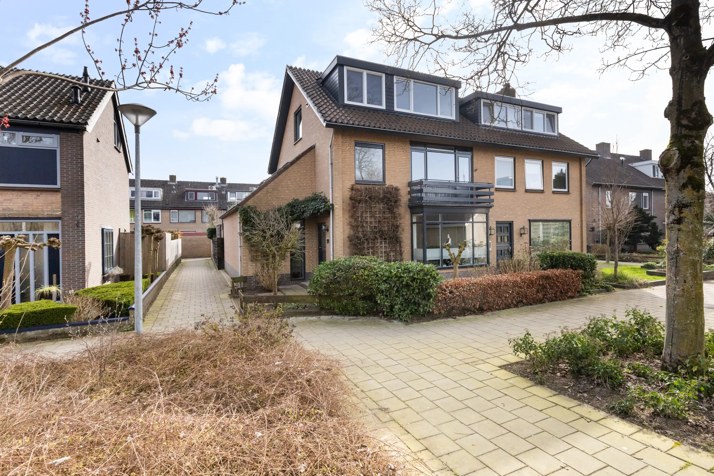 Op een mooie, rustige, groene en kindvriendelijke locatie gelegen ruime ‘2-onder-1-kap’ woning met twee-laagse aanbouw, erker, twee balkons, ruime garage, voortuin en royale achtertuin met overkapping en veel privacy.