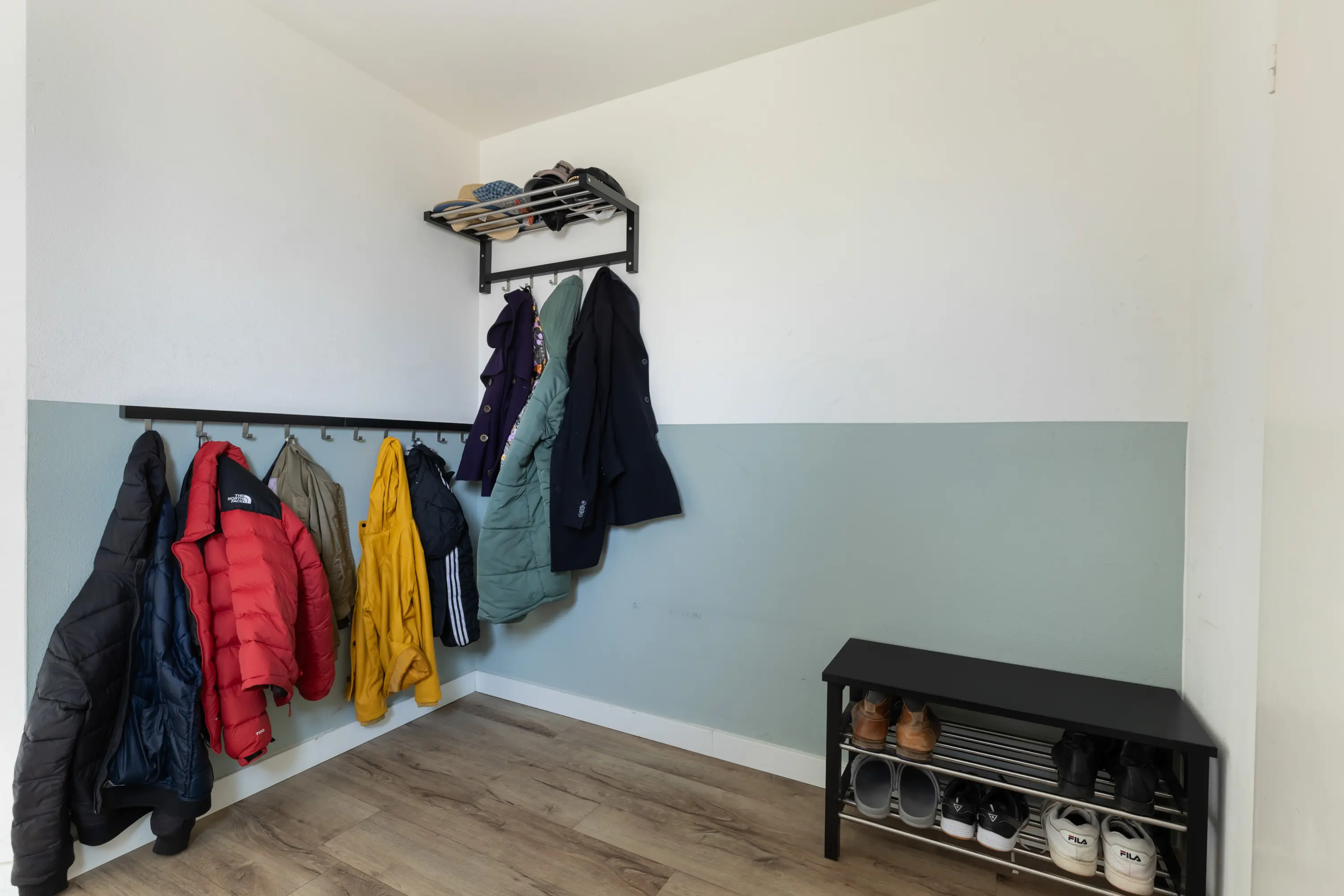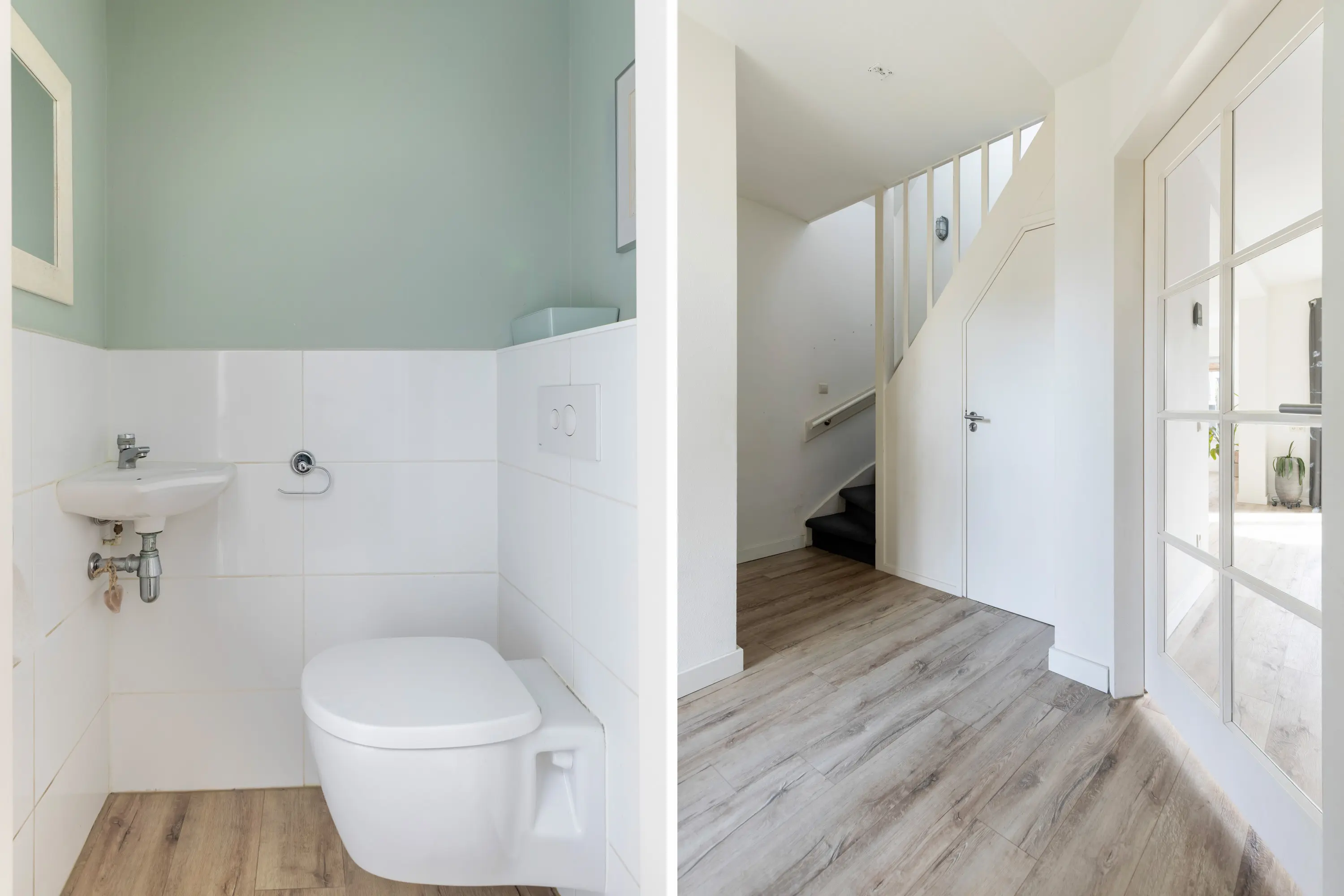 Via de ruime hal met vernieuwde meterkast en glasvezelaansluiting betreedt u de woning. In de hal bevinden zich tevens een modern toilet met fontein en mechanische afzuiging, een praktische (voorraad)trapkast en een bergkast met de aansluiting voor de vloerverwarming, die over de gehele begane grond is aangelegd.