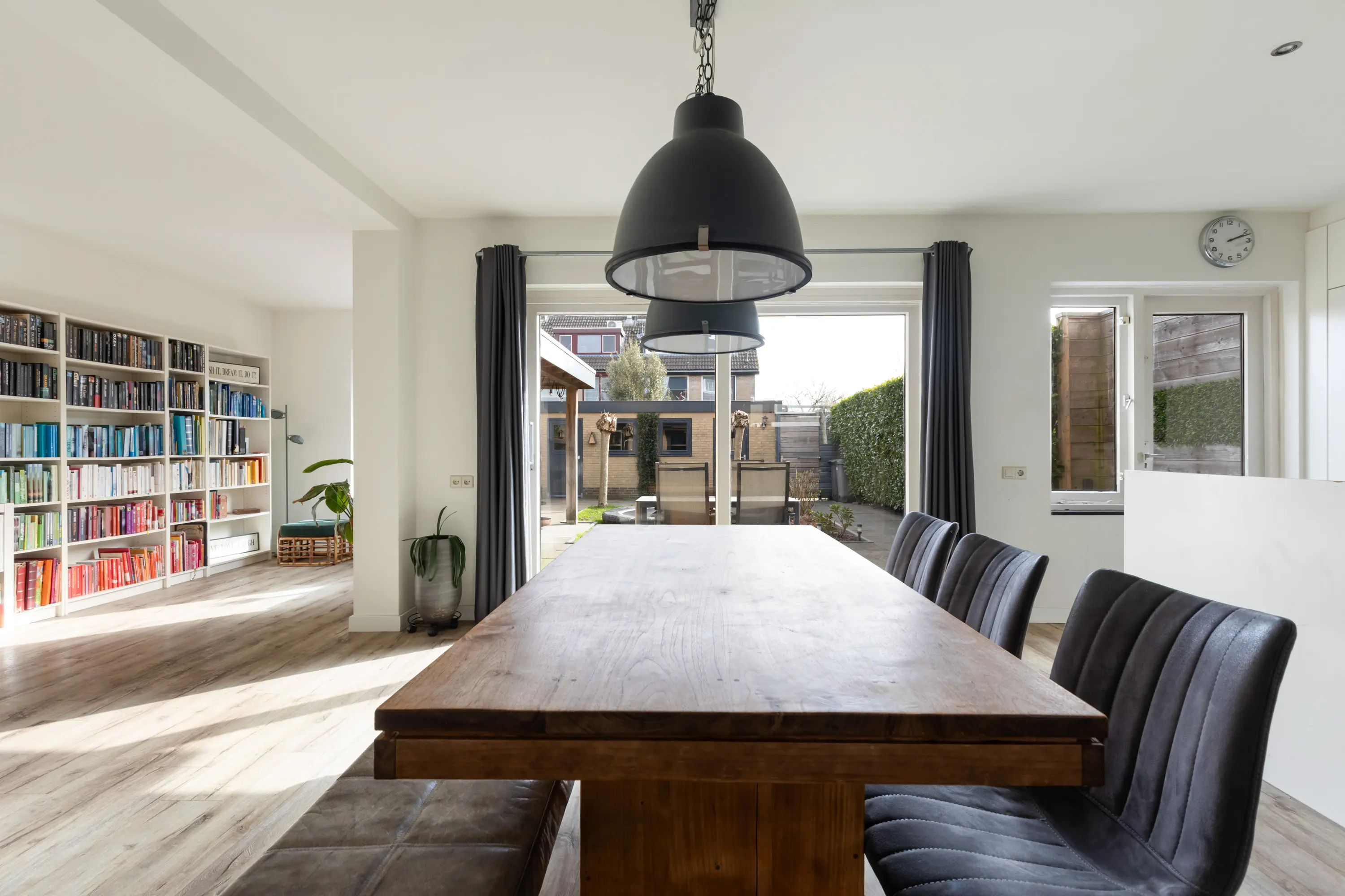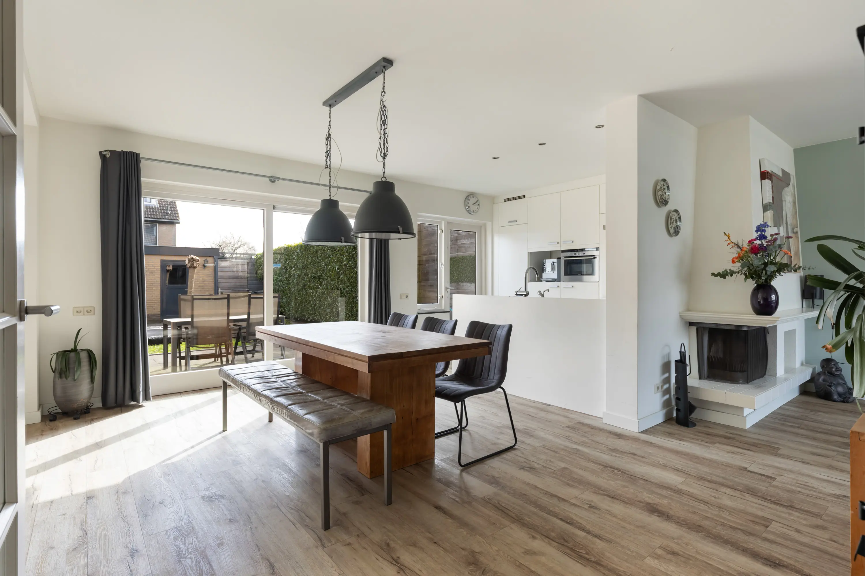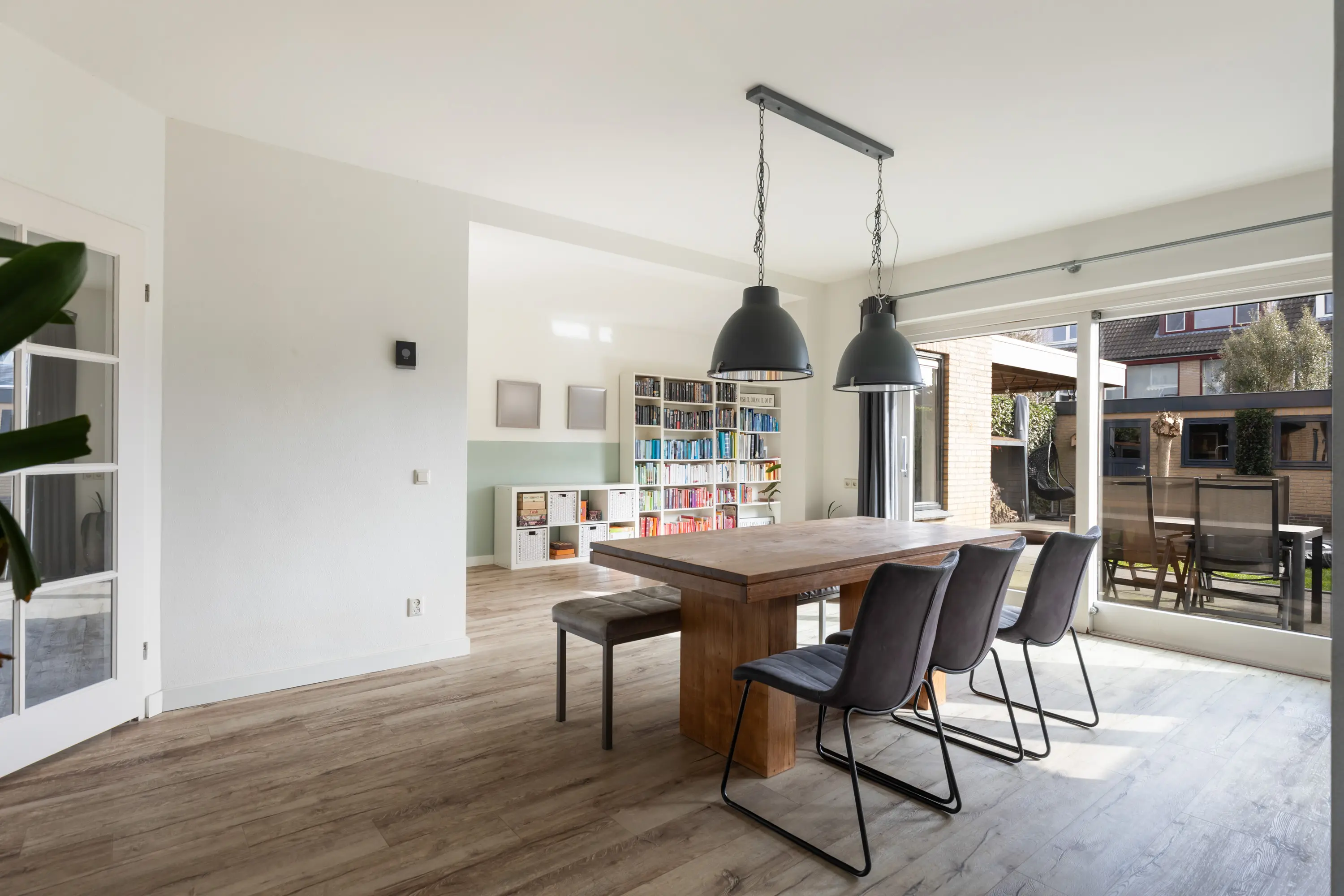 Aansluitend bevindt zich de eetkamer met een schuifpui naar de achtertuin. Vanuit hier bereikt u ook de lichte tuinkamer, die dankzij de grote raampartijen een heerlijke plek is om het hele jaar door van de tuin te genieten.