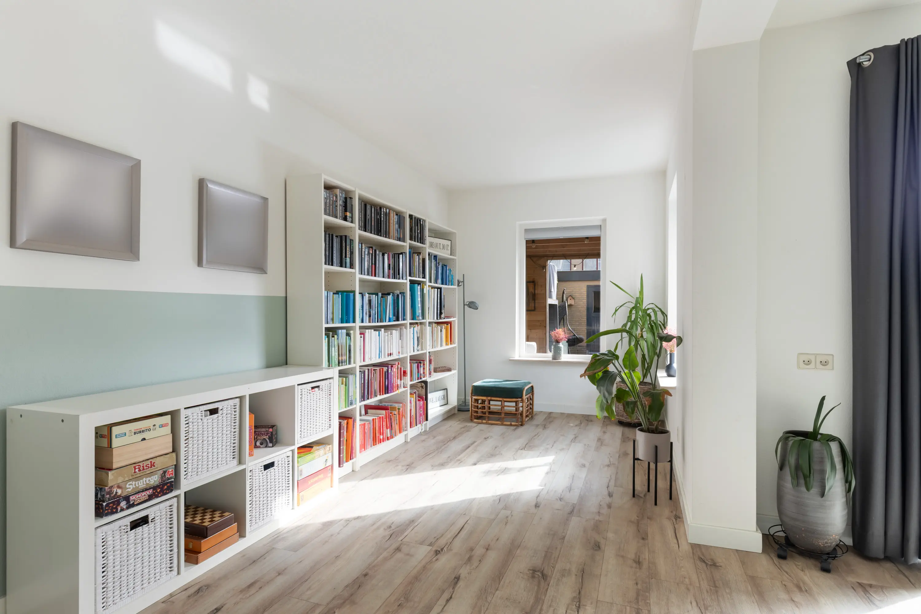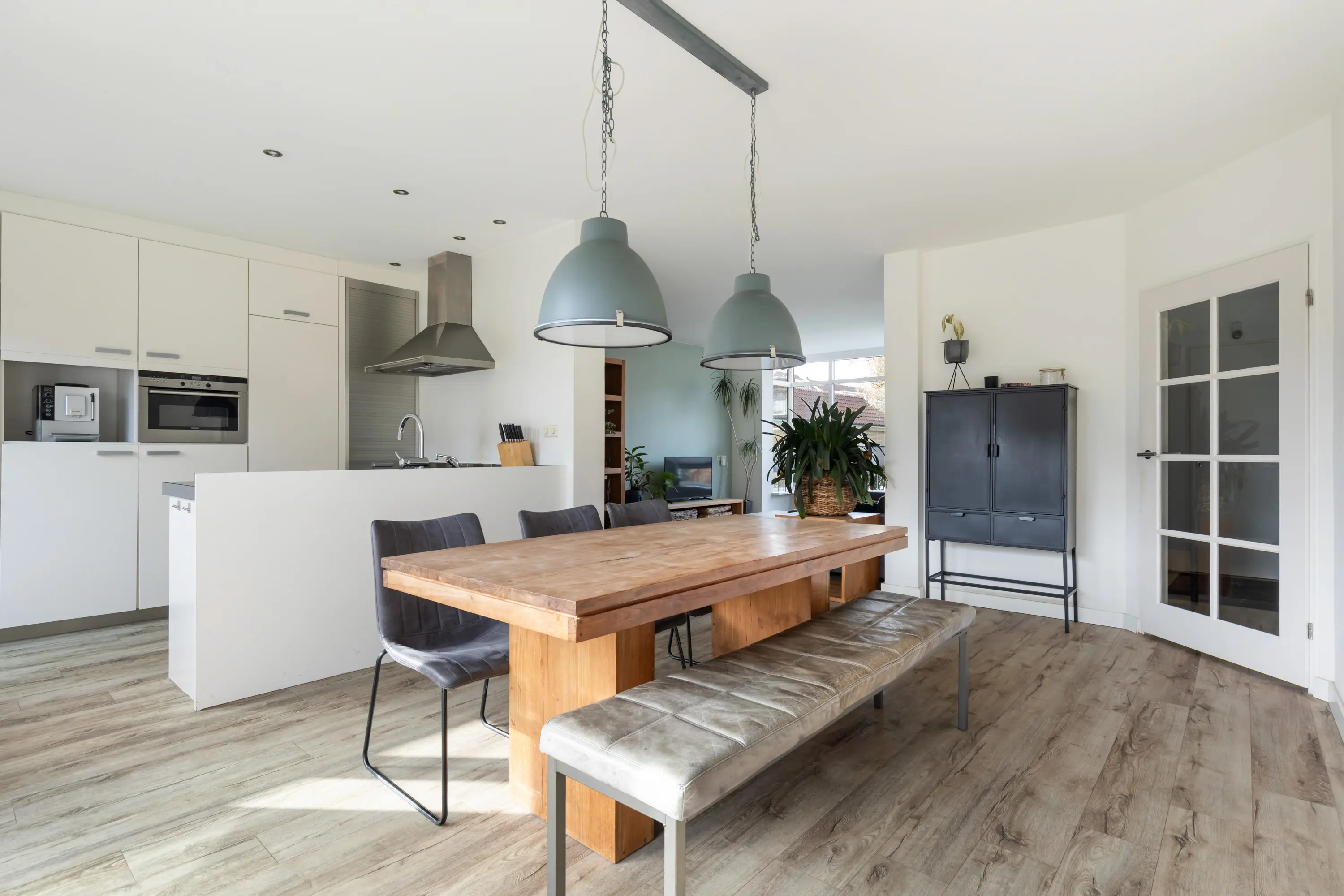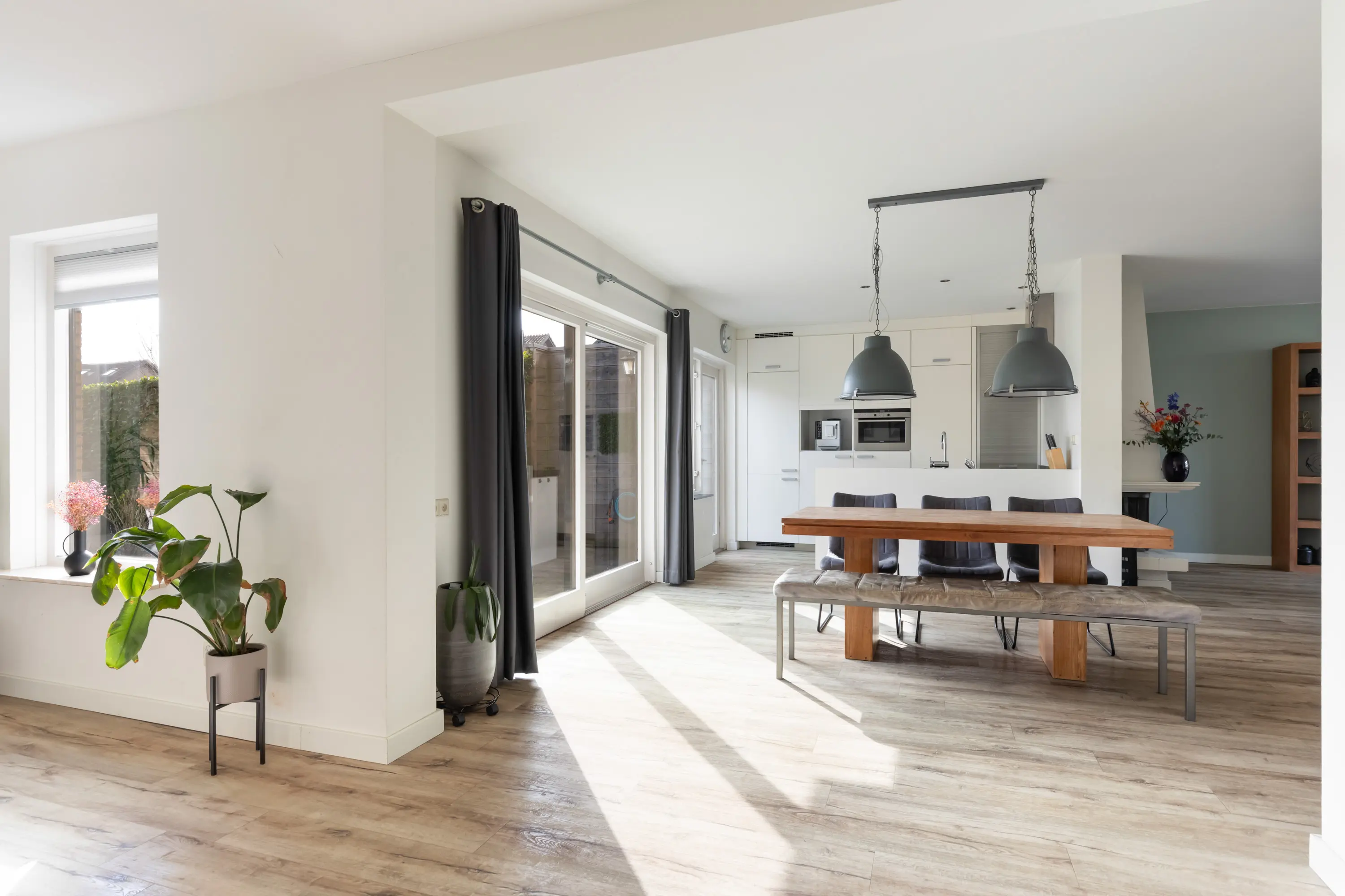 Aansluitend bevindt zich de eetkamer met een schuifpui naar de achtertuin. Vanuit hier bereikt u ook de lichte tuinkamer, die dankzij de grote raampartijen een heerlijke plek is om het hele jaar door van de tuin te genieten.