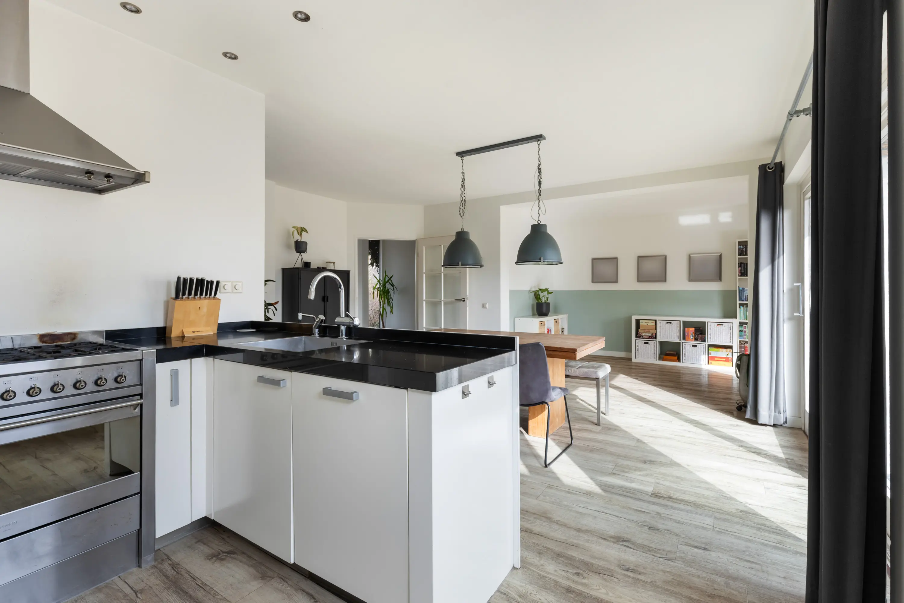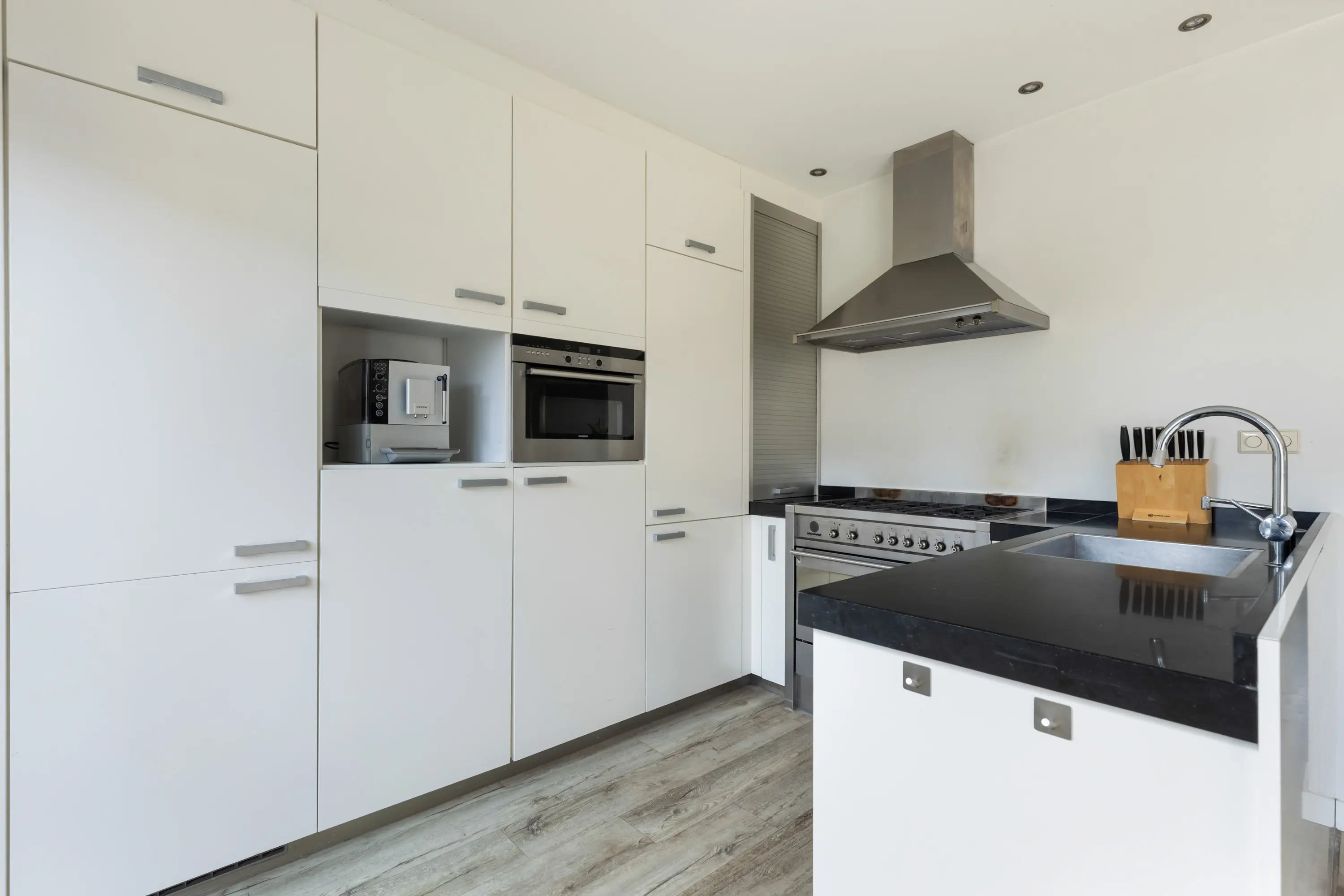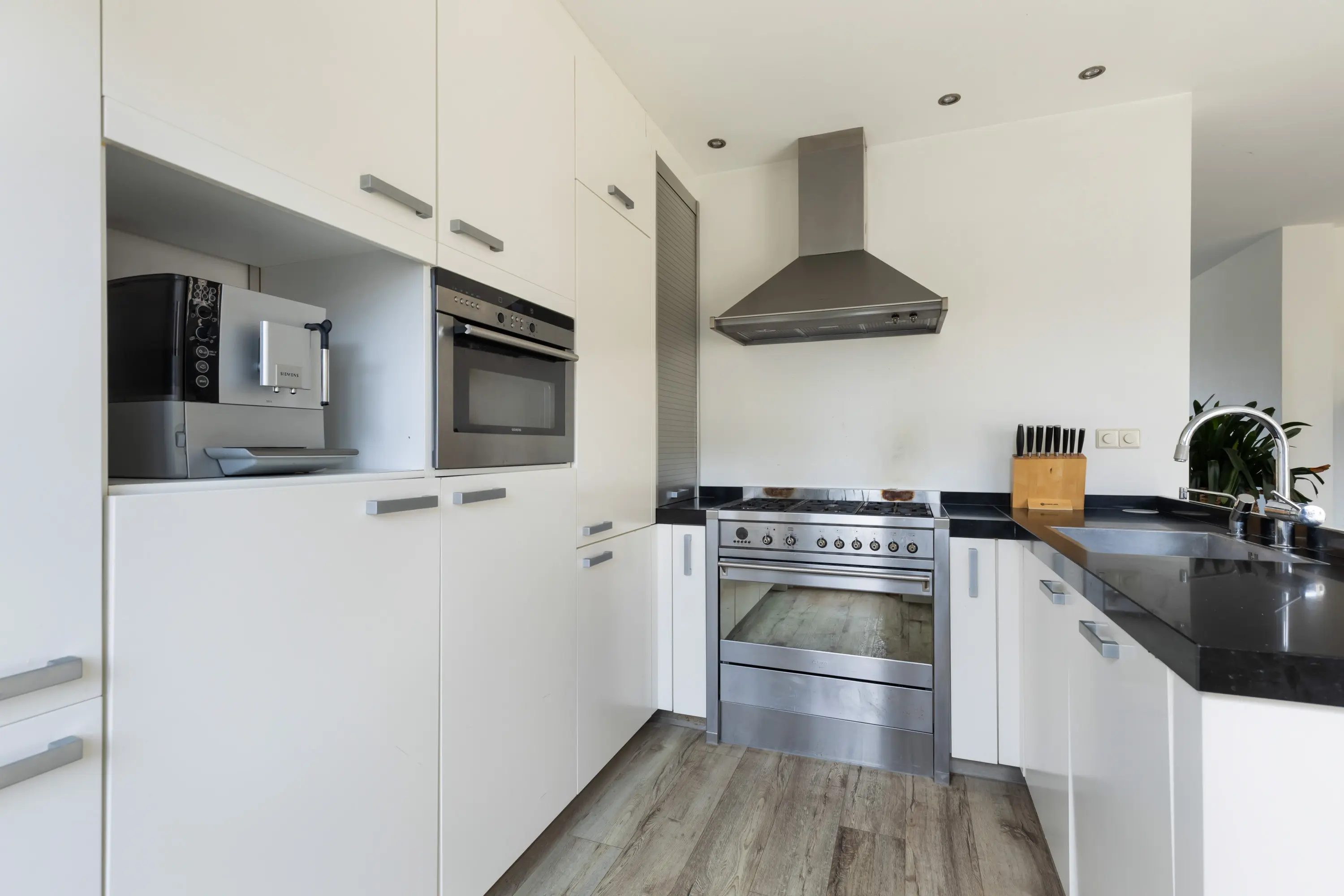 De royale woonkamer heeft een sfeervolle erker met nieuwe beglazing en een open haard, wat zorgt voor een warme en gezellige uitstraling. De open keuken staat in directe verbinding met de woonkamer en is voorzien van diverse inbouwapparatuur, waaronder een vaatwasser, afzuigkap, oven, combimagnetron, koel-vriescombinatie en een 6-pits gaskookstel met vis- en wokbrander. Daarnaast beschikt de keuken over een mengkraan met close-in boiler en een Quooker. De volledige benedenverdieping heeft een PVC-vloer en vloerverwarming.