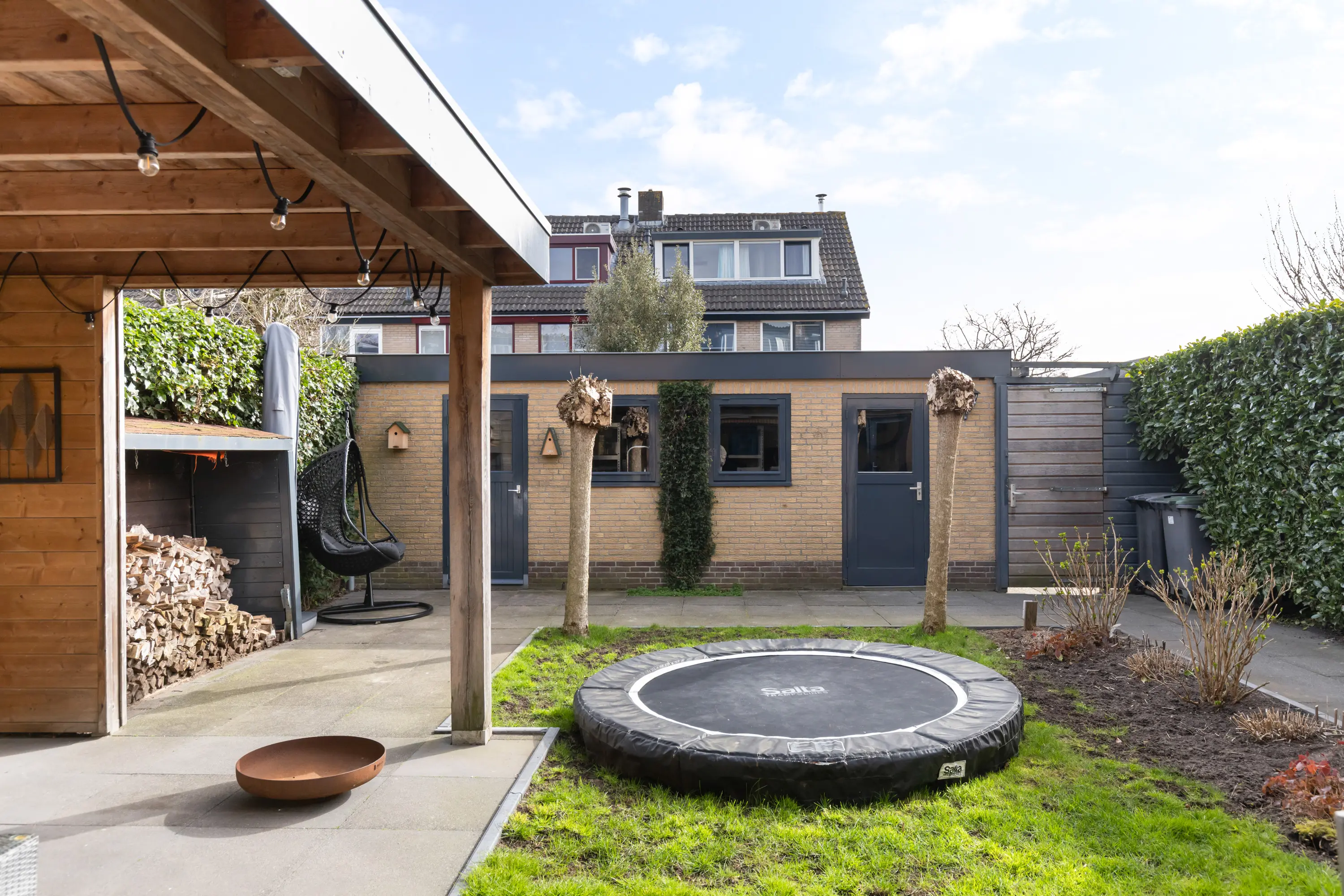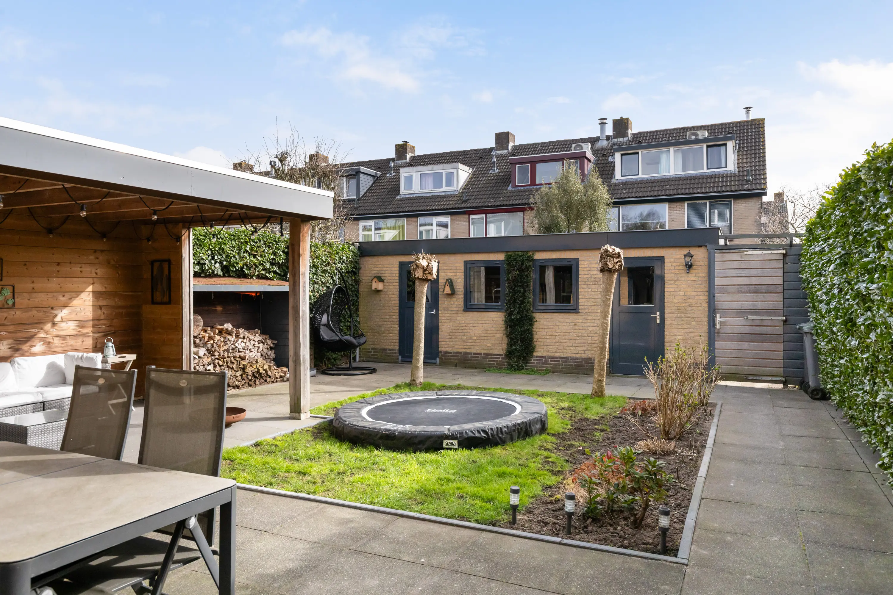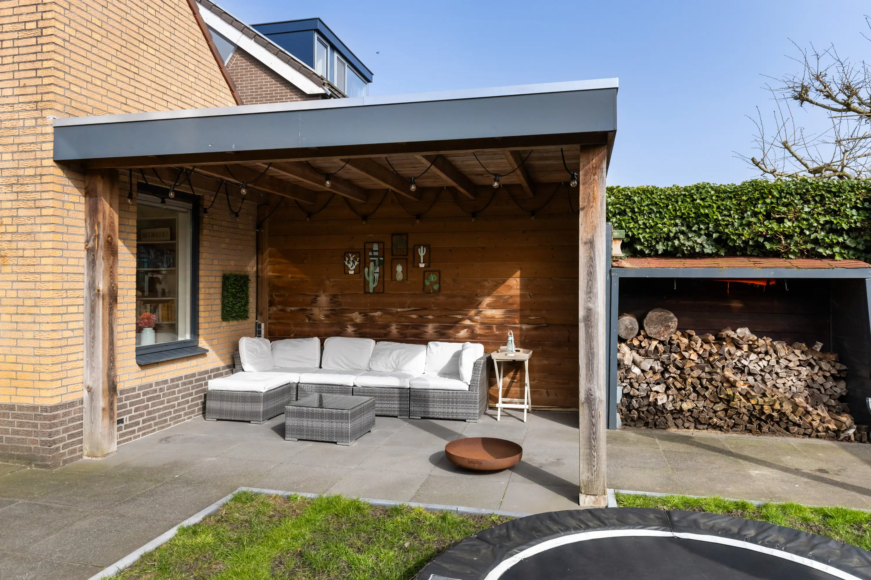 De achtergevel is voorzien van een zonnescherm over de volledige breedte (handbediening), waardoor u op warme dagen prettig schaduw kunt creëren. De tuin is bovendien bereikbaar via een achterom. Onder de carport bevindt zich een laadpaal voor het opladen van een elektrische auto.