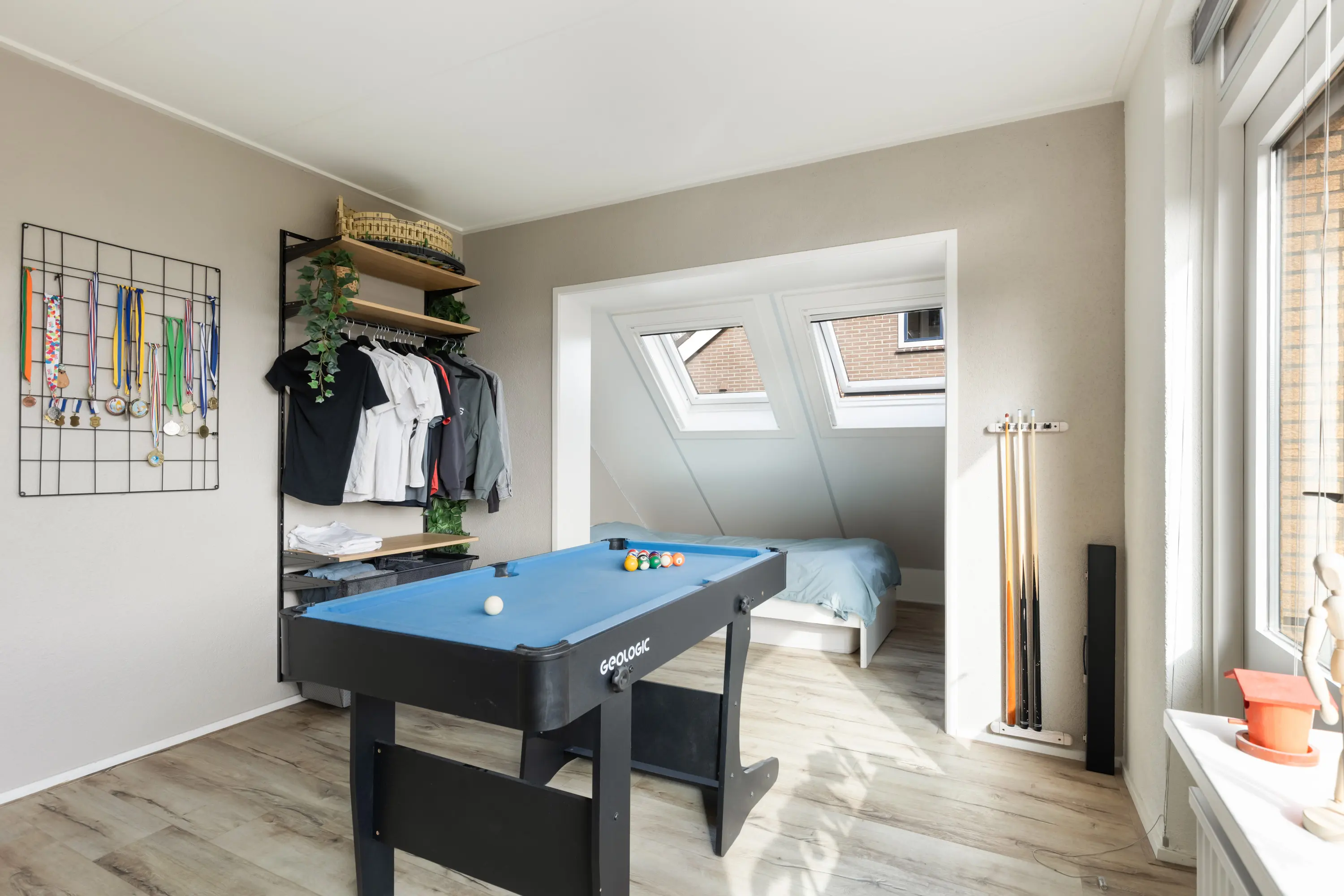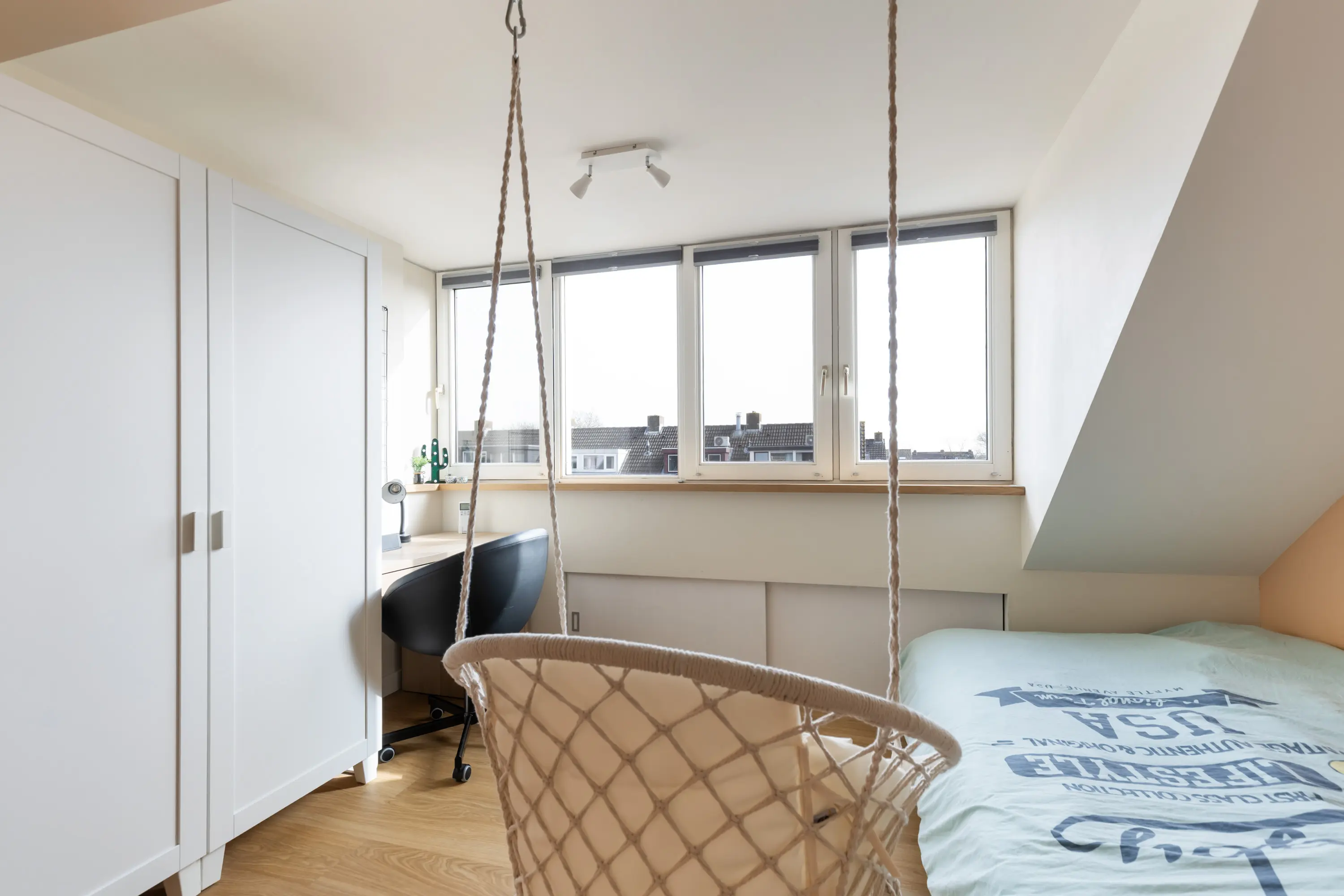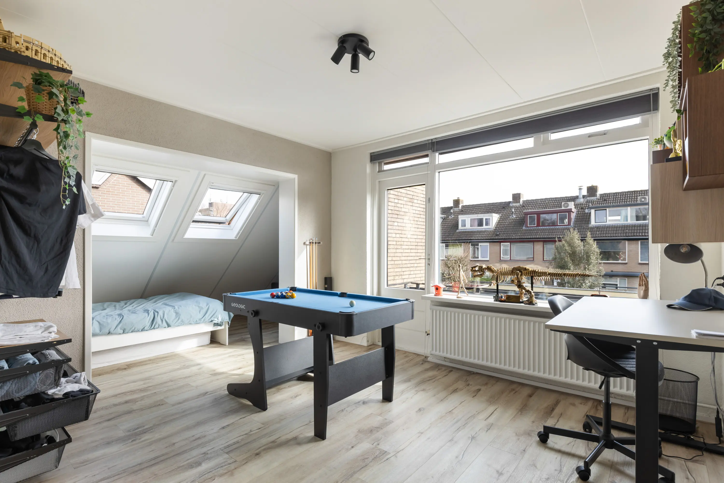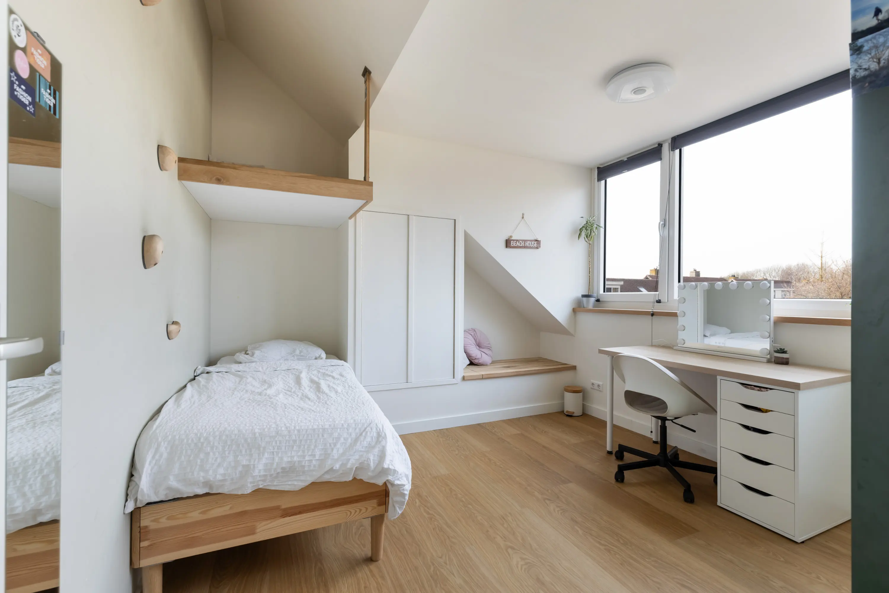 Op de geheel vernieuwde tweede verdieping bevinden zich twee slaapkamers met airconditioning en een dakkapel met kunststof kozijnen (bouwjaar 2023). In de voorste slaapkamer is tevens de opstelplaats van de CV-ketel (2017) netjes weggewerkt. Deze verdieping biedt verrassend veel extra ruimte en beschikt over een tweede badkamer (2024) met regendouche, dubbele wastafel en een derde toilet. Daarnaast is er een aparte wasruimte met aansluitingen voor een wasmachine en droger en een raam voor natuurlijke ventilatie.