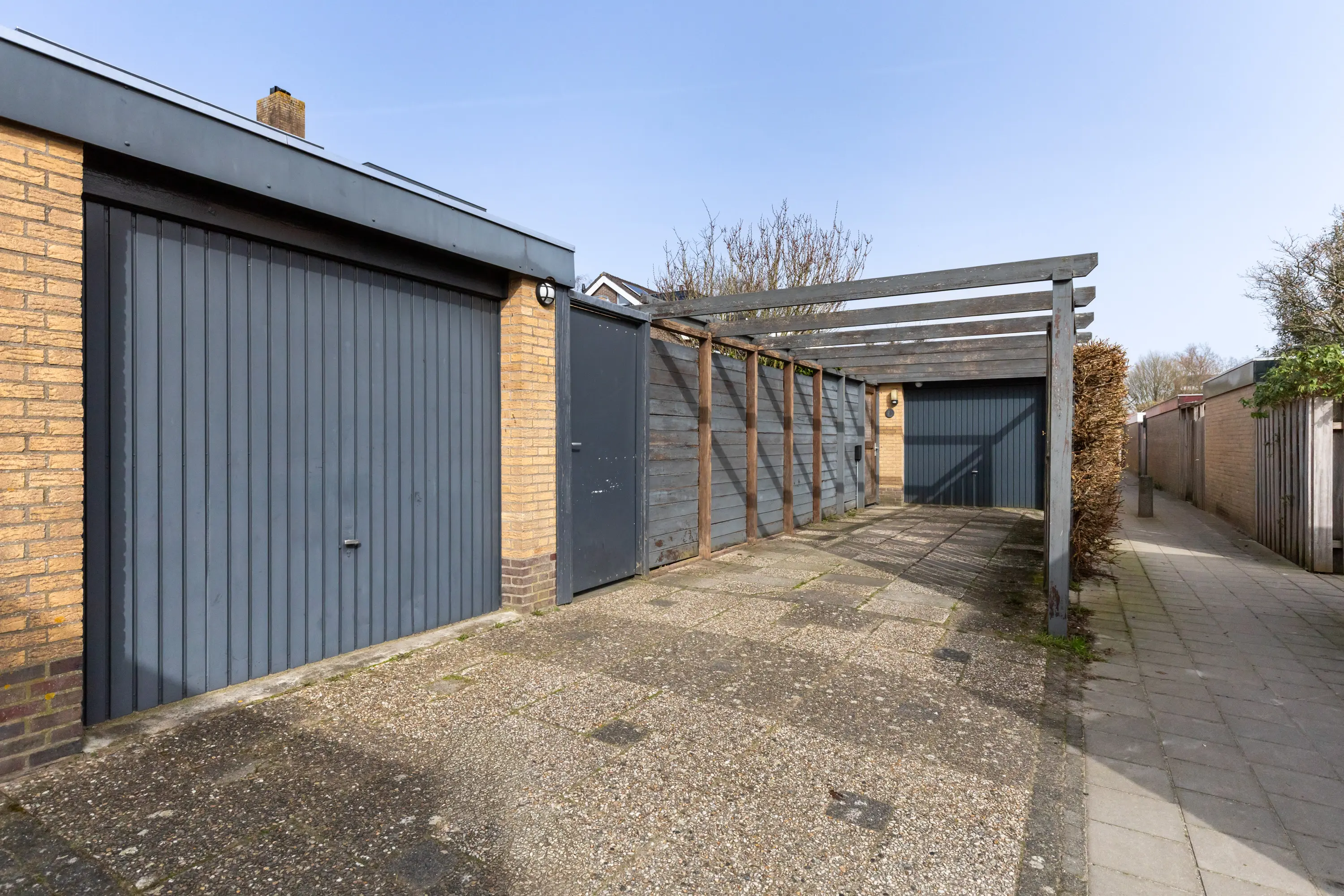 De ruime achtertuin ligt op het zonnige zuid/oosten en en beschikt over een royale overkapping om te genieten van de eerste lentezon maar ook van lange zomeravonden. Achter in de tuin staat een stenen berging met een aangrenzende garage met carport.