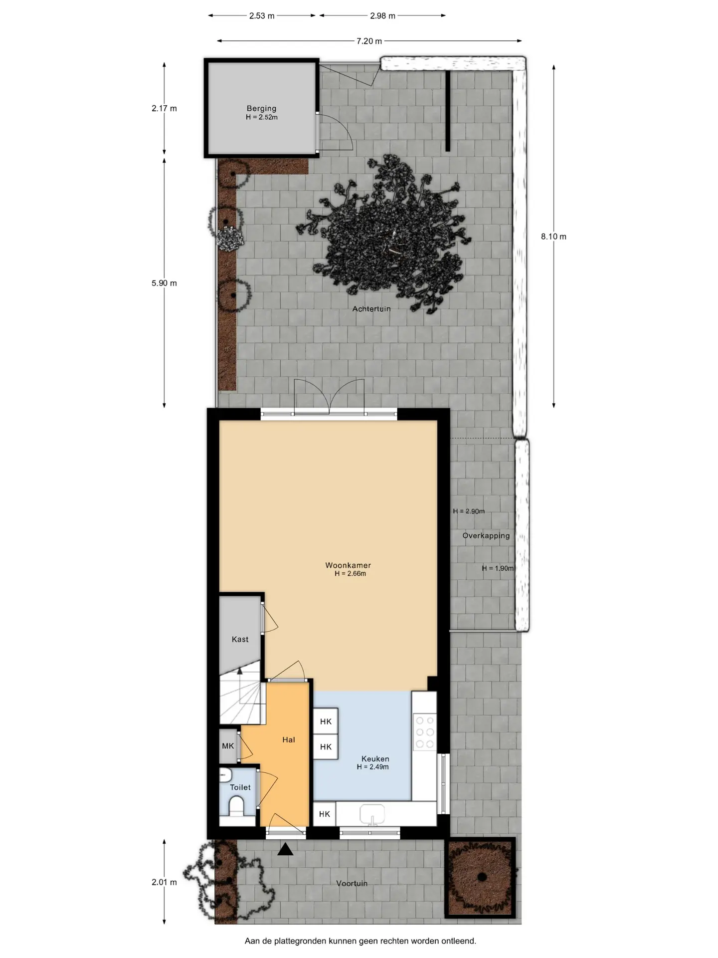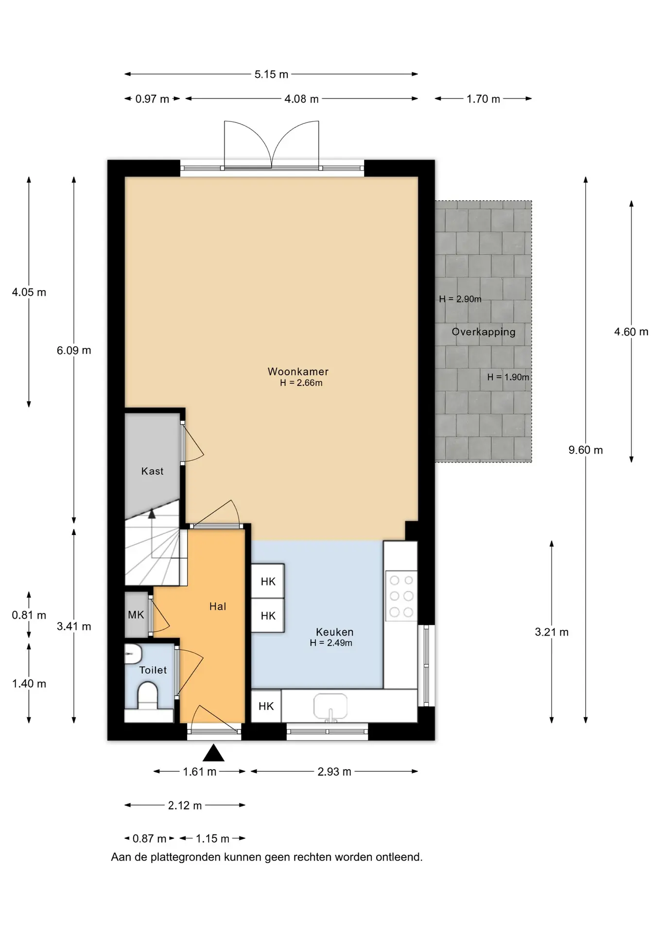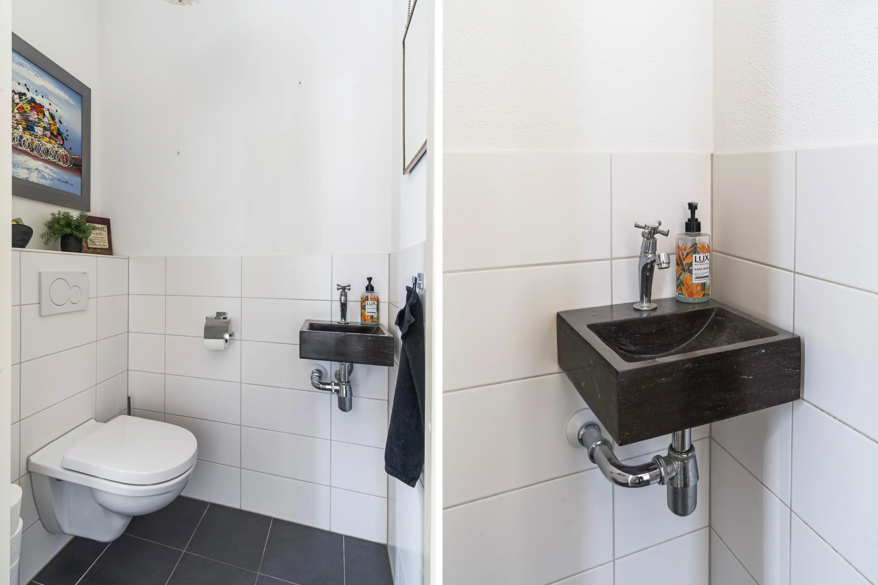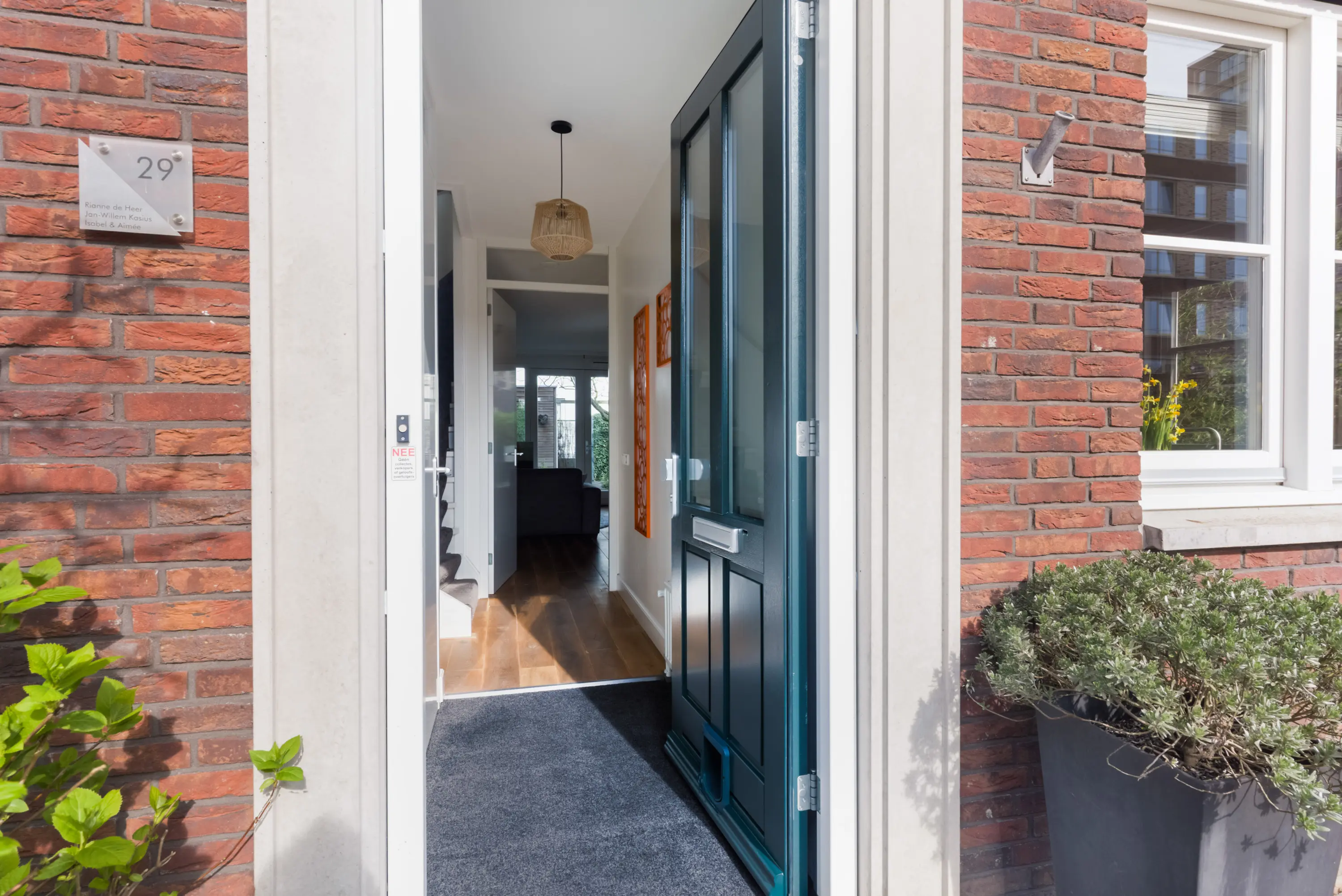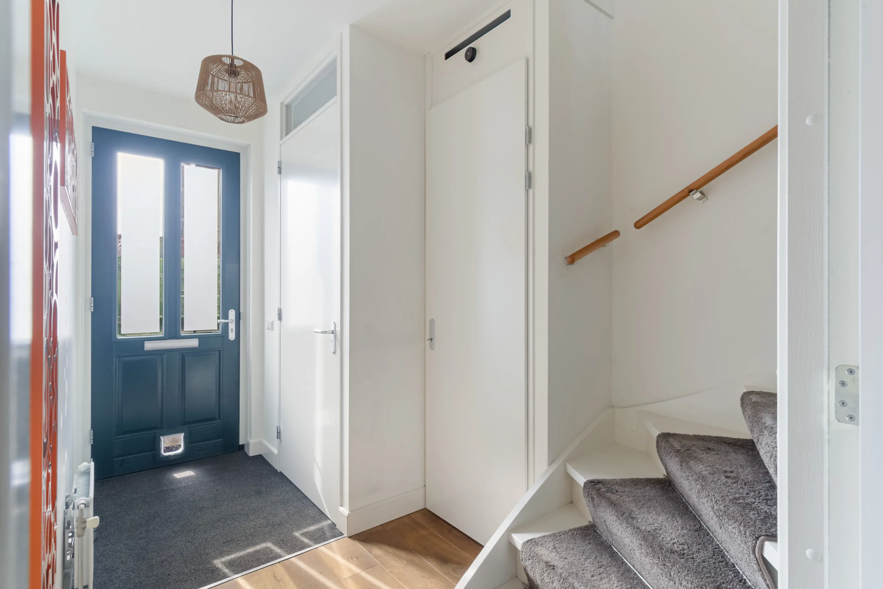Via de voortuin bereikt u de entree. In de hal bevinden zich de meterkast, het moderne toilet met fontein en de trapopgang naar de eerste verdieping.
