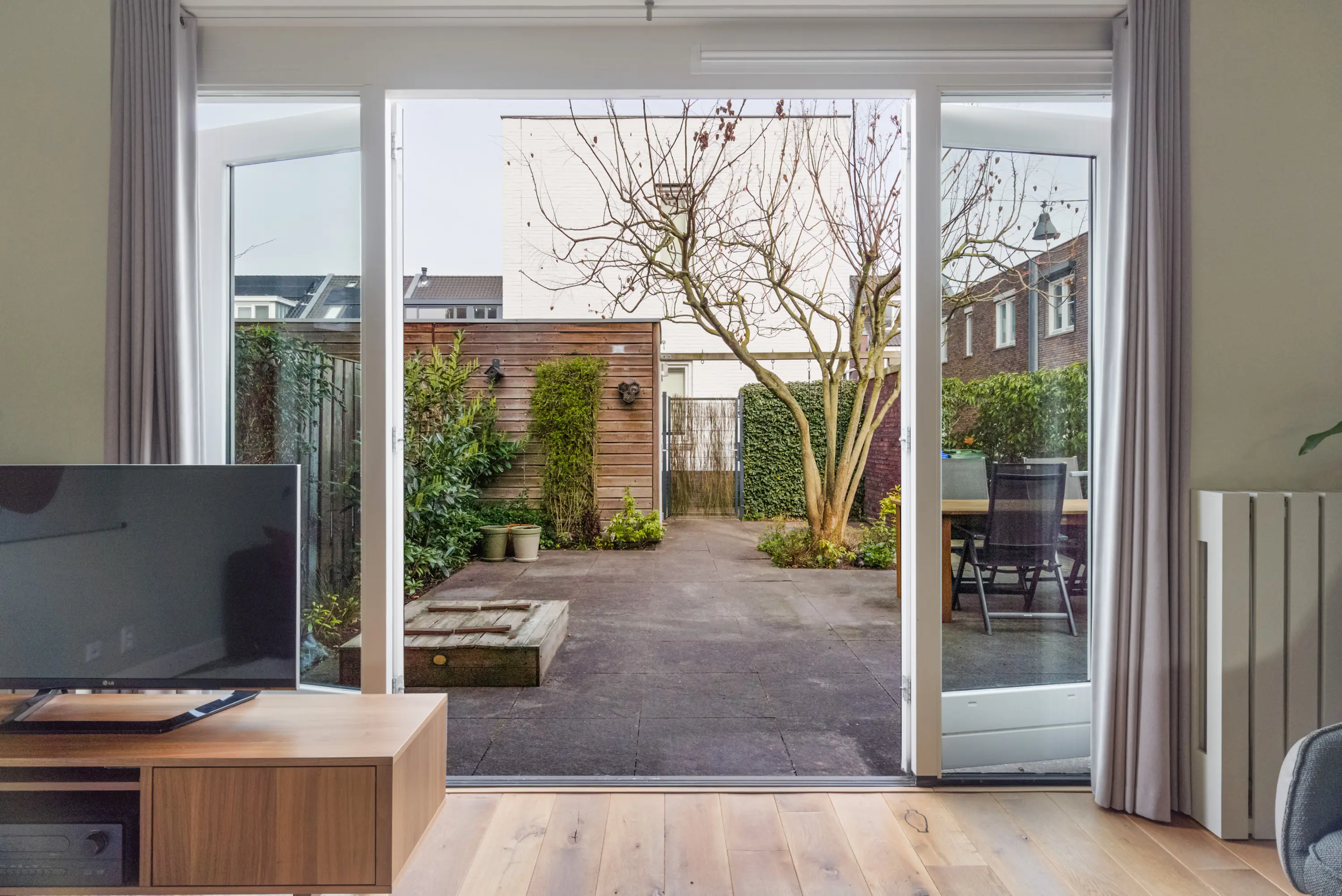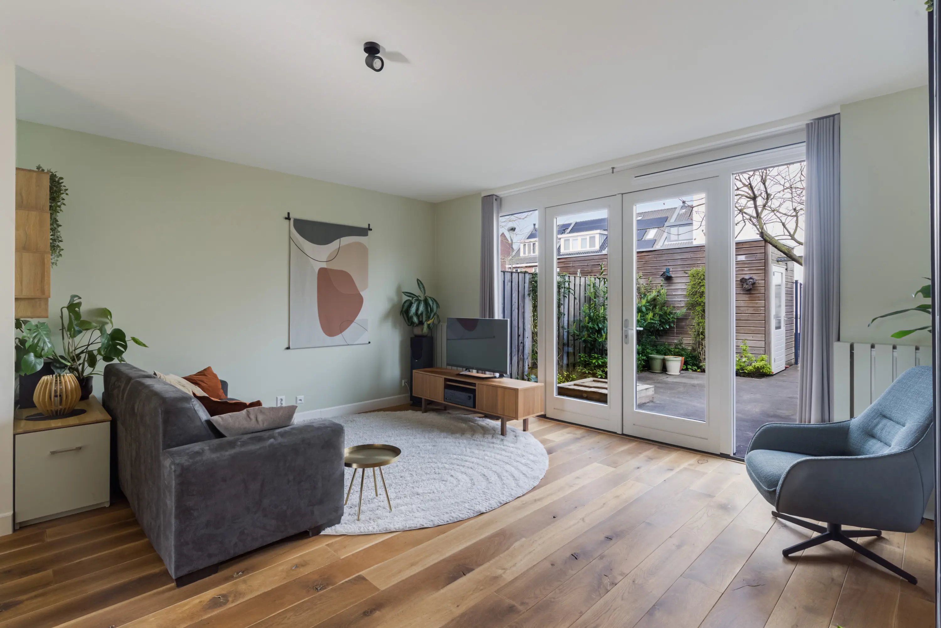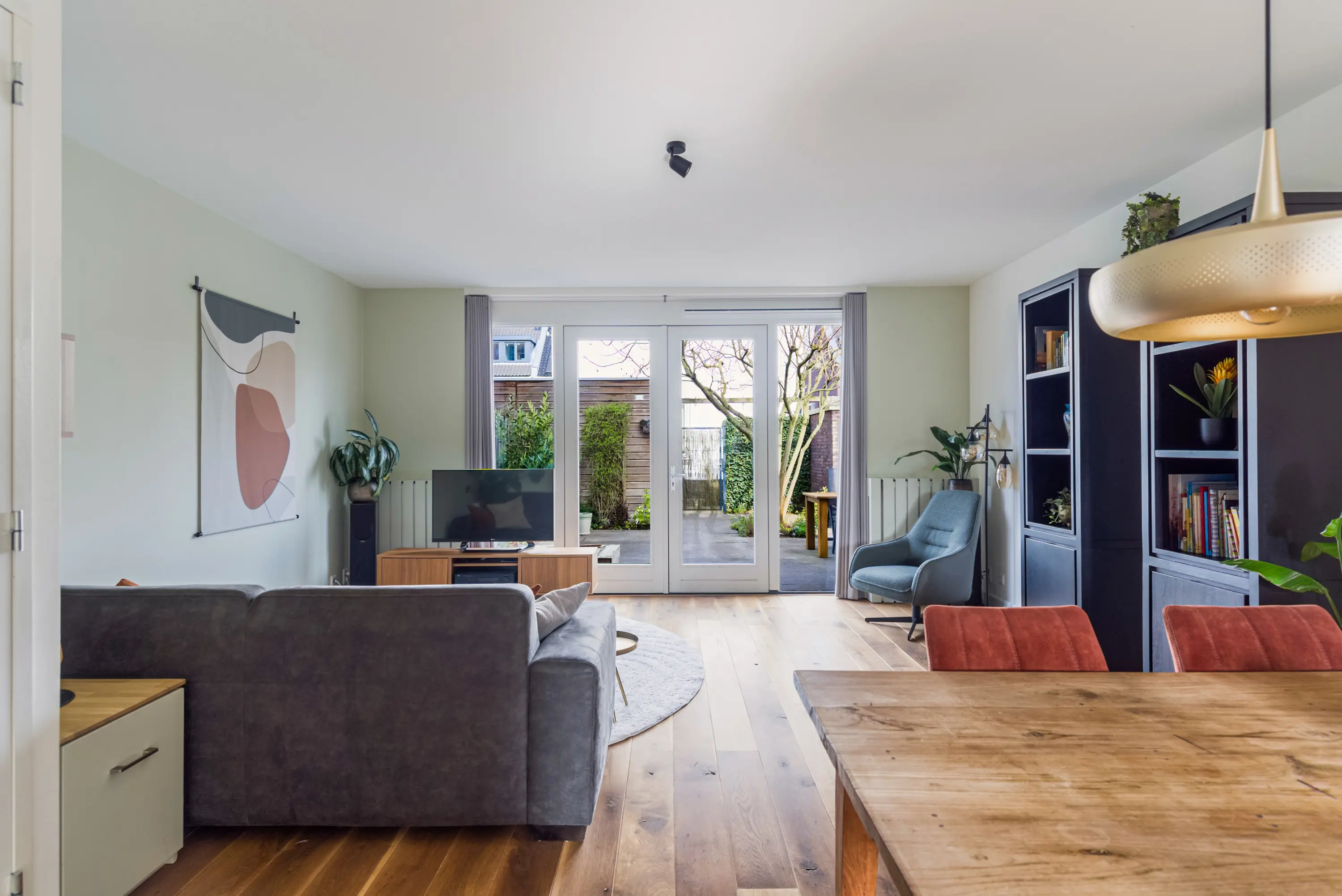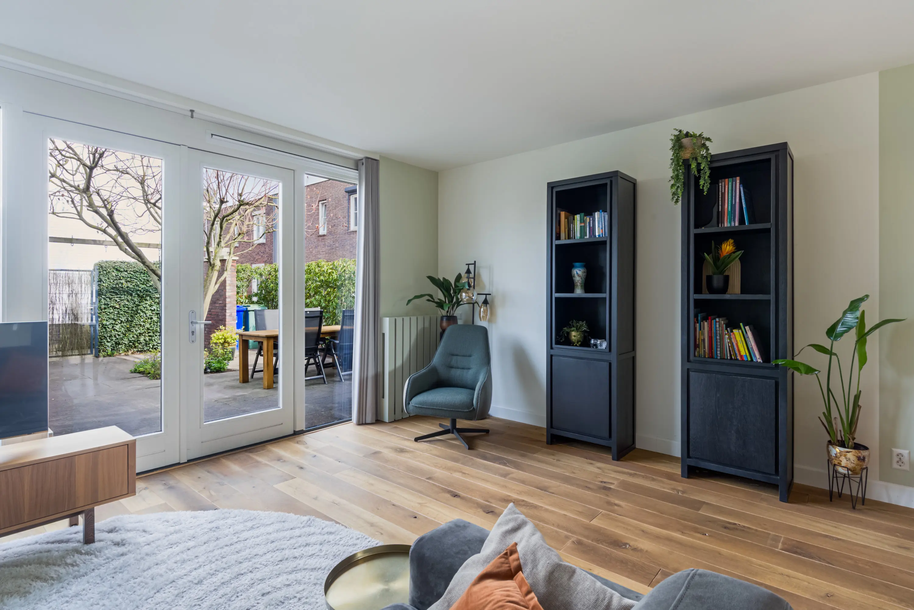De lichte, tuingerichte woonkamer biedt voldoende ruimte voor een comfortabele zithoek en geeft via openslaande deuren toegang tot de achtertuin.