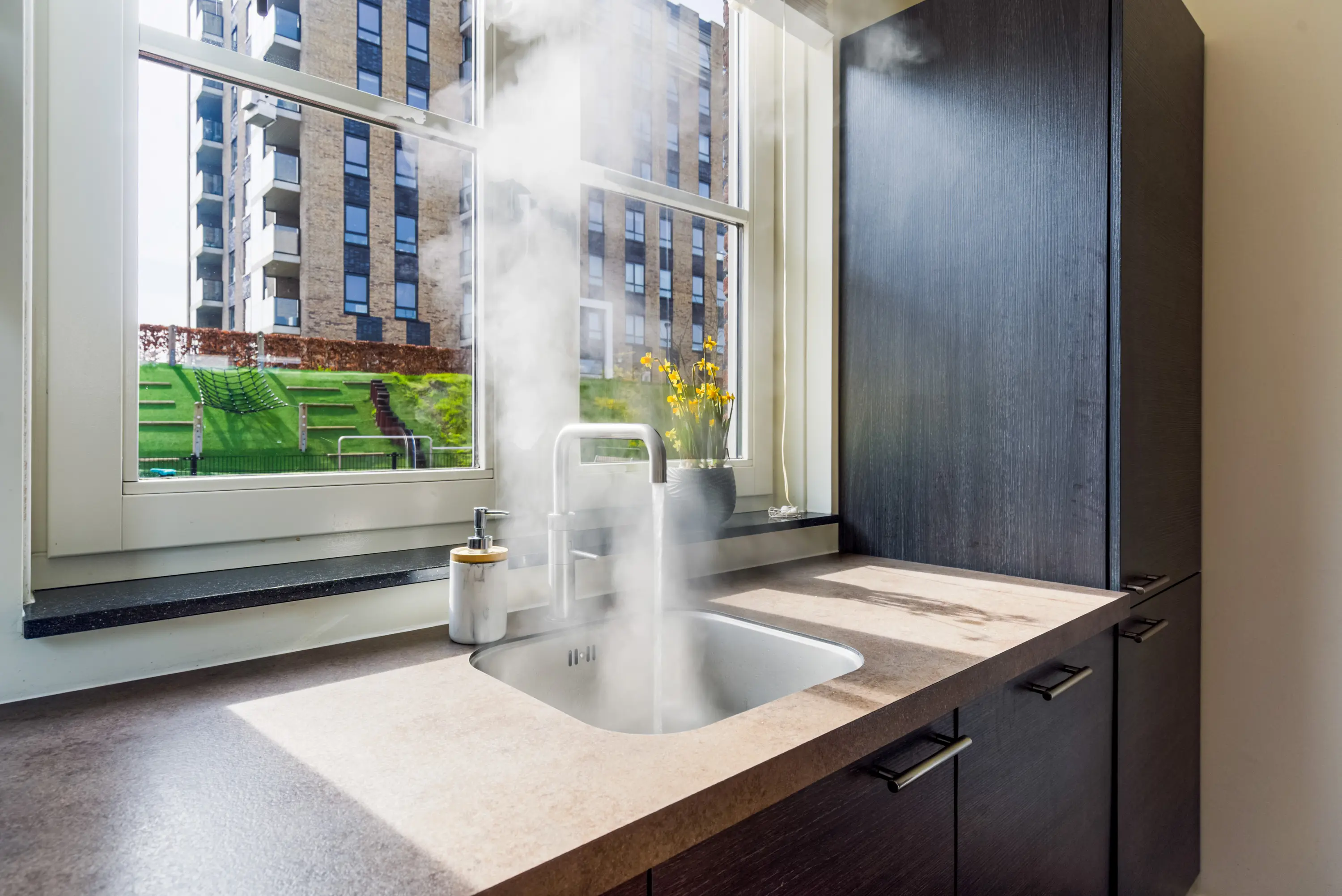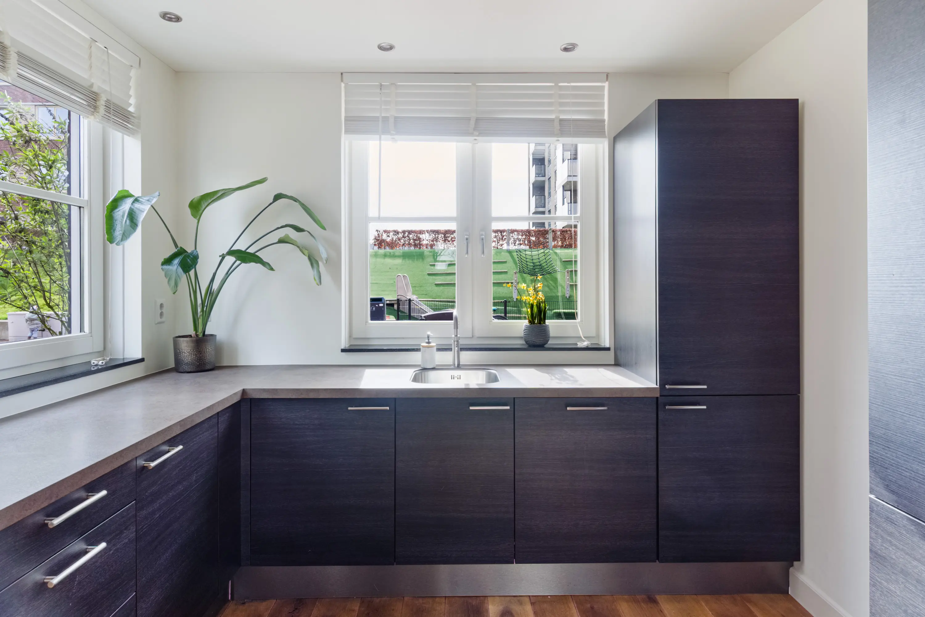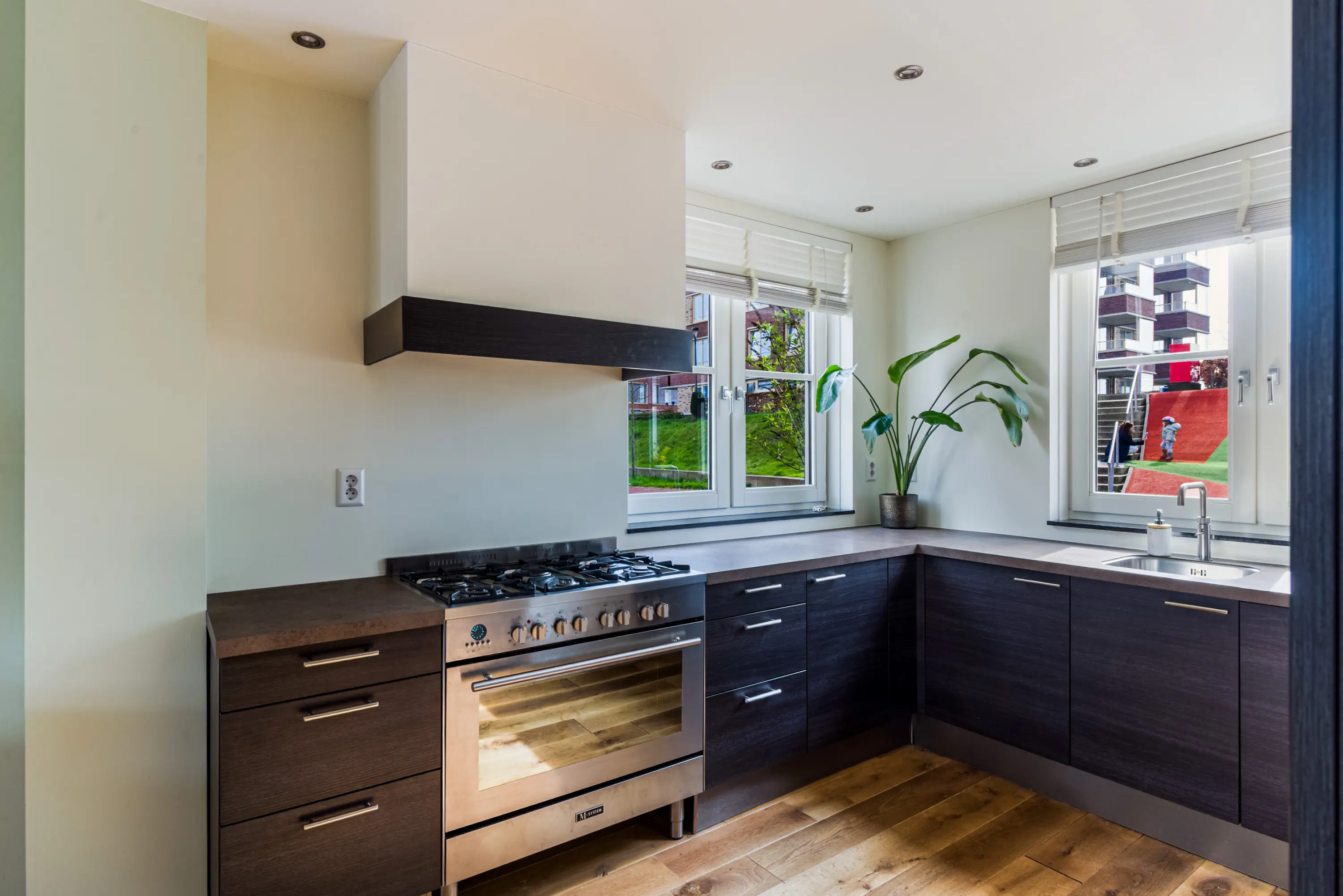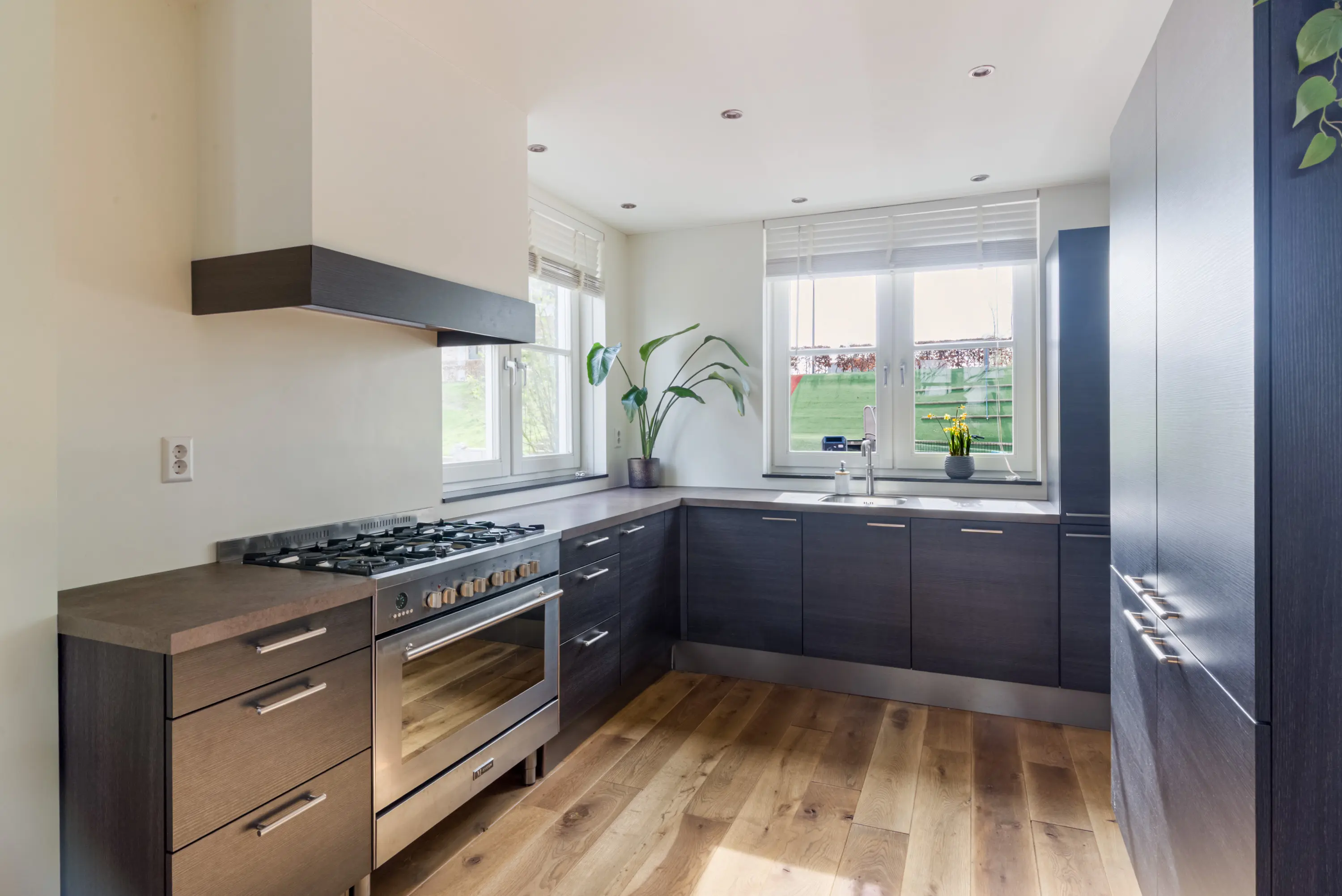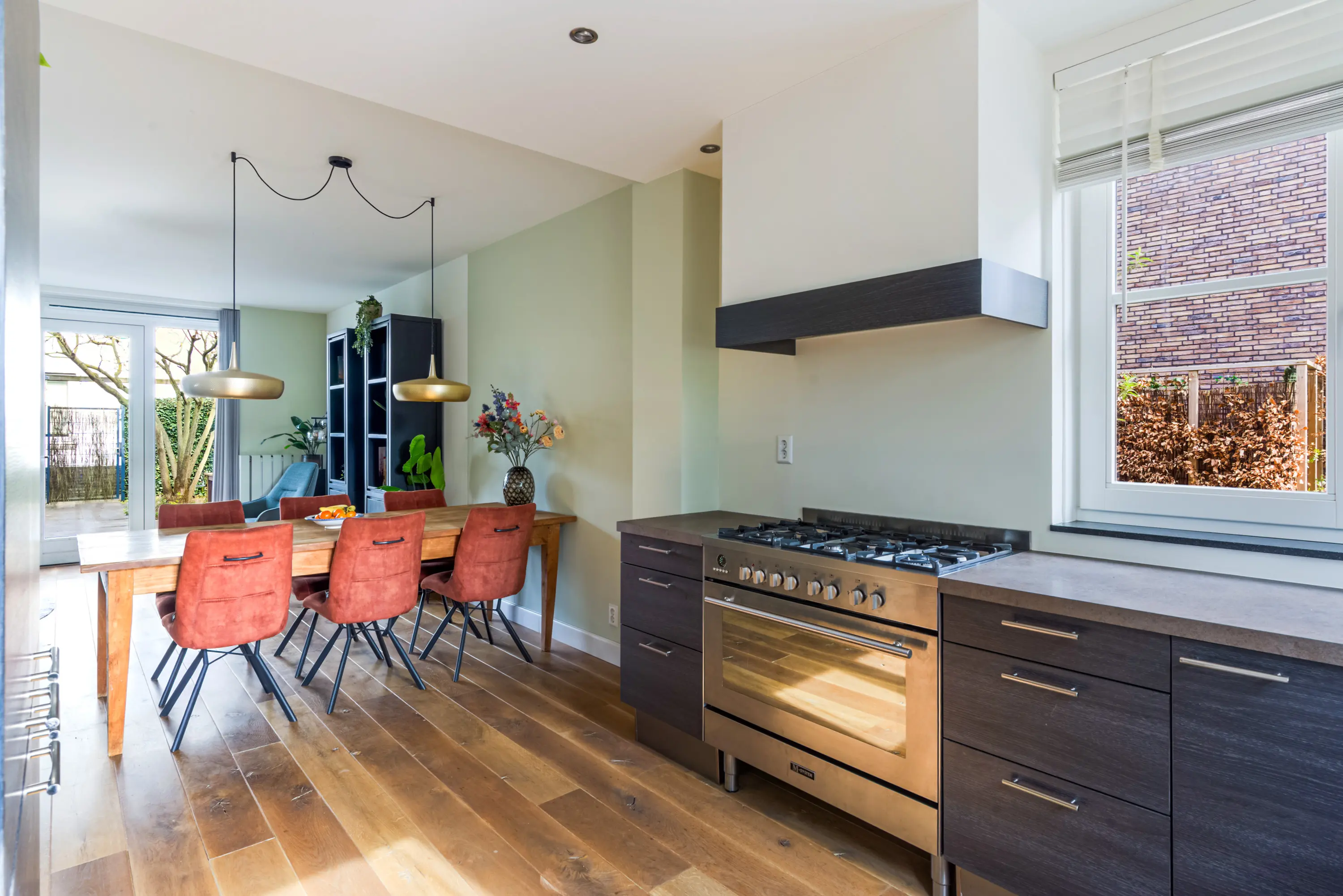 Aan de voorzijde van de woning bevindt zich de open keuken in L-opstelling, met uitzicht op een speelveld. De keuken is uitgerust met diverse inbouwapparatuur, waaronder een gasfornuis met oven, koelkast, vriezer, Quooker en vaatwasser. Tussen de keuken en woonkamer is ruimte voor een royale eettafel.