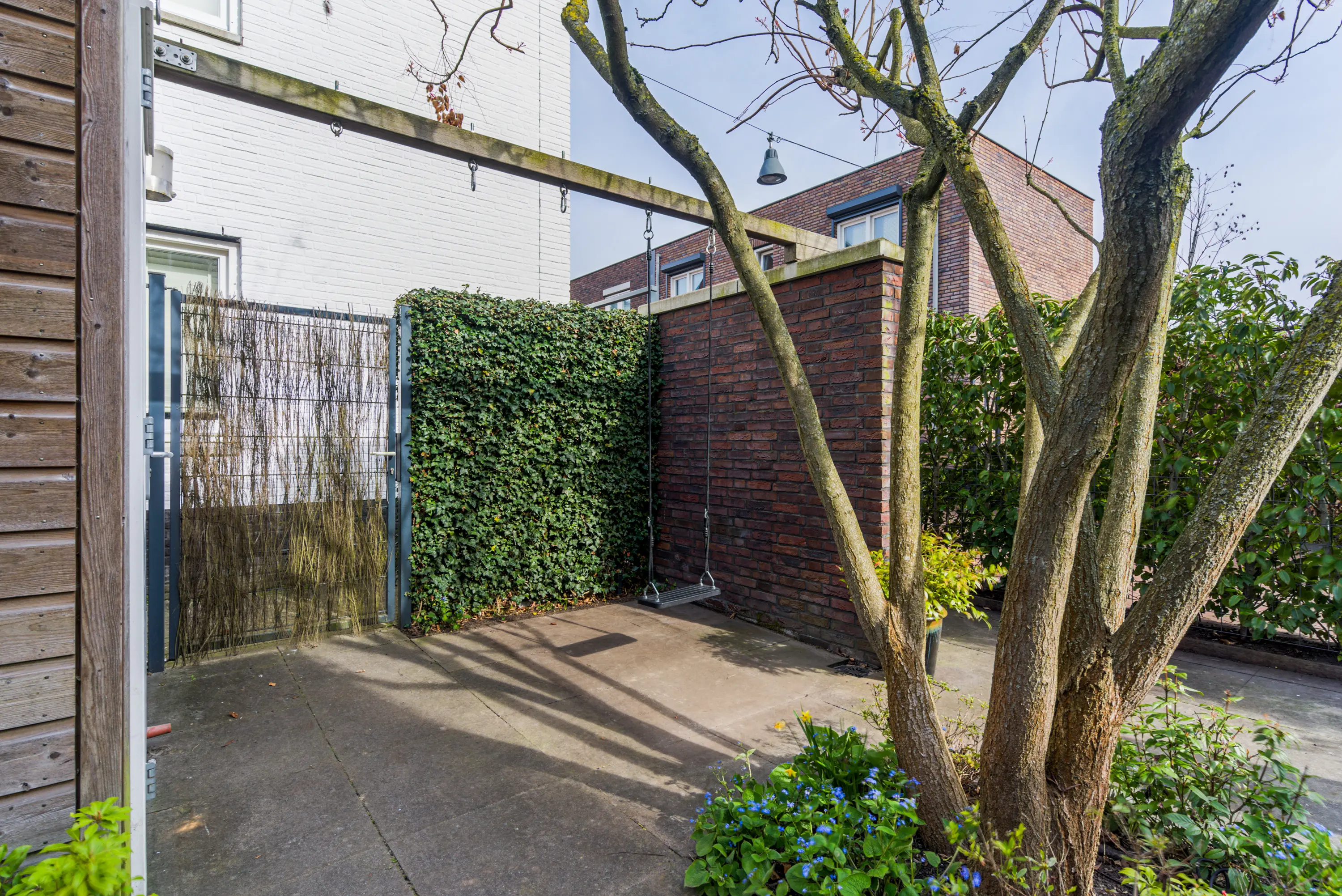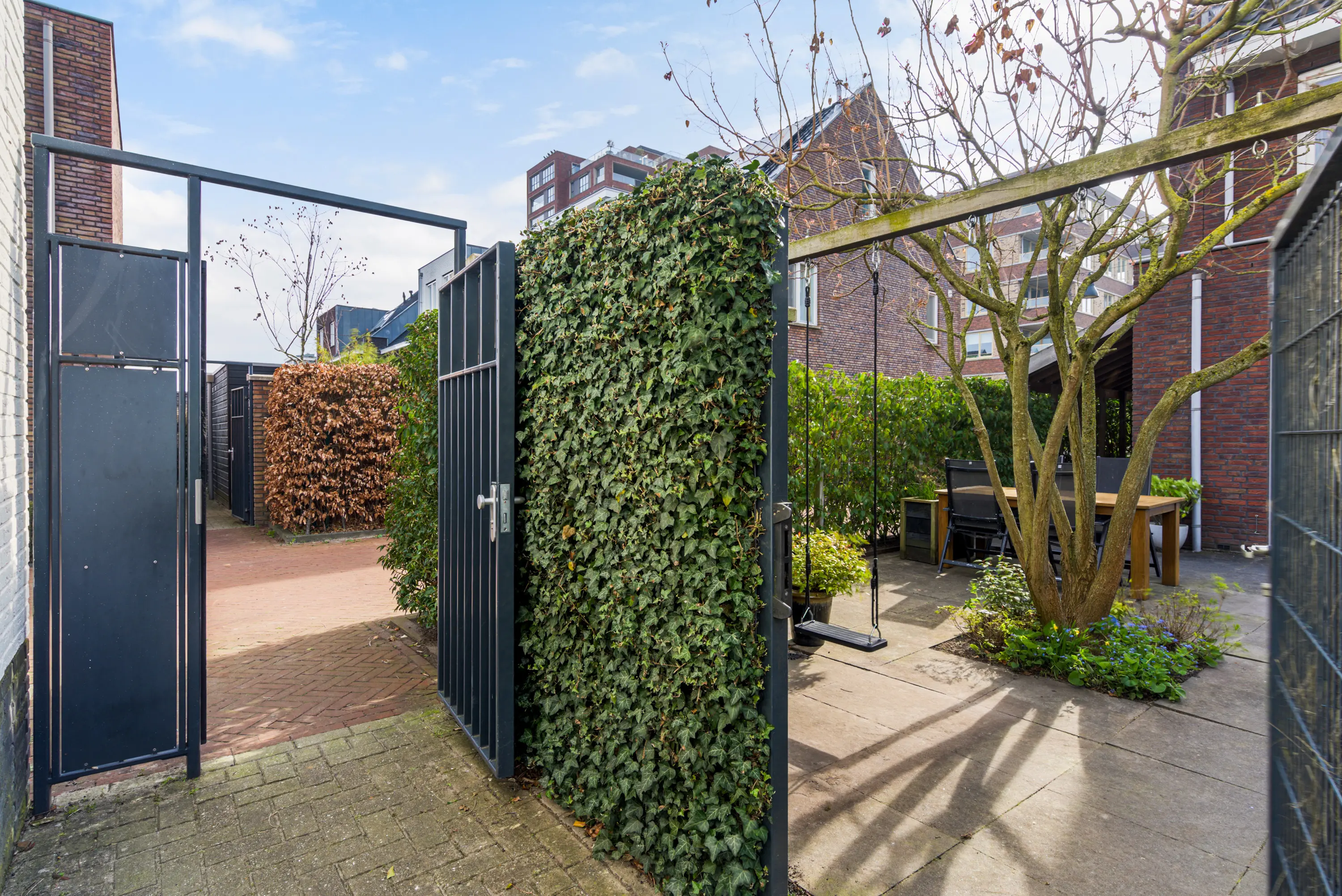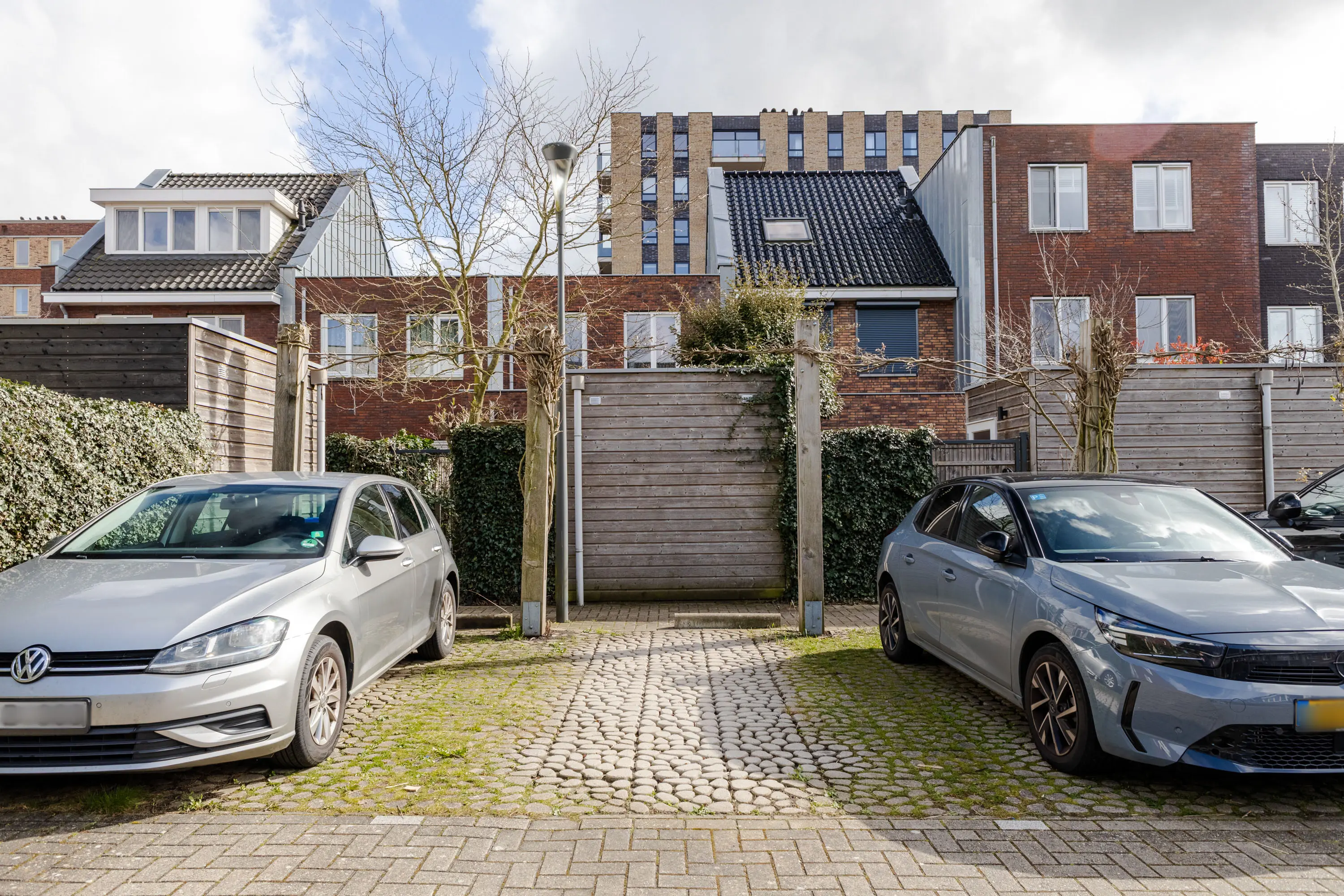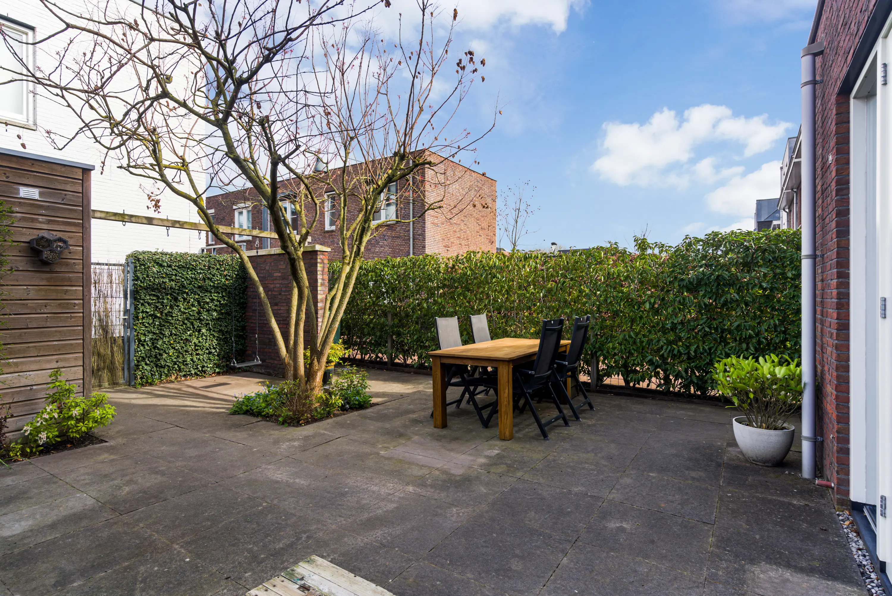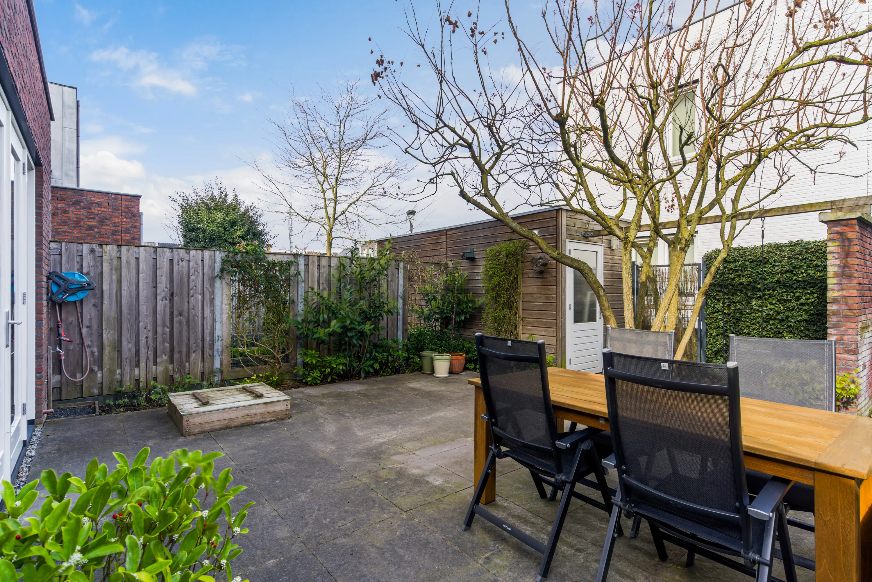 De extra brede achtertuin is gelegen op het noord-westen. De tuin is verzorgd aangelegd met bestrating en een groenblijvende haag voor extra privacy. Aan de zijkant van het huis staat een praktische overkapping en achterin bevindt zich een vrijstaande berging en toegang tot het mandelige parkeerterrein.