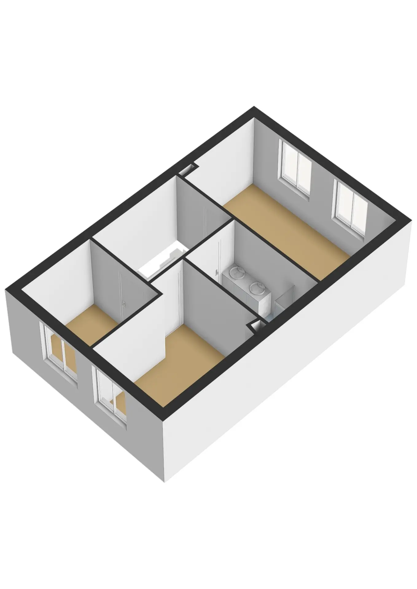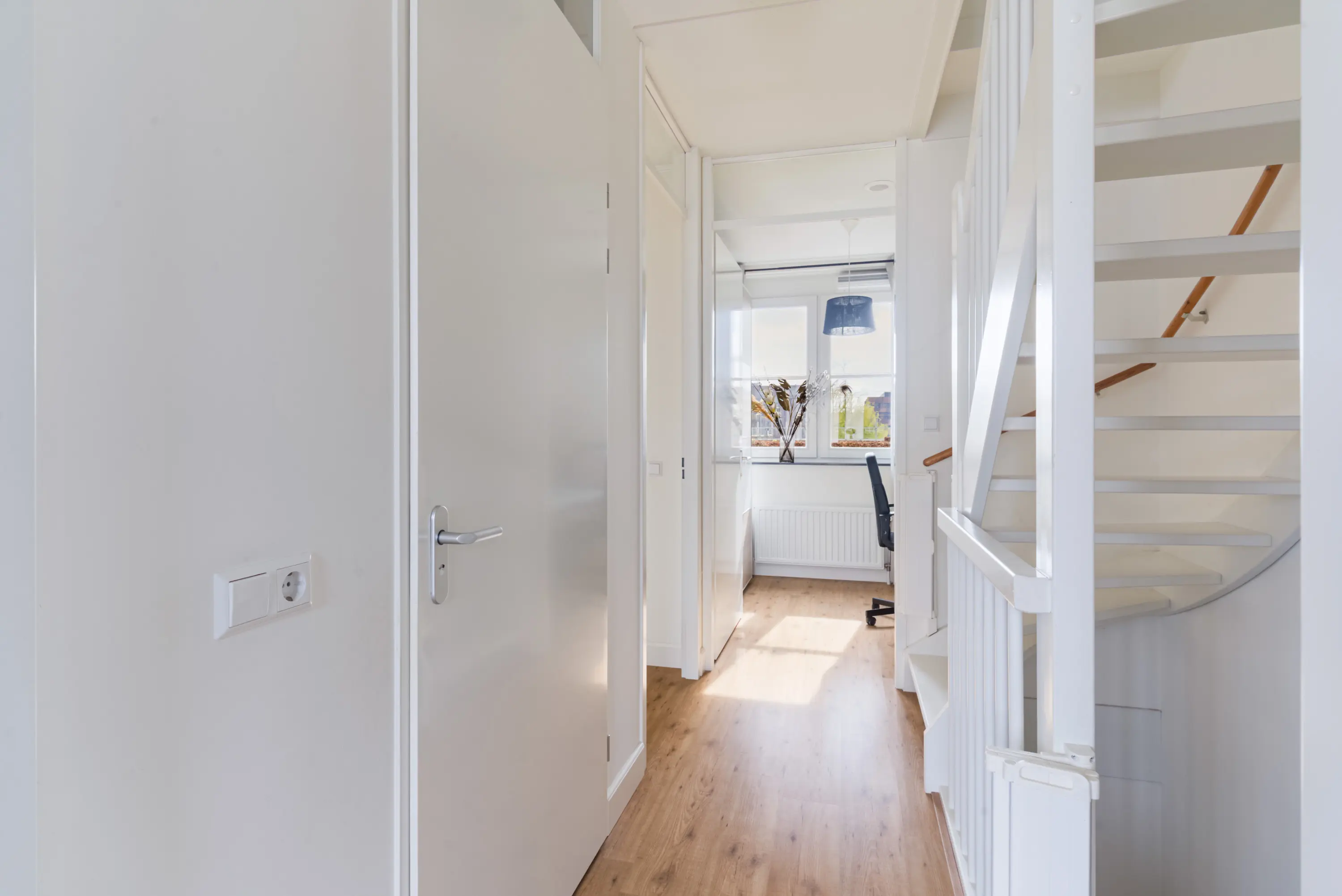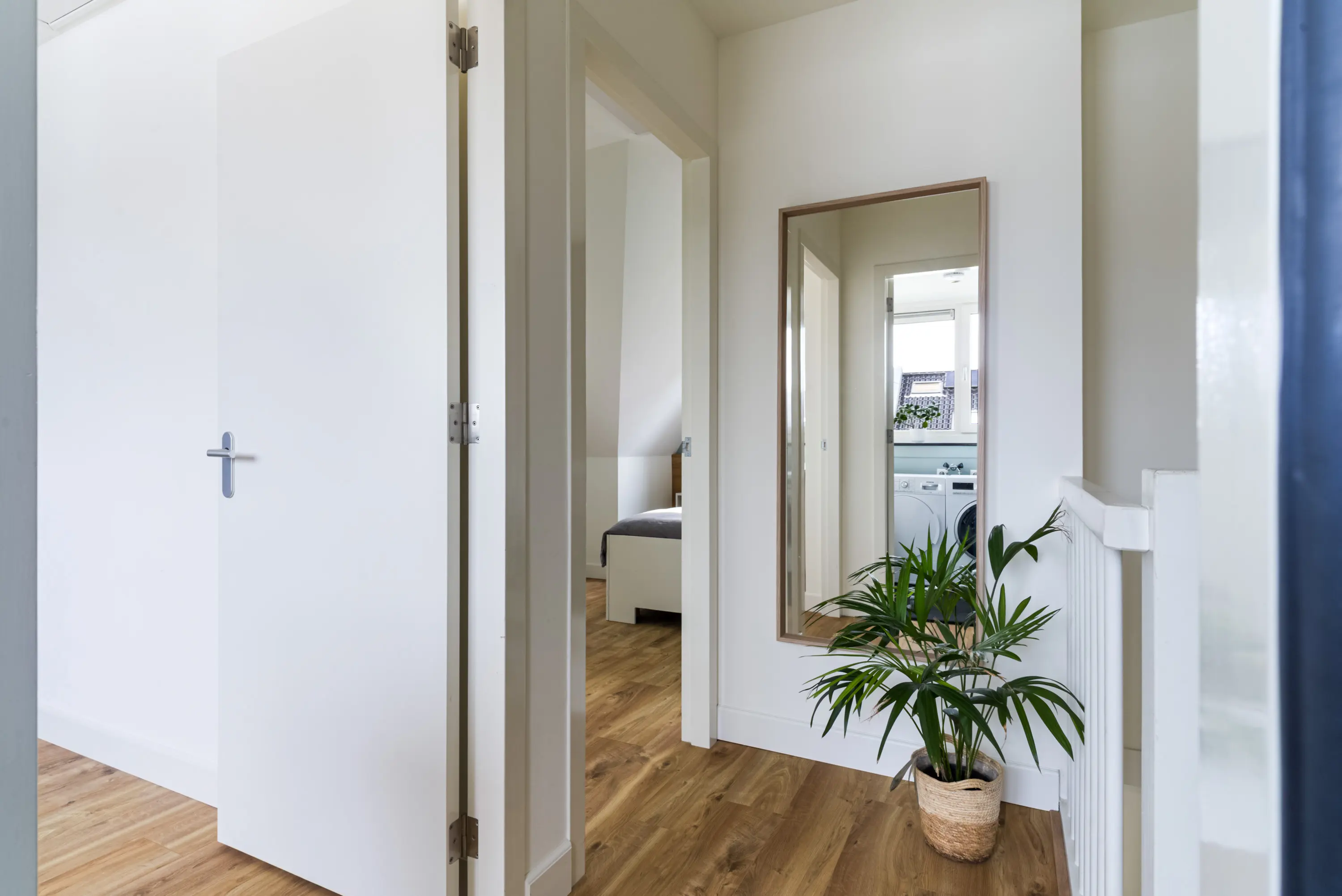 Overloop met toegang tot drie slaapkamers en de badkamer. Twee slaapkamers bevinden zich aan de voorzijde, de derde aan de achterzijde. De badkamer is compleet uitgevoerd met douche, wastafelmeubel en een hangend toilet.