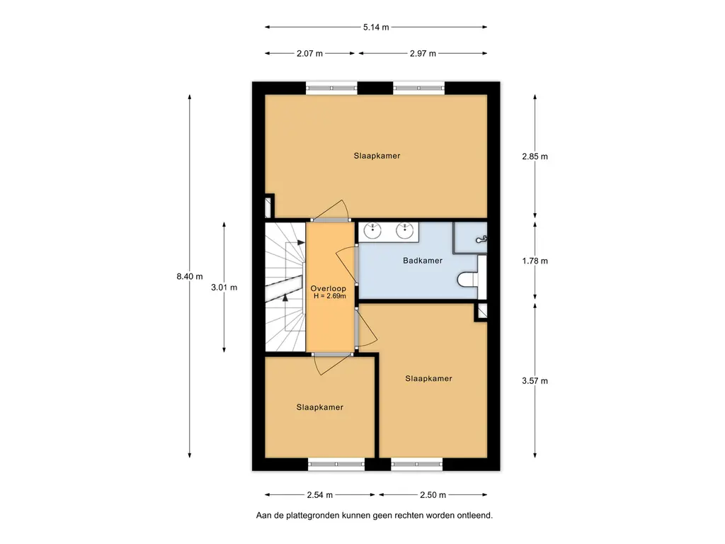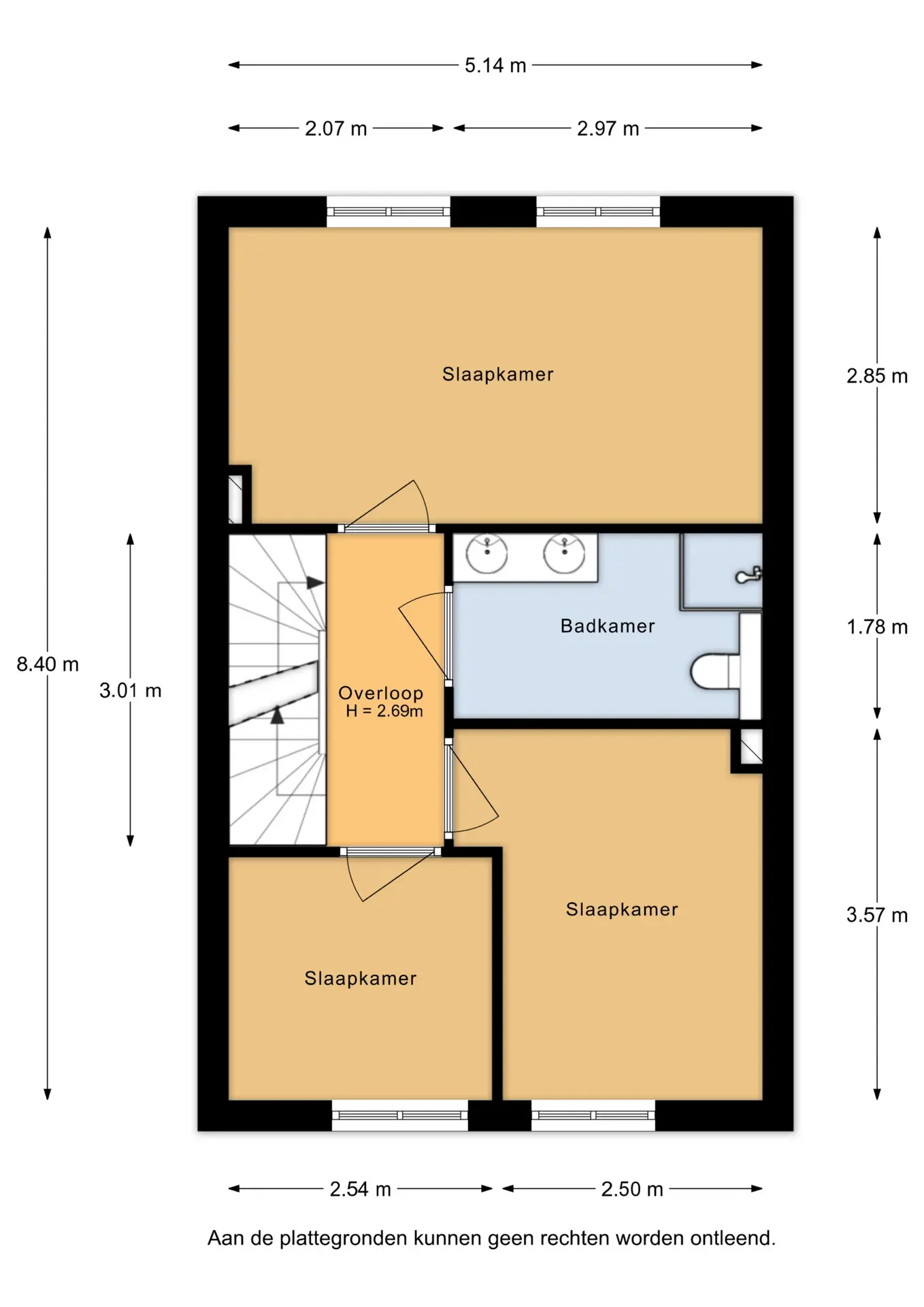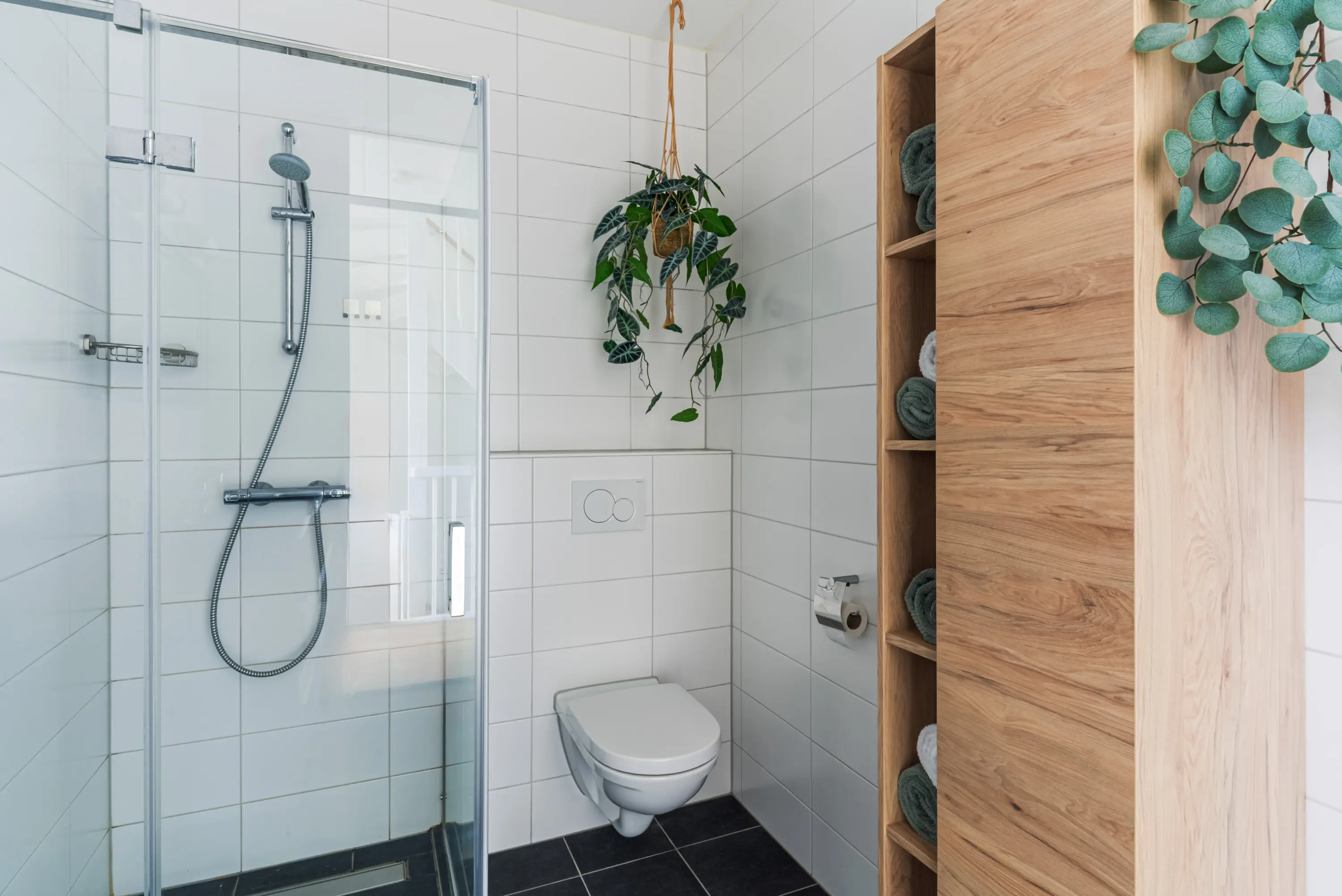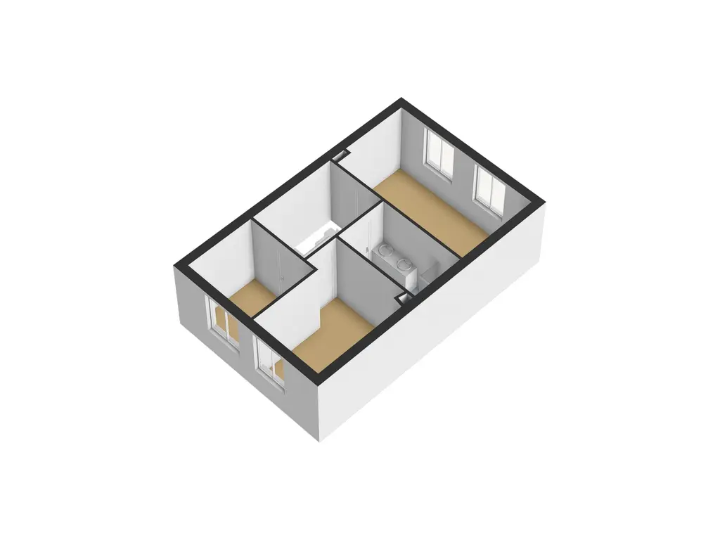 Overloop met toegang tot drie slaapkamers en de badkamer. Twee slaapkamers bevinden zich aan de voorzijde, de derde aan de achterzijde. De badkamer is compleet uitgevoerd met douche, wastafelmeubel en een hangend toilet.