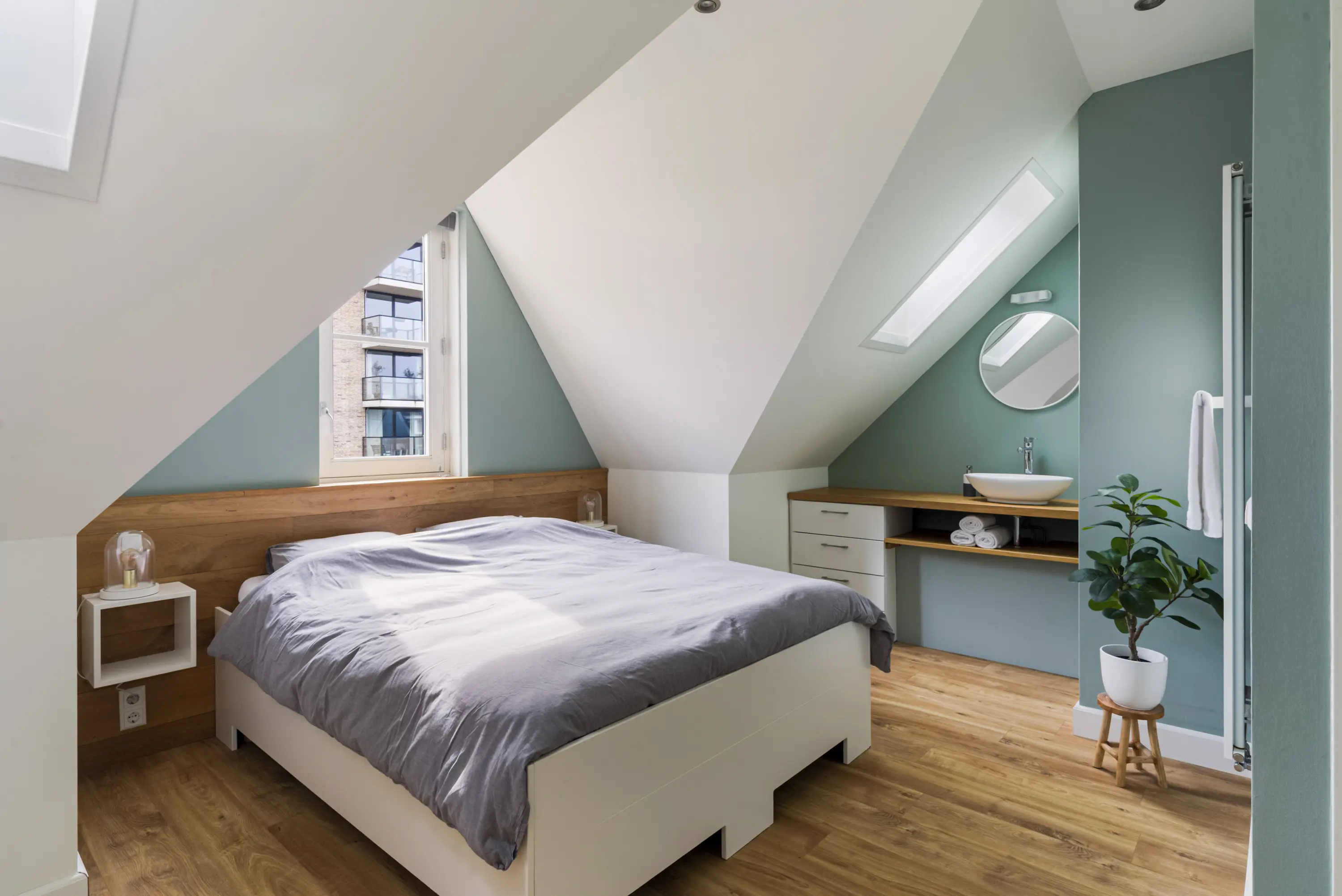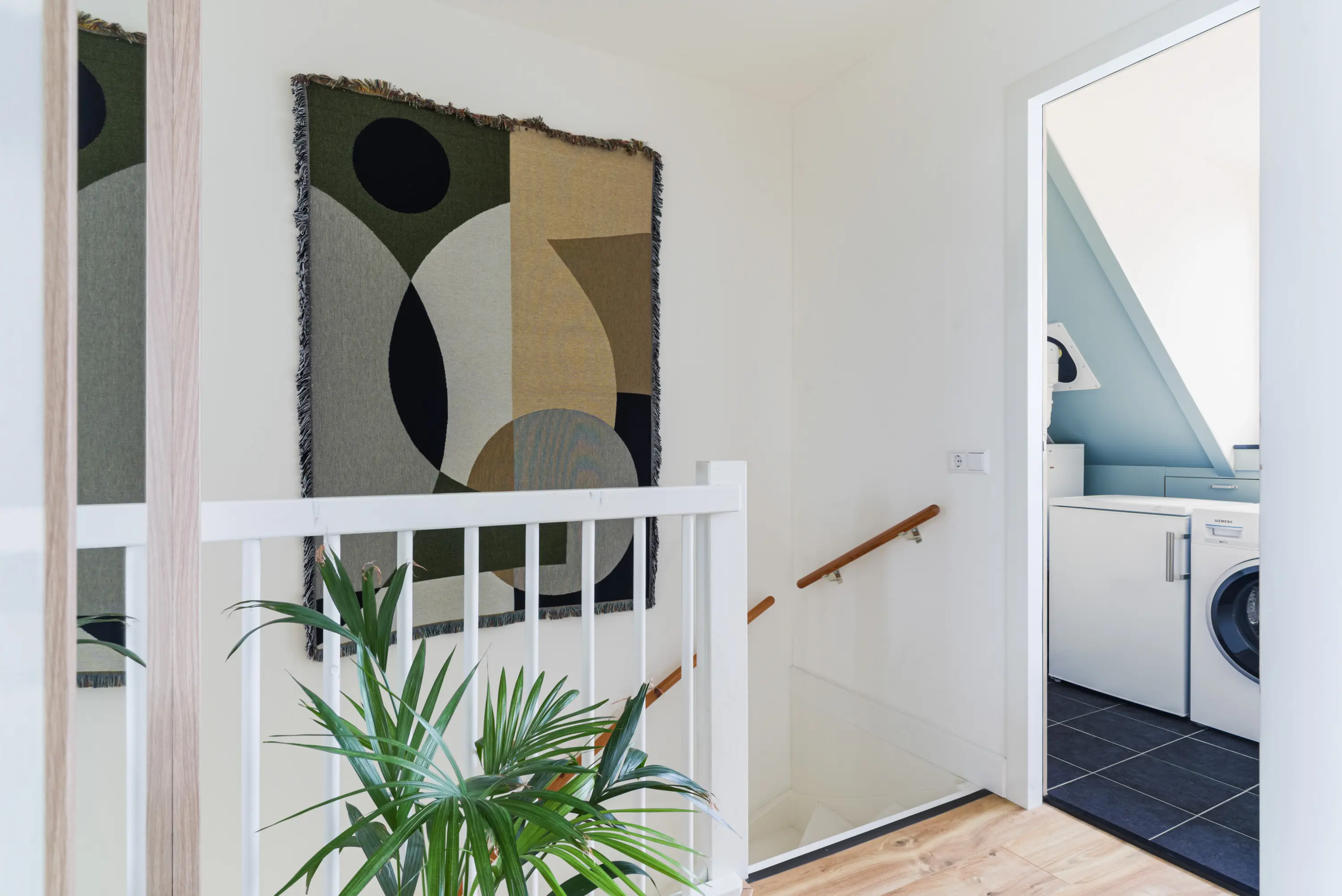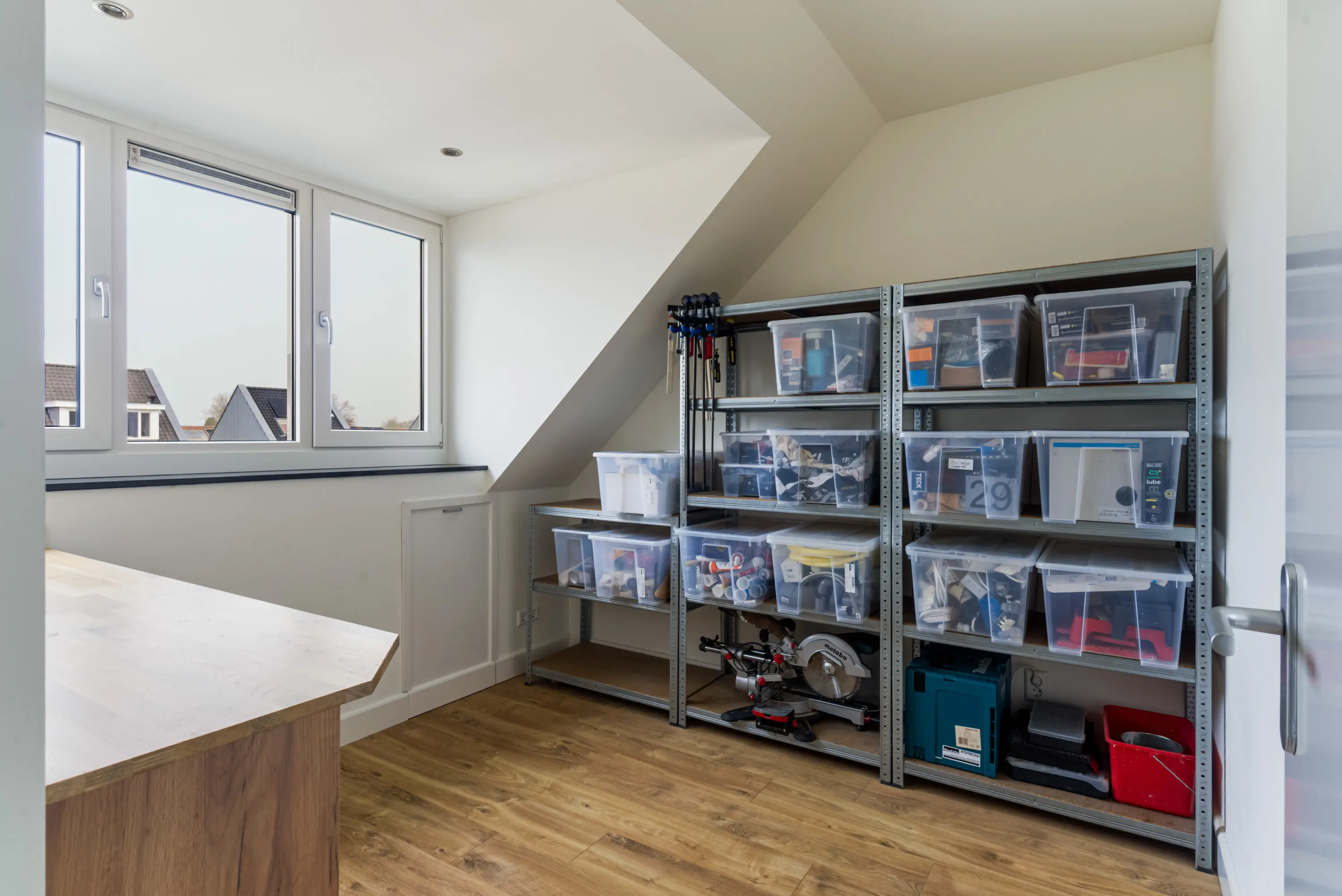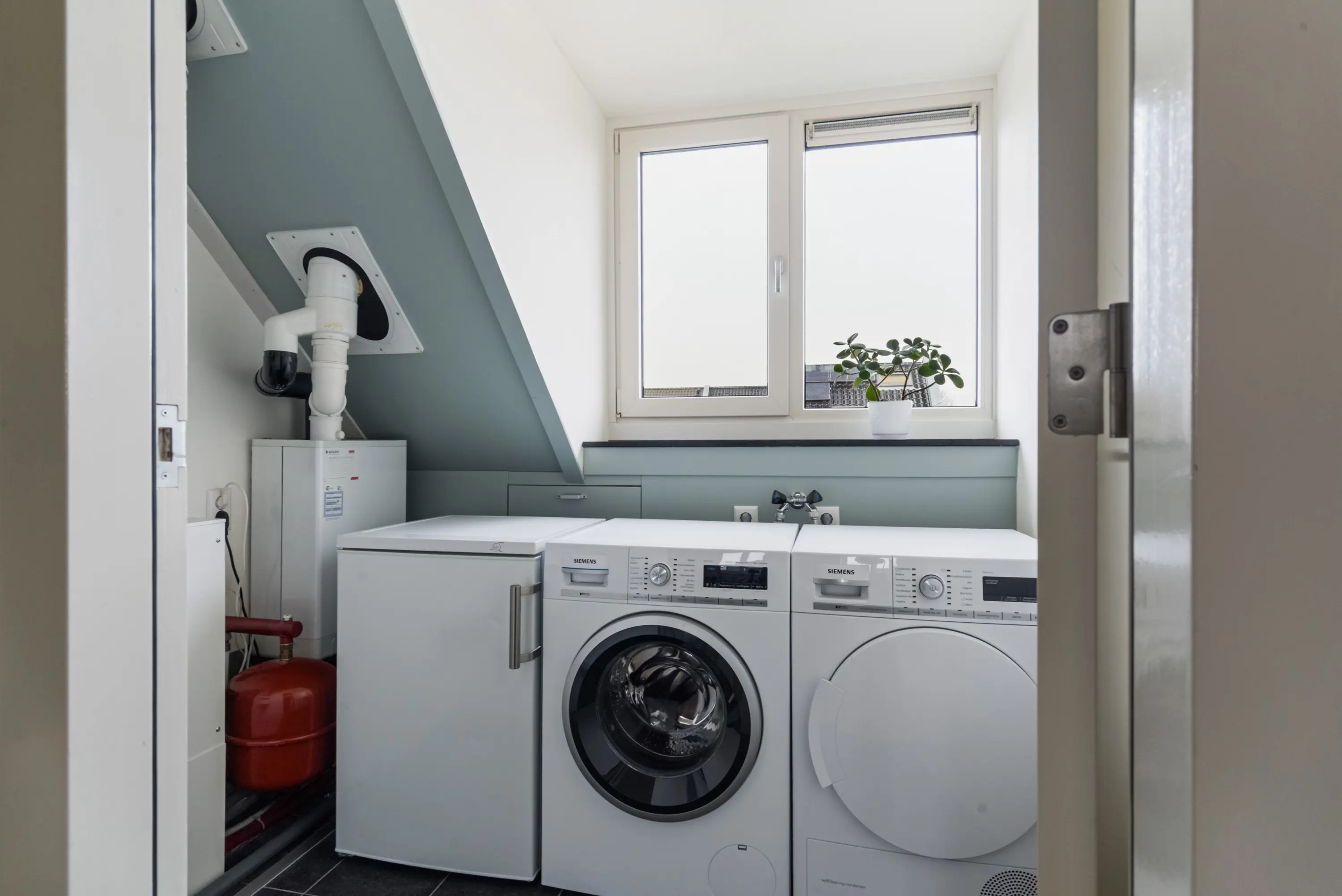 Voorzolder met waskamer met aansluitingen voor wasmachine en droger, cv-opstelling en mechanische ventilatie. Daarnaast bevinden zich hier nog twee (slaap)kamers waarvan één met een bergzolder, waarvan één lichte master bedroom met wastafel.