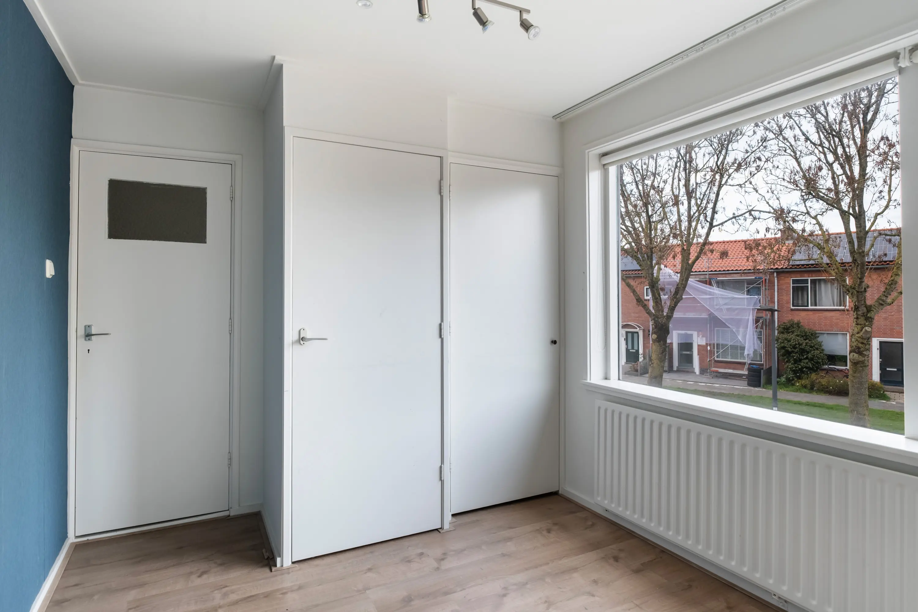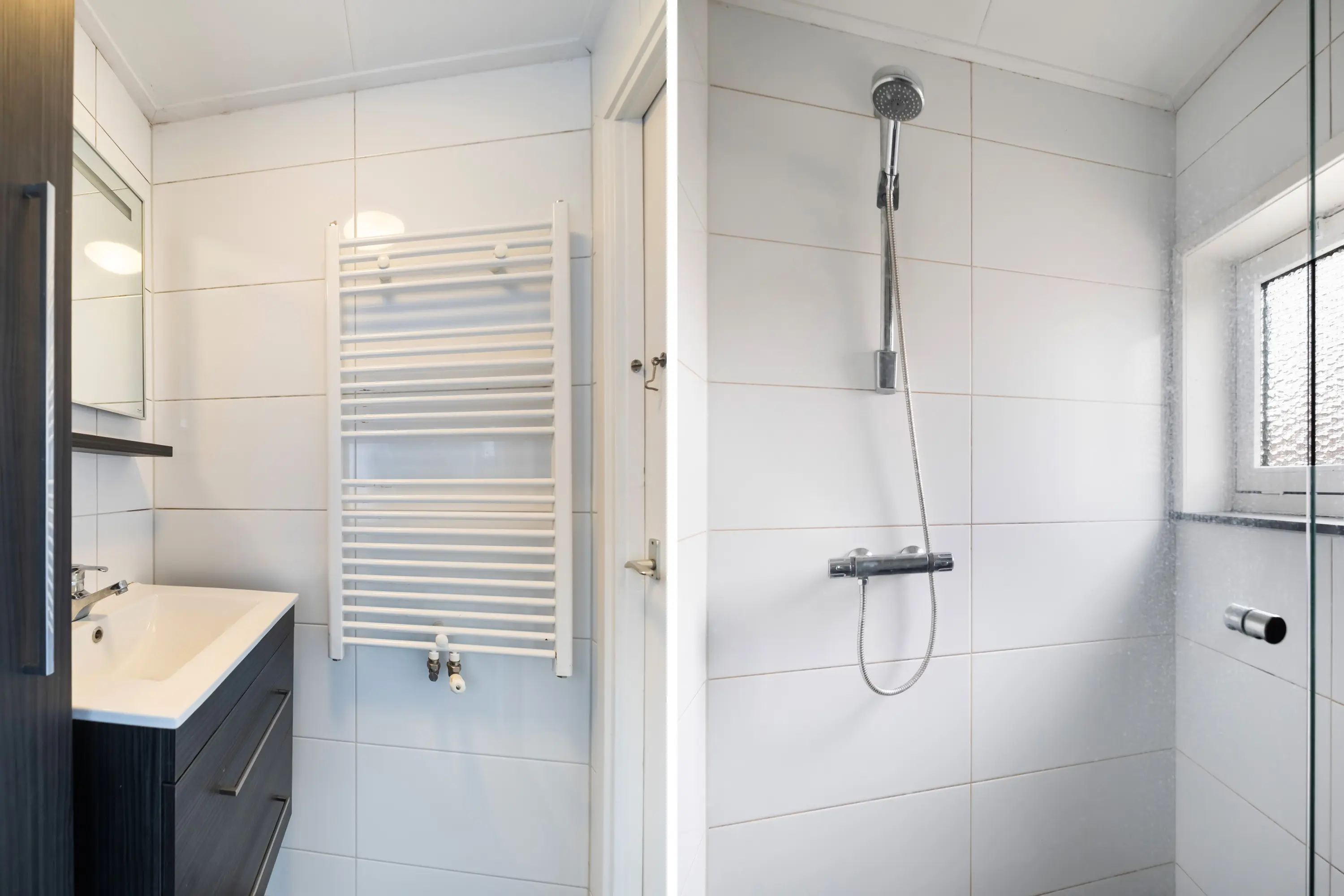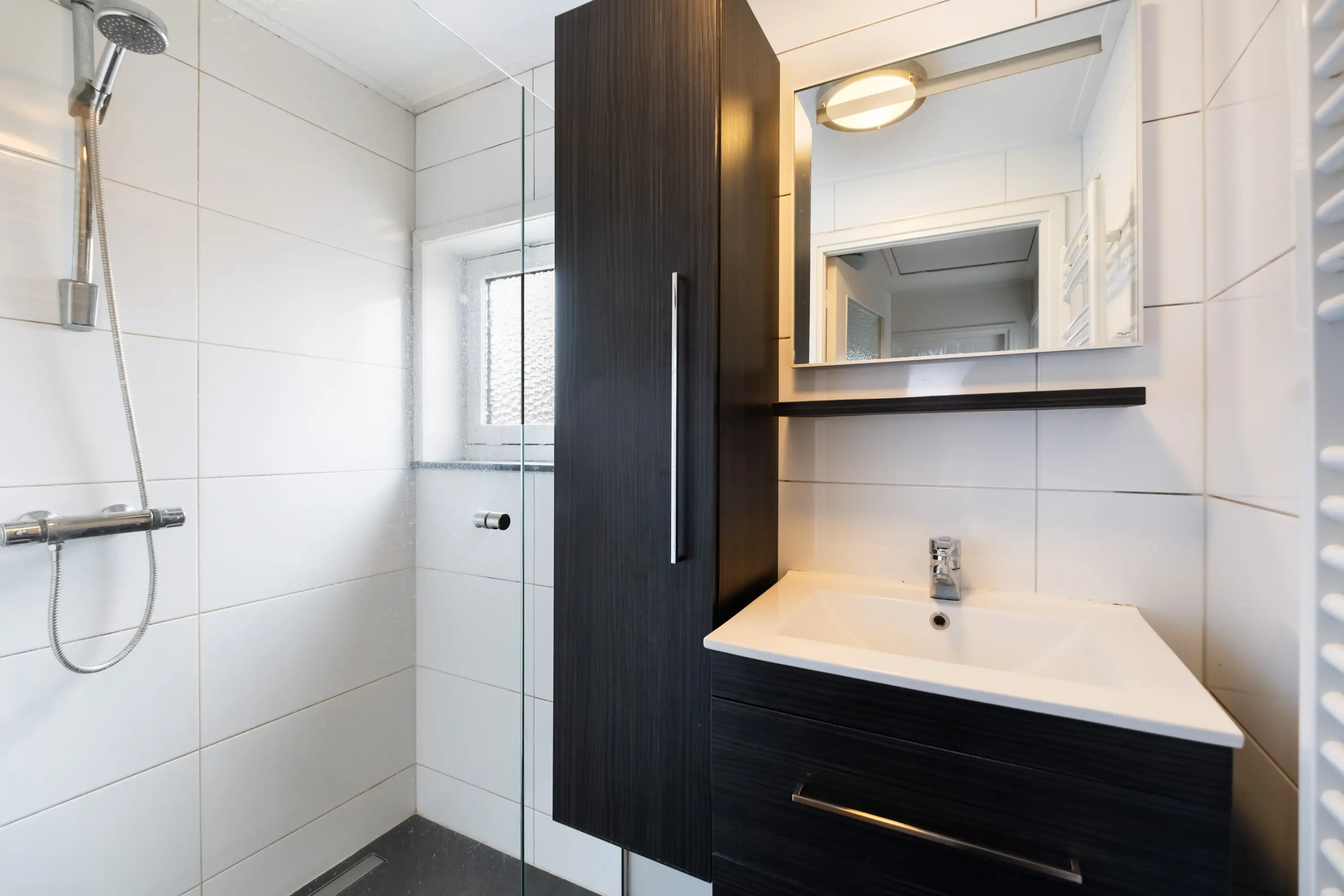 Vanaf de overloop zijn drie slaapkamers bereikbaar. Twee slaapkamers liggen aan de achterzijde en beschikken over een vaste kast. De derde slaapkamer aan de voorzijde heeft eveneens een vaste kast plus een kast met aansluitingen voor wasmachine en droger. De volledig betegelde badkamer is uitgerust met een inloopdouche met thermostaatkraan, badkamermeubel, wastafel en handdoekradiator. De gehele verdieping is voorzien van laminaat.