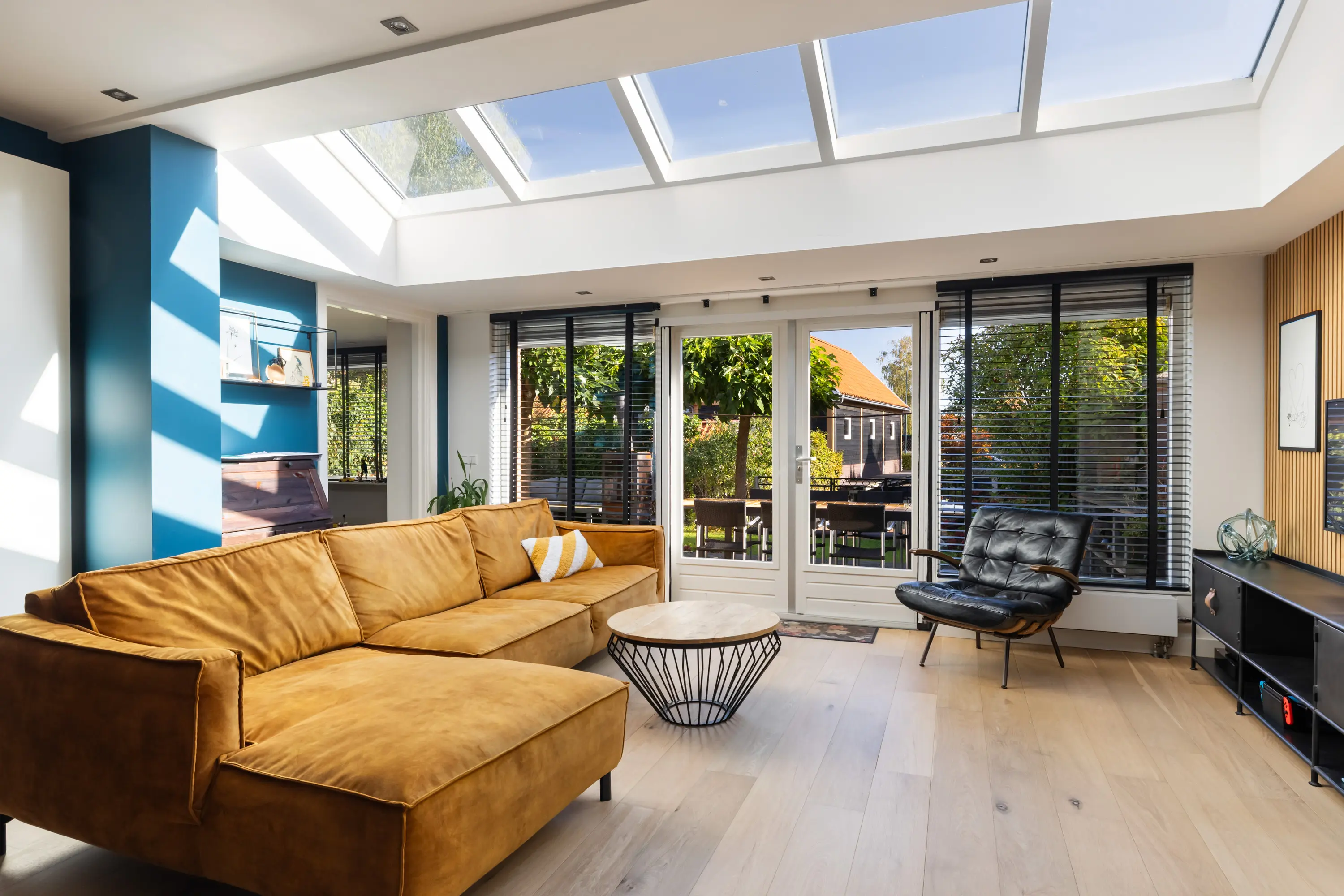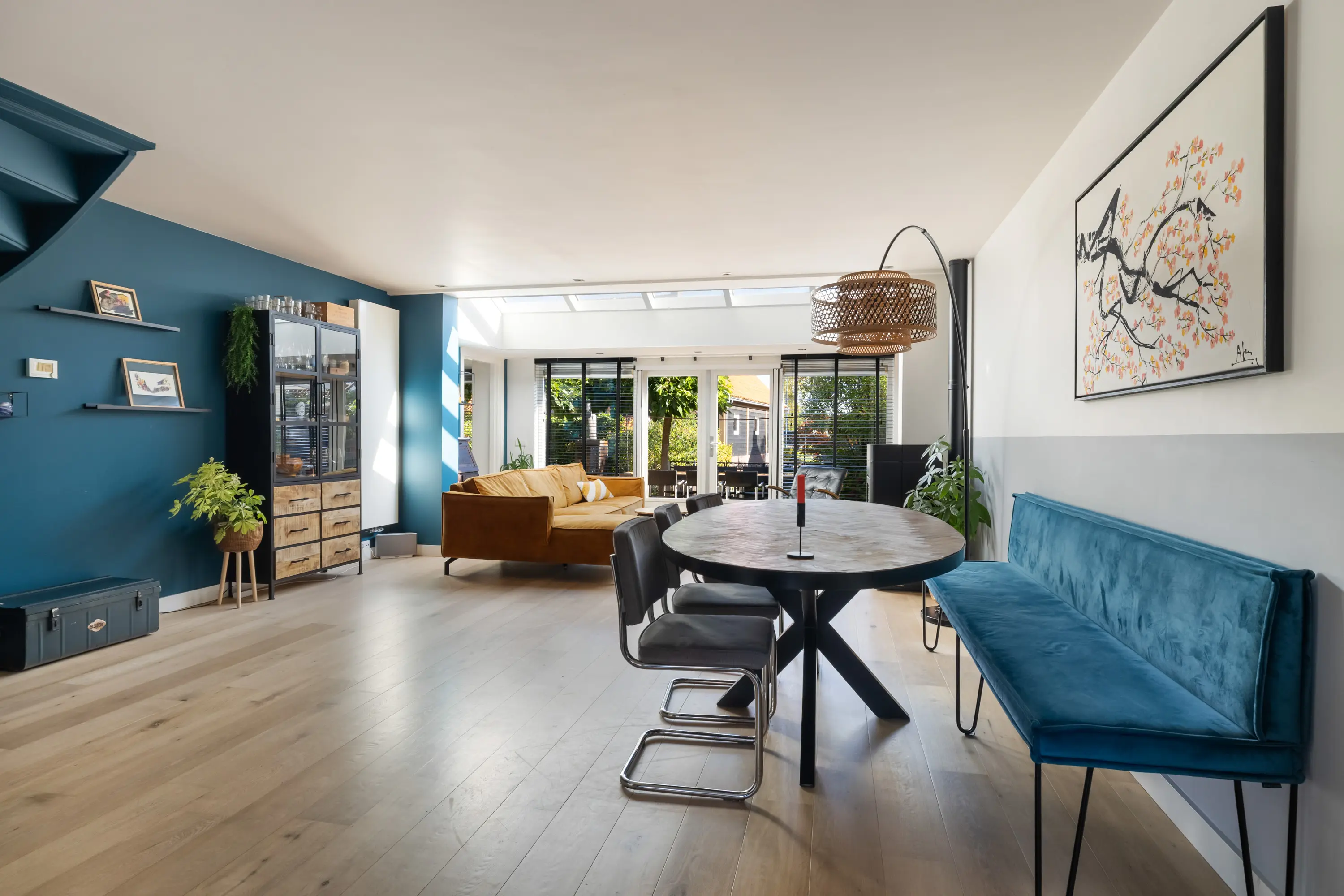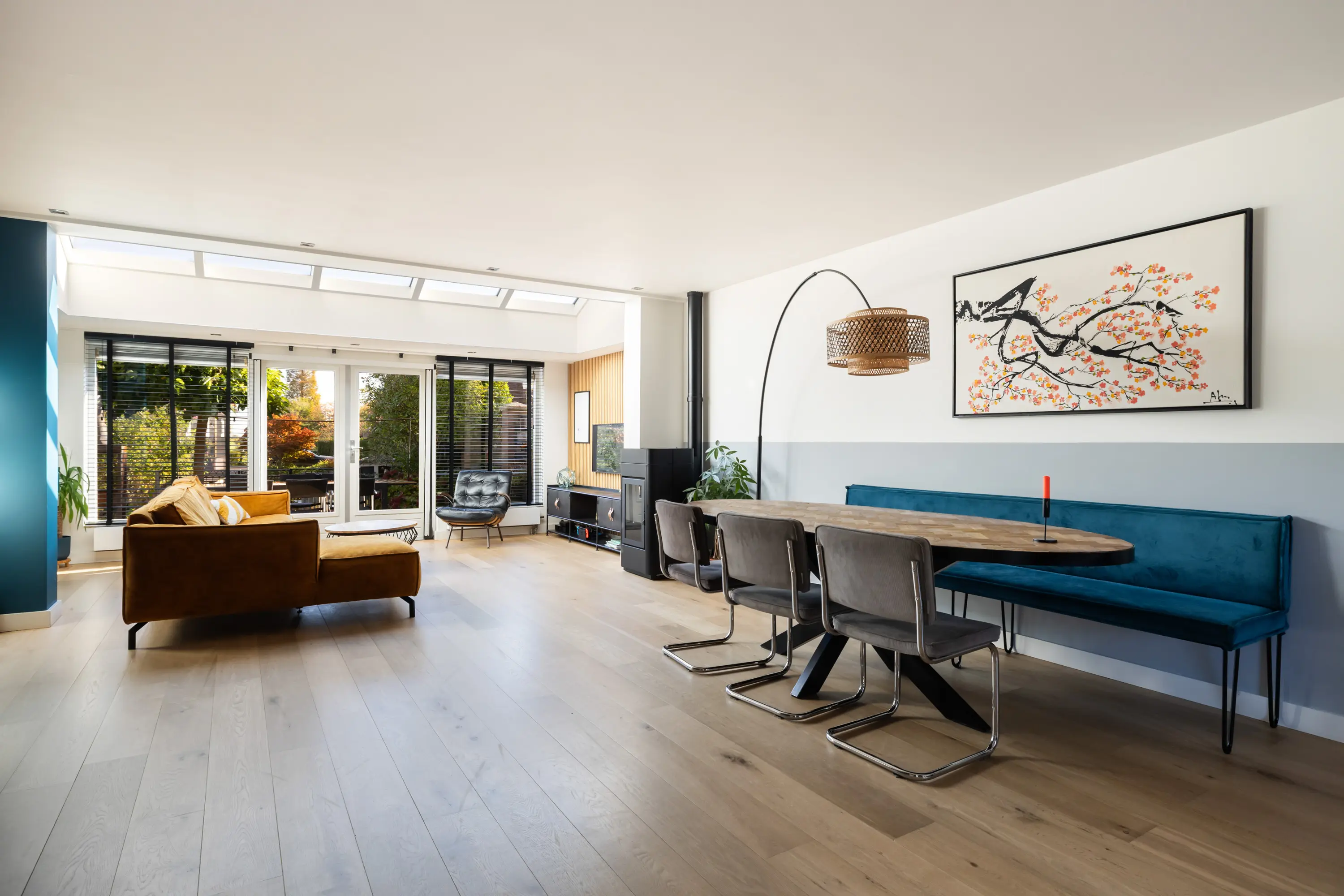De sfeervolle, uitgebouwde woonkamer is voorzien van houten vloerdelen, een lichtstraat en openslaande deuren naar de fraai aangelegde tuin.