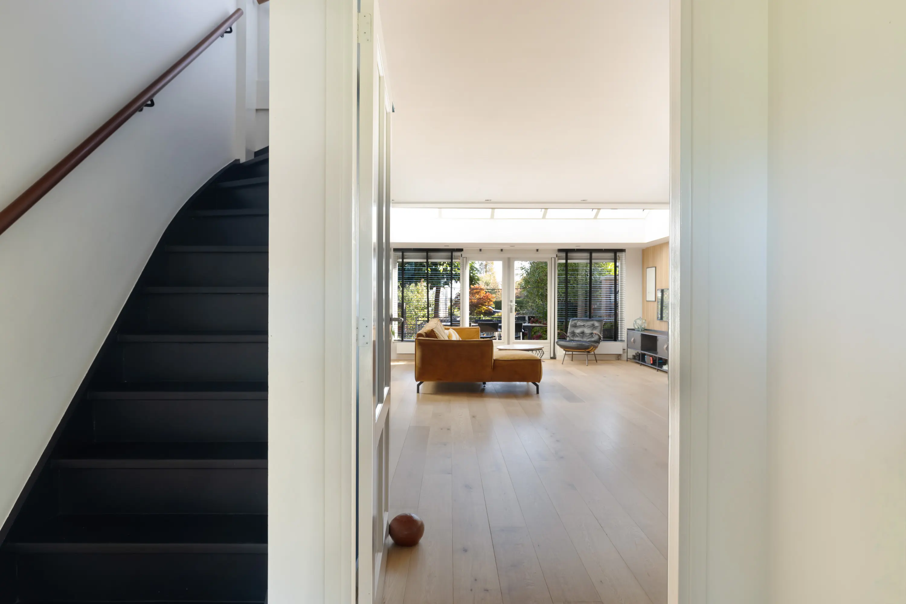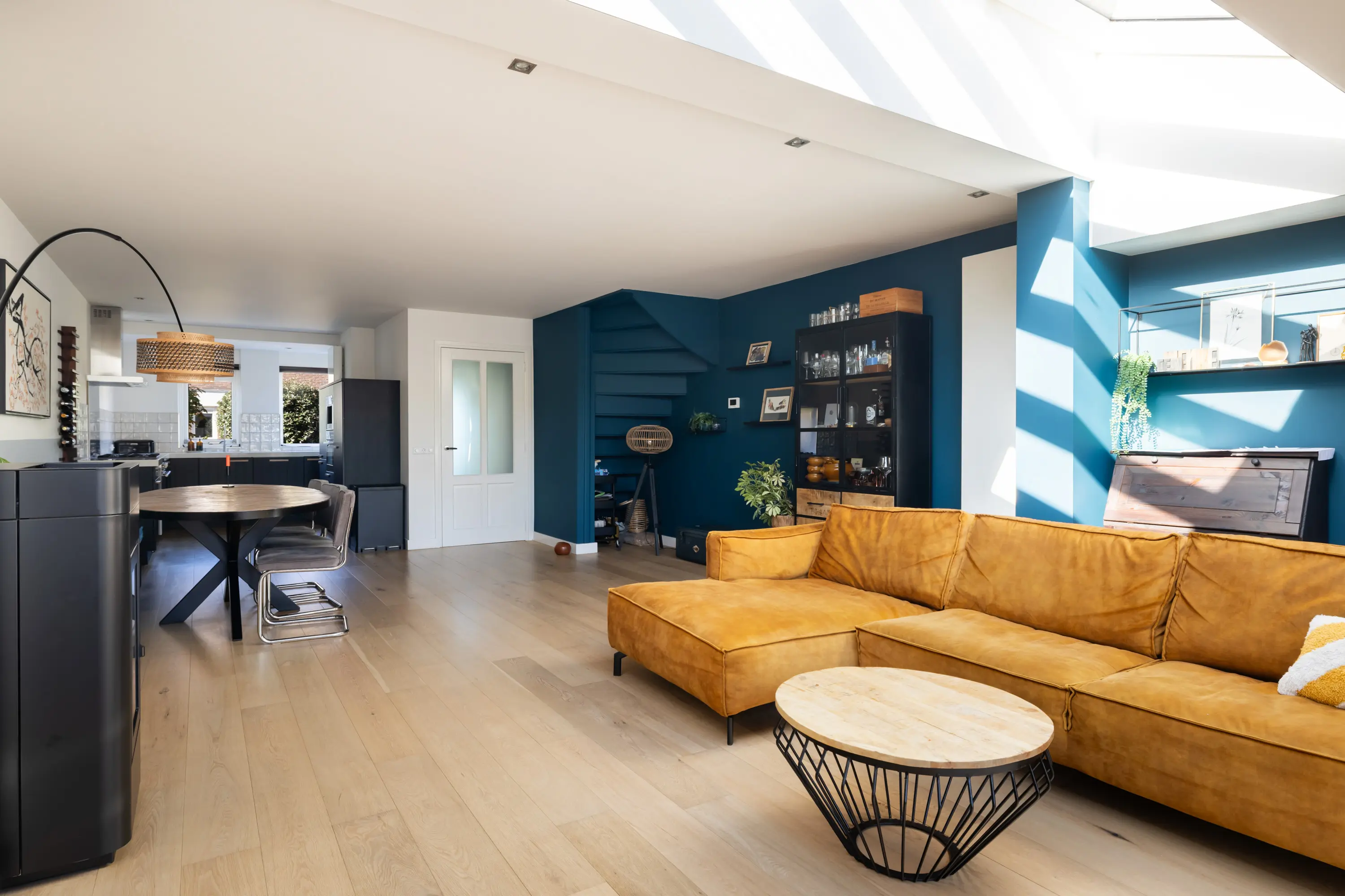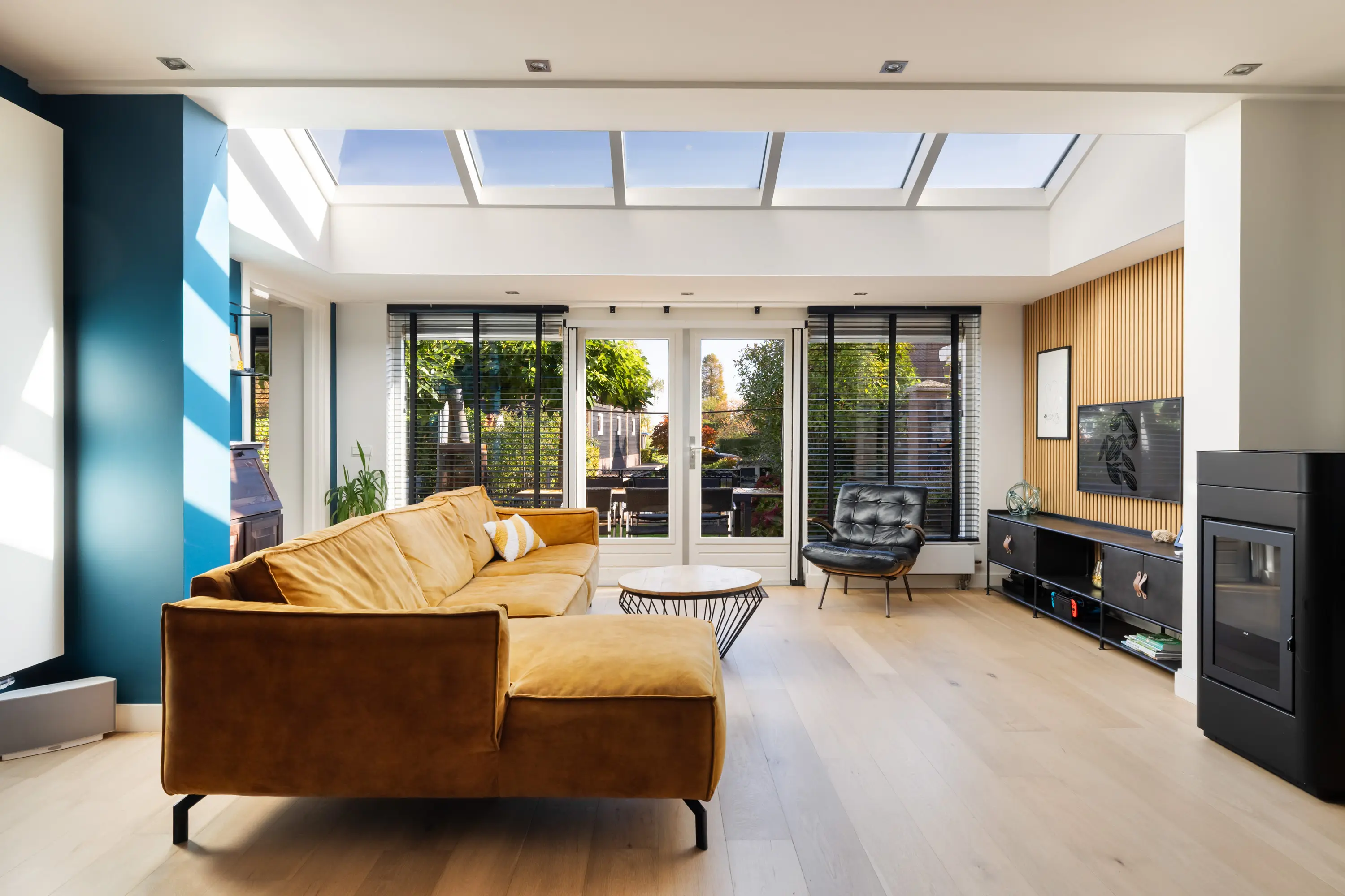 De sfeervolle, uitgebouwde woonkamer is voorzien van houten vloerdelen, een lichtstraat en openslaande deuren naar de fraai aangelegde tuin.