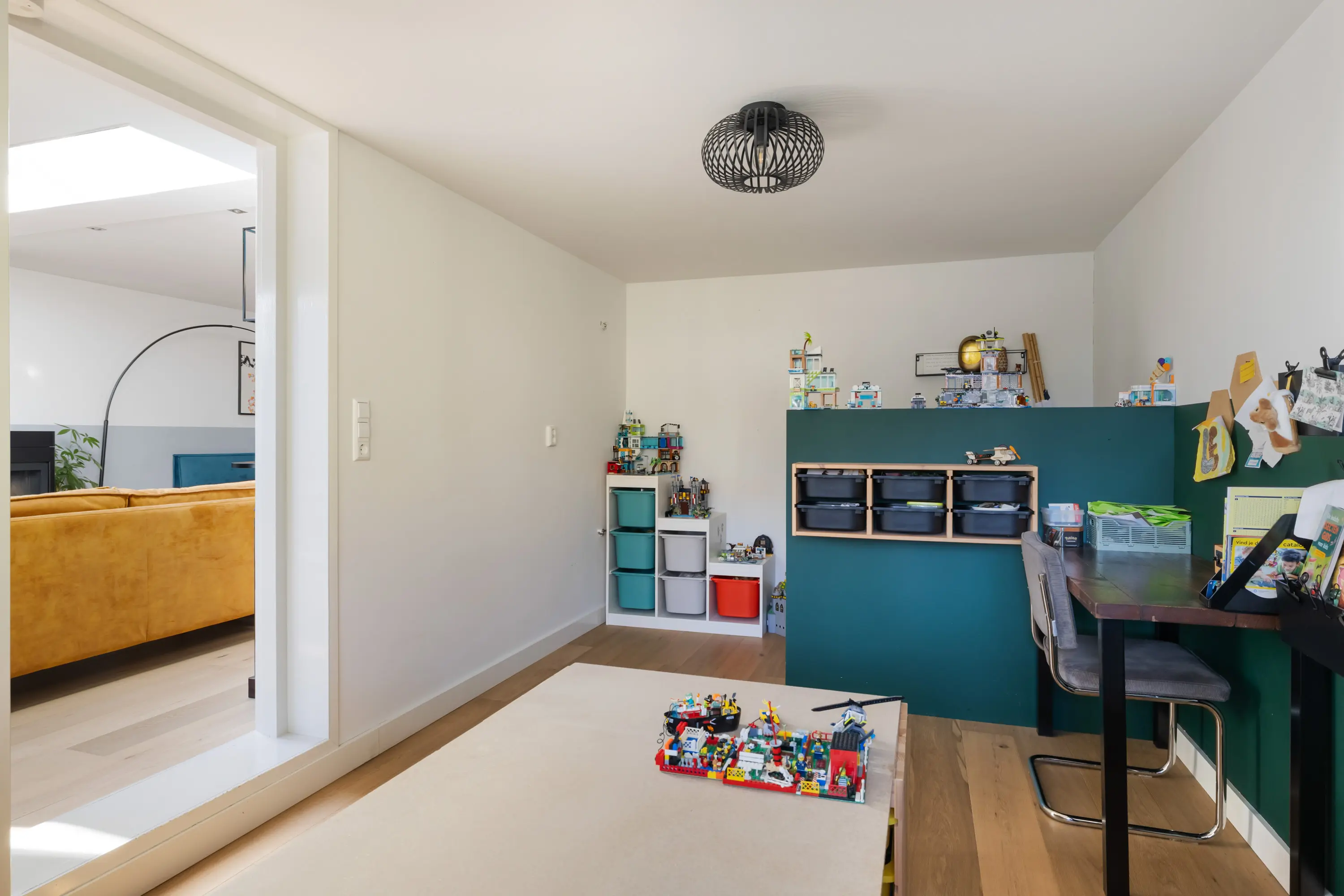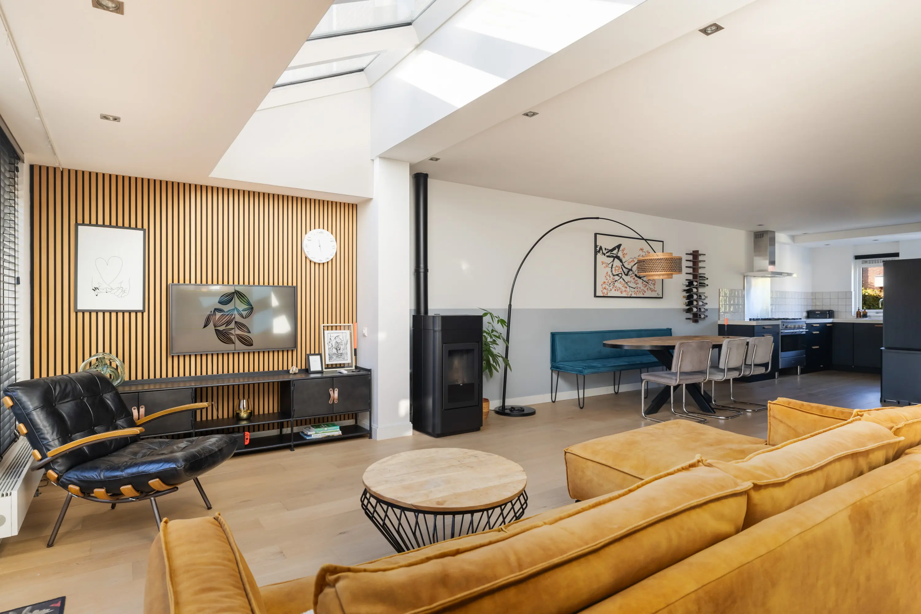 De pelletkachel (ter overname) zorgt voor extra warmte en gezelligheid. Aansluitend treft u een multifunctionele ruimte, perfect als speelkamer, thuiskantoor of extra eetkamer.