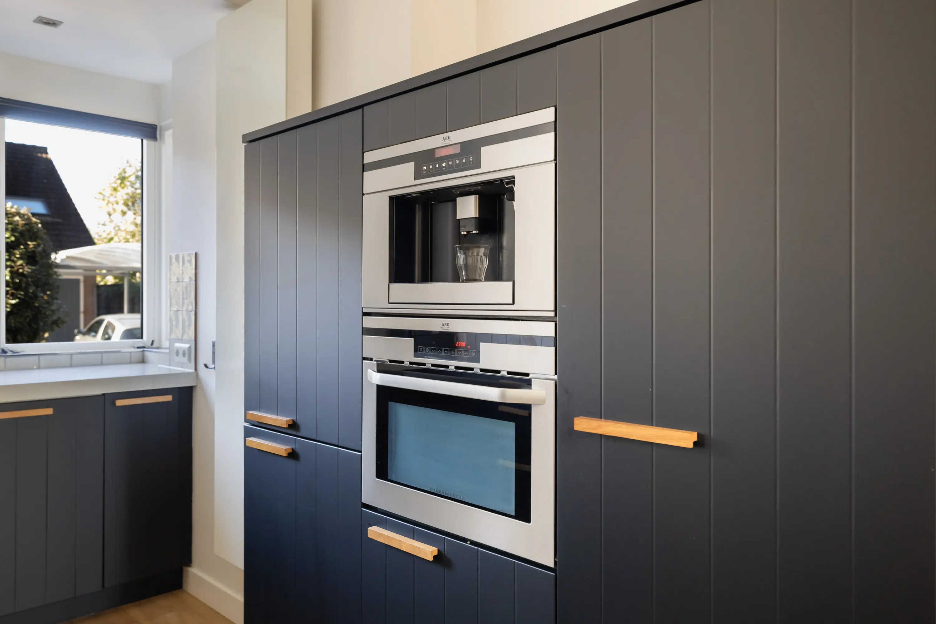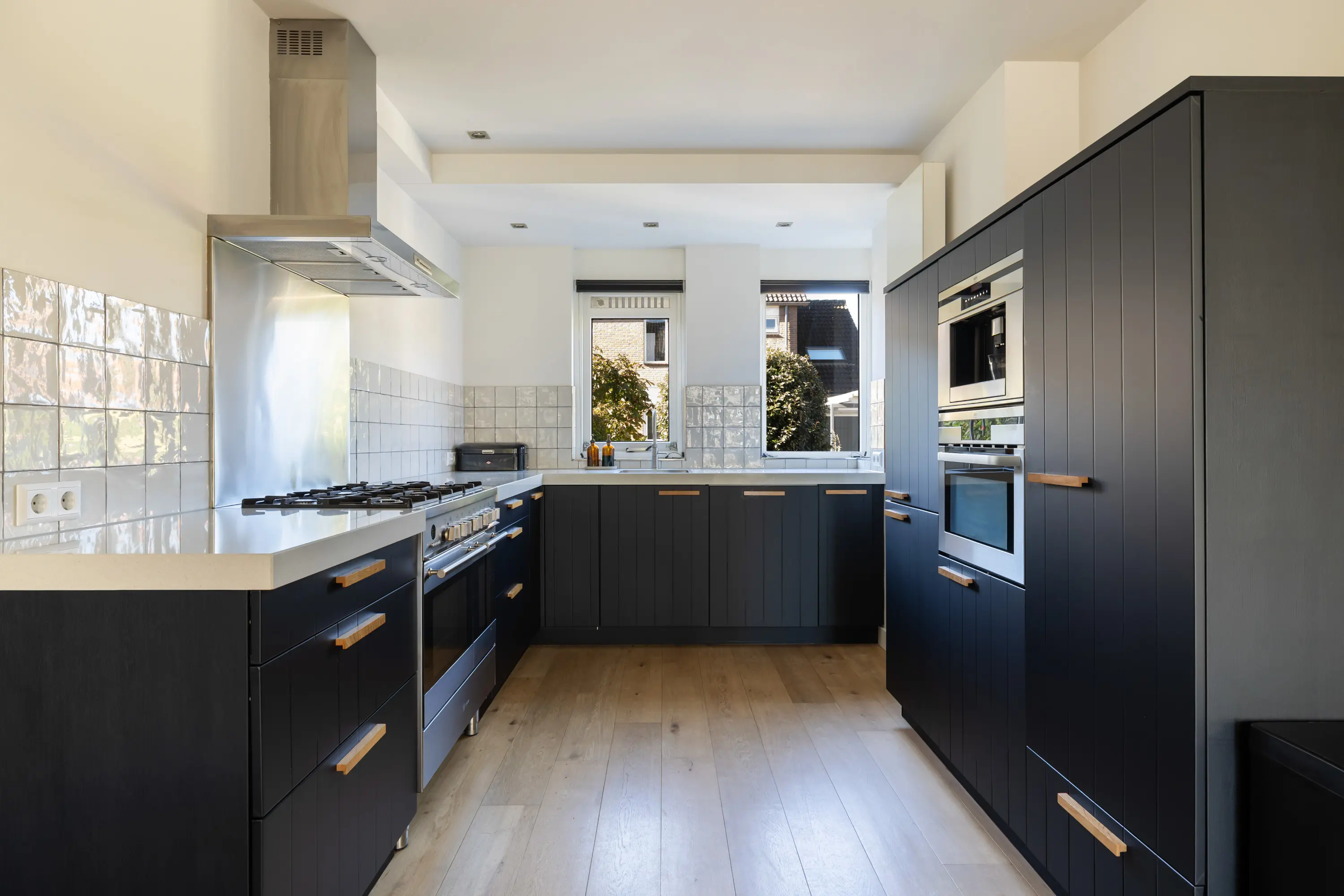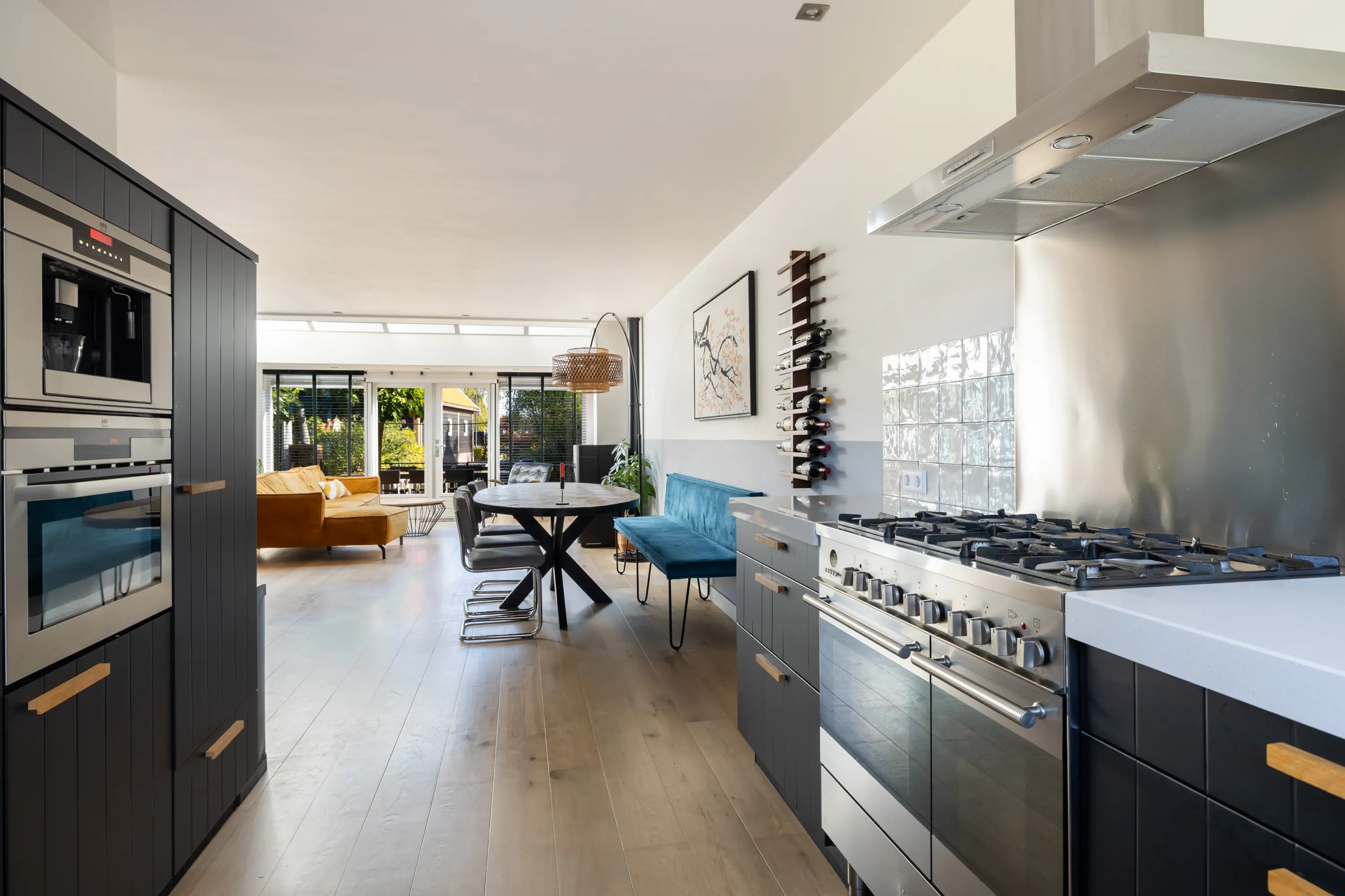 Aan de voorzijde bevindt zich de royale U-vormige open keuken, compleet met alle denkbare inbouwapparatuur: koelkast, vaatwasser, 6-pits gasfornuis, combi-oven, afzuigkap én een ingebouwd koffiezetapparaat.