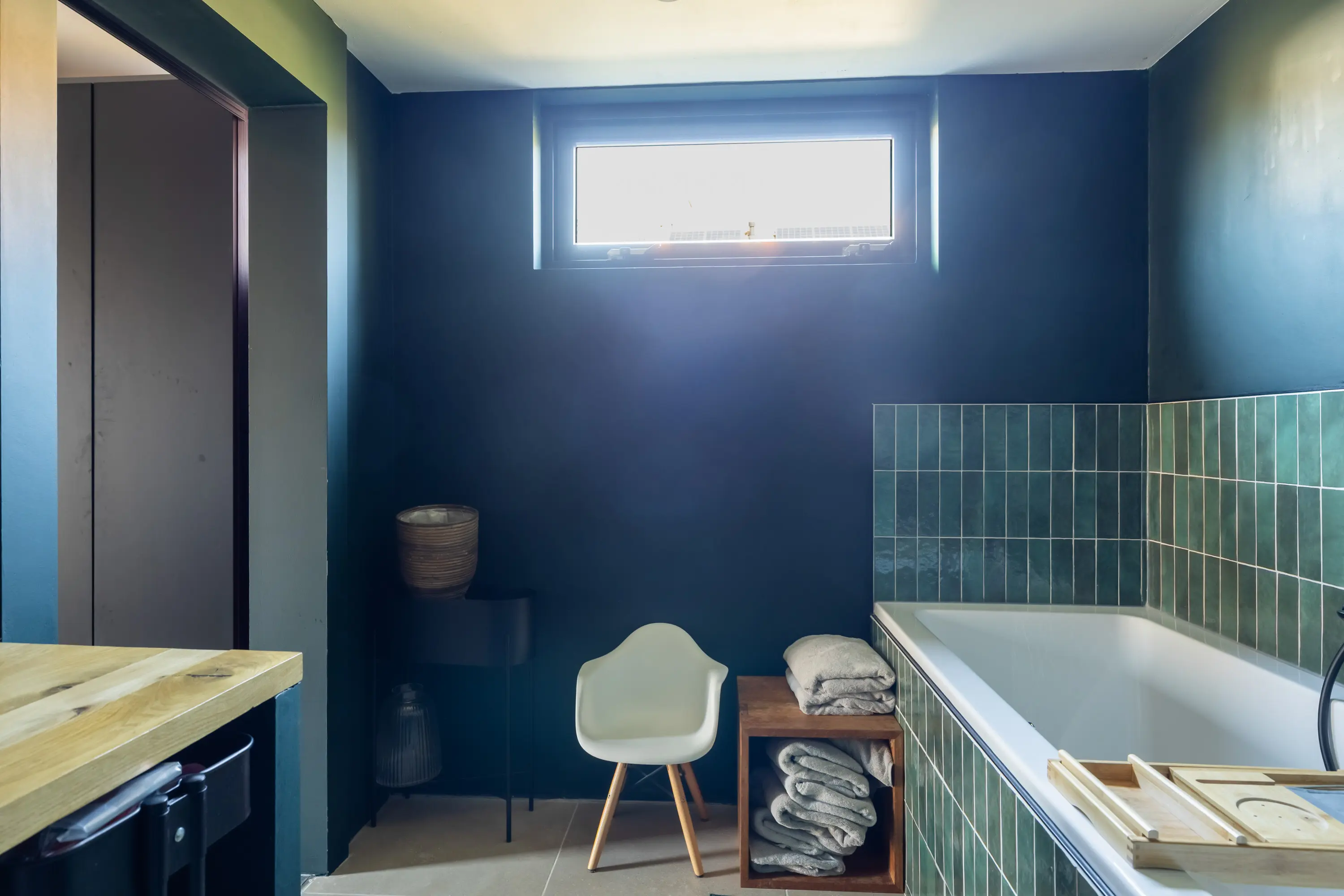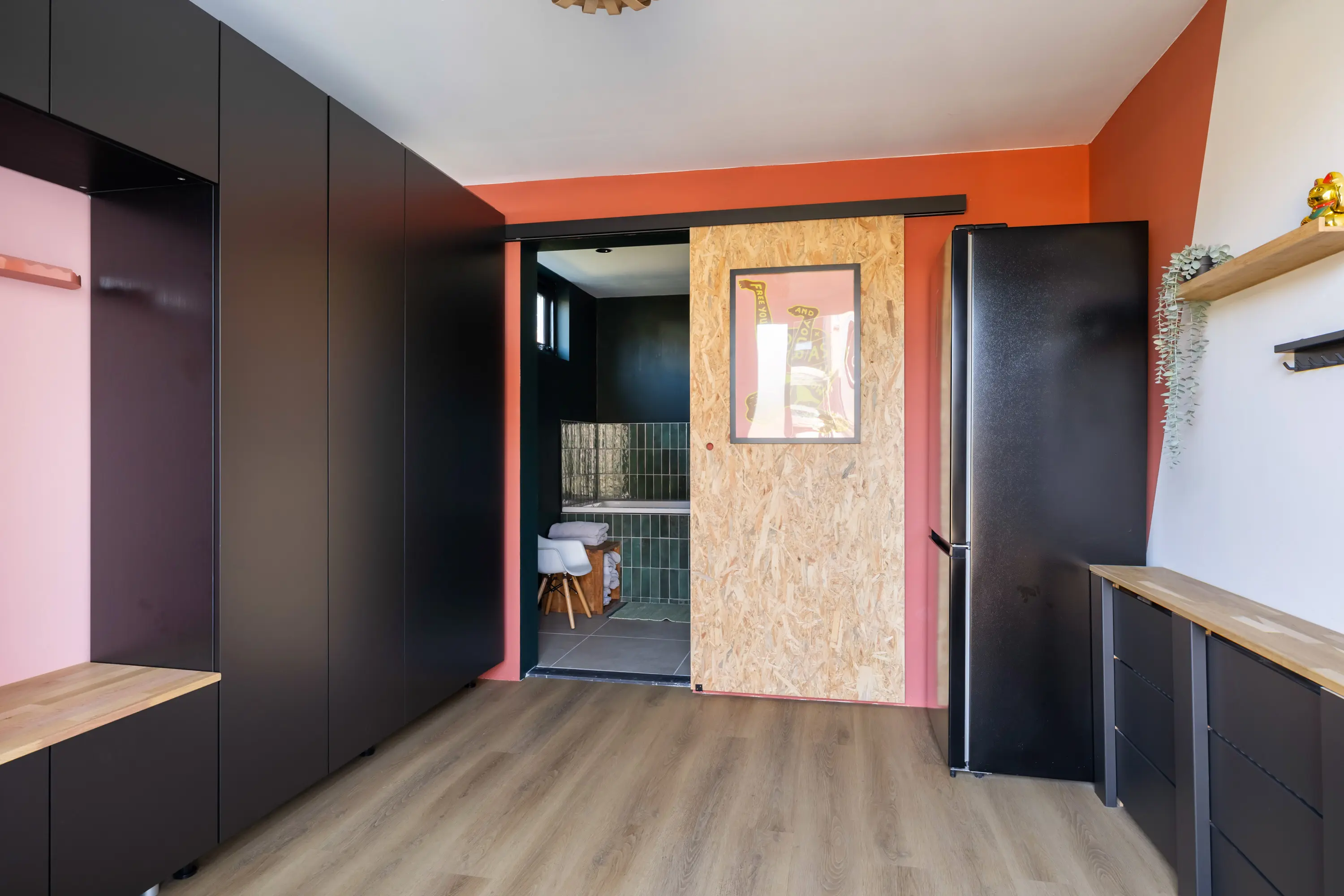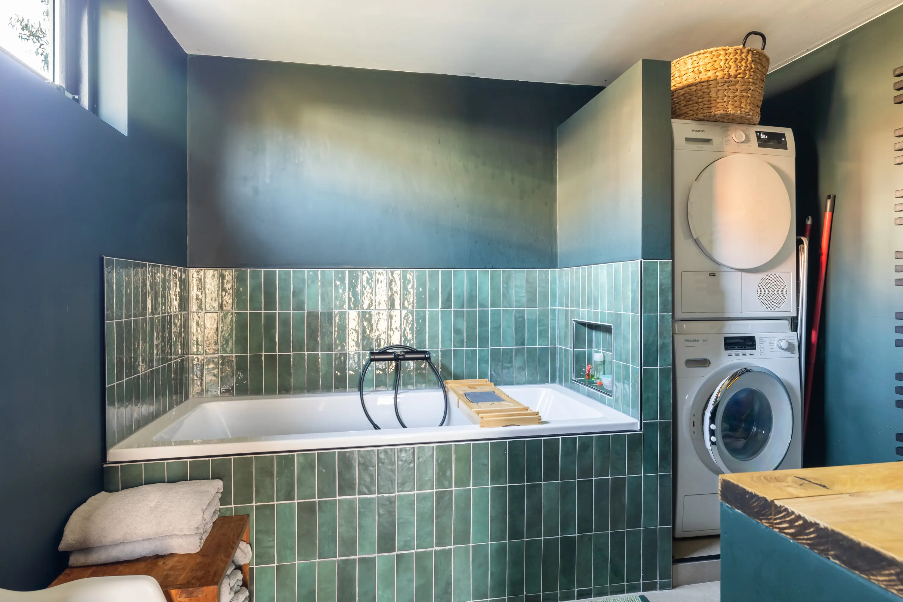 Deze voormalige garage is in 2024 omgebouwd tot een praktische berging met een tweede badkamer, voorzien van ligbad en aansluitpunten voor wasmachine en droger.