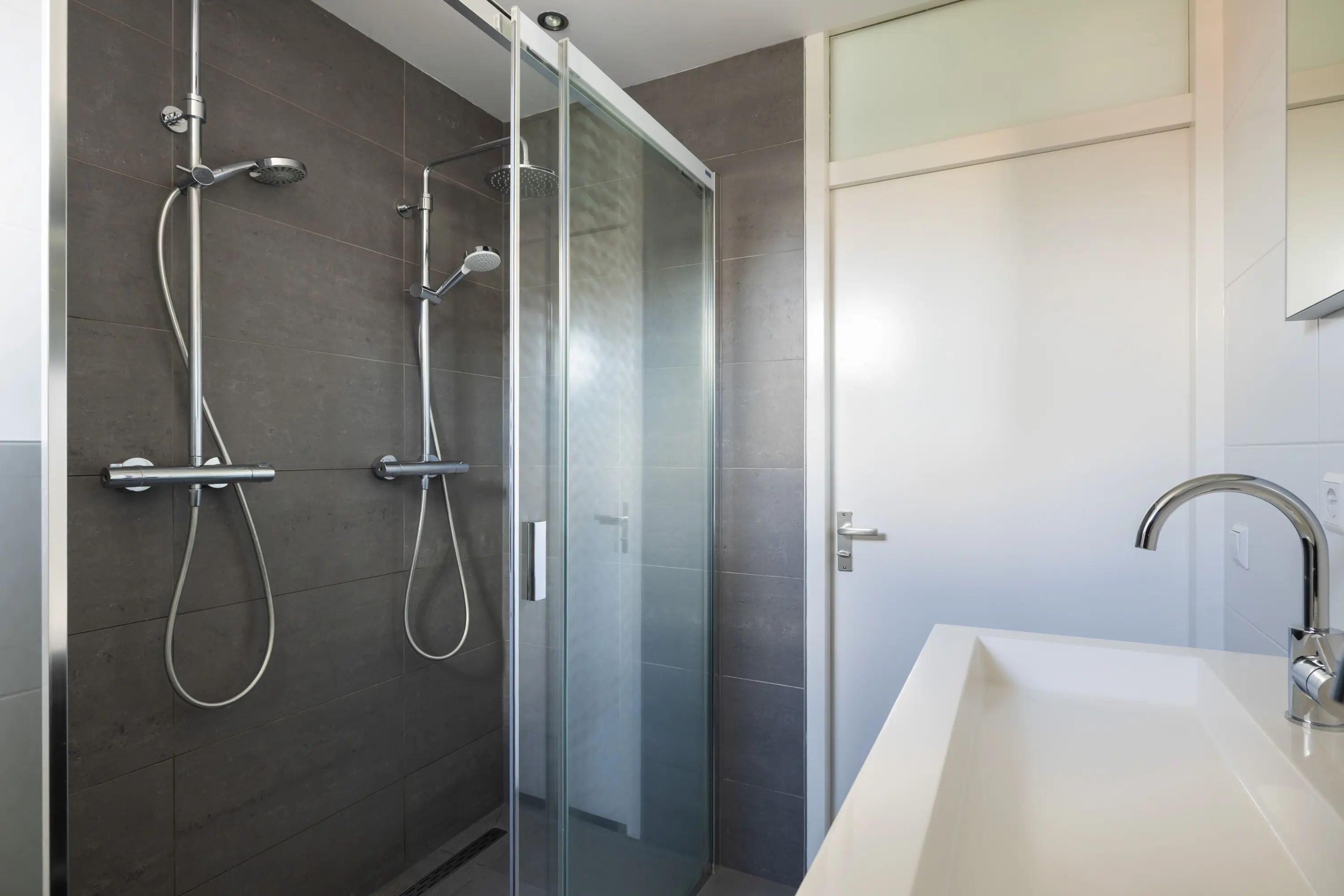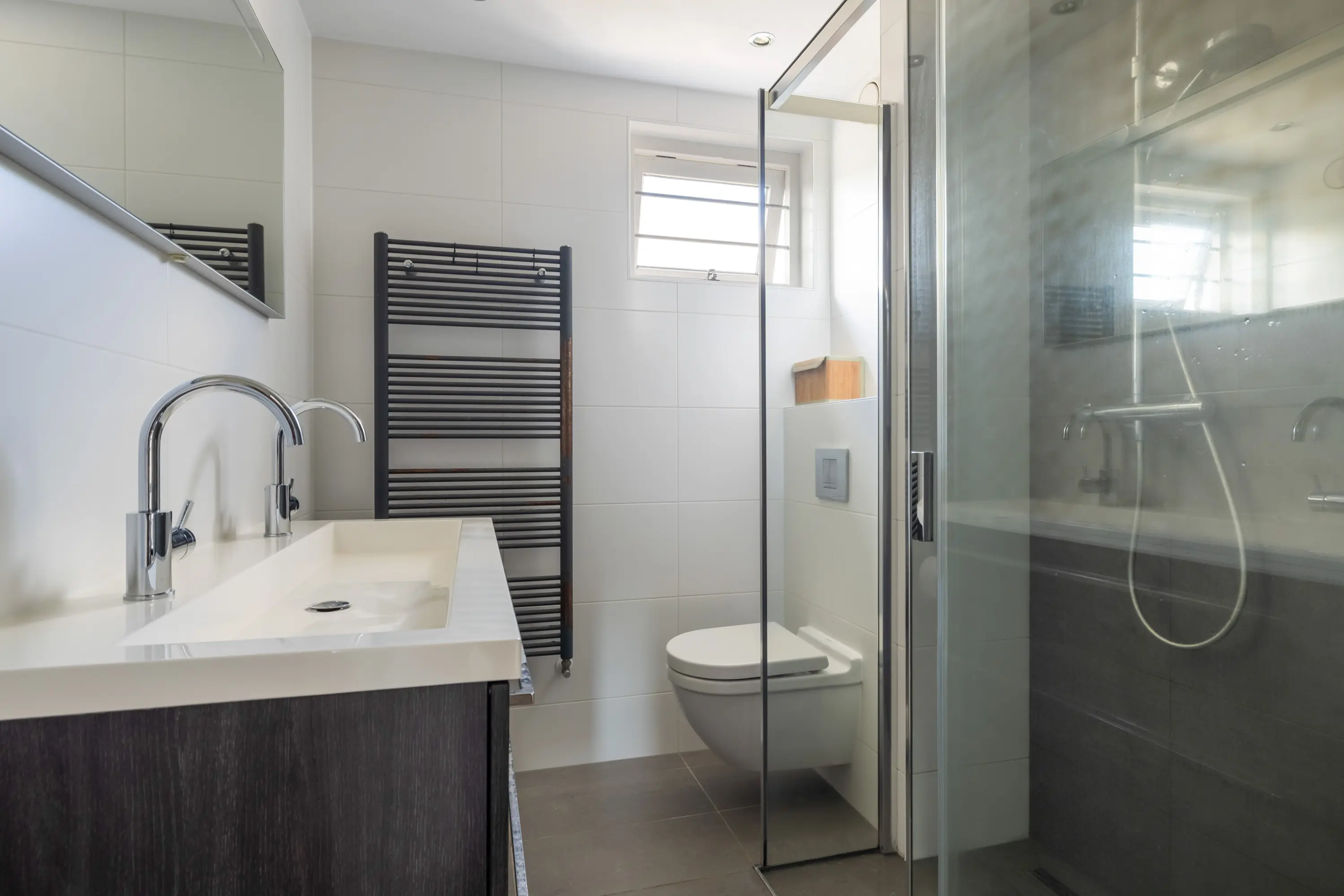 Hier bevinden zich twee ruime slaapkamers (voorheen drie, eenvoudig terug te brengen) en een badkamer met dubbele inloopdouche, tweede toilet, dubbele wastafel met meubel, handdoekradiator en inbouwspots.