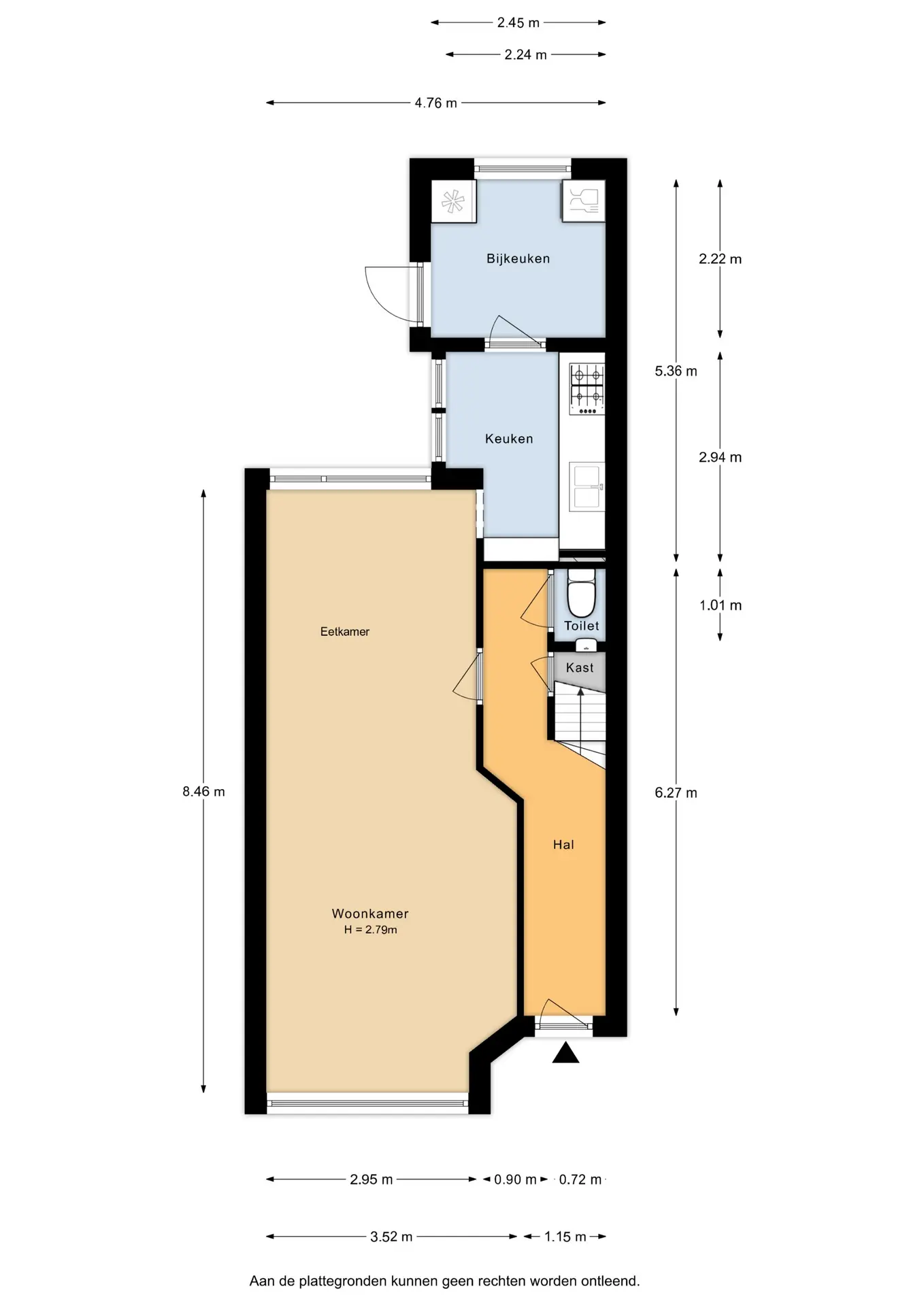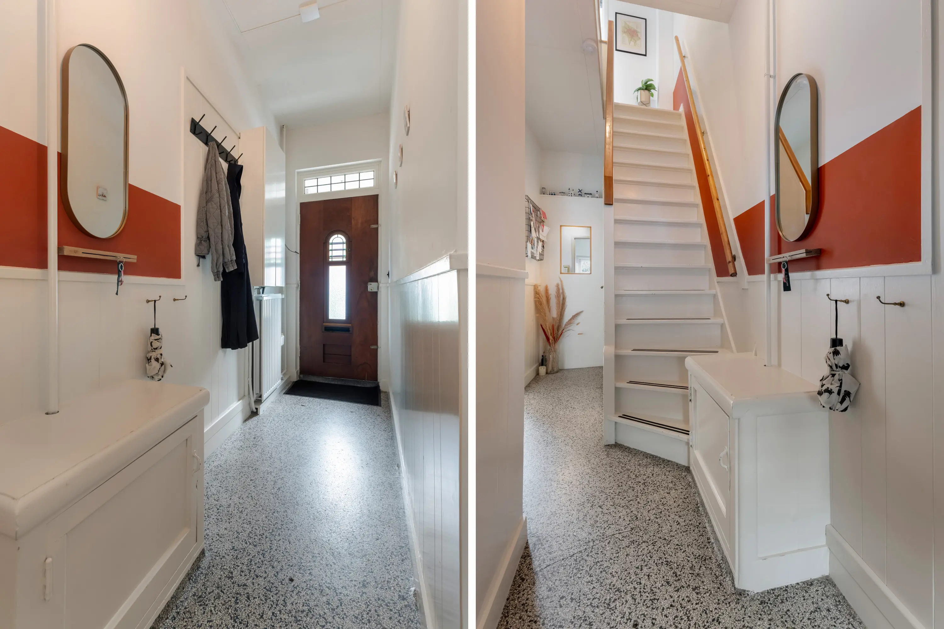 Via de voortuin bereikt u de entree van de woning. De hal valt direct op door de authentieke granitovloer en biedt toegang tot de meterkast, het toilet met fonteintje, de trapopgang naar de eerste verdieping en een handige trapkast.