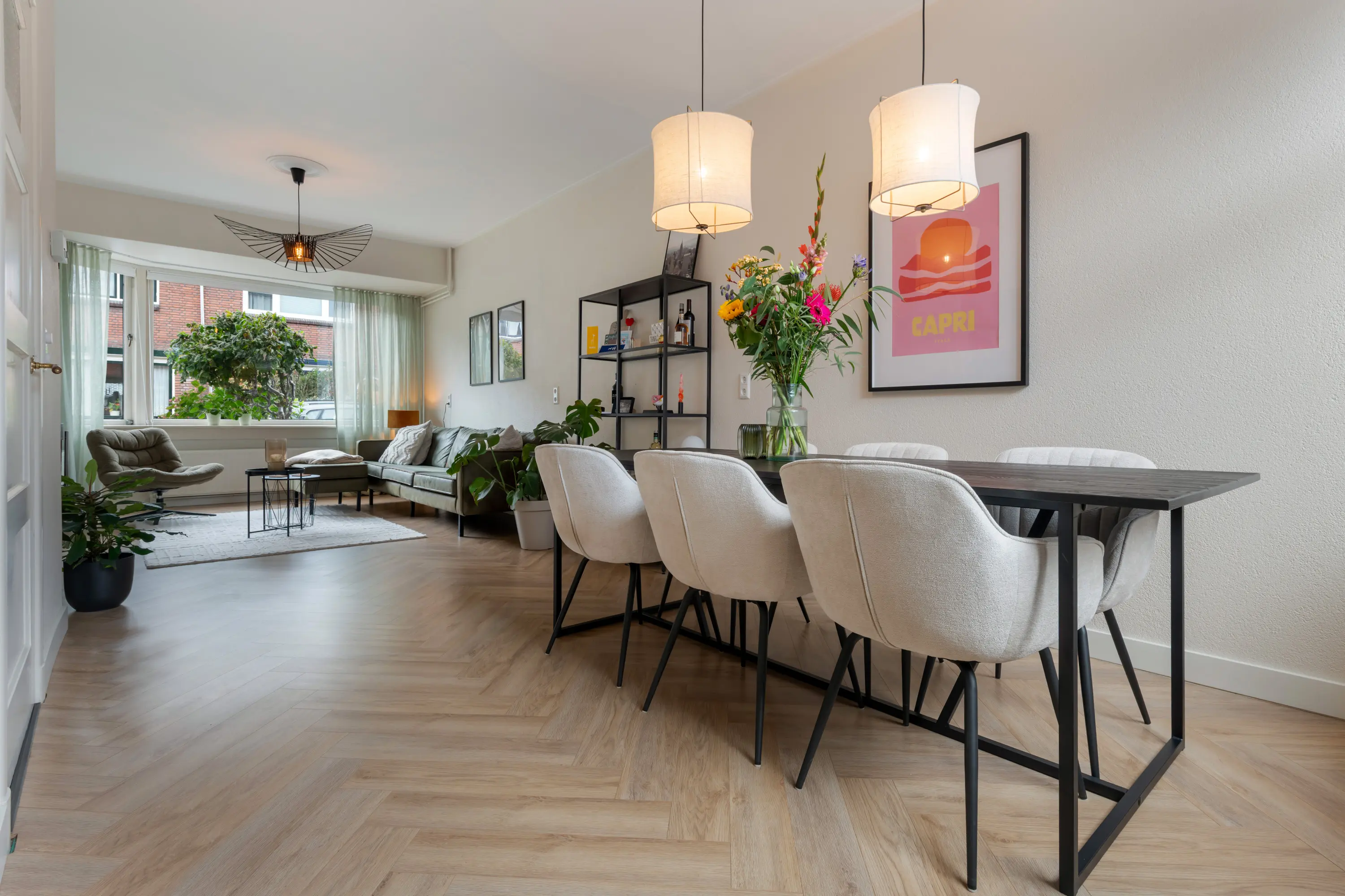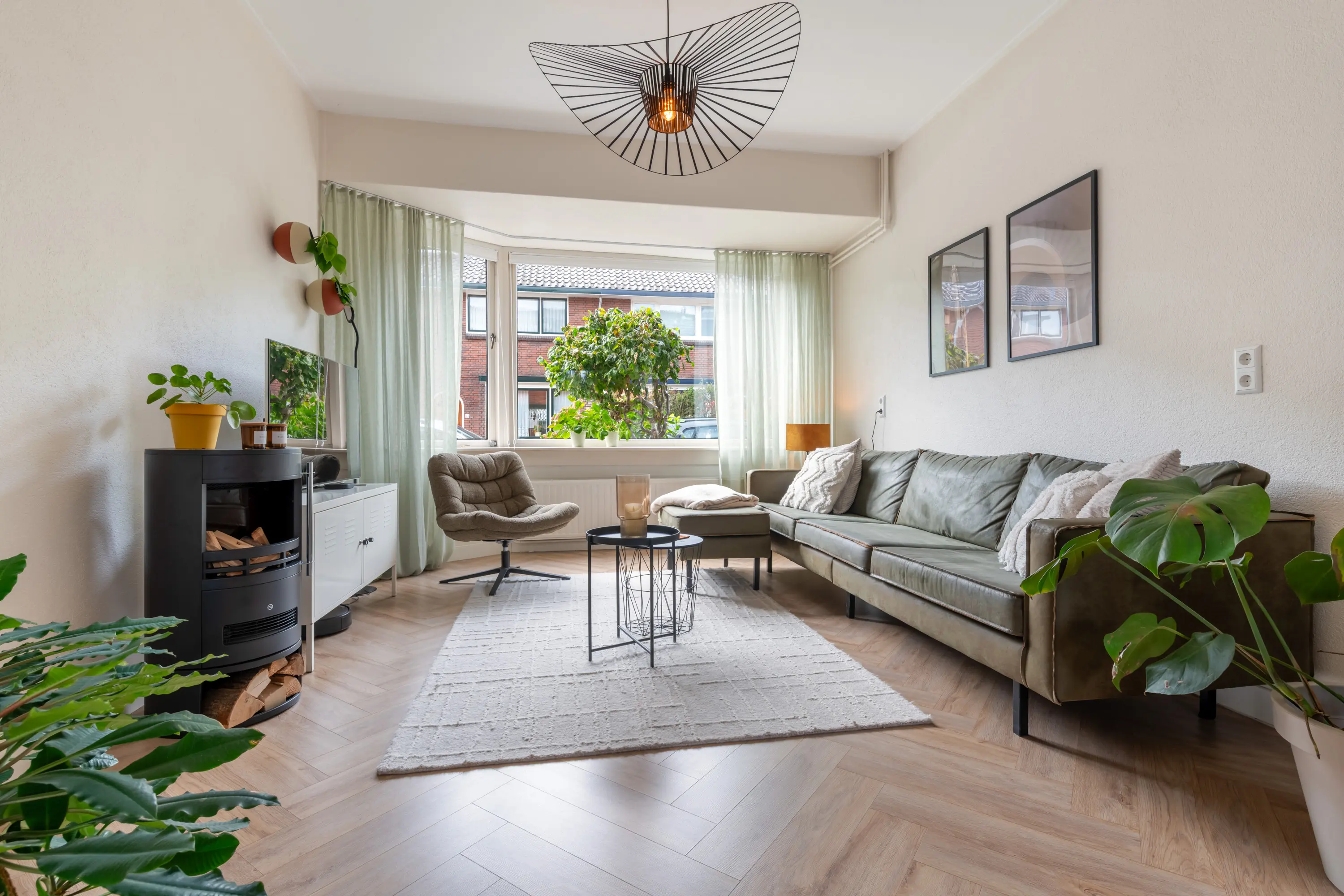 De sfeervolle woonkamer heeft een visgraatlaminaatvloer en aan de voorzijde een erker en wordt gekenmerkt door veel lichtinval dankzij de grote raampartijen aan beide zijden.