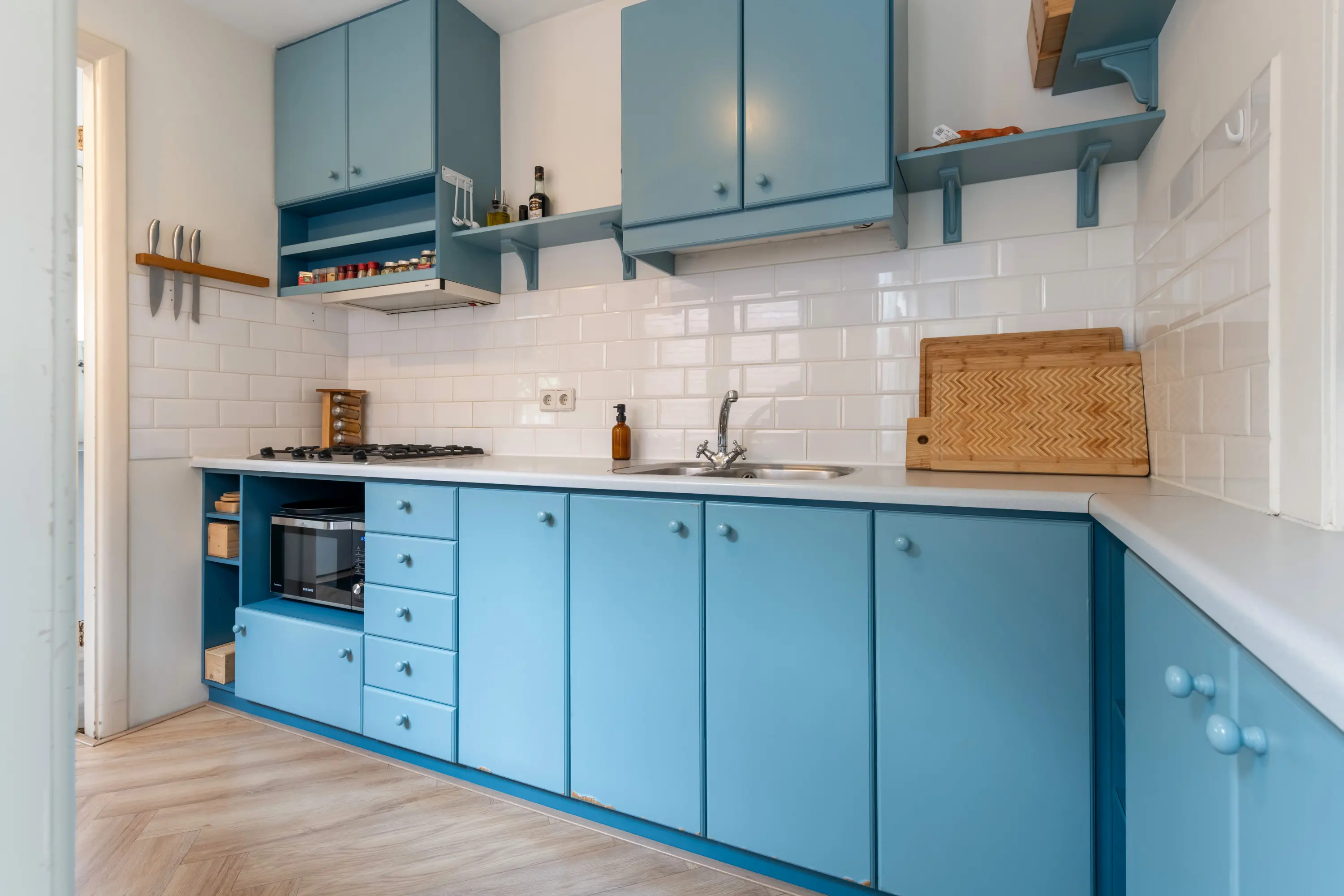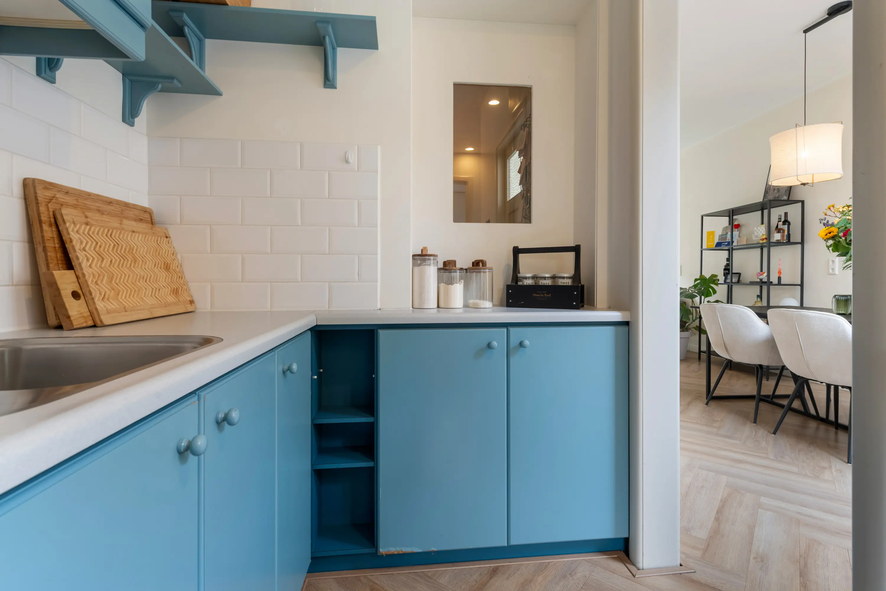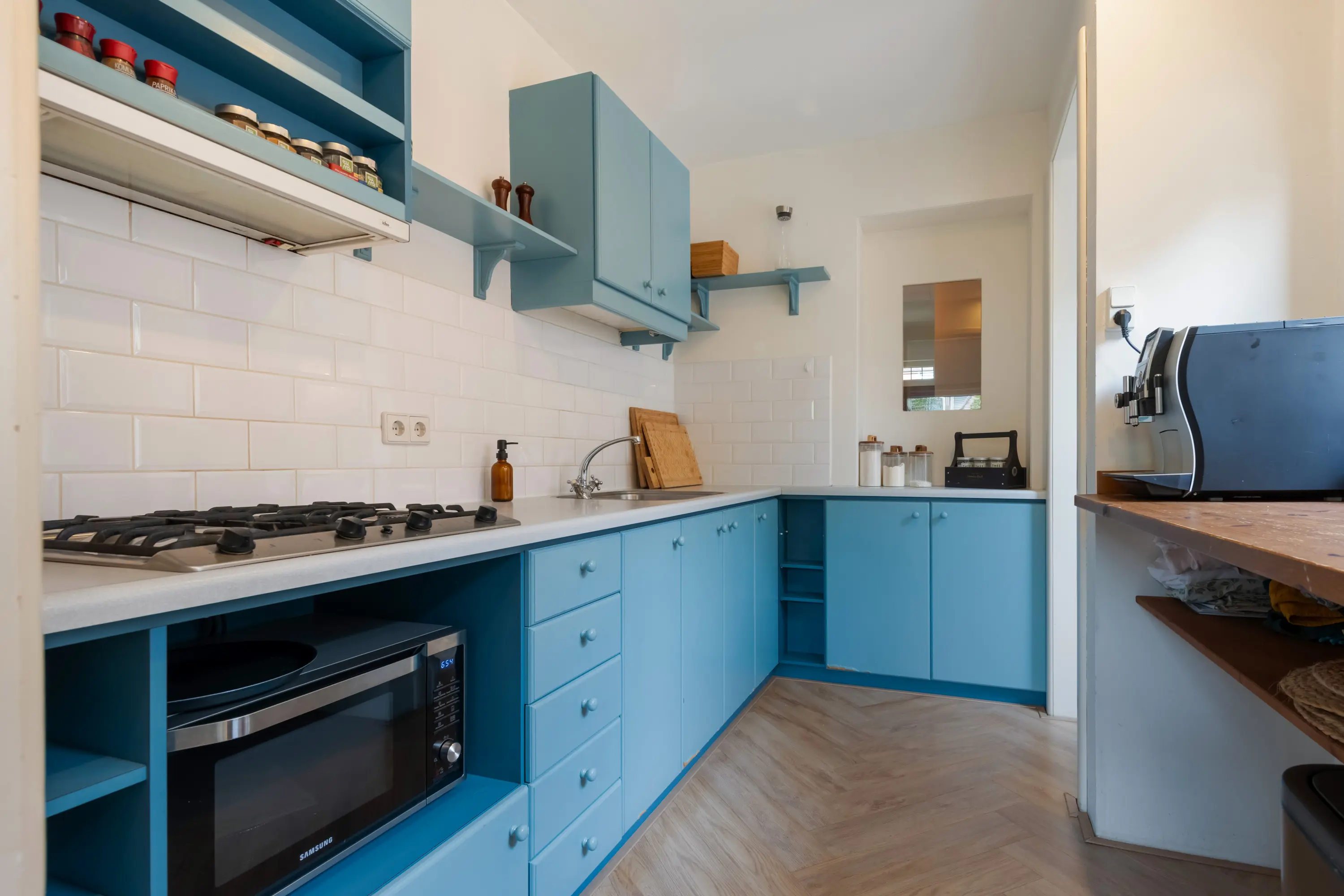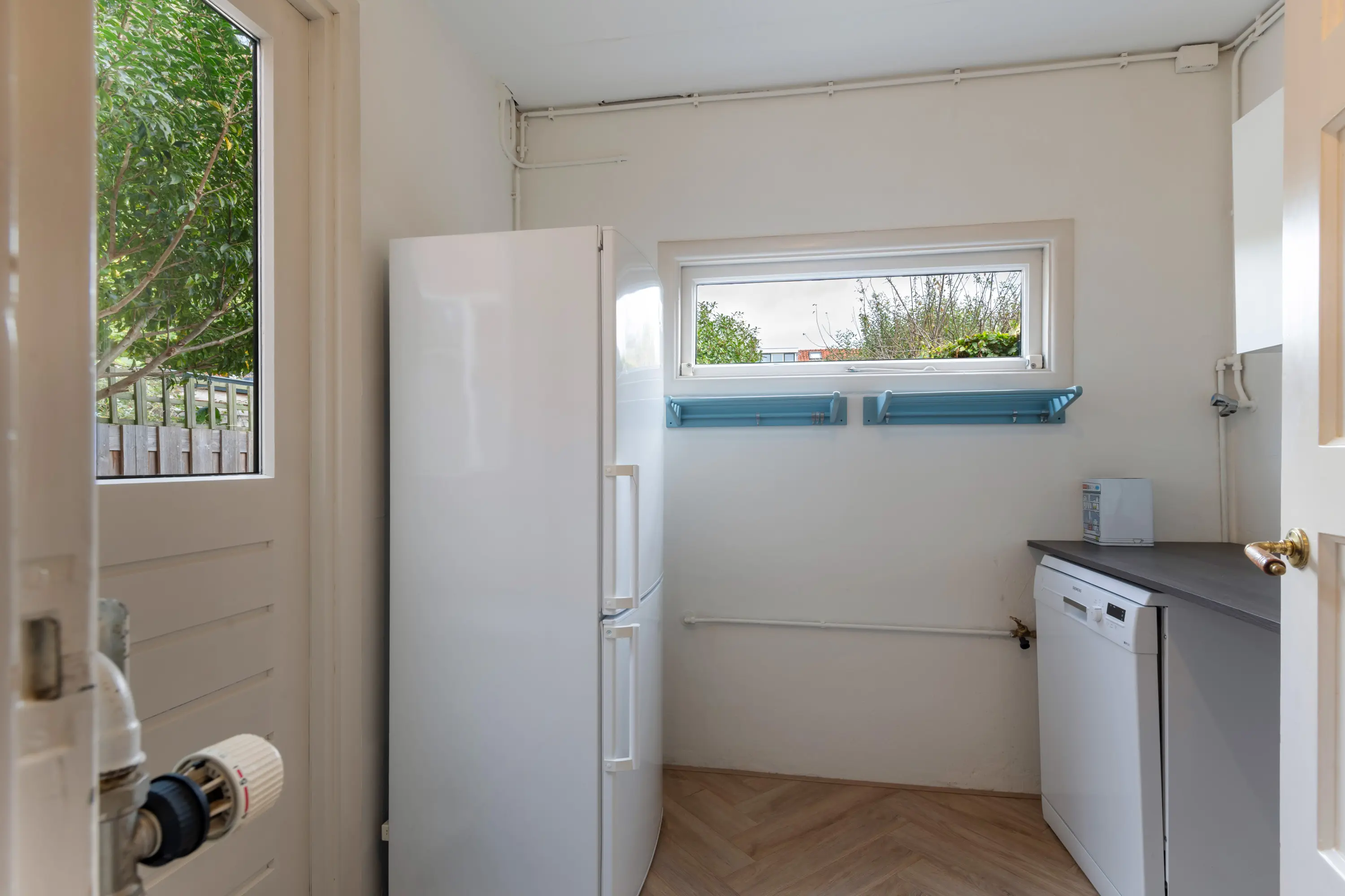 De keuken is voorzien van een gaskookplaat en afzuigkap. Aansluitend bevindt zich de bijkeuken met een aansluiting voor een vaatwasser en extra bergruimte.