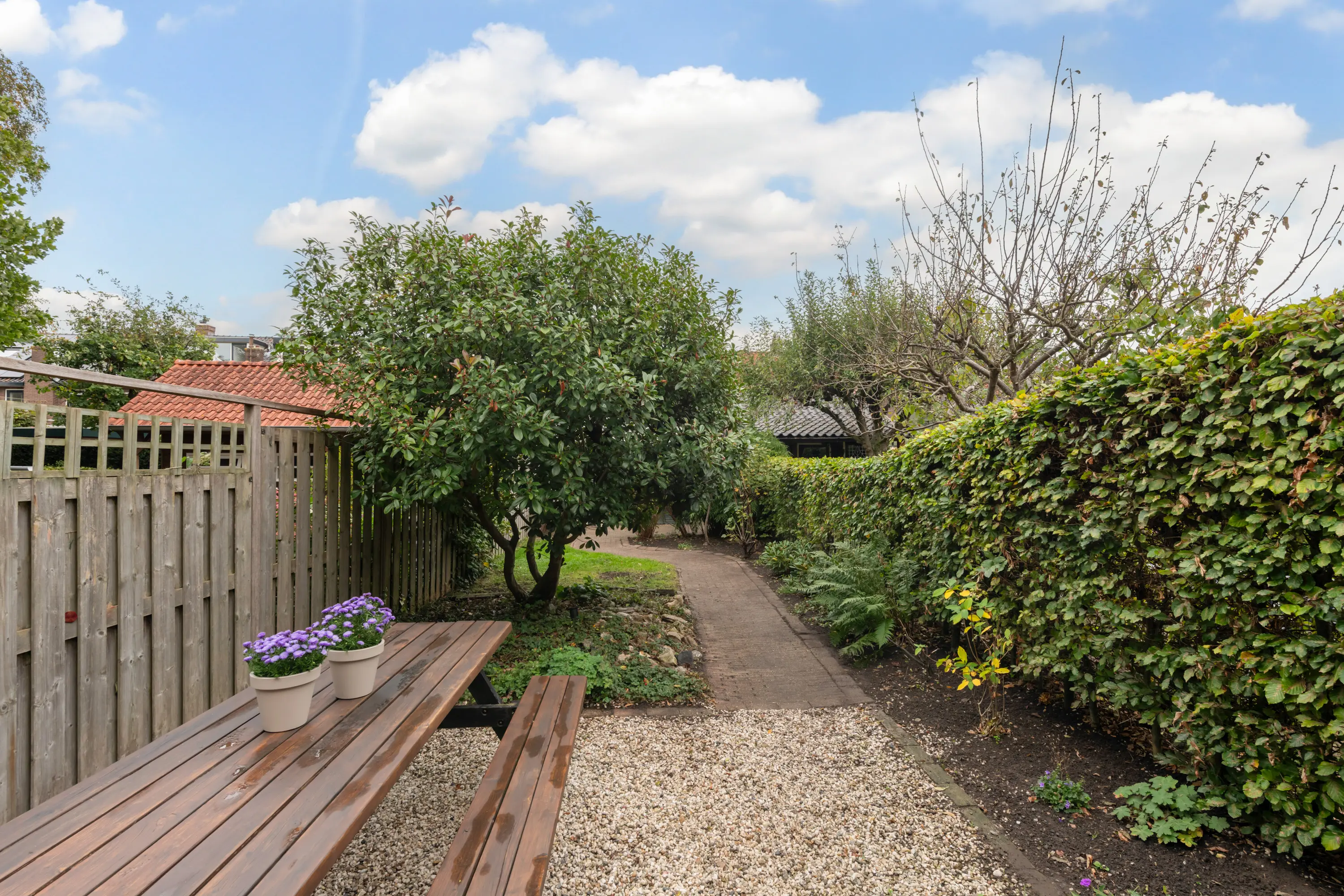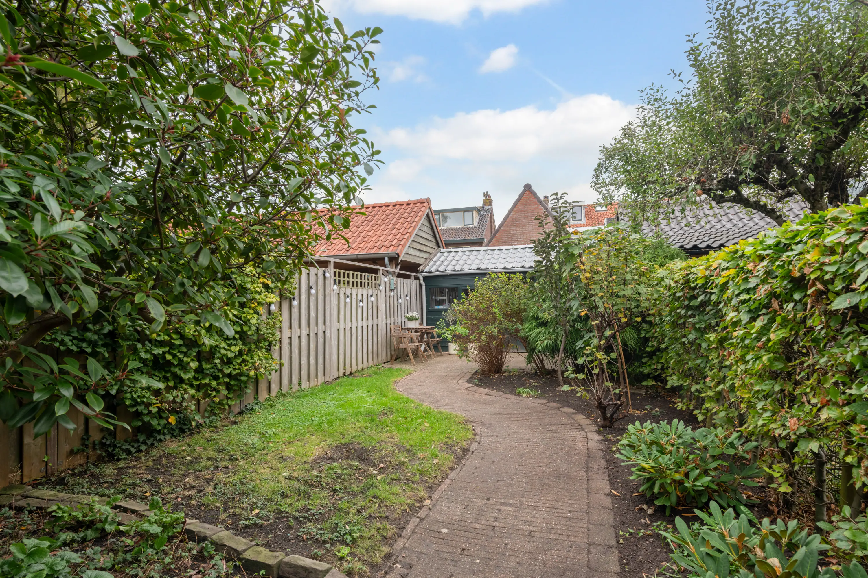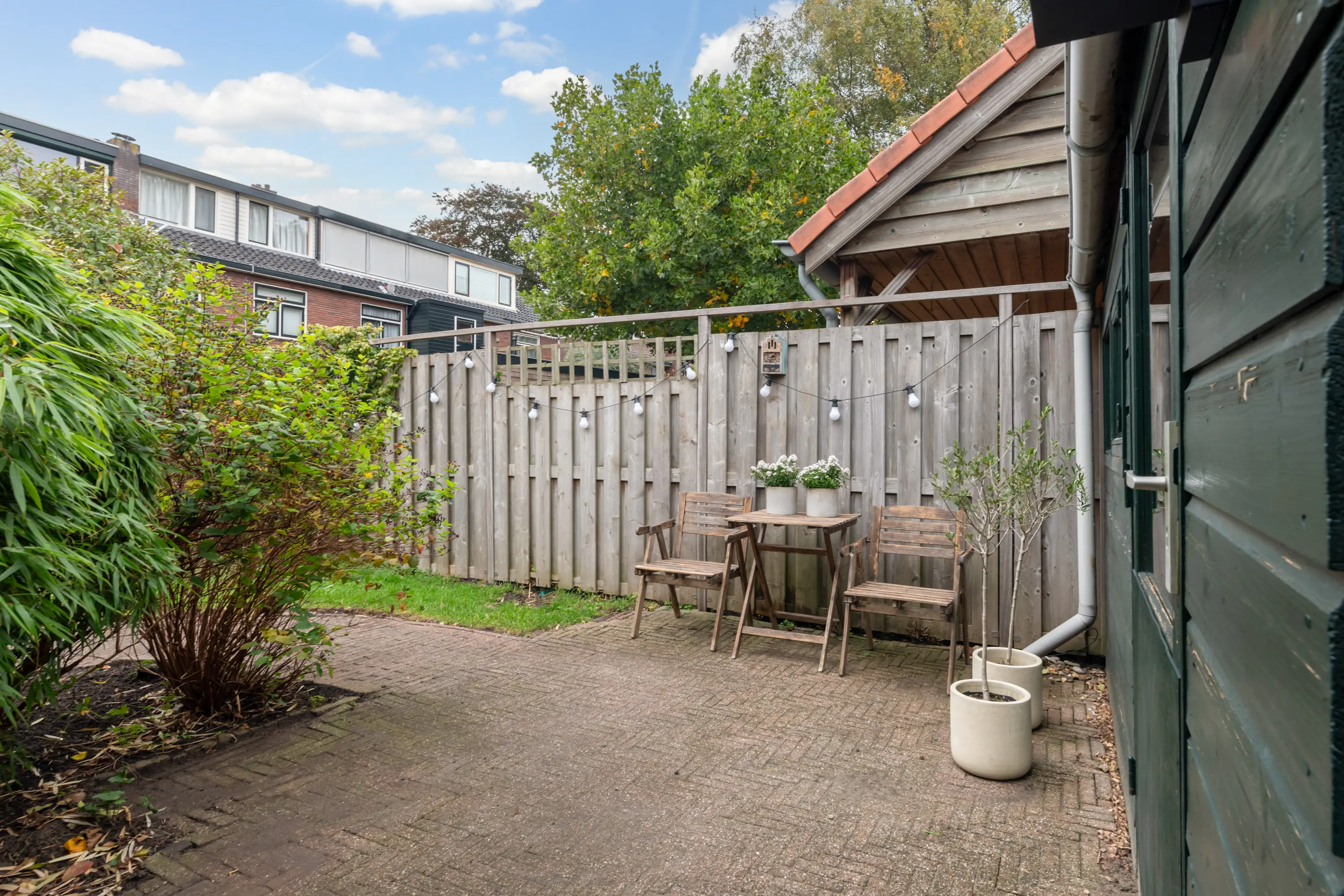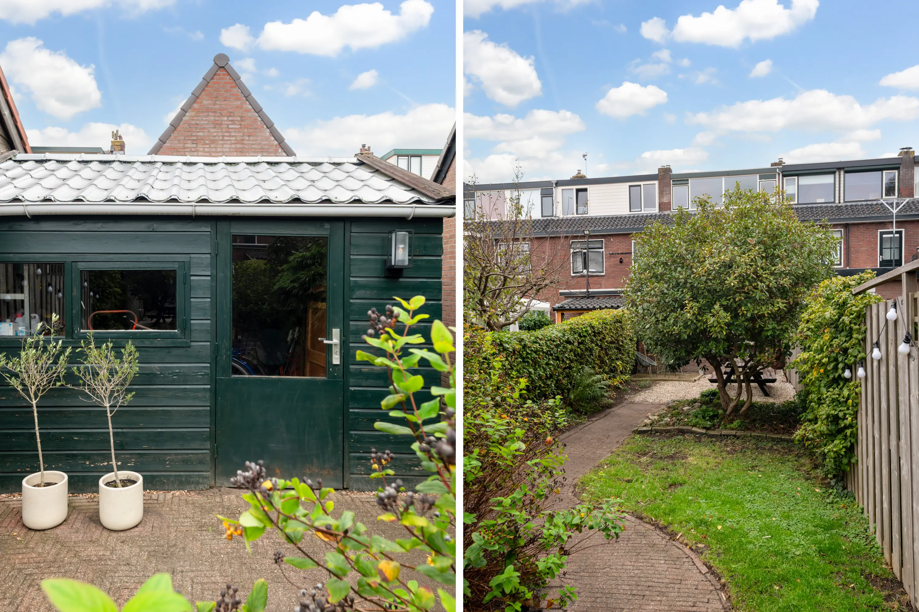 De woning beschikt over een verrassend ruime achtertuin op het (noord)oosten, voorzien van een houten berging en een praktische achterom.