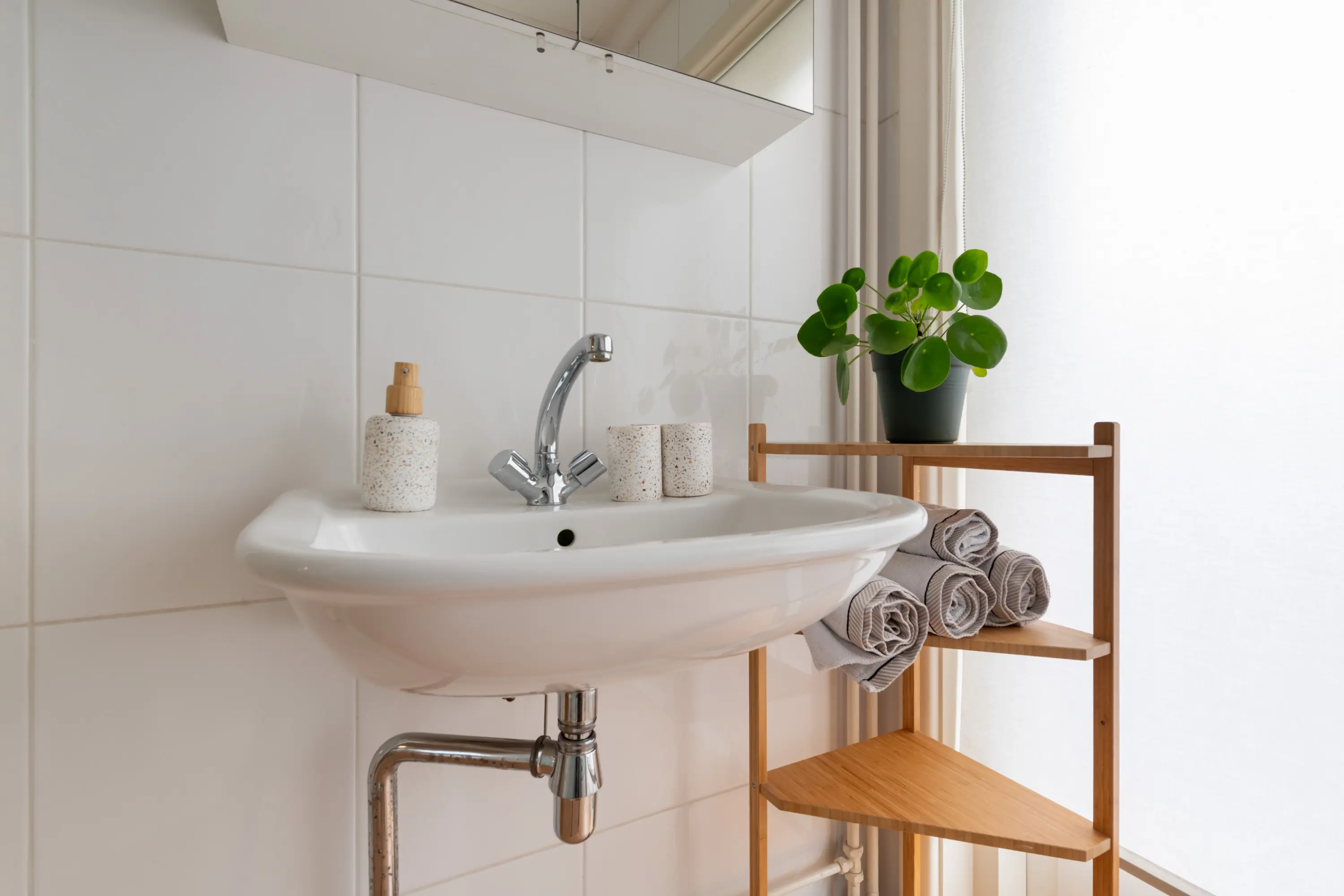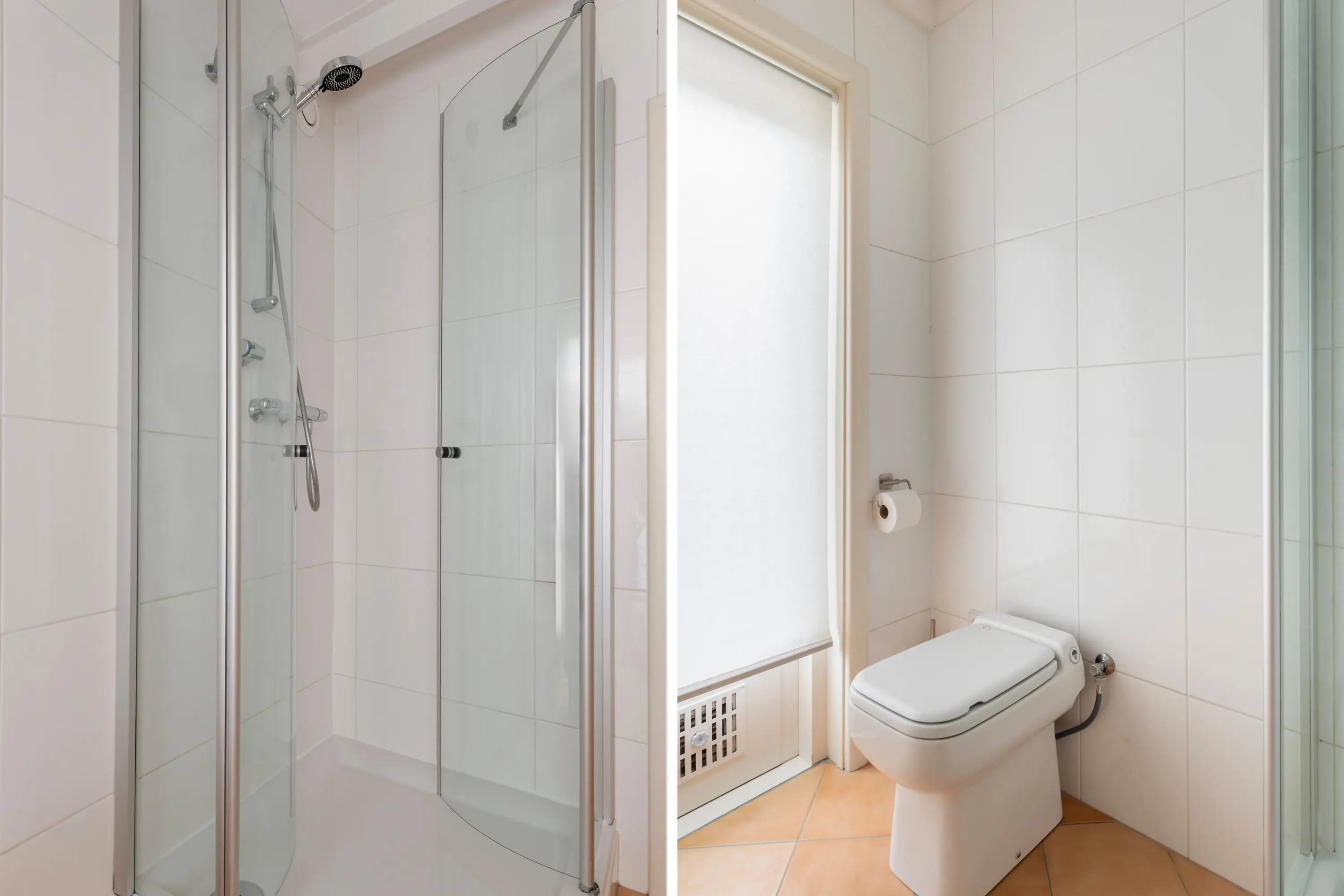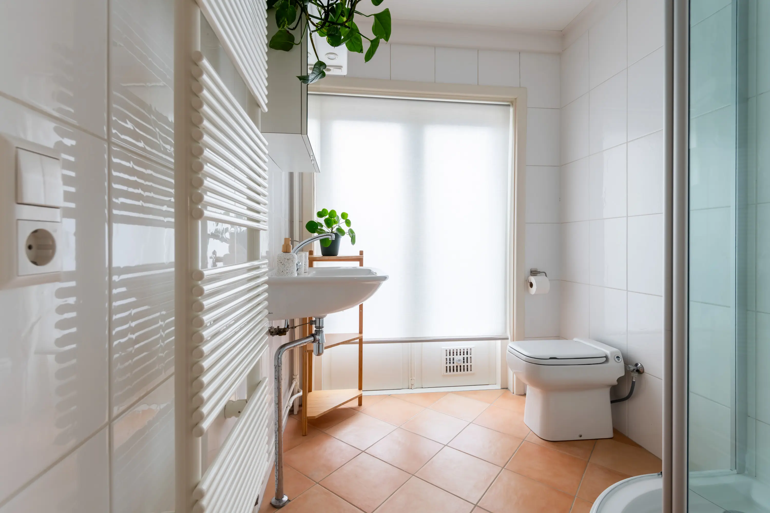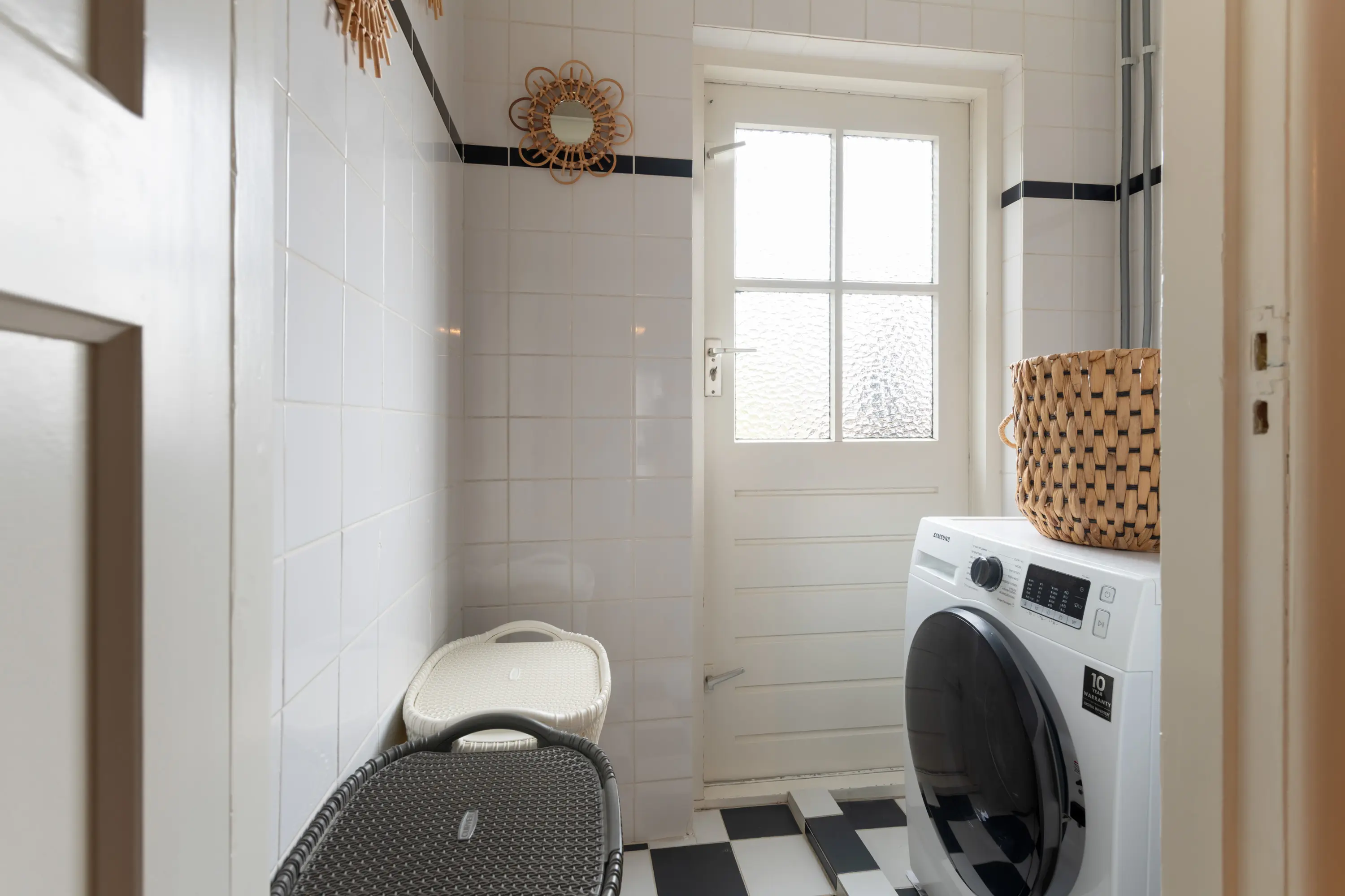 De overloop geeft toegang tot twee ruime slaapkamers, waarvan één met vaste kasten. Daarnaast is er een praktische wasruimte met toegang tot het platte dak. De badkamer is volledig betegeld en voorzien van een douchecabine, wastafel, designradiator en sanibroyeur.