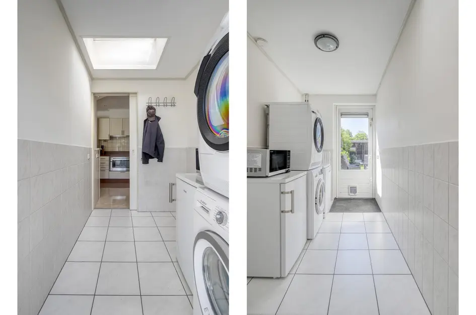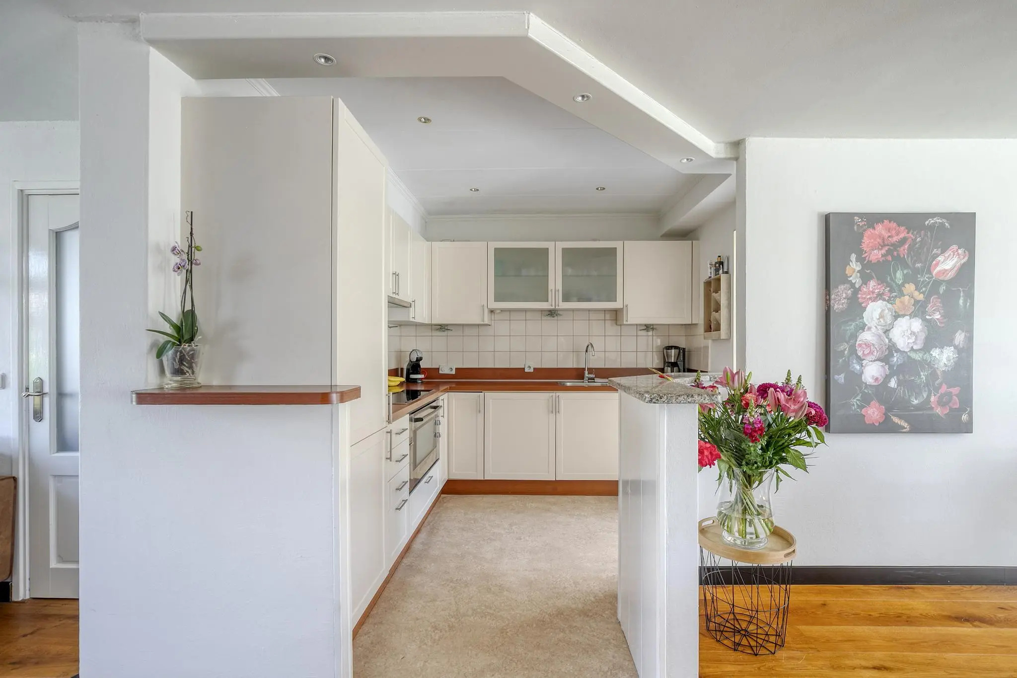 Via de nette entree kom je in de hal met modern toilet, meterkast en praktische trapkast. De ruime, uitgebouwde woonkamer is voorzien van een sfeervolle houtkachel, een houten vloer en veel natuurlijke lichtinval. De halfopen keuken in L-opstelling is uitgerust met diverse inbouwapparatuur en biedt via de bijkeuken toegang tot de achtertuin. De bijkeuken beschikt over aansluitingen voor wasmachine en droger en een handige loopdeur naar buiten.