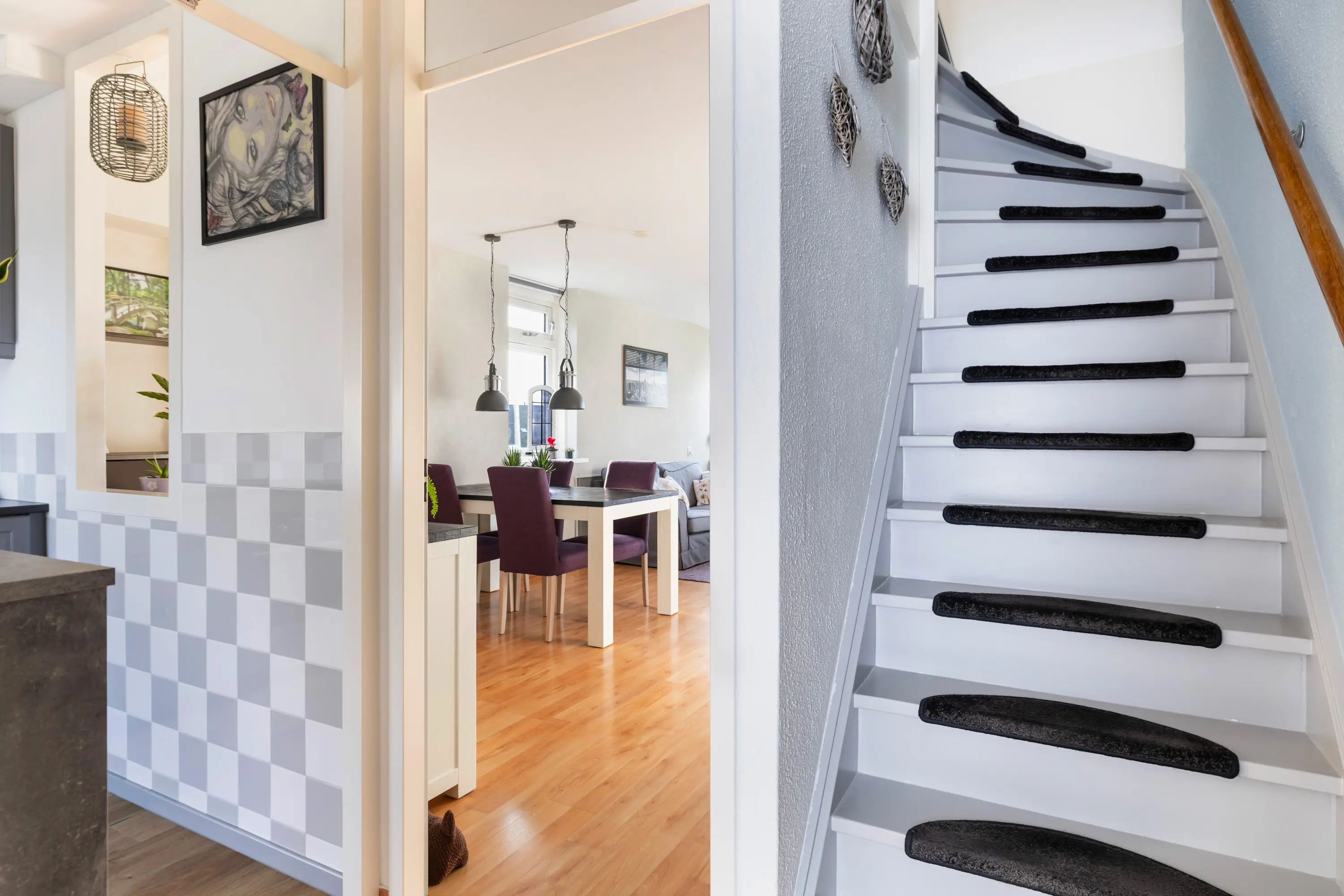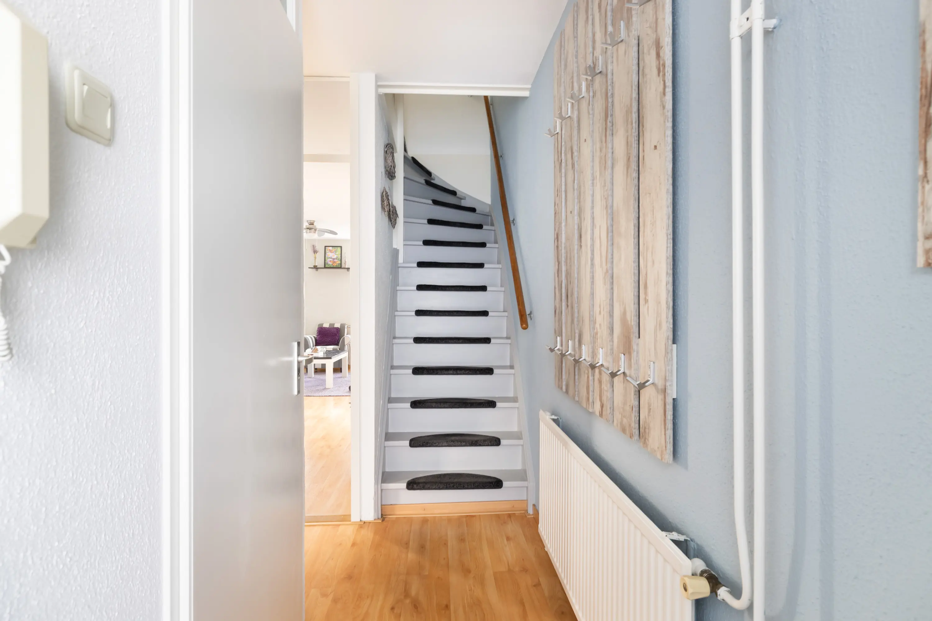 De royale woonkamer van circa 25 m² voelt prettig licht aan en beschikt over een handige trapkast. Vanuit de woonkamer heeft u toegang tot het zonnige balkon, gunstig gelegen op het zuidwesten — perfect om na het werk van de zon te genieten. De verdieping is afgewerkt met een lichte laminaatvloer. De keuken is afgewerkt met een PVC-vloer.