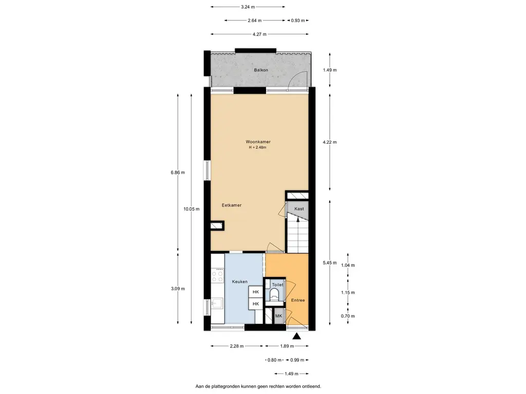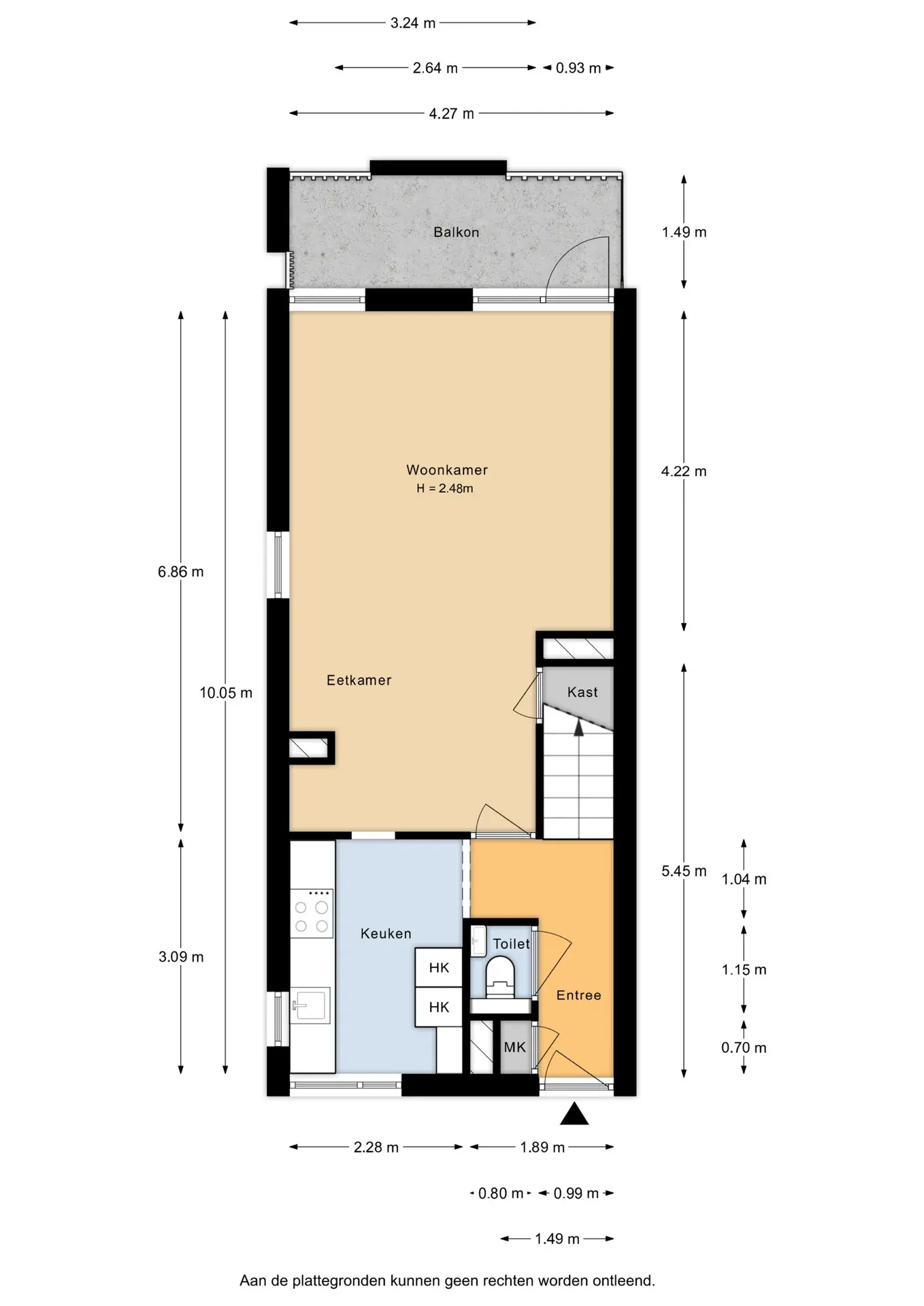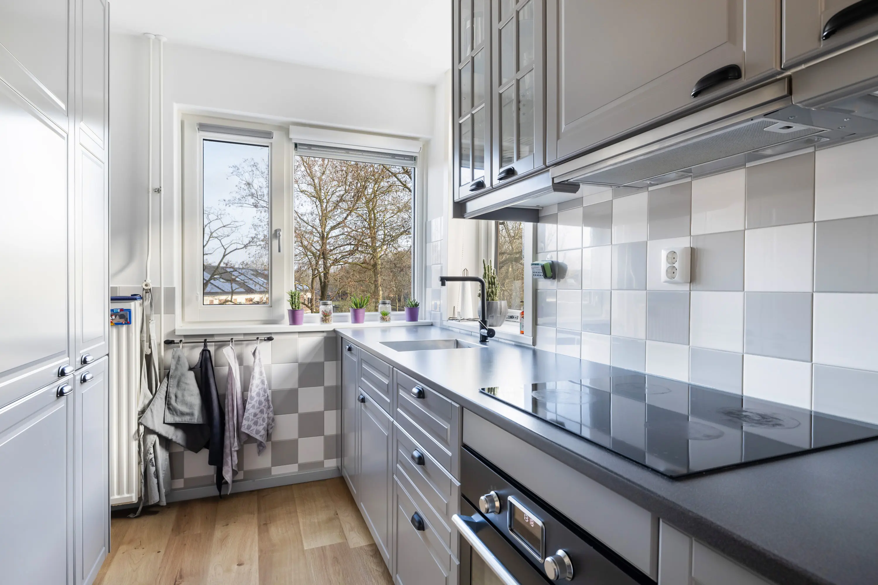 Via de galerij bereikt u de entree van het appartement. De hal biedt toegang tot het toilet en de meterkast. De half- open keuken is praktisch ingericht en voorzien van een 4-pits inductie kookplaat, combi-oven/magnetron, vaatwasser, afzuigkap en een koel- vriescombinatie.
