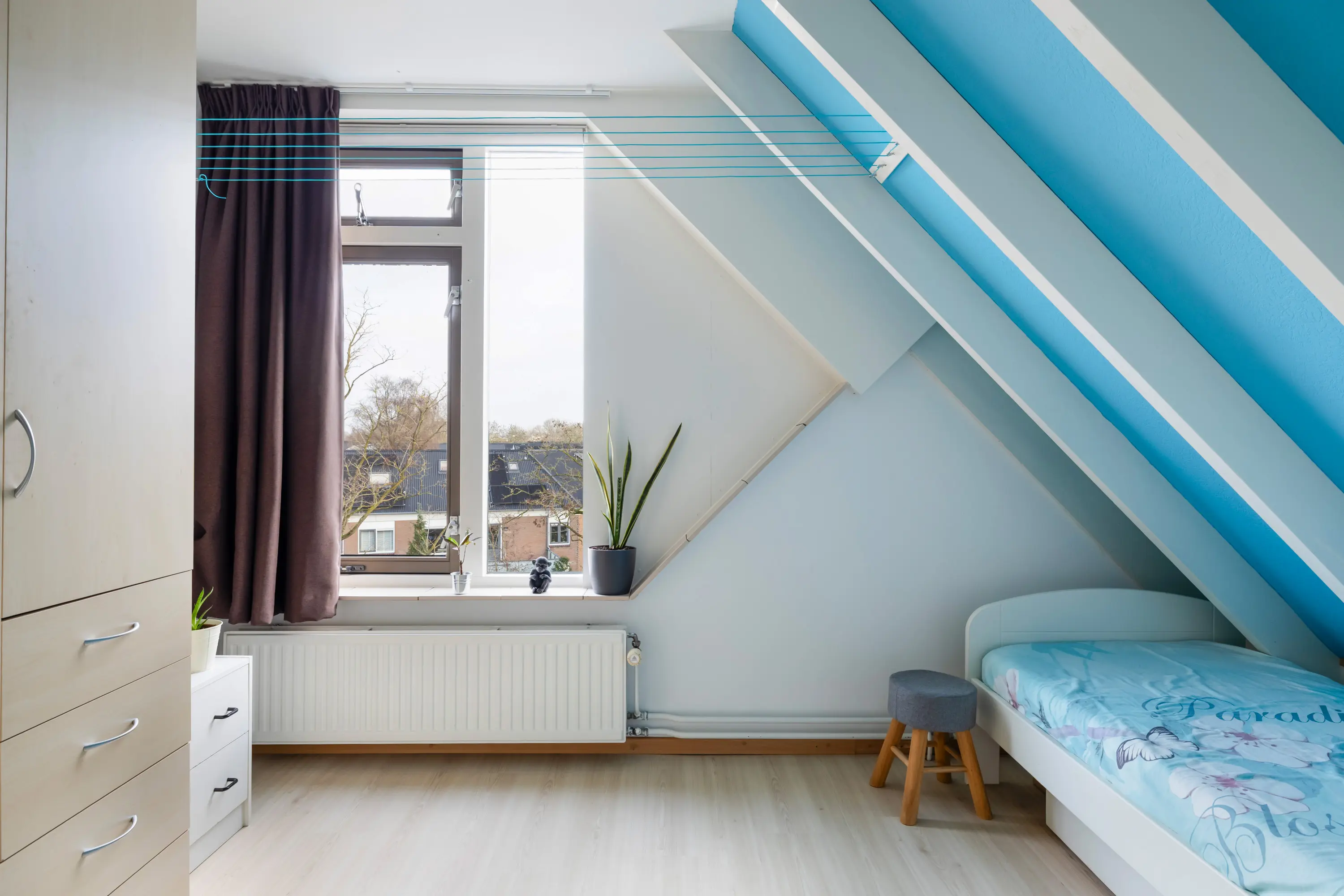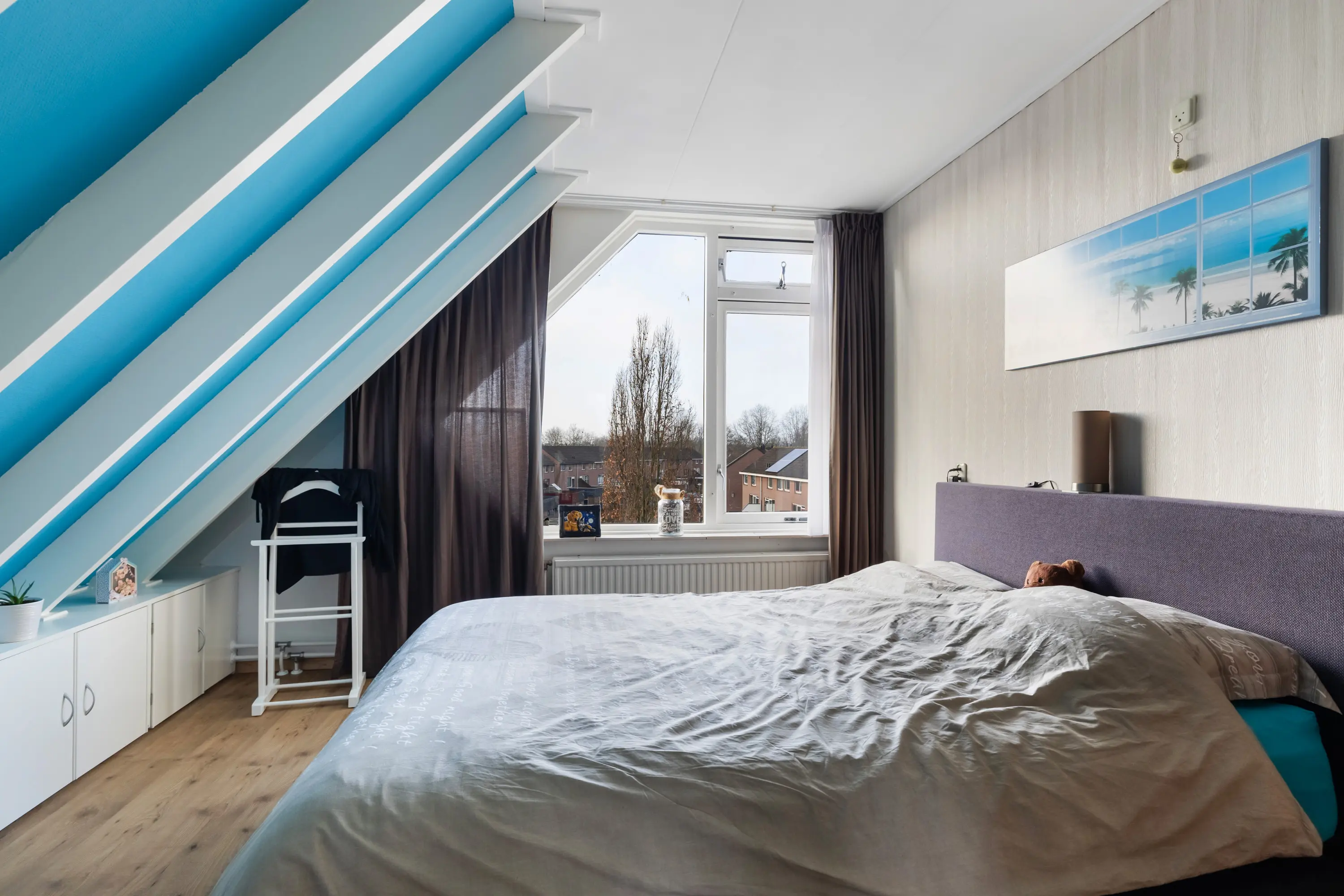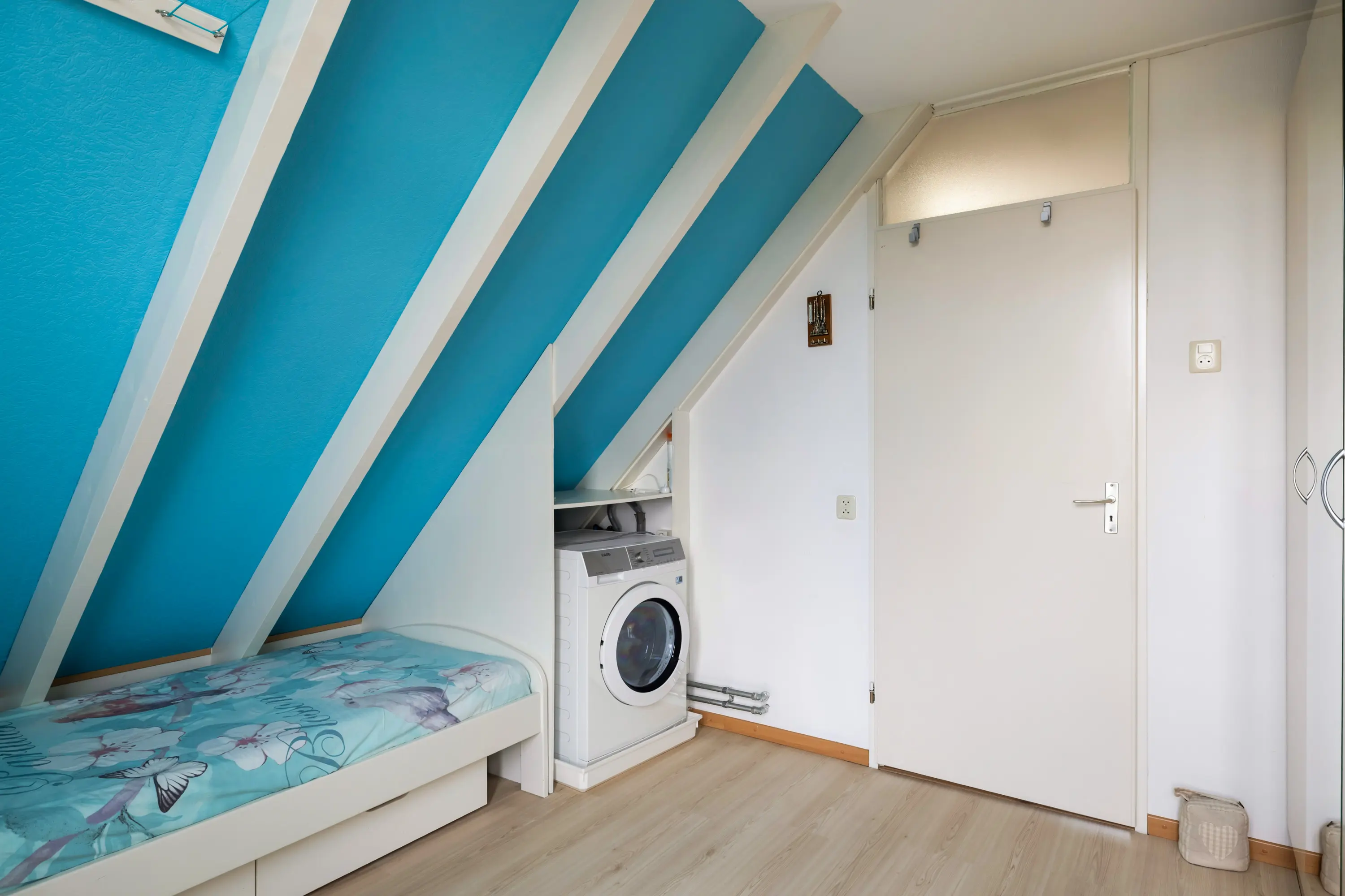 Aan de voorzijde bevindt zich een ruime slaapkamer met bergruimte onder de schuine kant. Aan de achterzijde ligt de tweede slaapkamer eveneens voorzien van een vaste kast en een aansluiting voor de wasmachine.