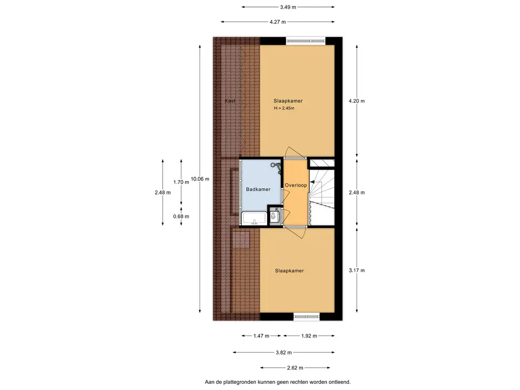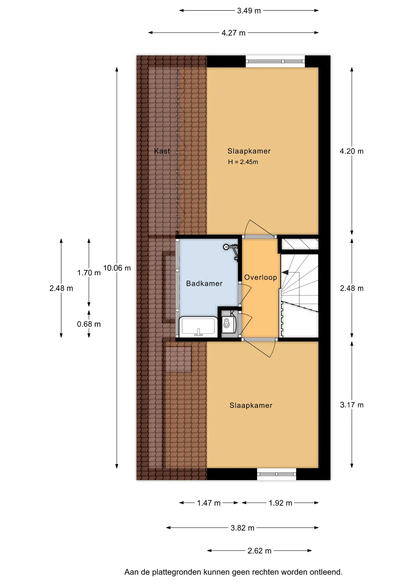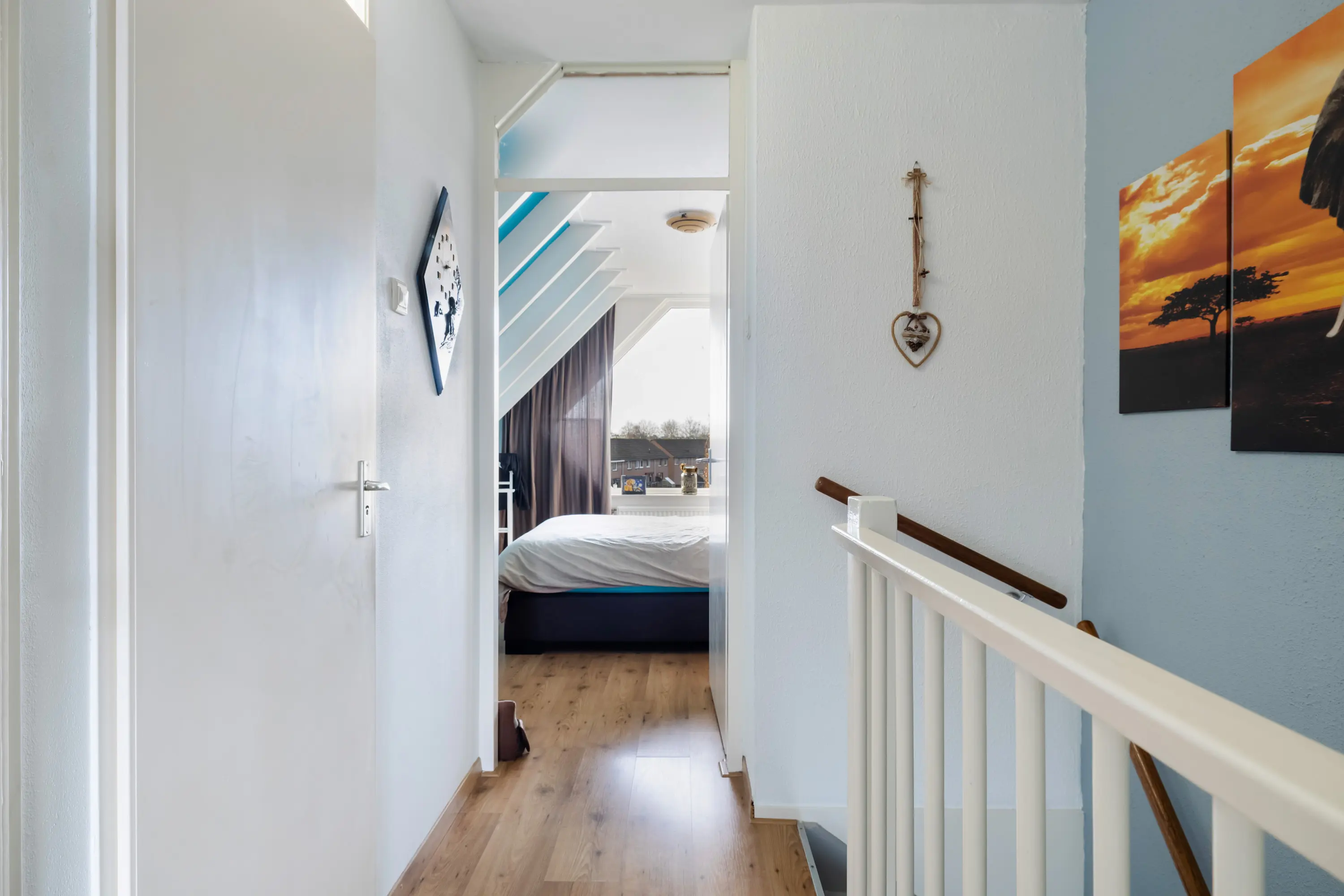 Aan de voorzijde bevindt zich een ruime slaapkamer met bergruimte onder de schuine kant. Aan de achterzijde ligt de tweede slaapkamer eveneens voorzien van een vaste kast en een aansluiting voor de wasmachine.