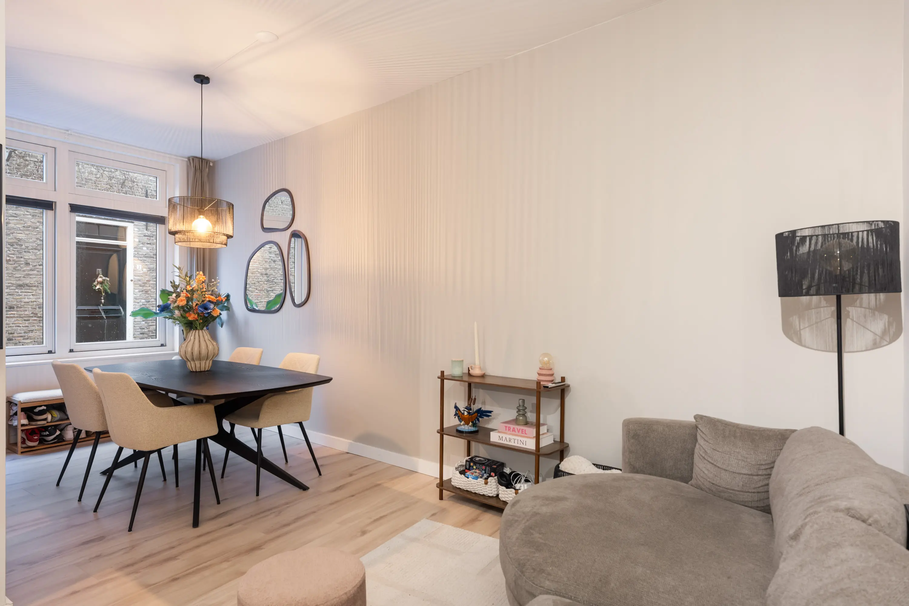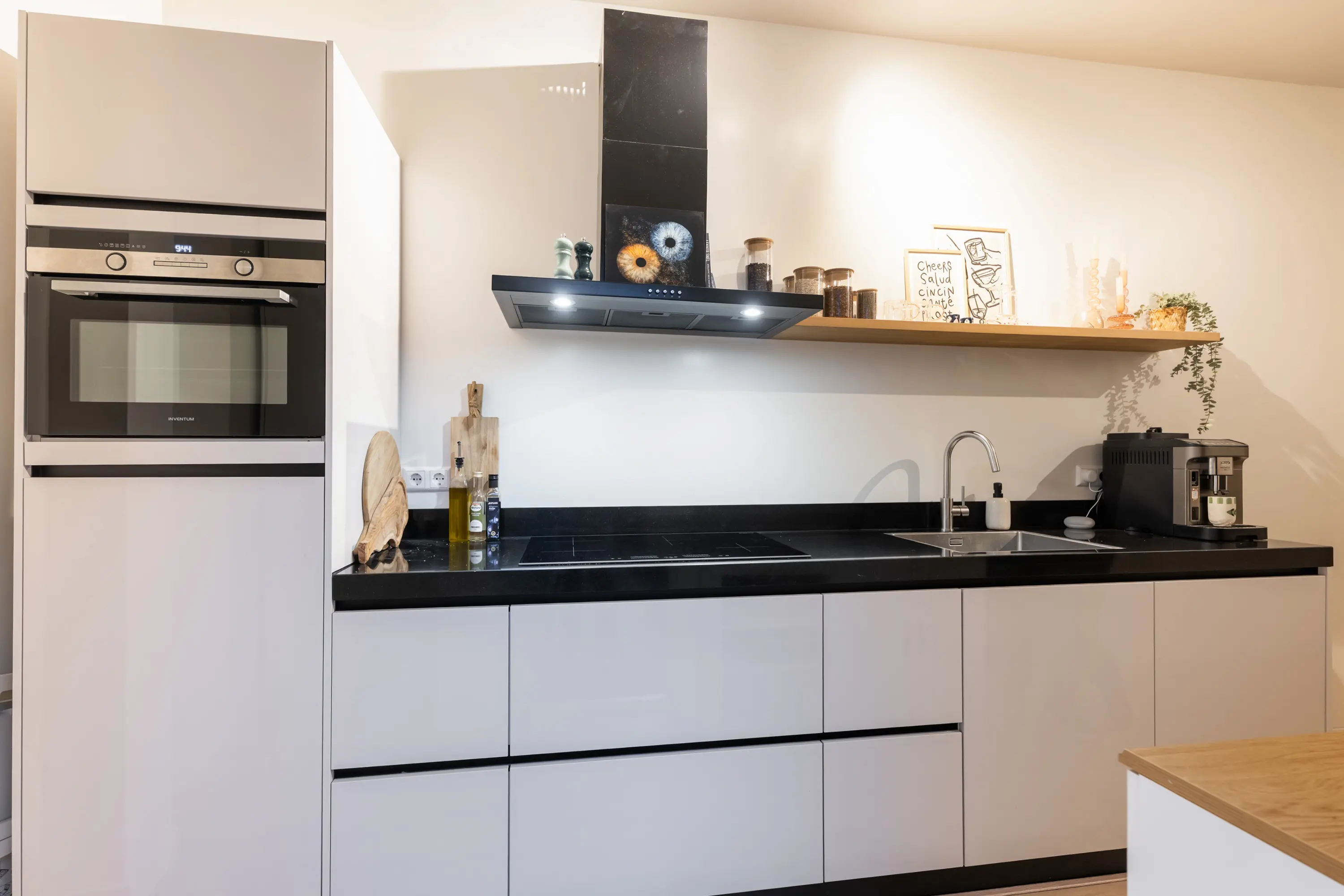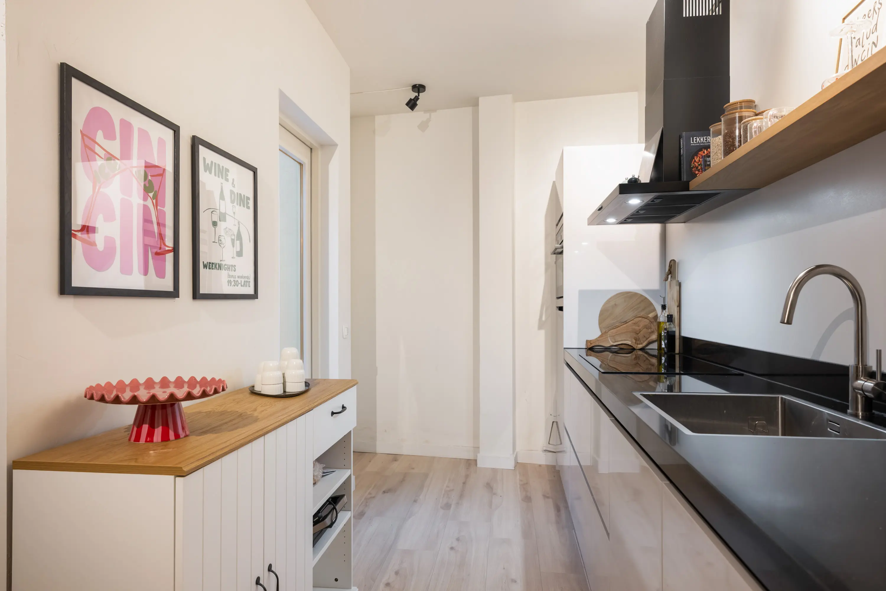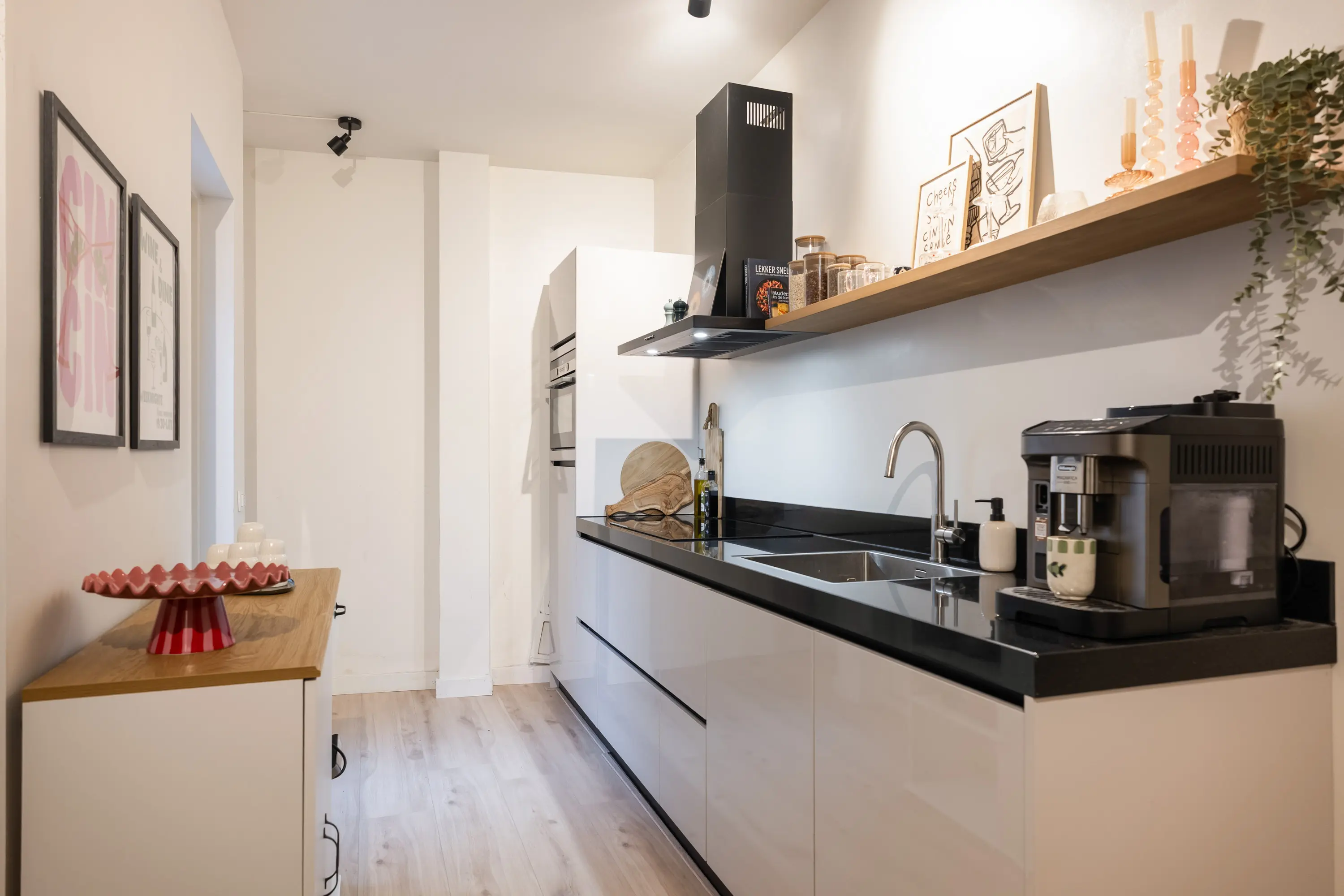 entree/hal met meterkast en toilet, karakteristieke sfeervolle woonkamer met laminaat vloer, moderne keukeninrichting inbouwapparatuur, (o.a. 4-pits inductiekookplaat, combi-oven/magnetron, vaatwasser, koelkast en afzuigkap) en extra (vaste) bergkast, slaapkamer met laminaatvloer, badkamer voorzien van een inloopdouche, wastafel met meubel, toilet, designradiator en een opstelplaats voor wasmachine en droger.