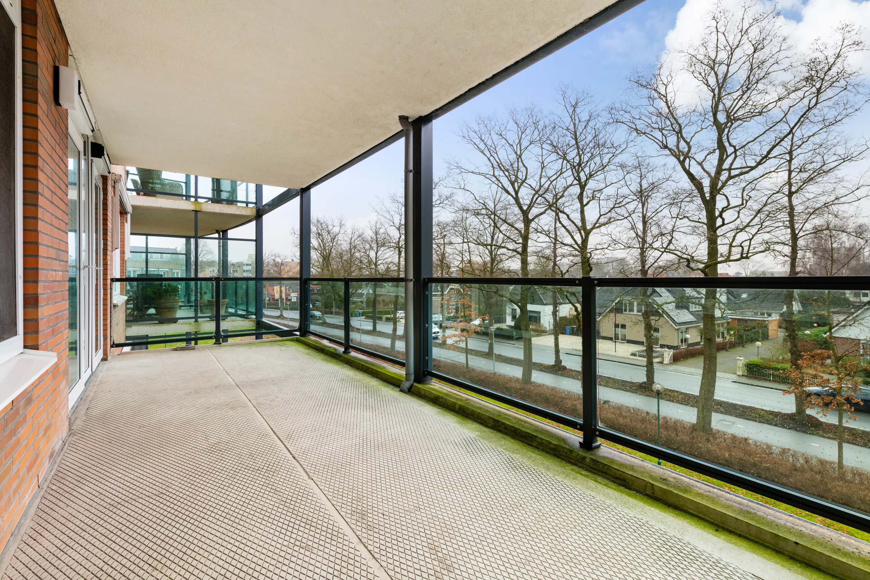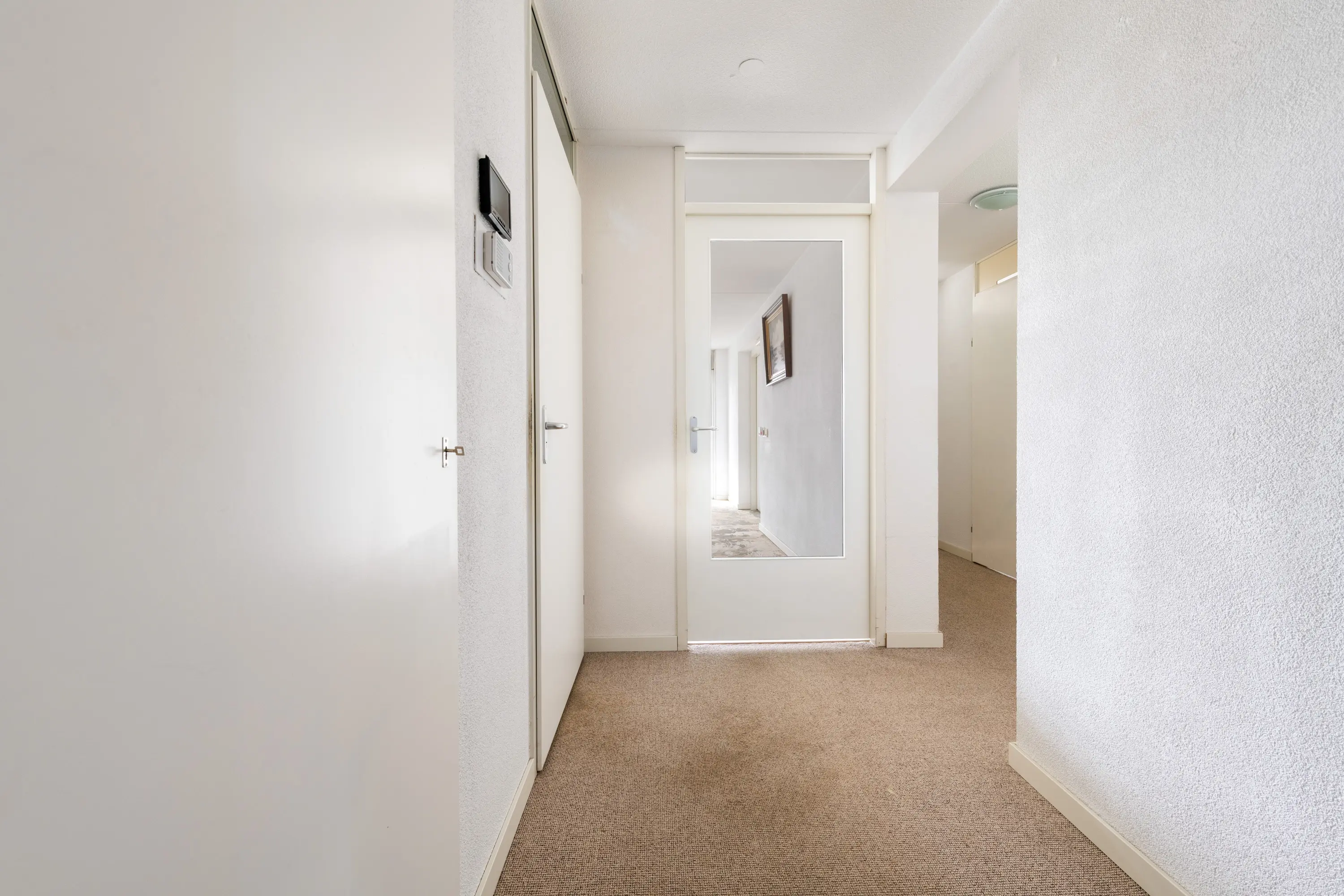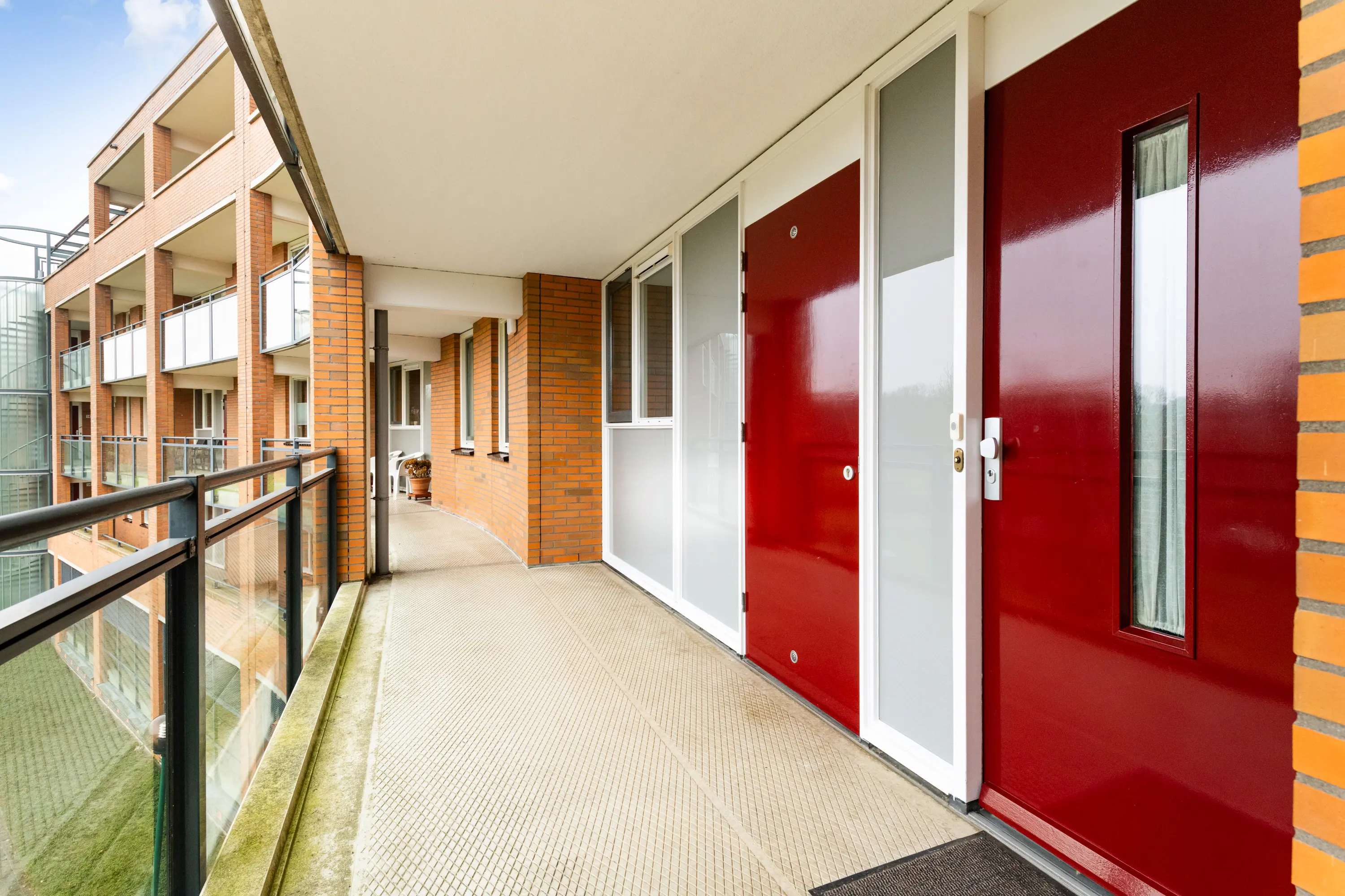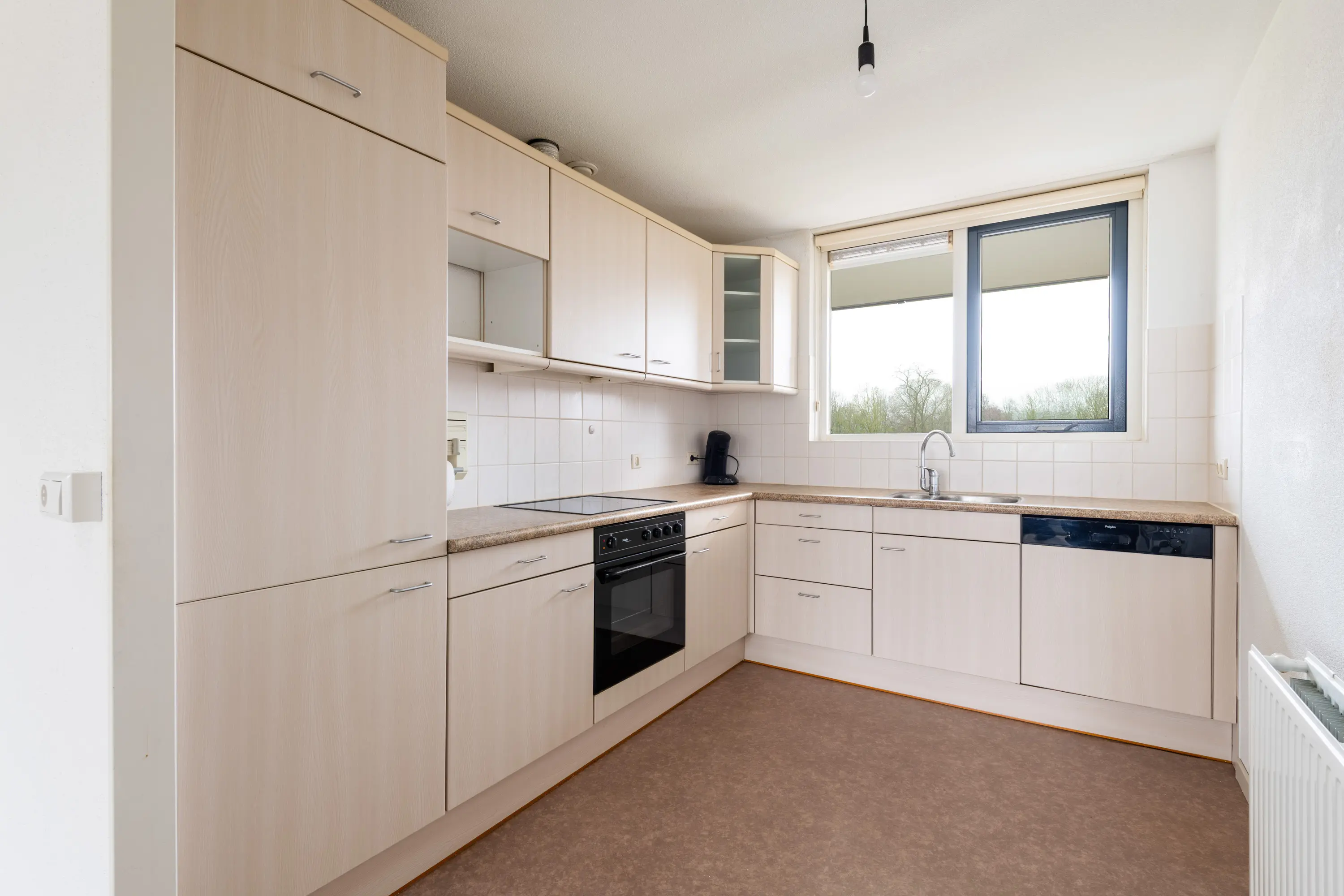 entree/hal met kast met opstelplaats van de cv ketel (2023), toilet met hangend closet en fonteintje. Royale lichte woonkamer met deur naar ruim zonnig gelegen balkon met vrij uitzicht. Open keuken met L-vormige keuken voorzien van diverse inbouwapparatuur (o.a. vaatwasser, koelkast, kookplaat, afzuigkap en oven). Twee slaapkamers waarvan 1 met toegang tot het terras. Volledig betegelde badkamer voorzien van douchecabine, ligbad, 2e toilet en twee wastafels. Berging met wasmachine- en drogeraansluiting.