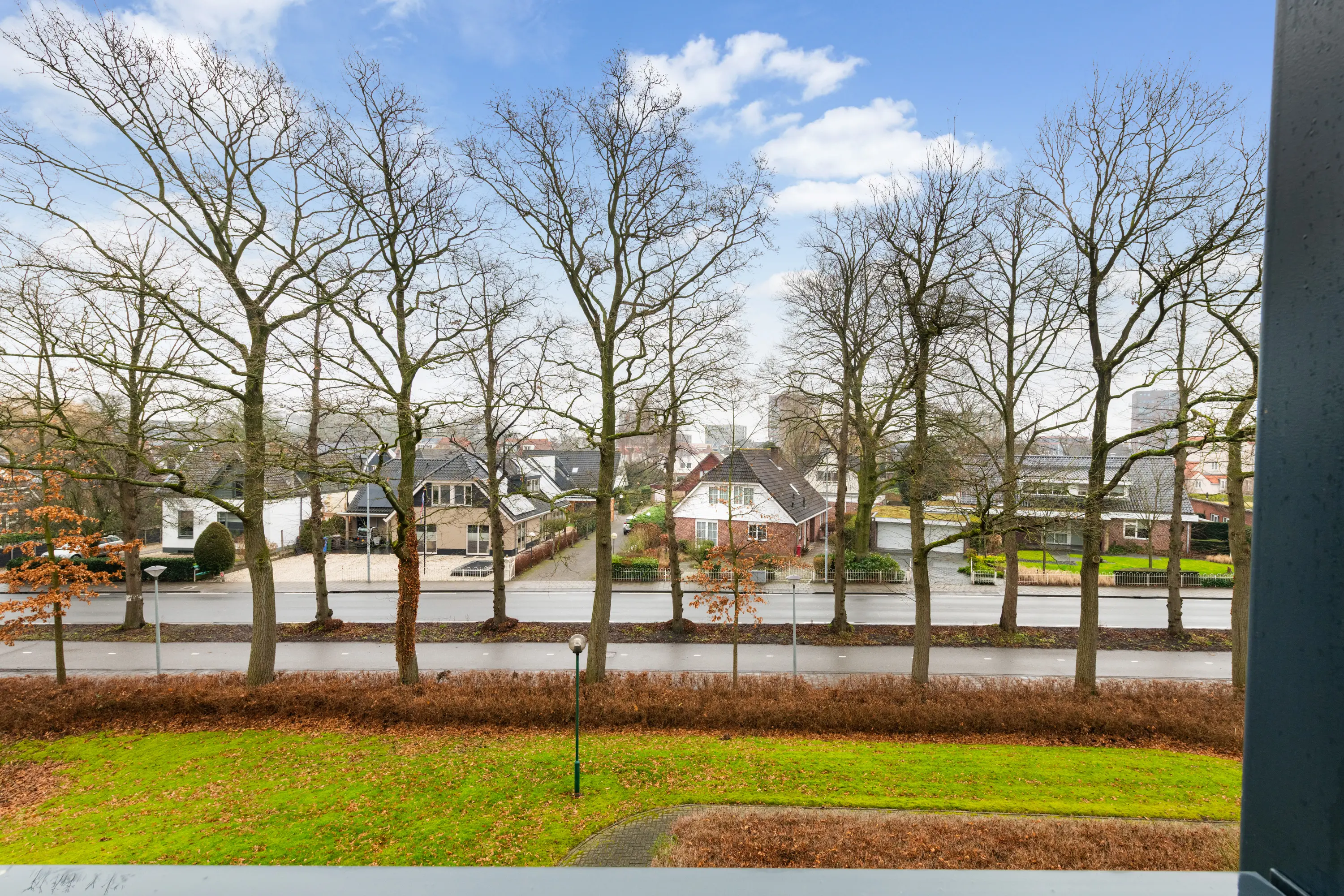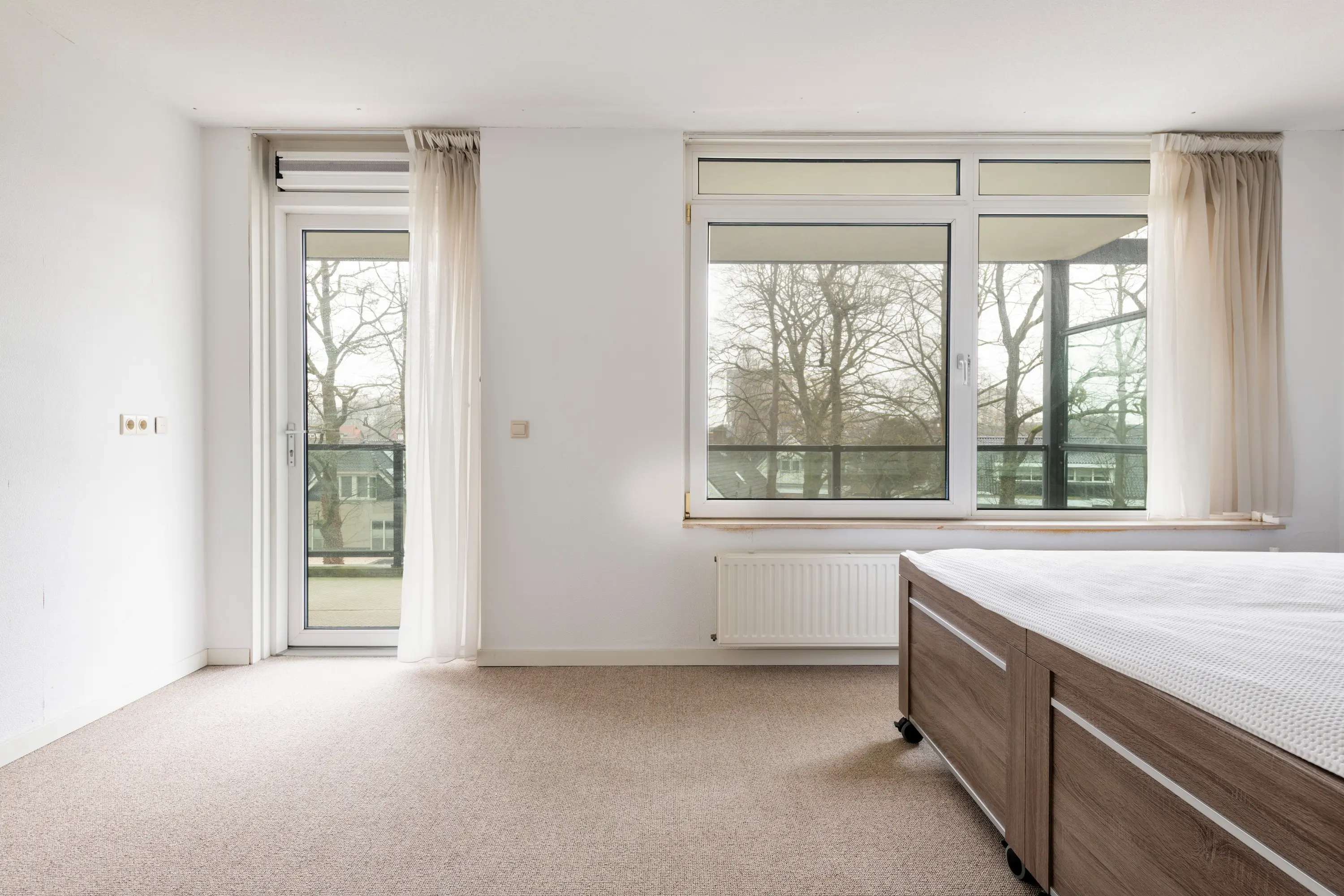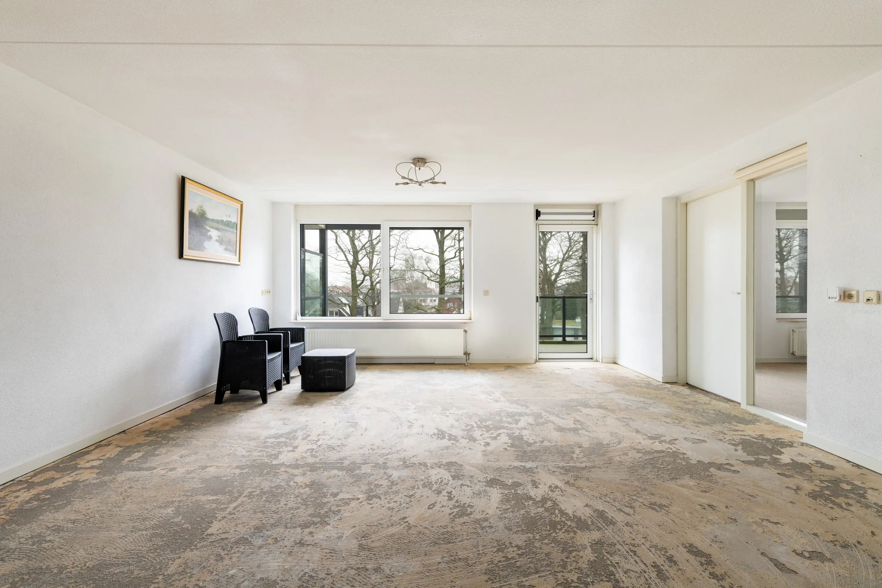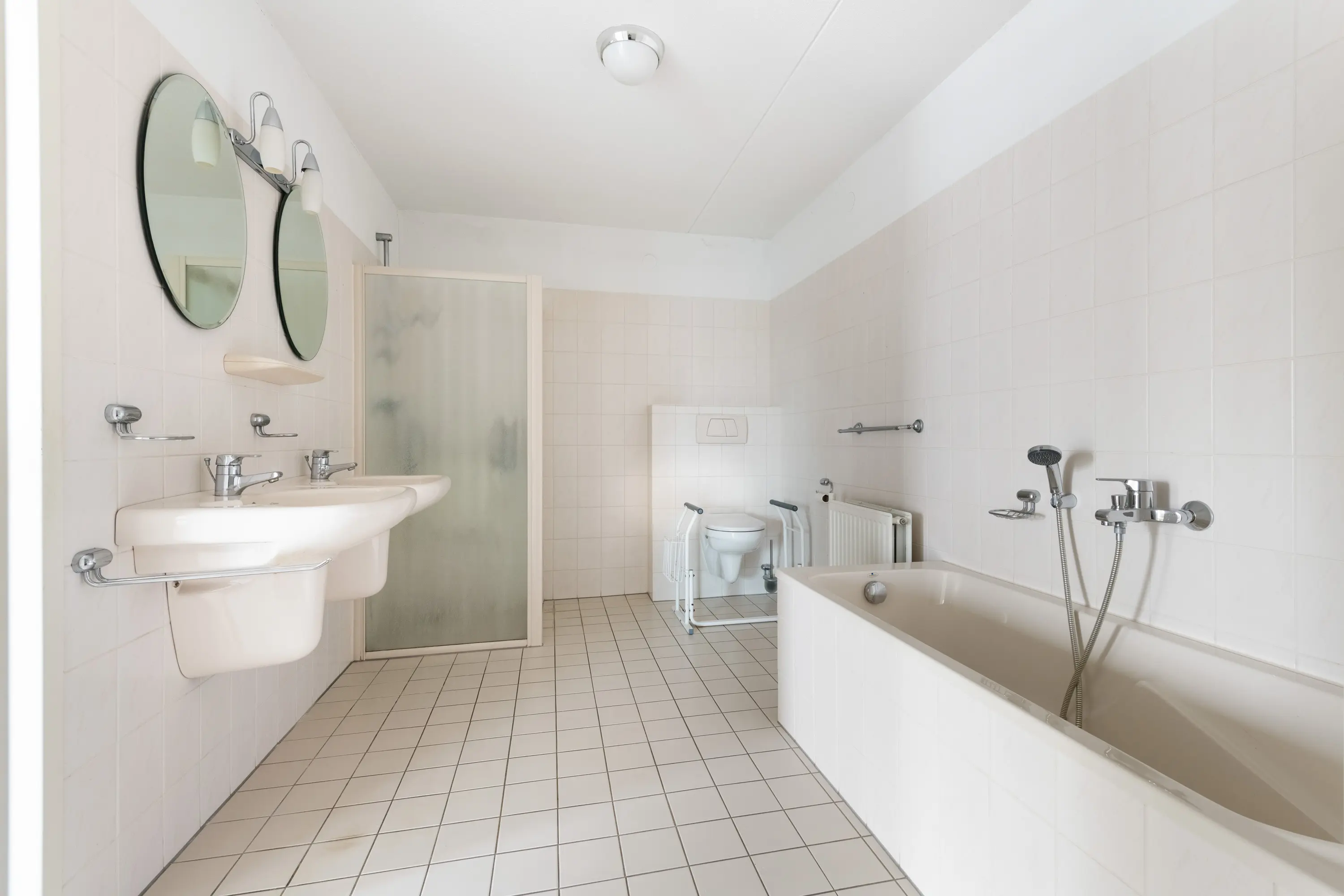 entree/hal met kast met opstelplaats van de cv ketel (2023), toilet met hangend closet en fonteintje. Royale lichte woonkamer met deur naar ruim zonnig gelegen balkon met vrij uitzicht. Open keuken met L-vormige keuken voorzien van diverse inbouwapparatuur (o.a. vaatwasser, koelkast, kookplaat, afzuigkap en oven). Twee slaapkamers waarvan 1 met toegang tot het terras. Volledig betegelde badkamer voorzien van douchecabine, ligbad, 2e toilet en twee wastafels. Berging met wasmachine- en drogeraansluiting.