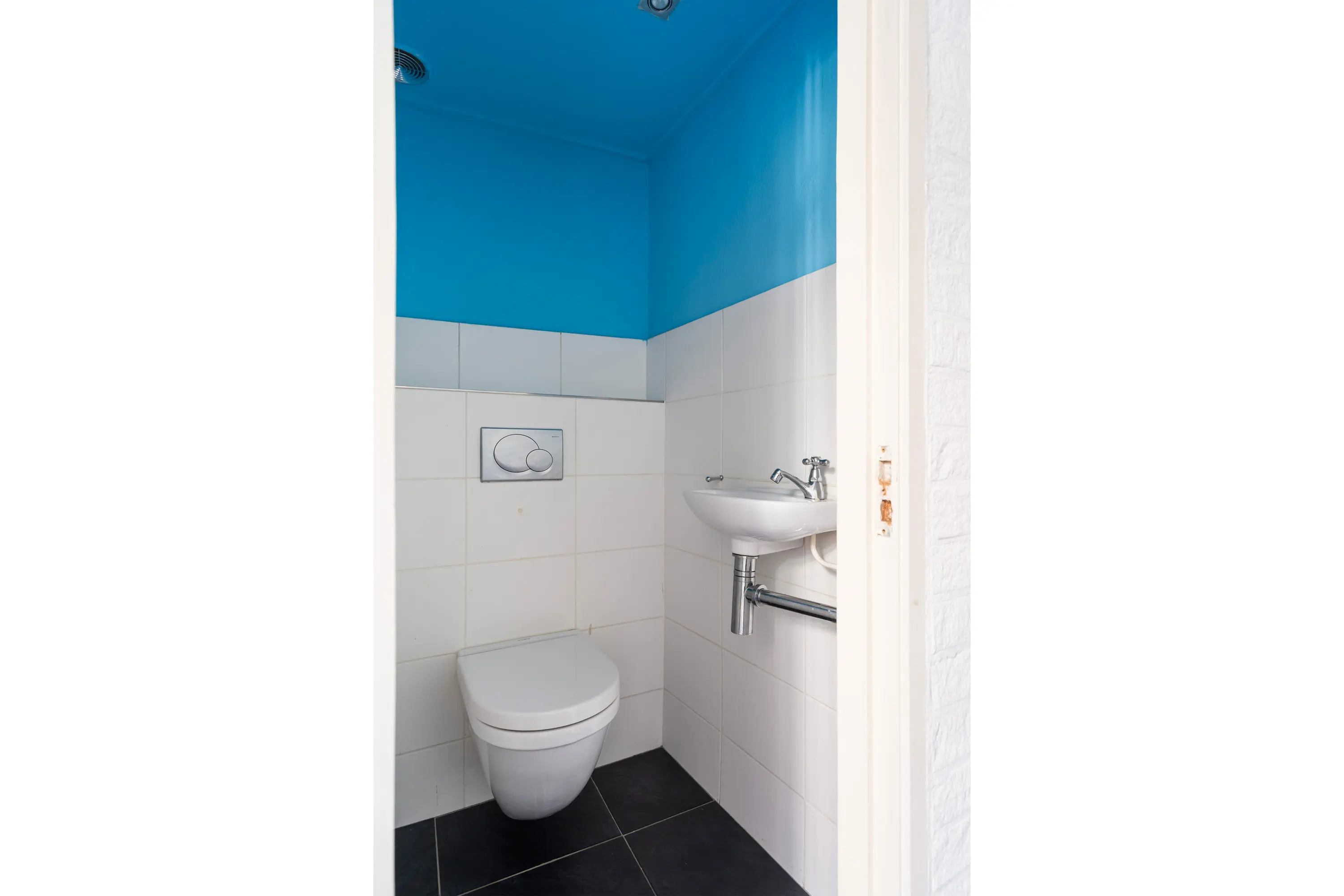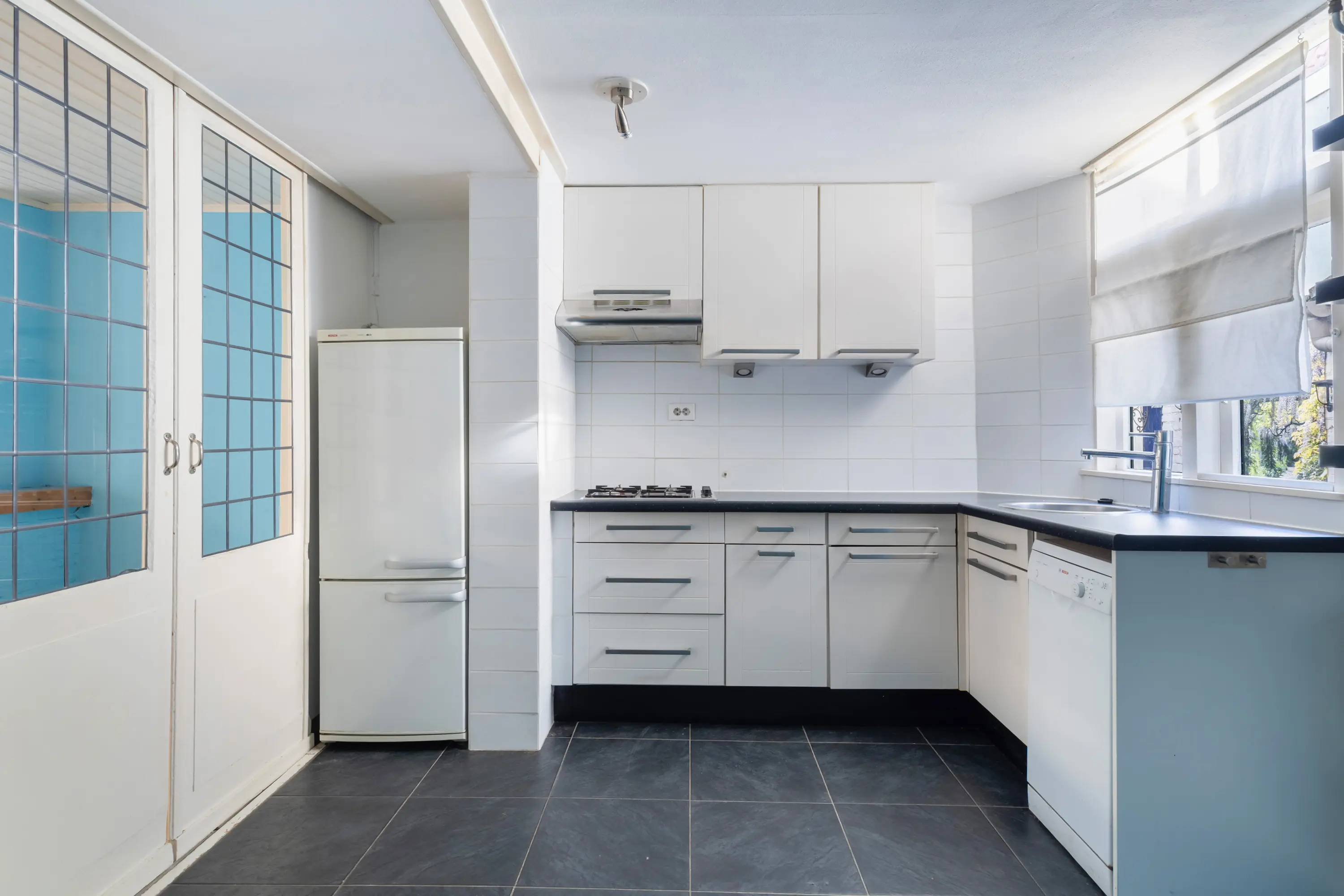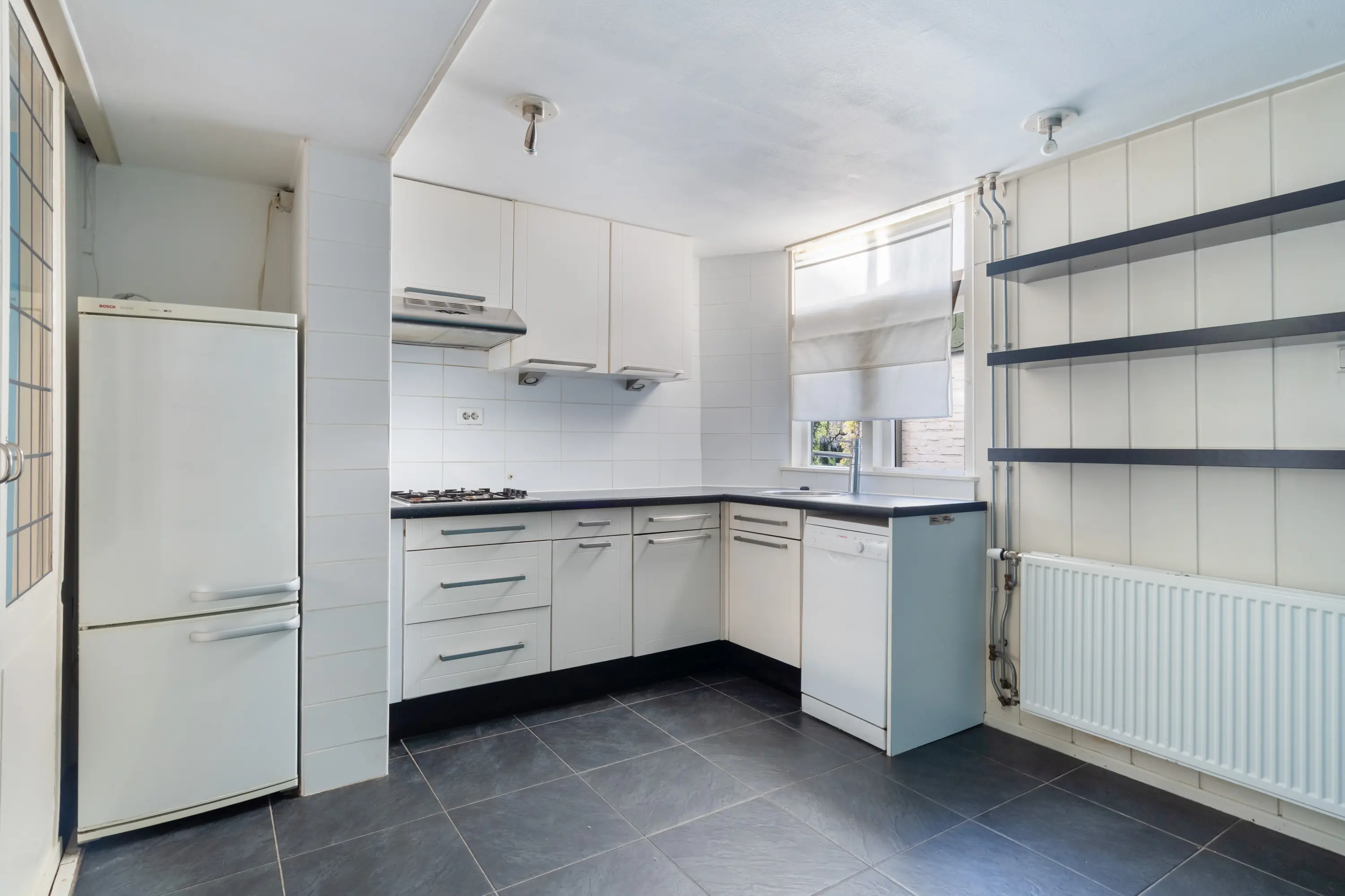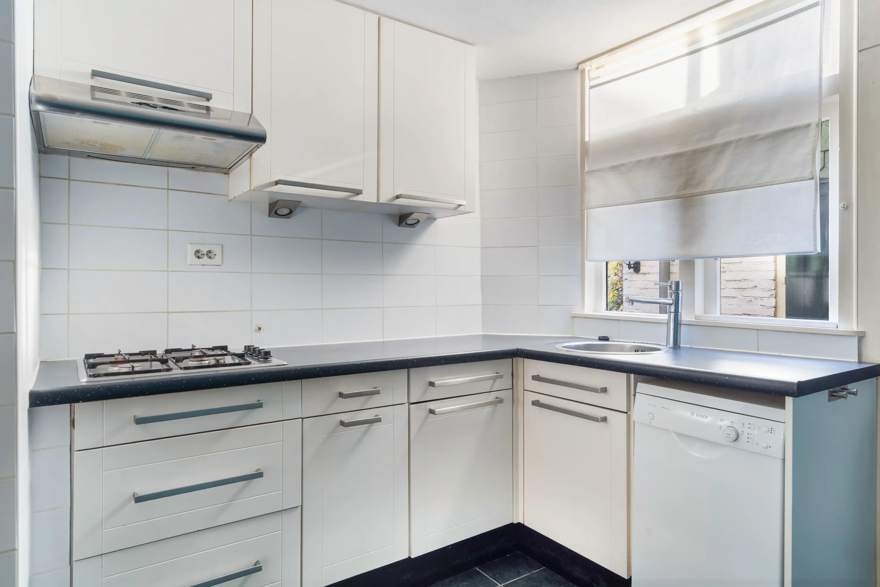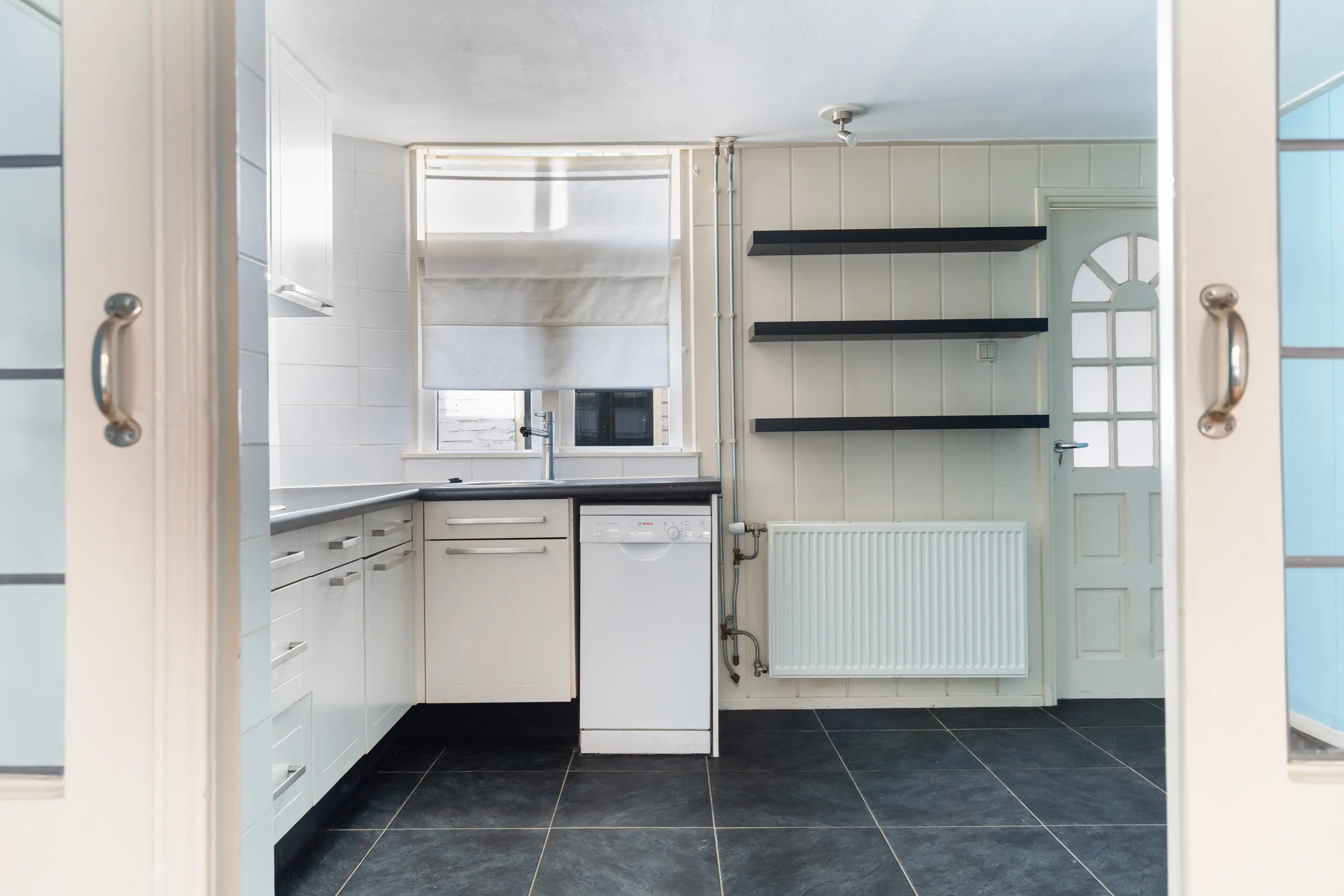 Entree/hal, meterkast, toiletruimte met hangend closet en fonteintje. Ruime woonkeuken met keukenblok in hoekopstelling voorzien van diverse inbouwapparatuur.