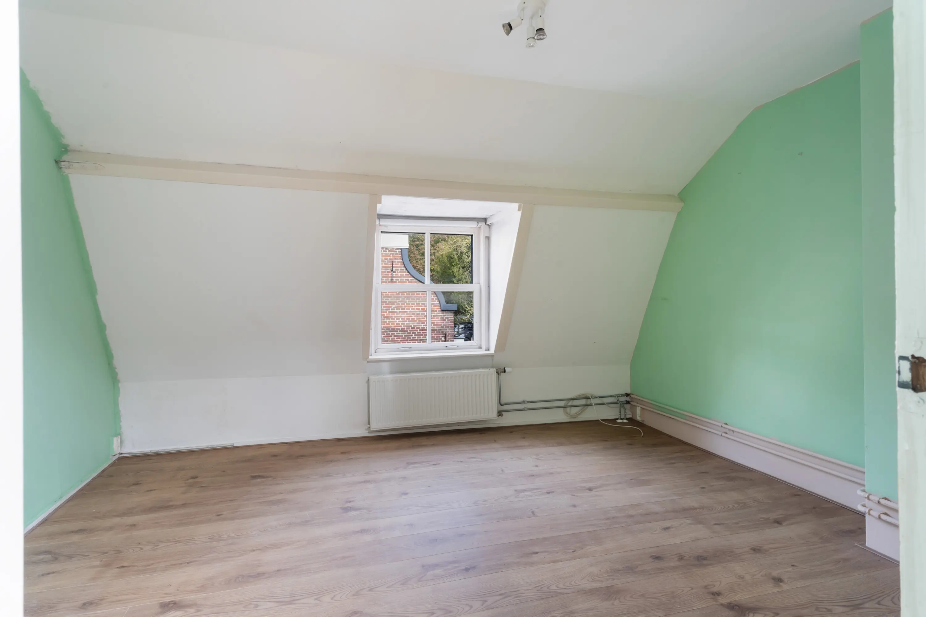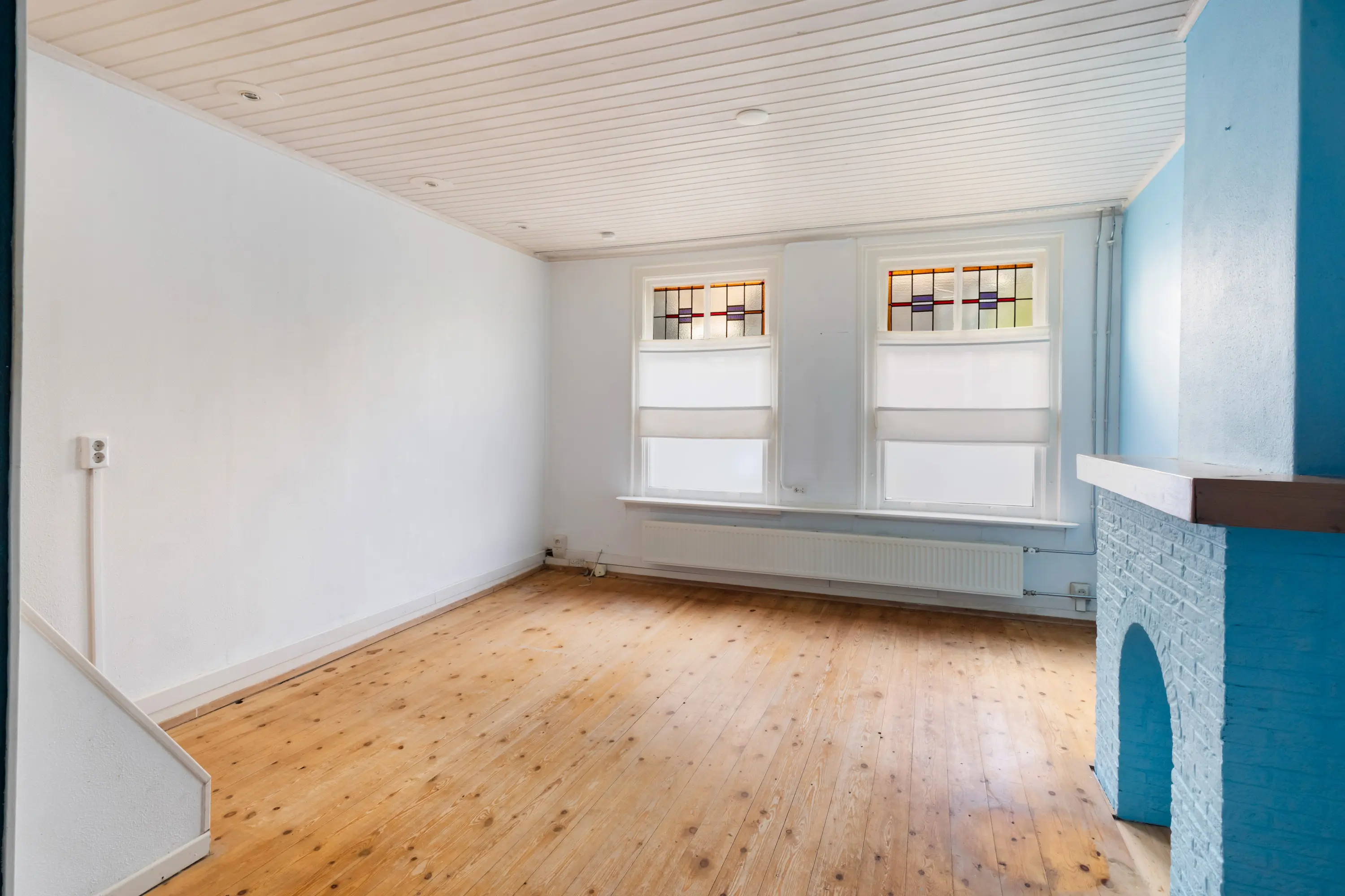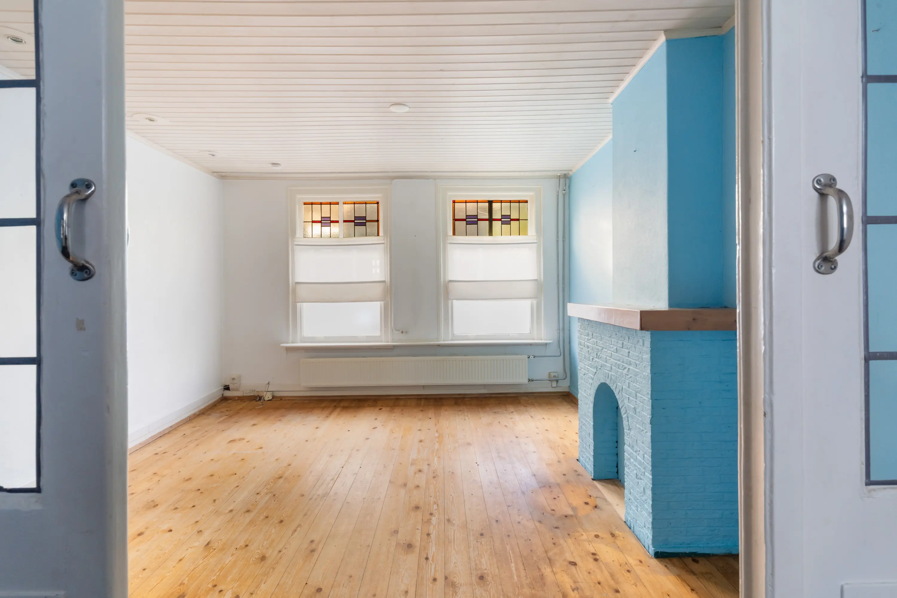 Via kamer-en-suite te bereiken woonkamer met houten vloerdelen, glas-in-lood ramen en schouw.