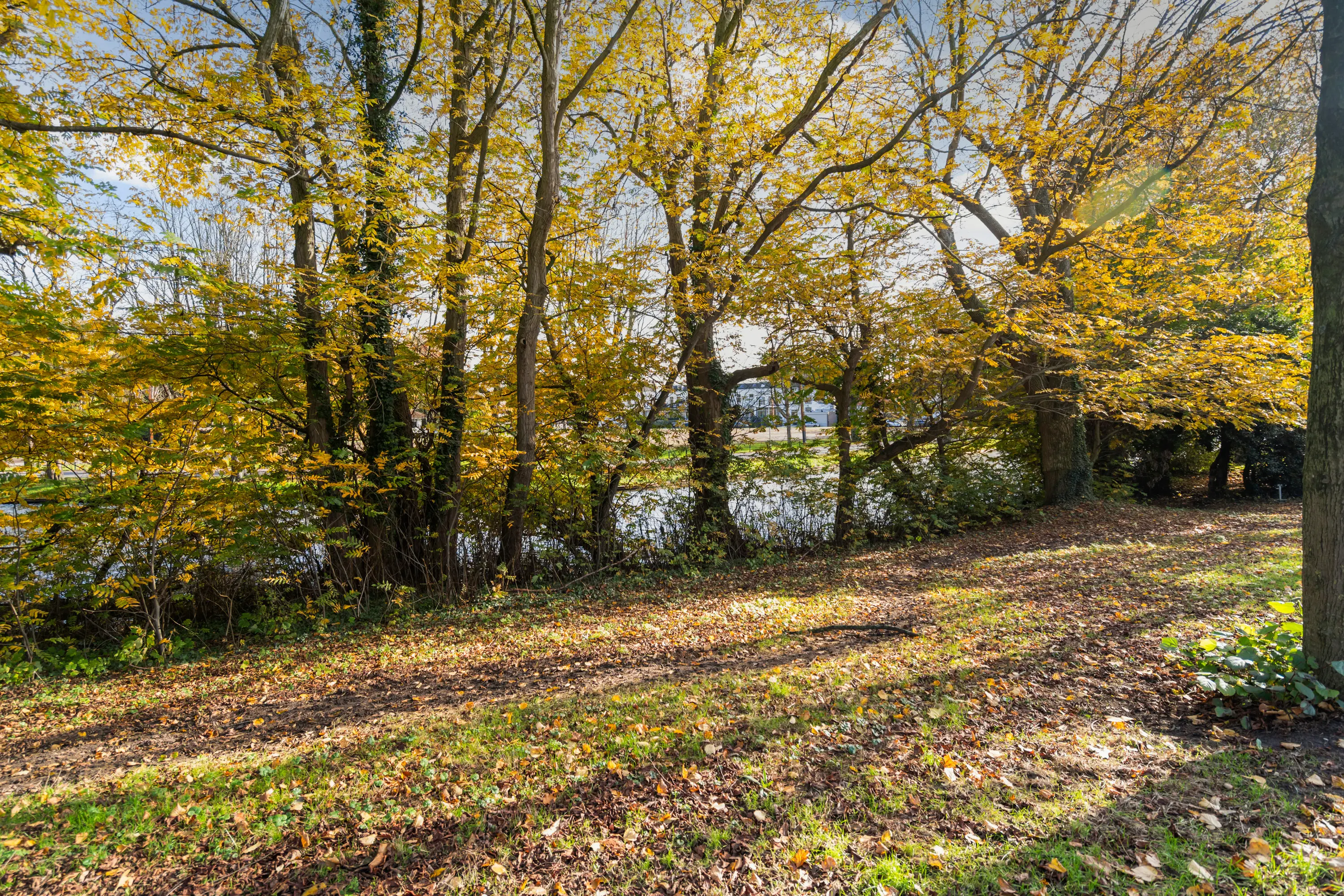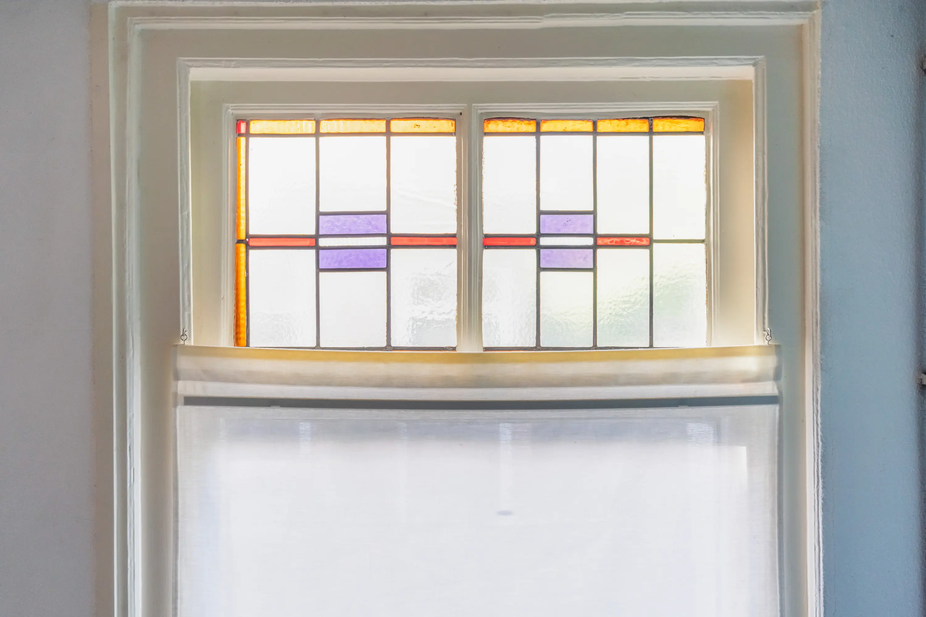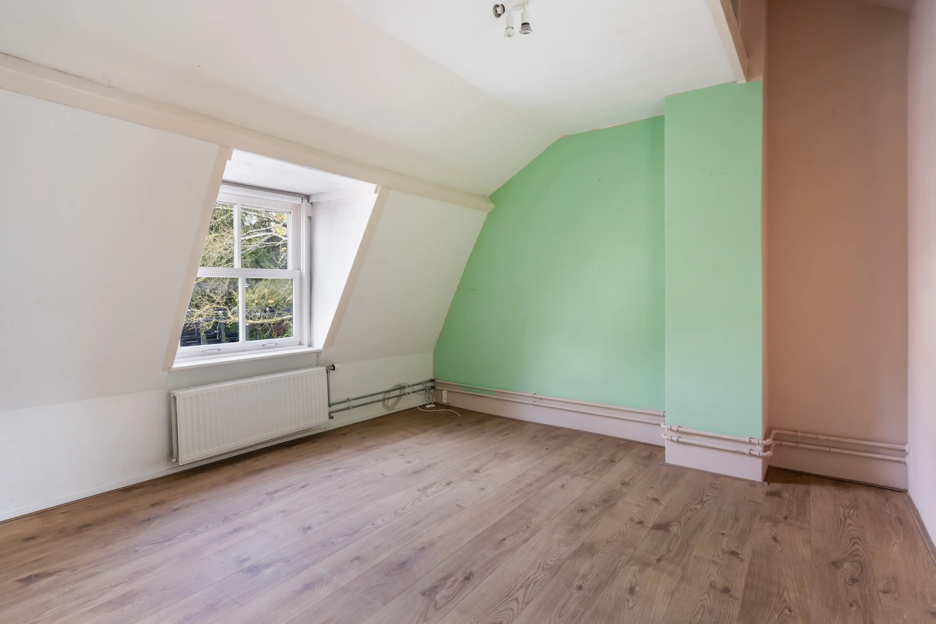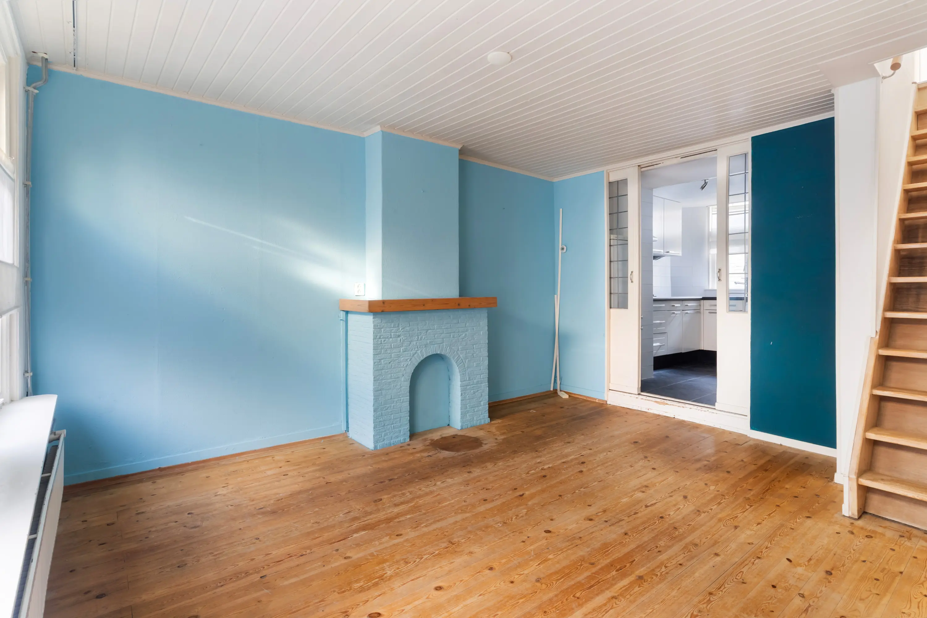 Via kamer-en-suite te bereiken woonkamer met houten vloerdelen, glas-in-lood ramen en schouw.