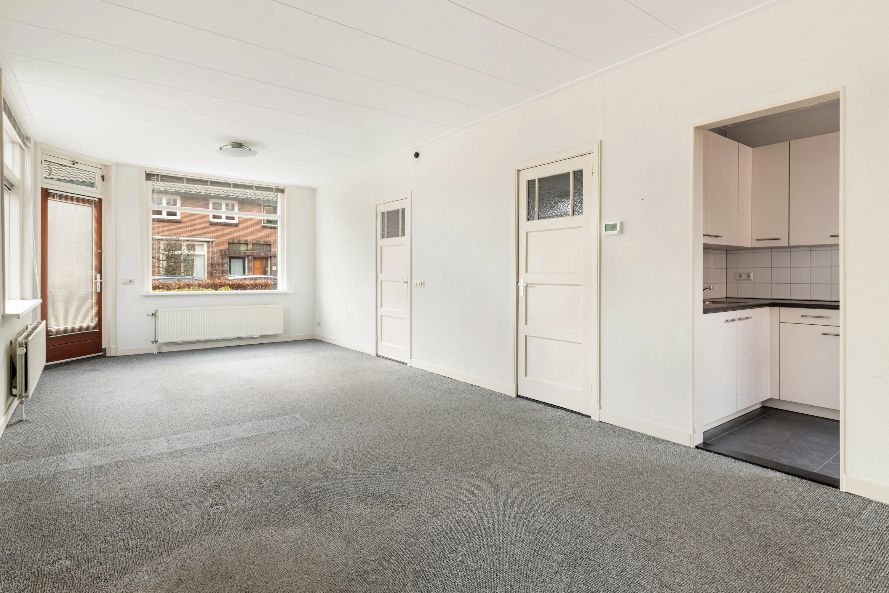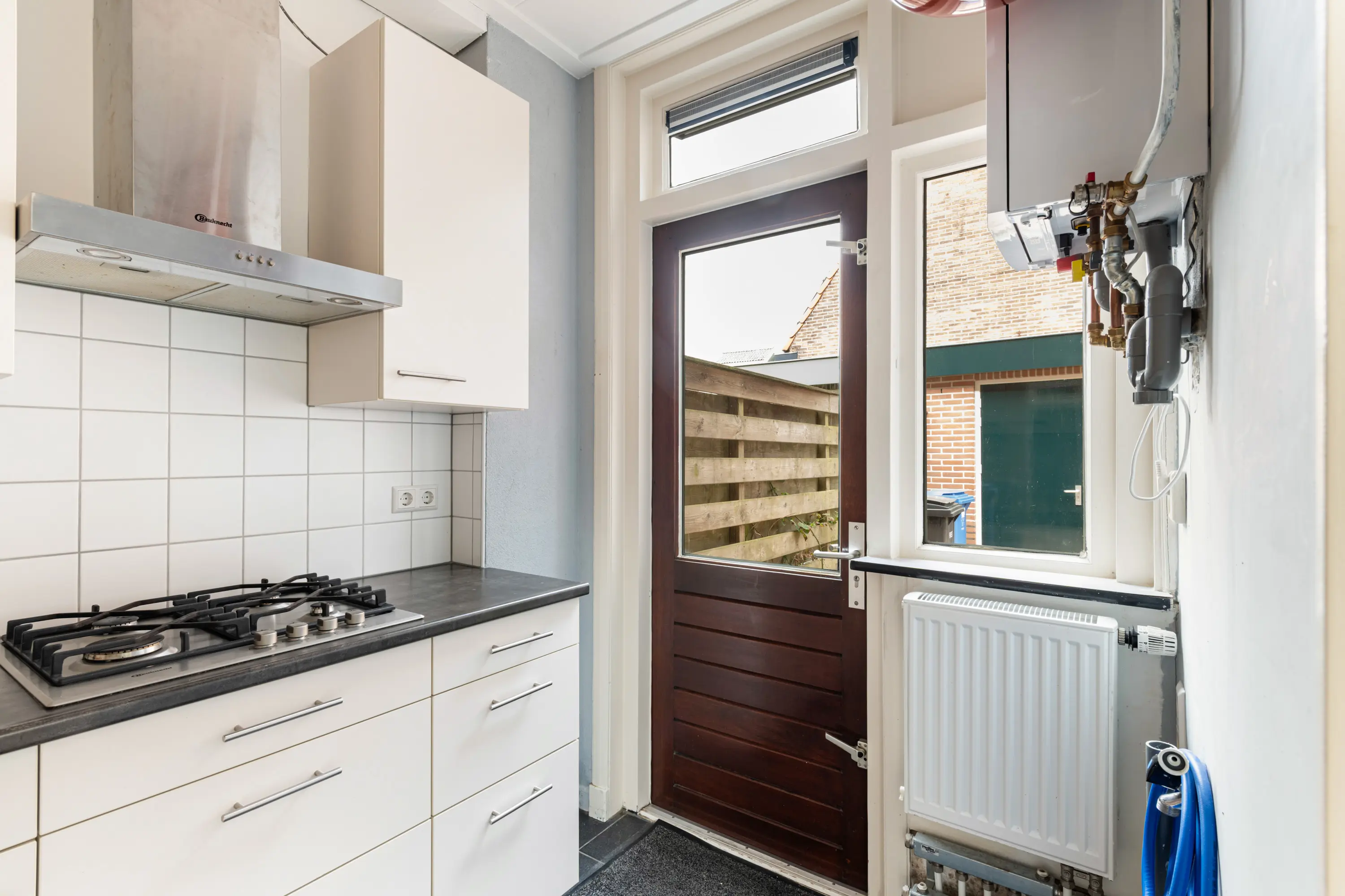 De woning beschikt over een royale en lichte woonkamer met grote raampartijen en een prettige plafondhoogte, wat zorgt voor een ruimtelijk gevoel. De indirect open keuken is opgesteld in een L-vorm en voorzien van een 4-pits gaskookplaat en afzuigkap. Vanuit de keuken is er via een loopdeur directe toegang tot de tuin.
