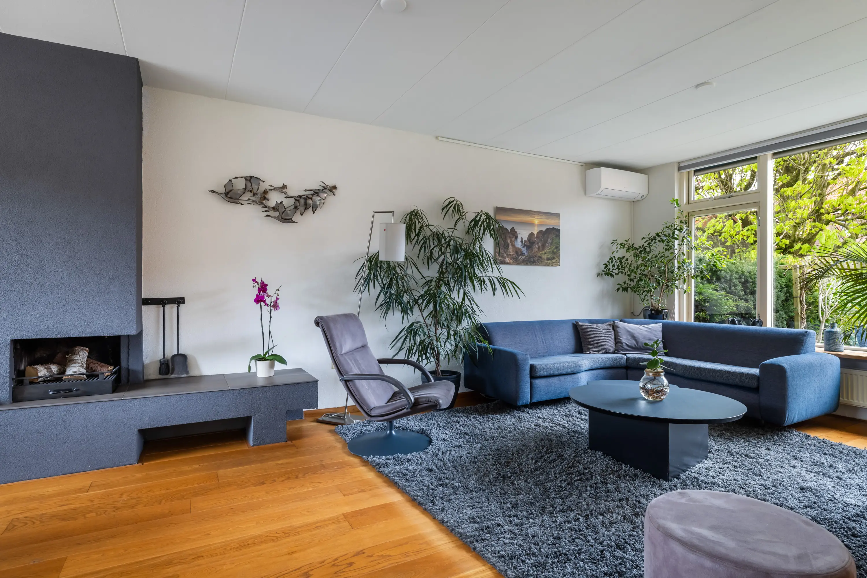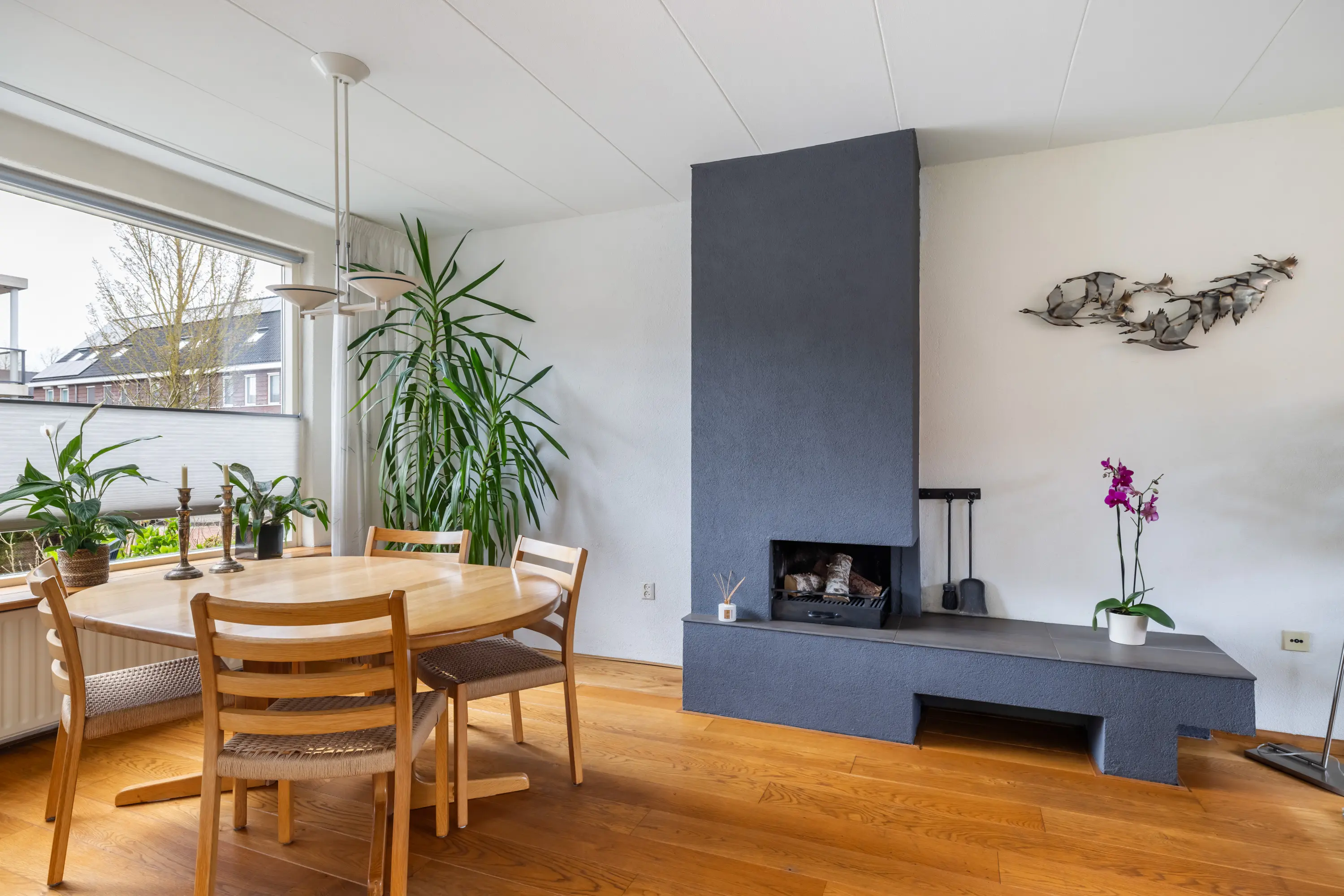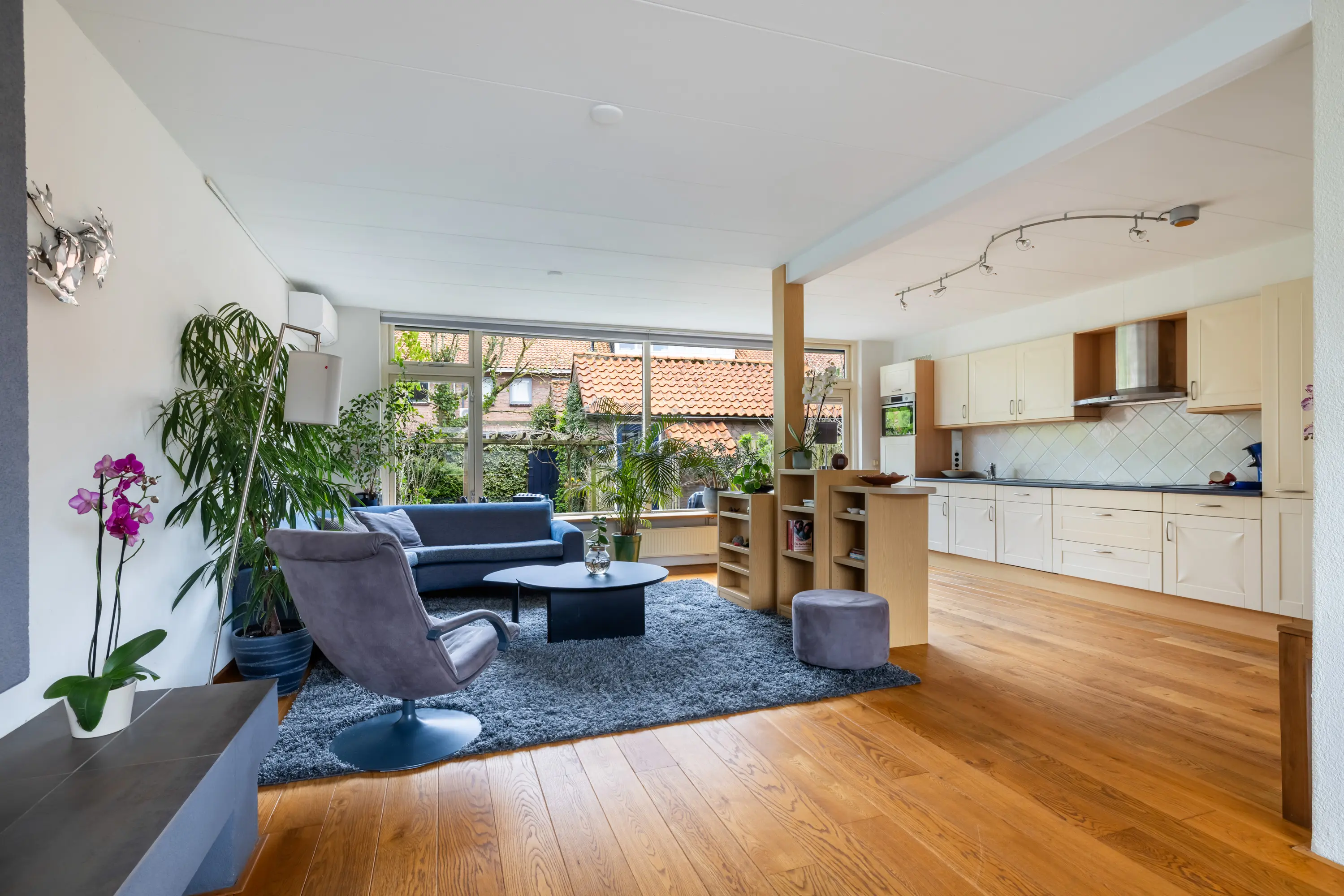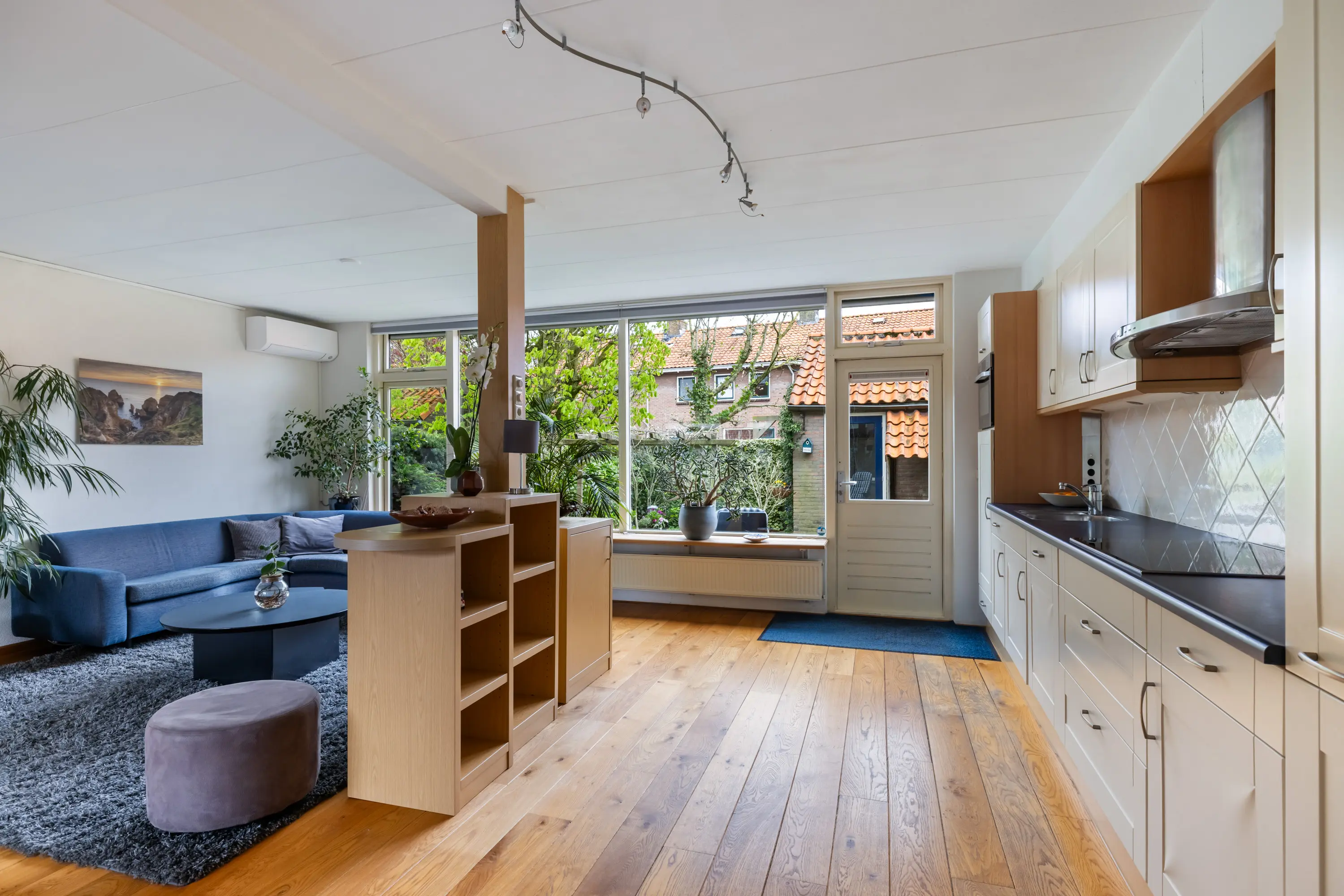 Via de ruime entree met meterkast, toilet en trapopgang kom je in de lichte en royale uitgebouwde woonkamer . De woonkamer is voorzien van een houten vloer en een sfeervolle open haard. De open keuken is uitgerust met inbouwapparatuur en geeft direct toegang tot de zonnige achtertuin op het zuiden.