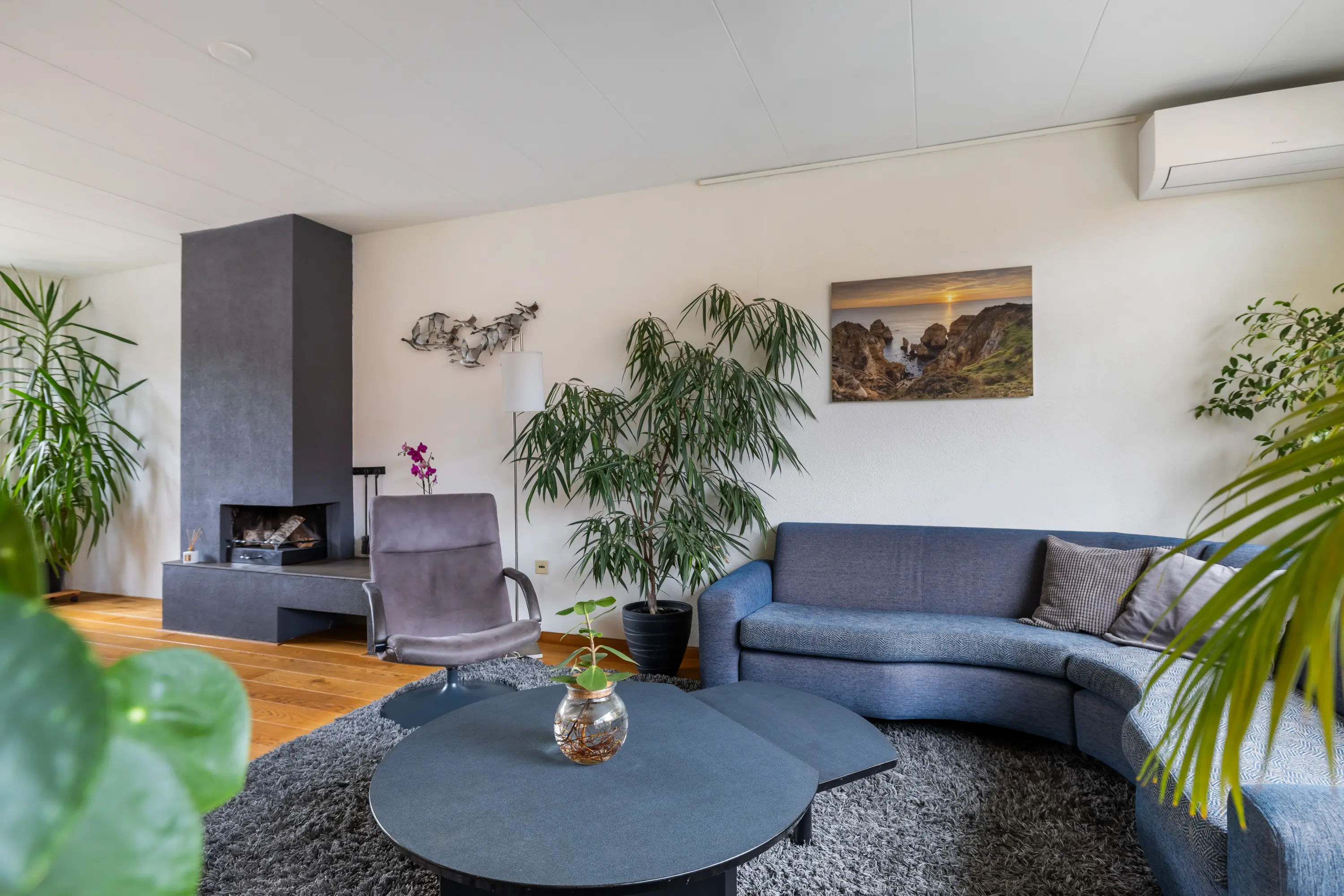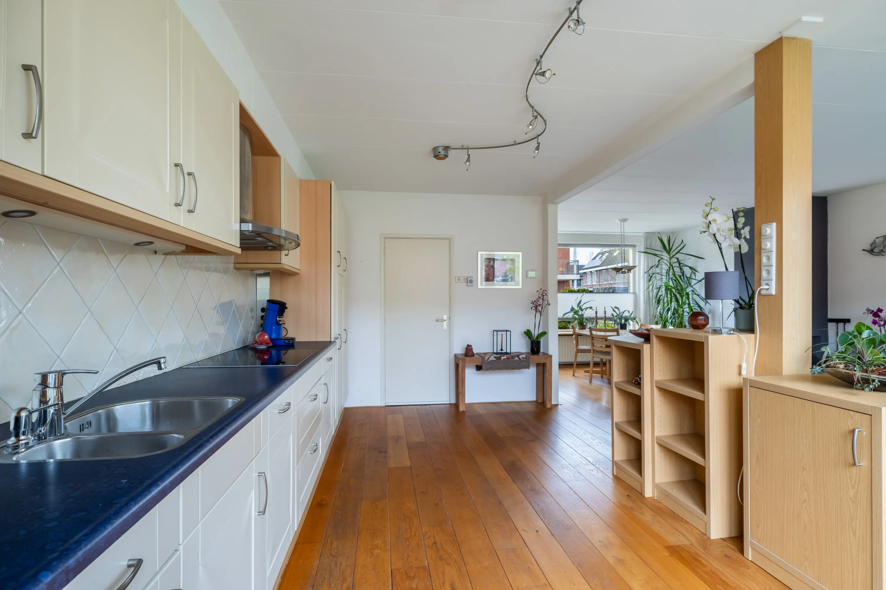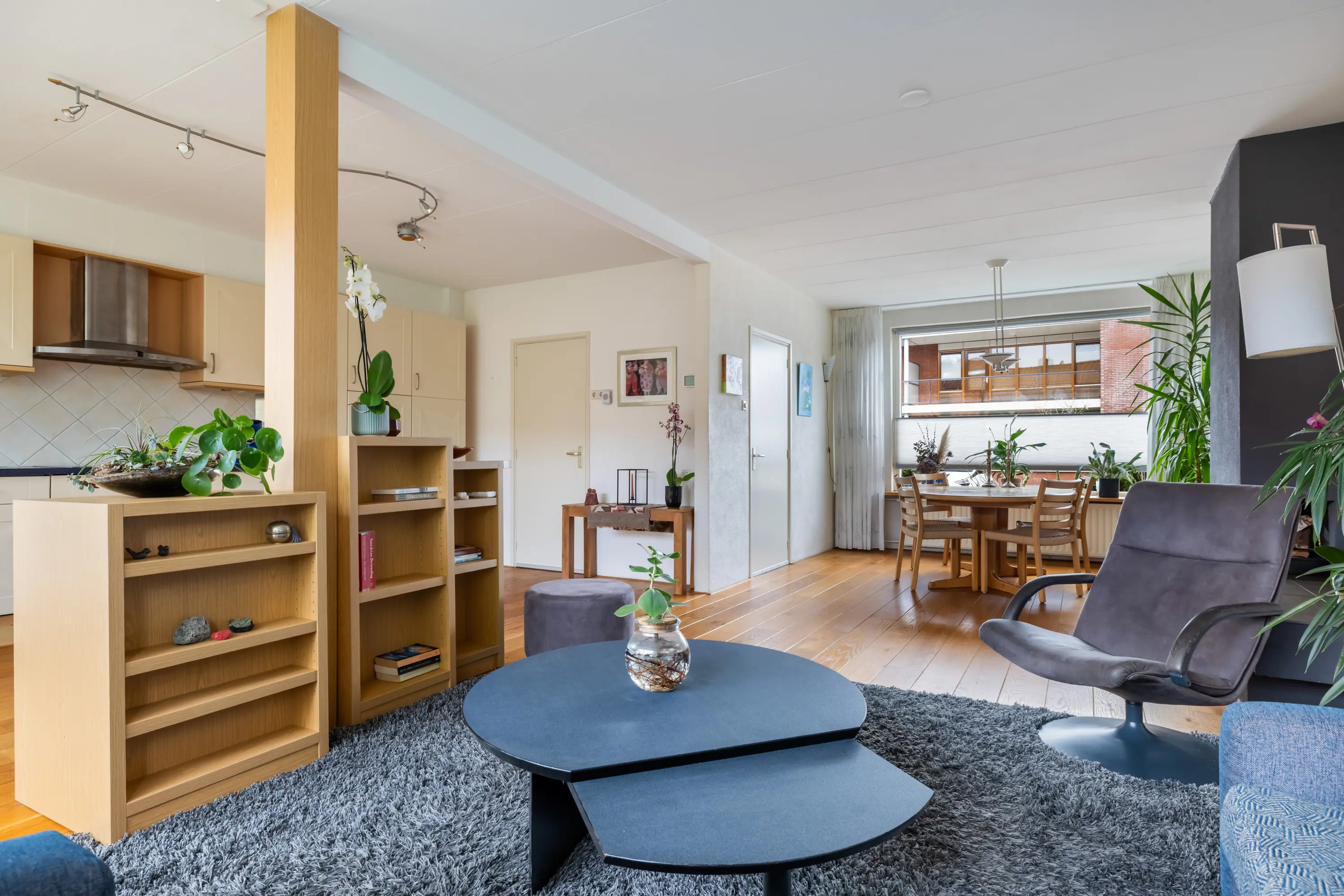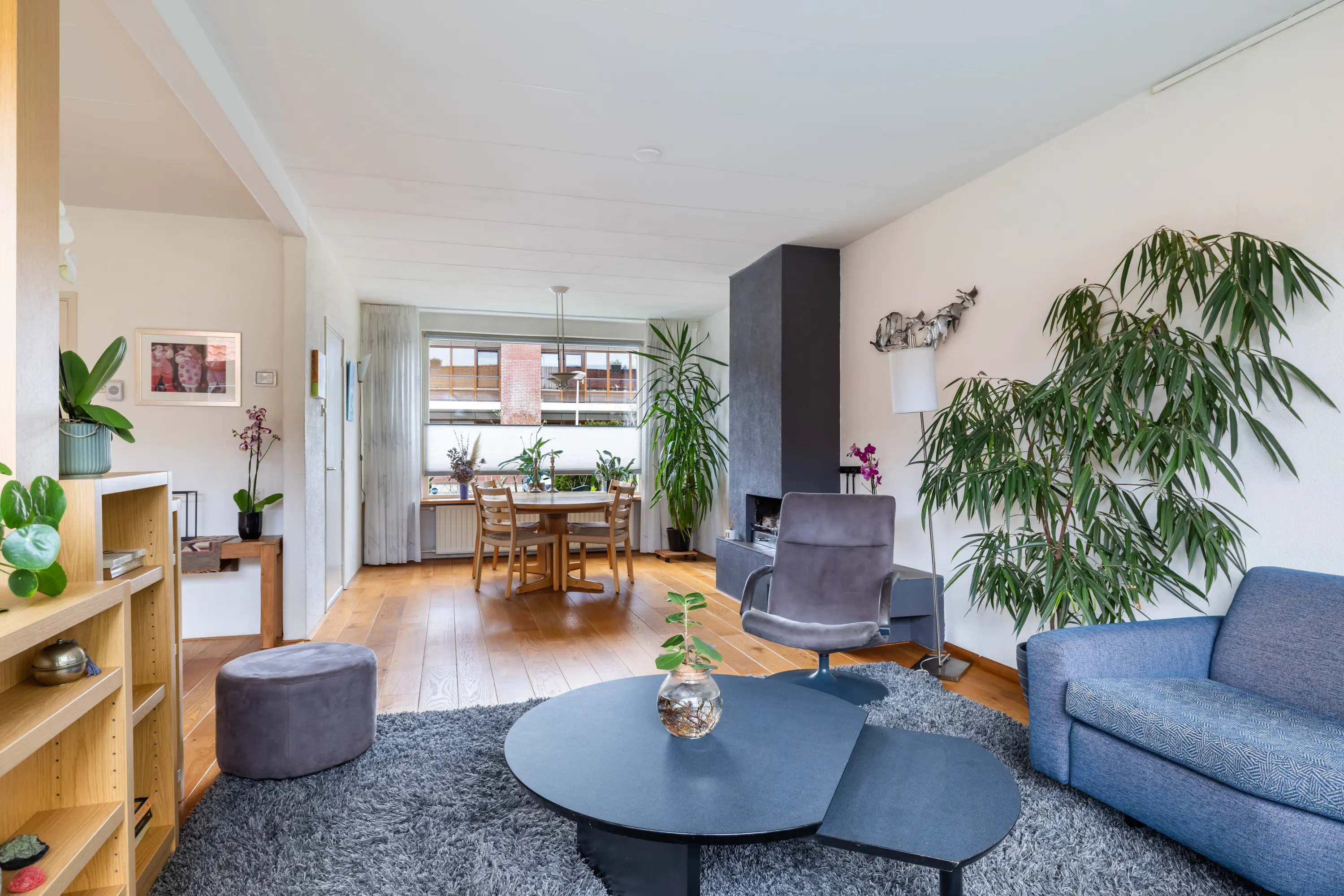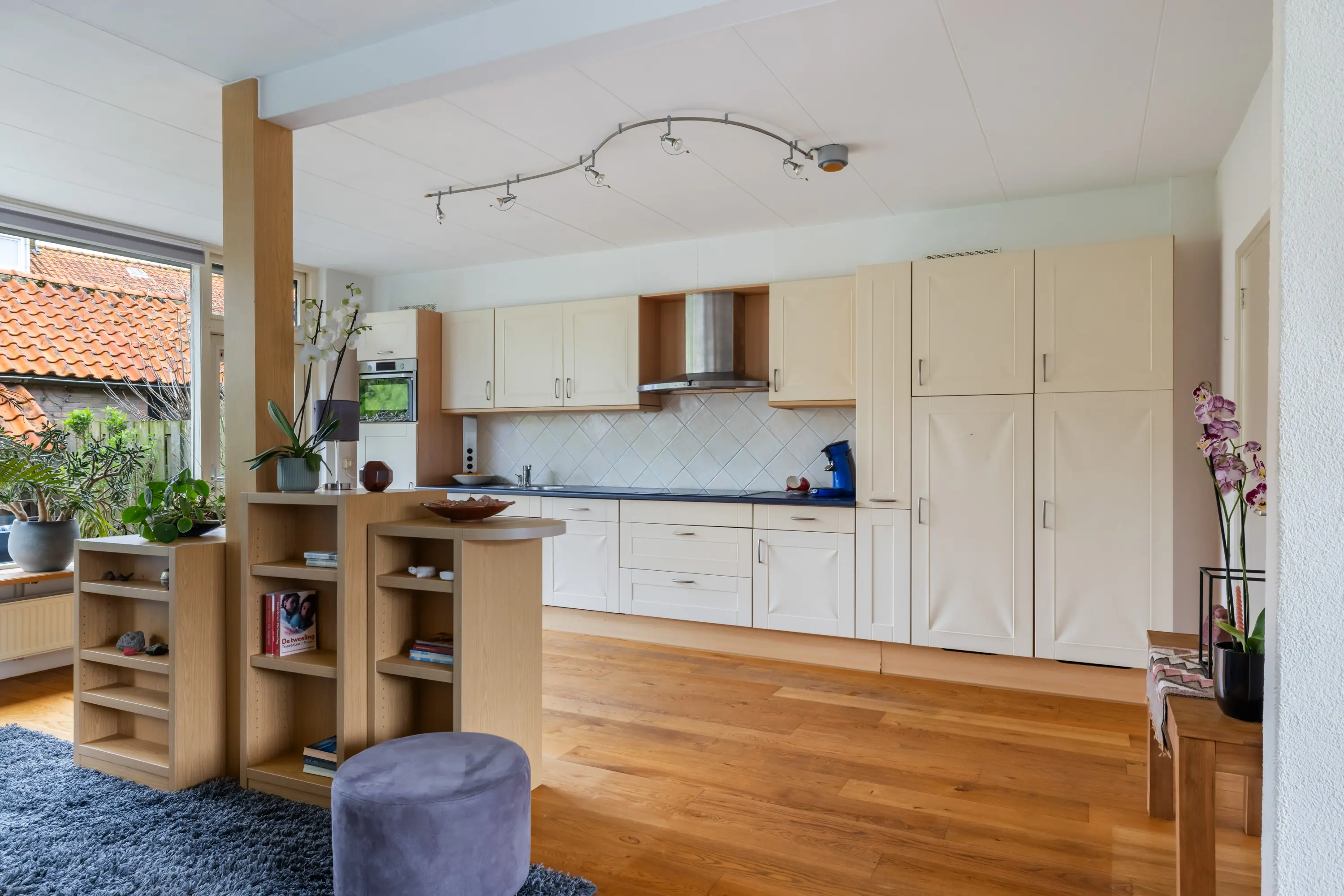 Via de ruime entree met meterkast, toilet en trapopgang kom je in de lichte en royale uitgebouwde woonkamer . De woonkamer is voorzien van een houten vloer en een sfeervolle open haard. De open keuken is uitgerust met inbouwapparatuur en geeft direct toegang tot de zonnige achtertuin op het zuiden.