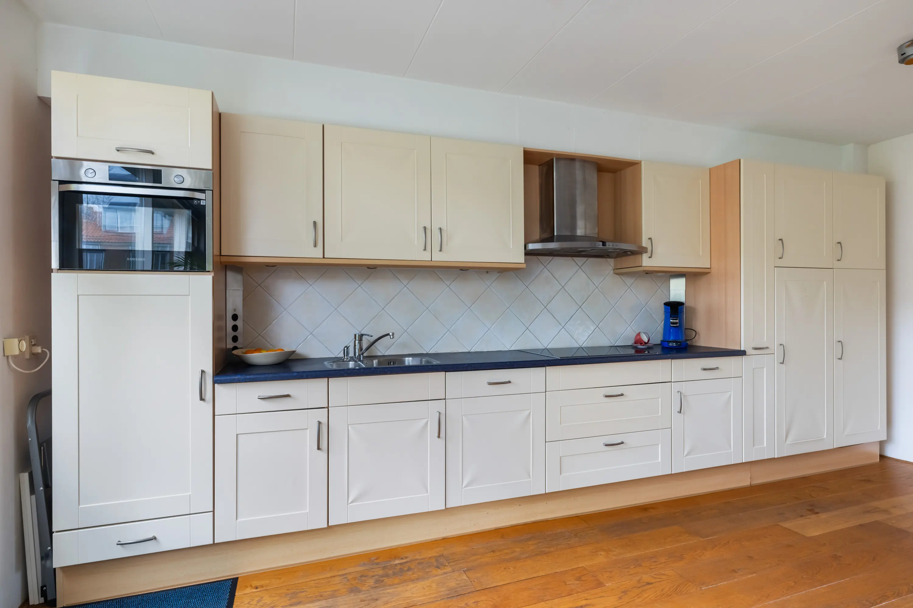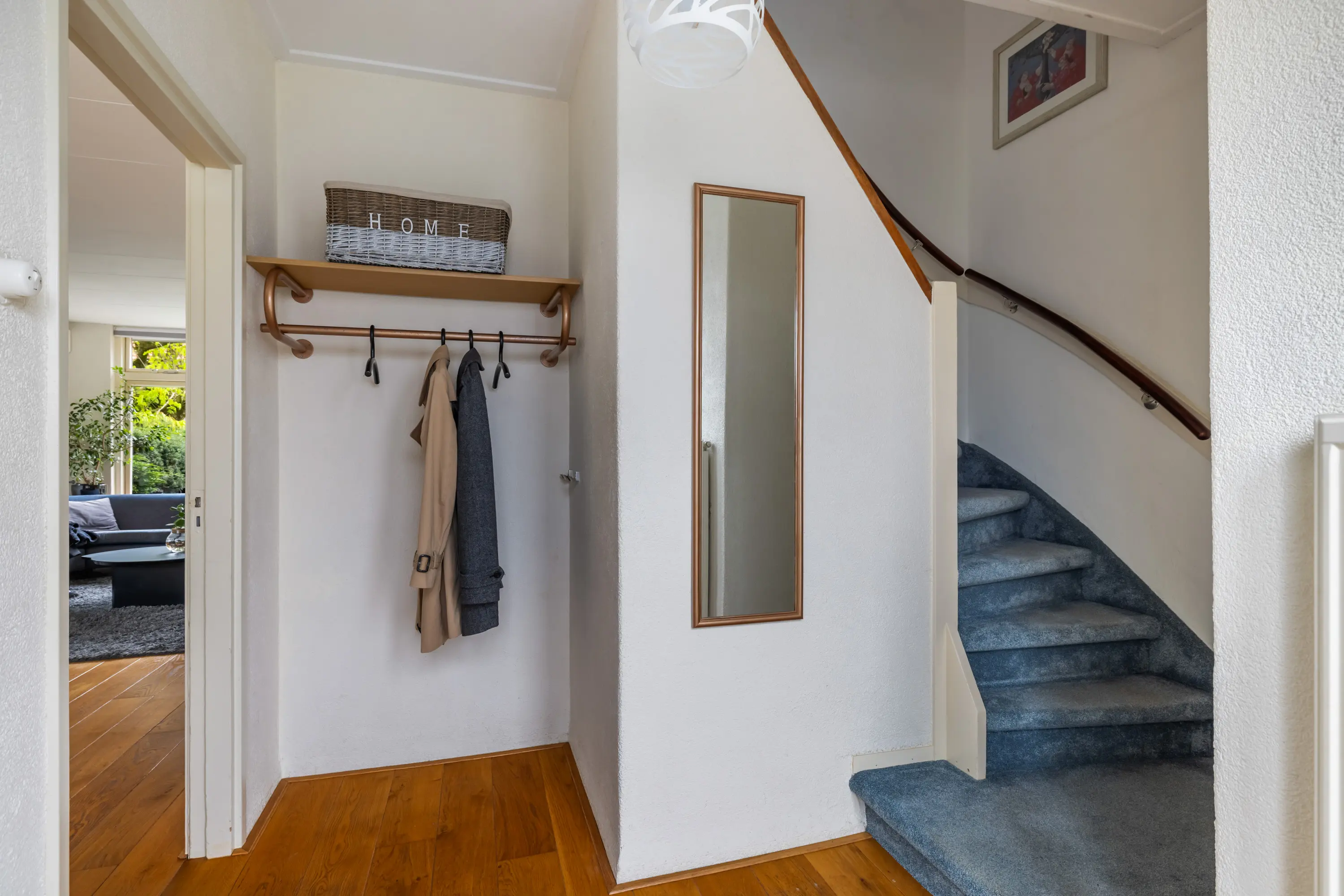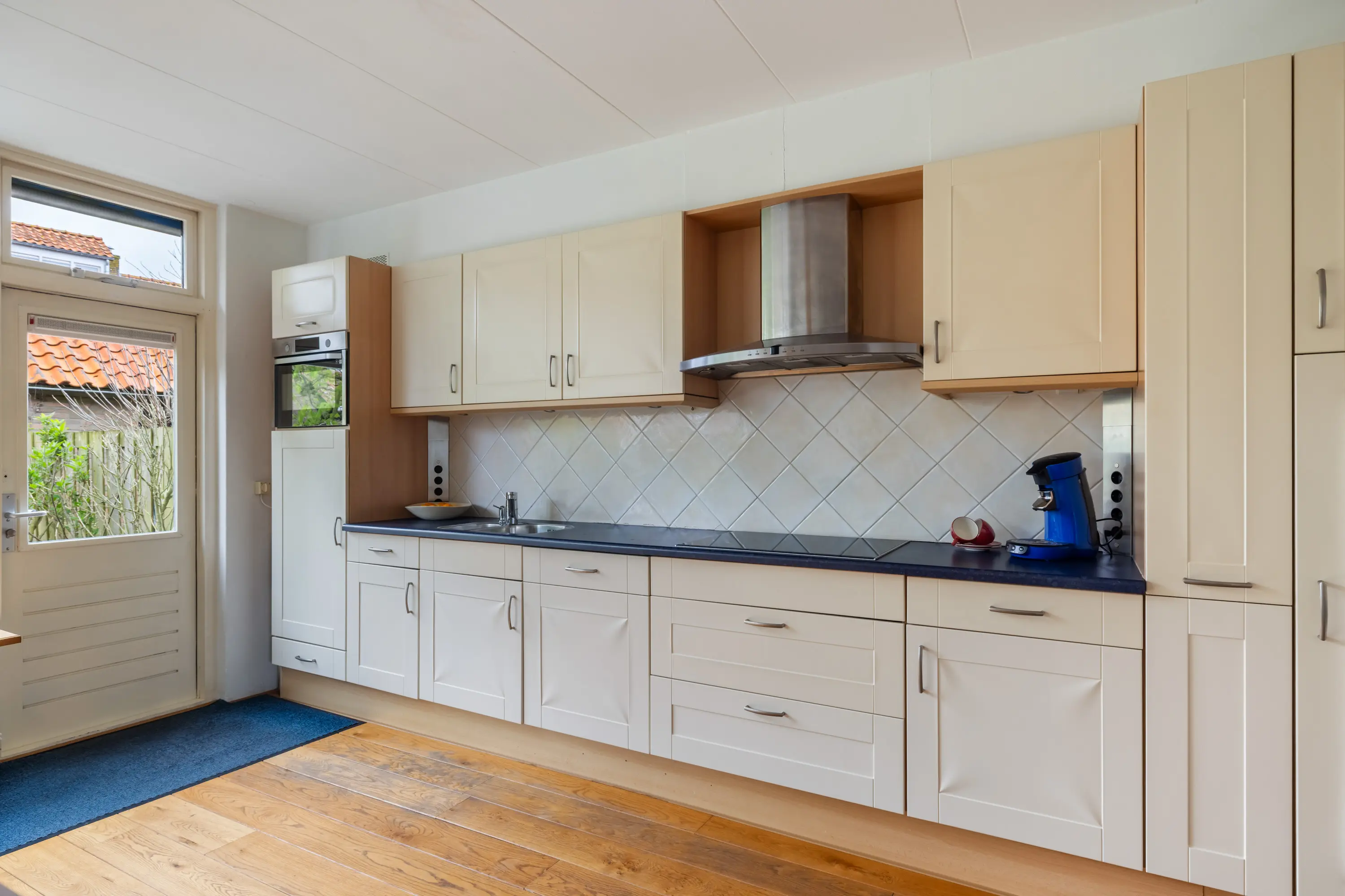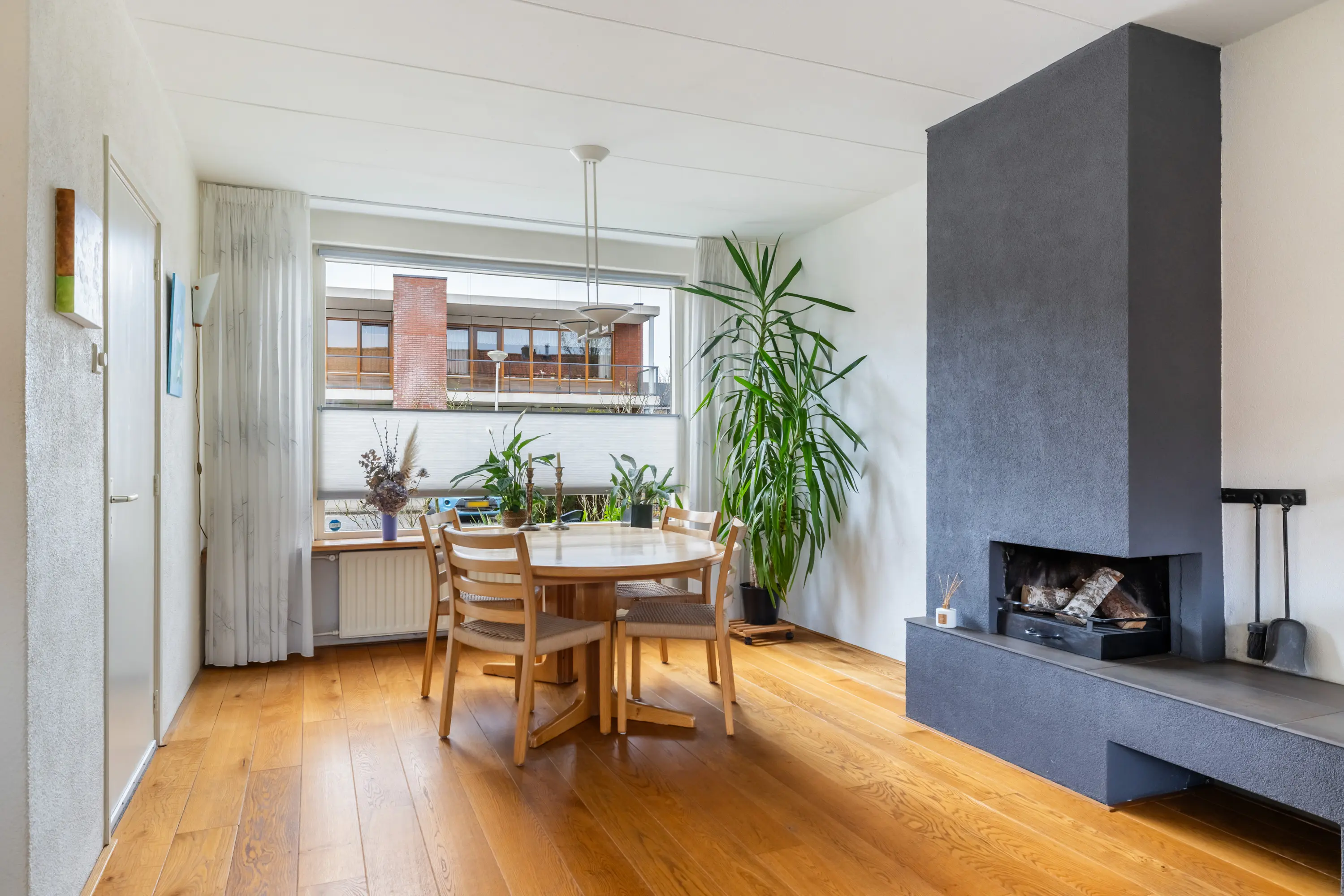 Via de ruime entree met meterkast, toilet en trapopgang kom je in de lichte en royale uitgebouwde woonkamer . De woonkamer is voorzien van een houten vloer en een sfeervolle open haard. De open keuken is uitgerust met inbouwapparatuur en geeft direct toegang tot de zonnige achtertuin op het zuiden.