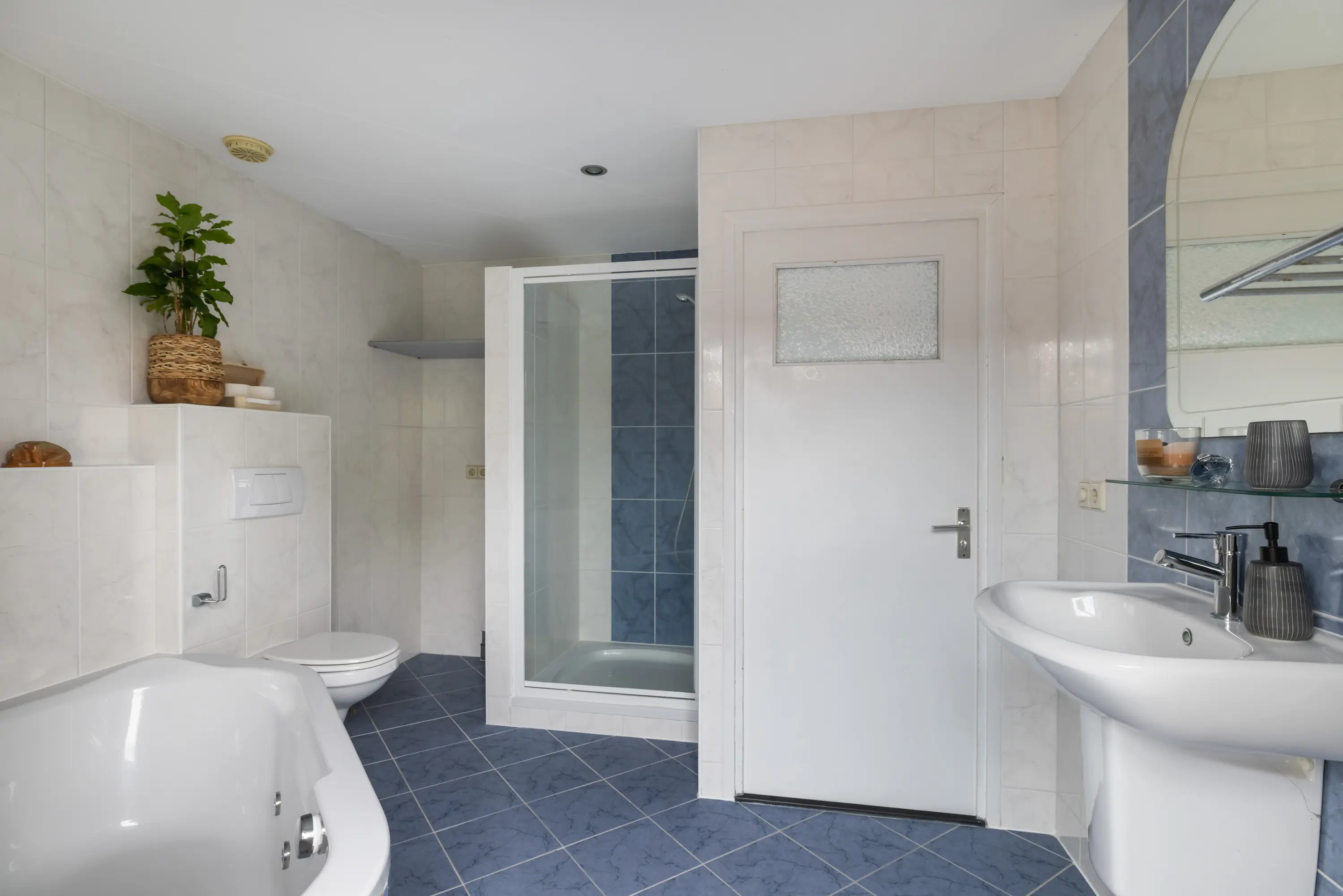 Op de eerste verdieping bevinden zich drie slaapkamers en een ruime, complete badkamer met ligbad, douche, wastafel, toilet, designradiator en aansluitingen voor wasmachine en droger. Vanuit de badkamer is het dakterras bereikbaar. De hoofdslaapkamer beschikt over vaste kasten.