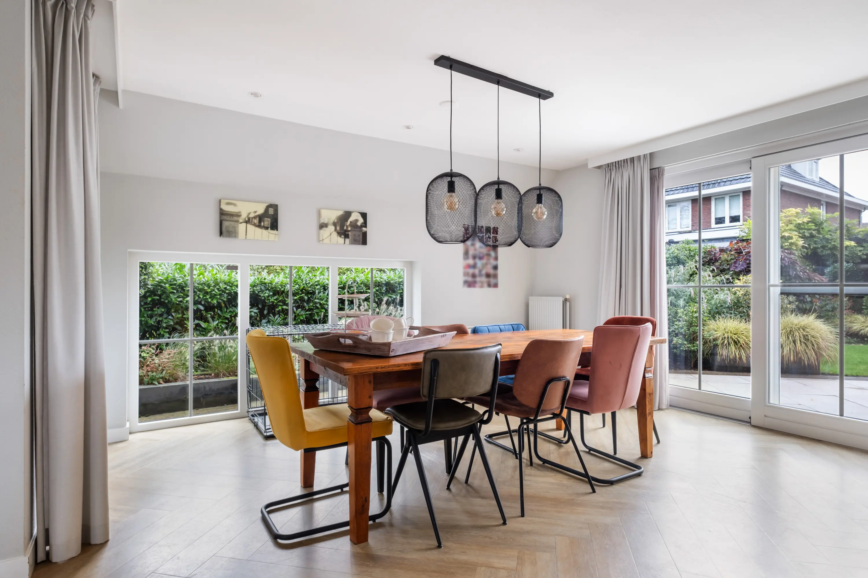 Entree met ruime hal, trapopgang, toiletruimte en garderobe. De woonkamer is licht en ruim, dankzij grote raampartijen met een schitterend uitzicht. De halfopen keuken heeft een royaal keukenblok in L-opstelling voorzien van inbouwapparatuur o.a. (4 pits keramische kookplaat, oven, afzuigkap, vaatwasser, koelkast en vriezer). Vanuit de keuken is er toegang tot de bijkeuken met trapopgang naar 1e verdieping, aansluitingen voor wasmachine en droger en deur naar de ruime garage voorzien van een uitstortgootsteen, een technische ruimte voor de zonnepanelen en loopdeur naar de tuin met veel privacy.