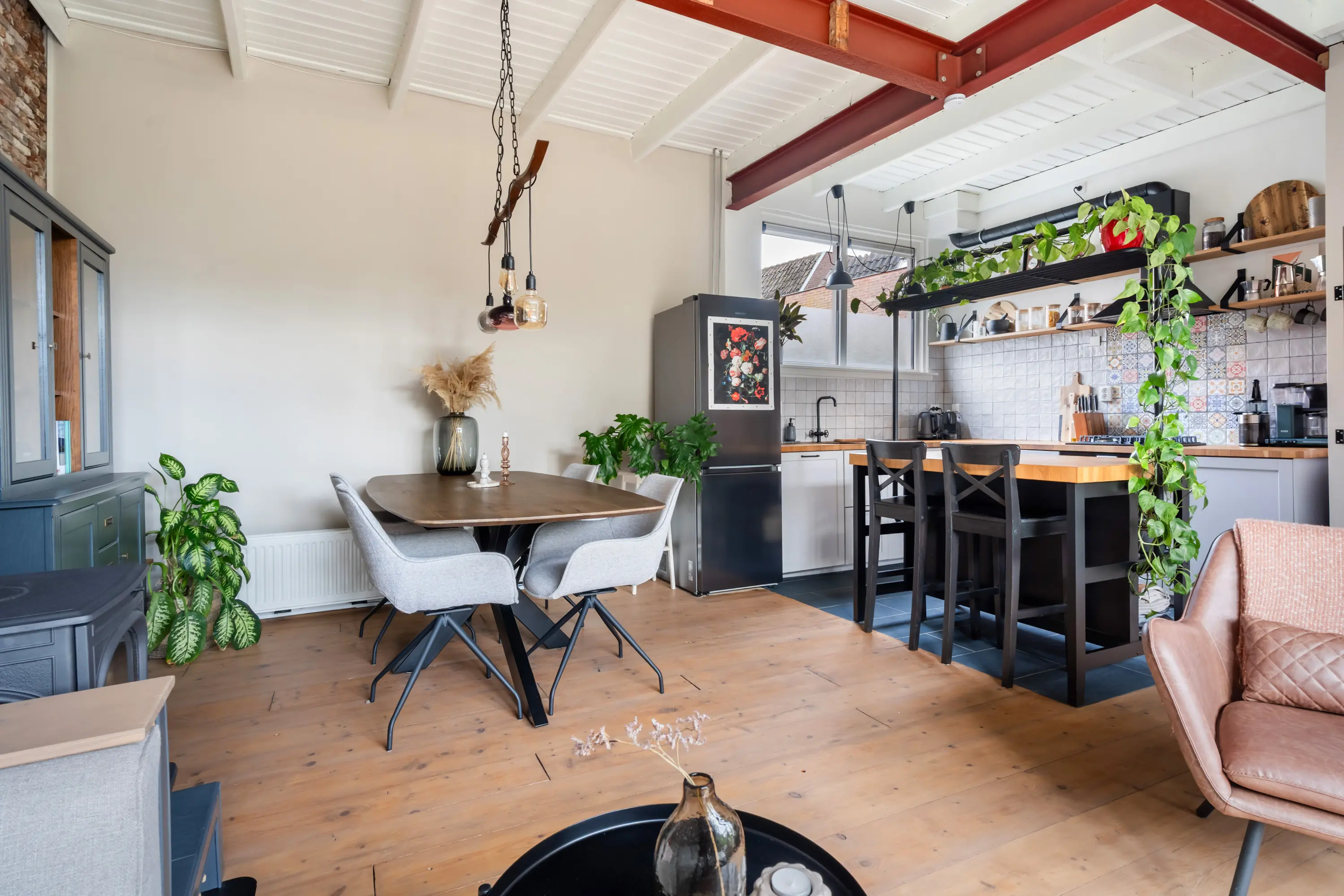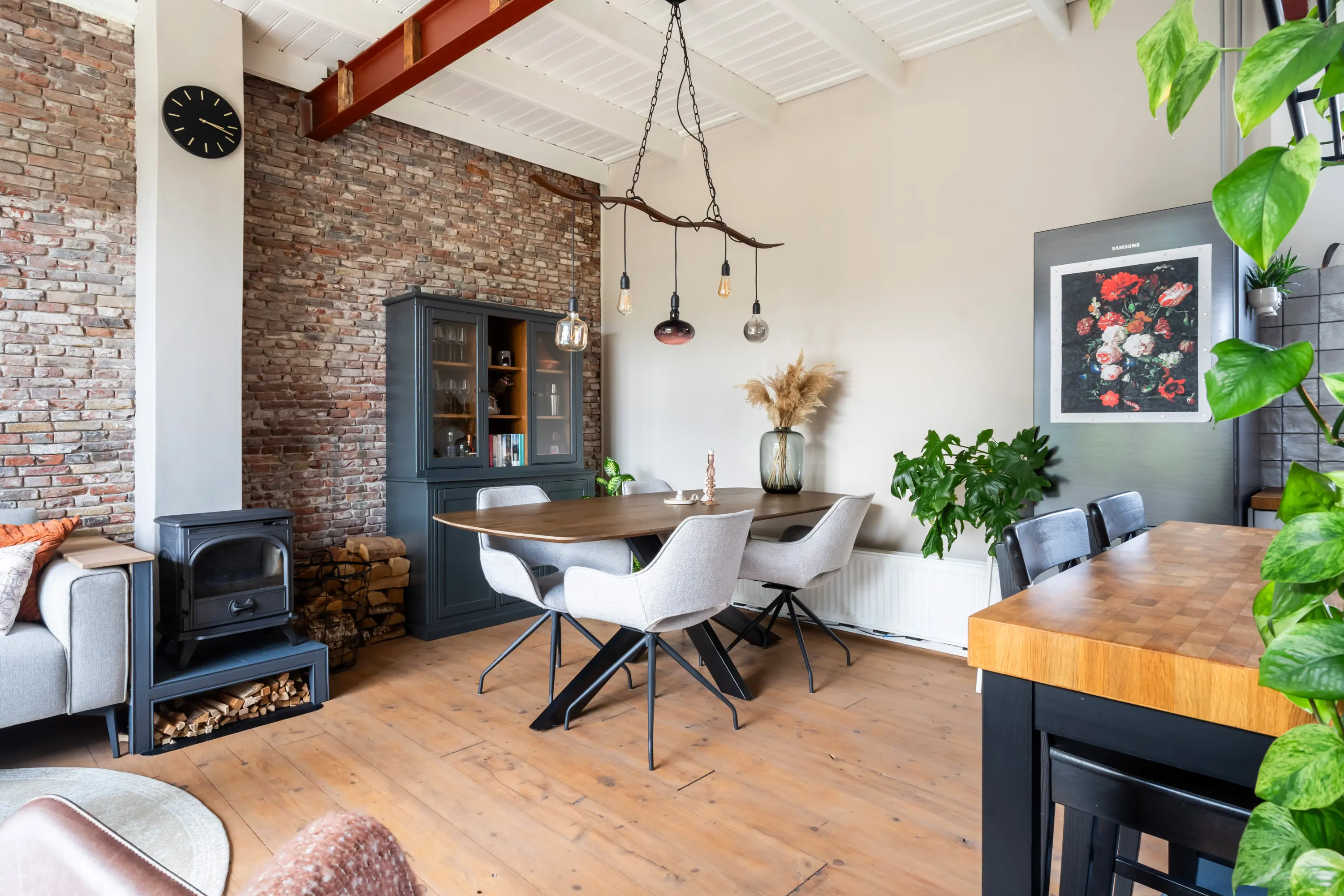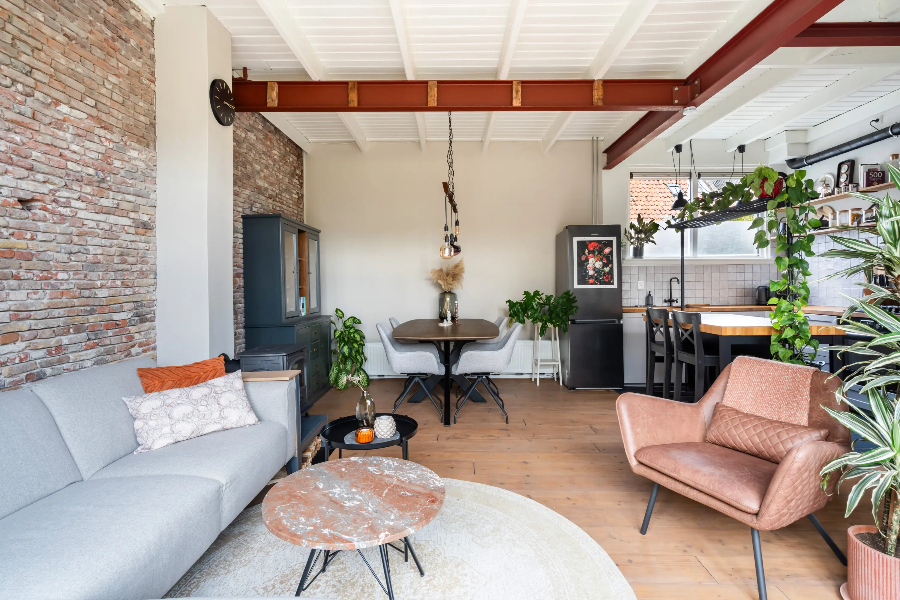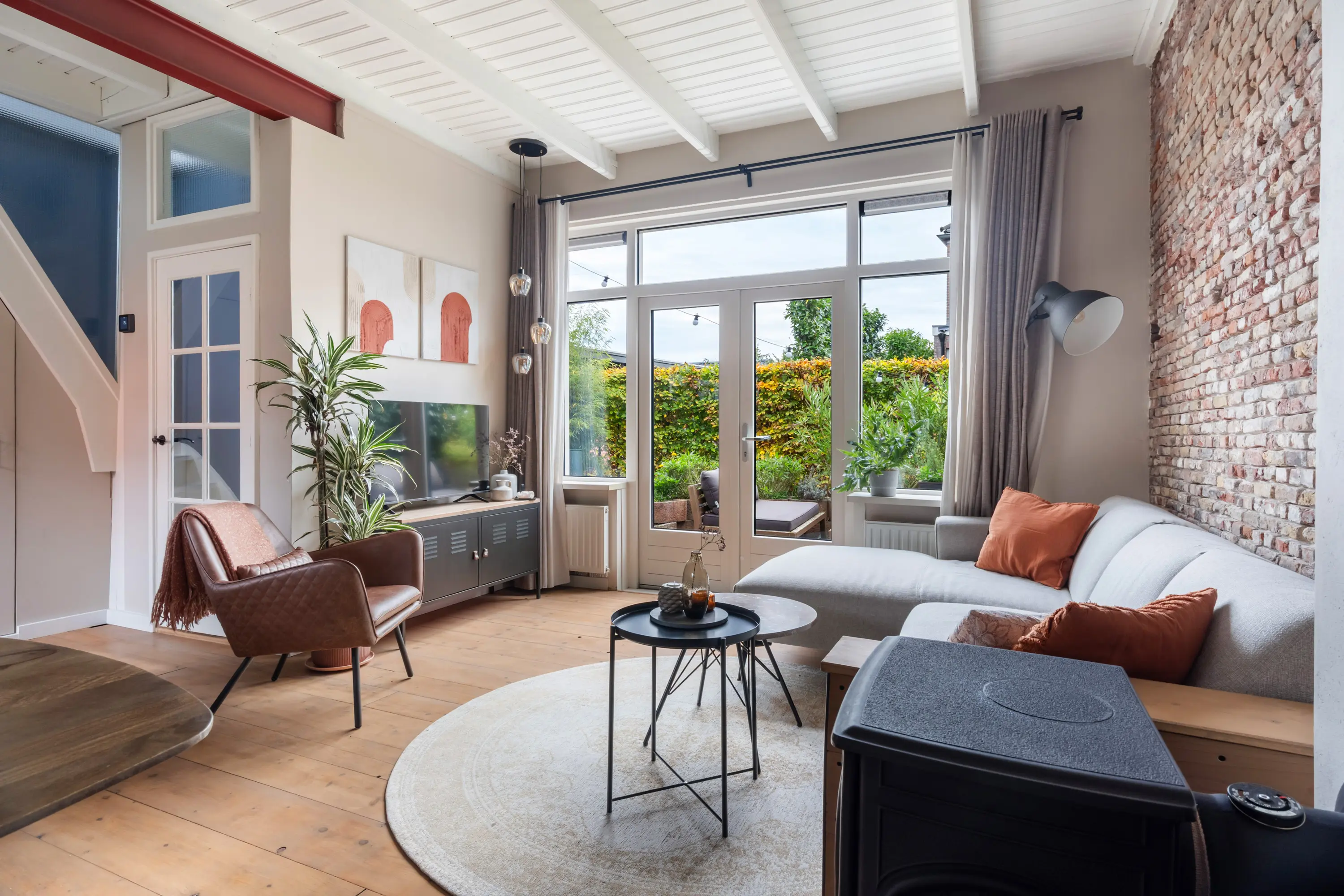 Via de entree kom je in de hal met toilet. De woonkamer ademt direct sfeer dankzij het fraaie metselwerk en de zichtbare balken. De open keuken (2019) sluit hier naadloos op aan en is uitgerust met alle gemakken: een 4-pits gasfornuis, oven, afzuigkap, vaatwasser en – ter overname – een koel-vriescombinatie. Onder de trap bevindt zich een praktische provisie- en meterkast. Vanuit de zithoek geniet je van het uitzicht op de voortuin en het rustige straatje, bereikbaar via openslaande deuren.