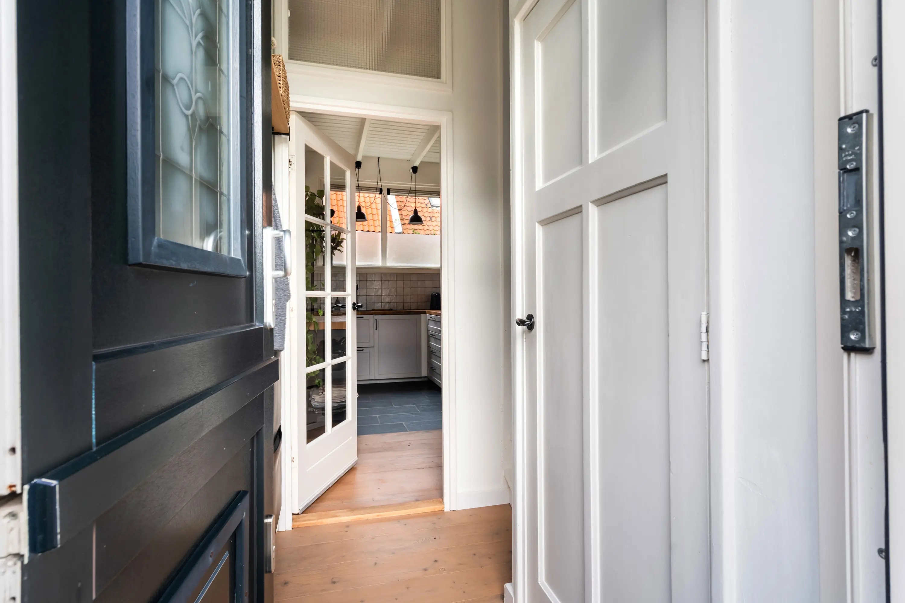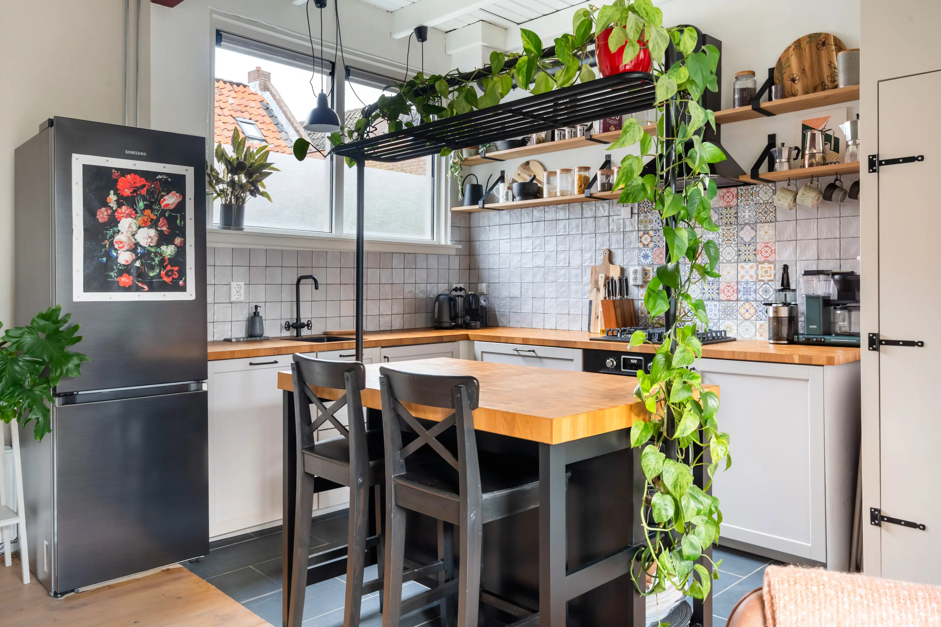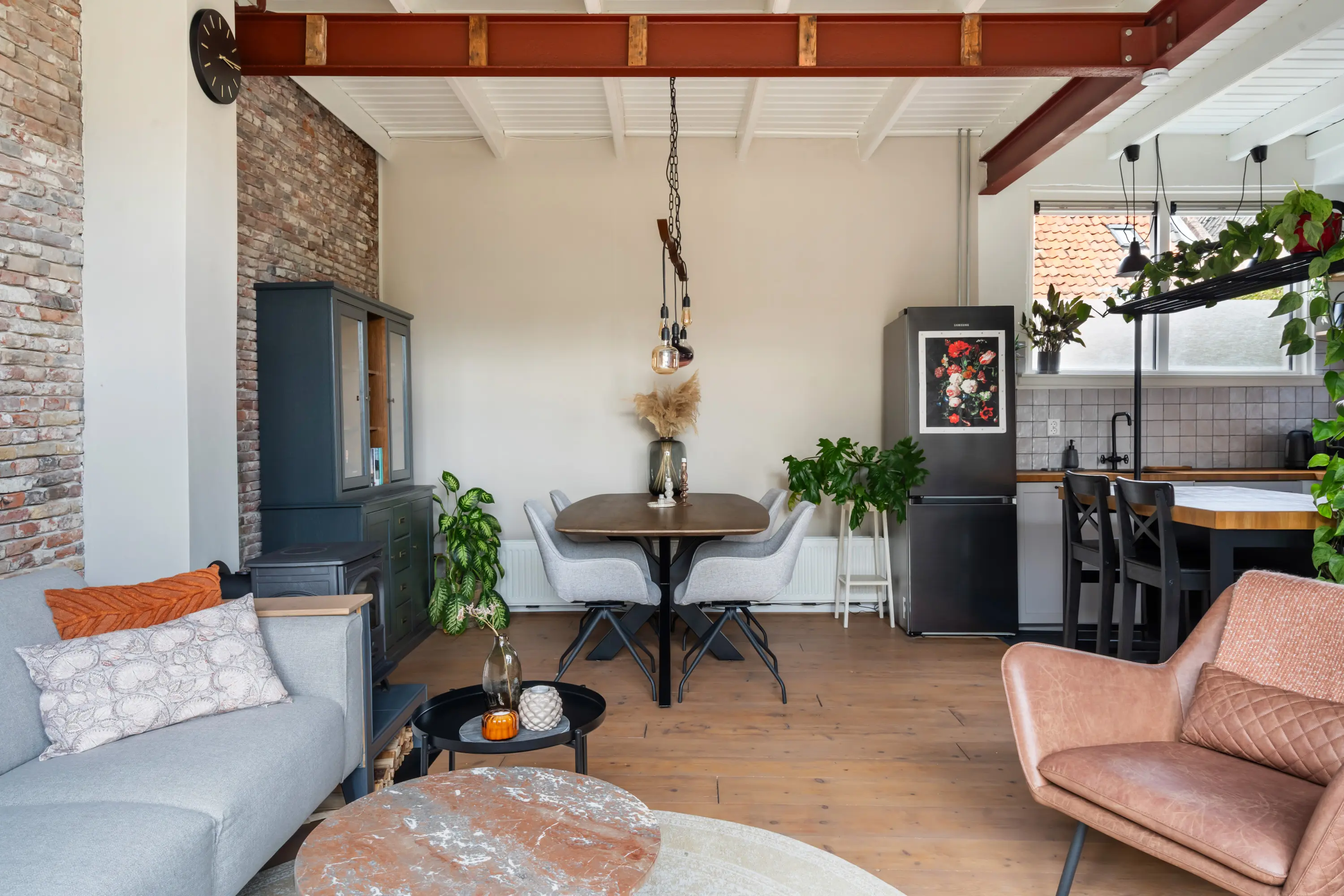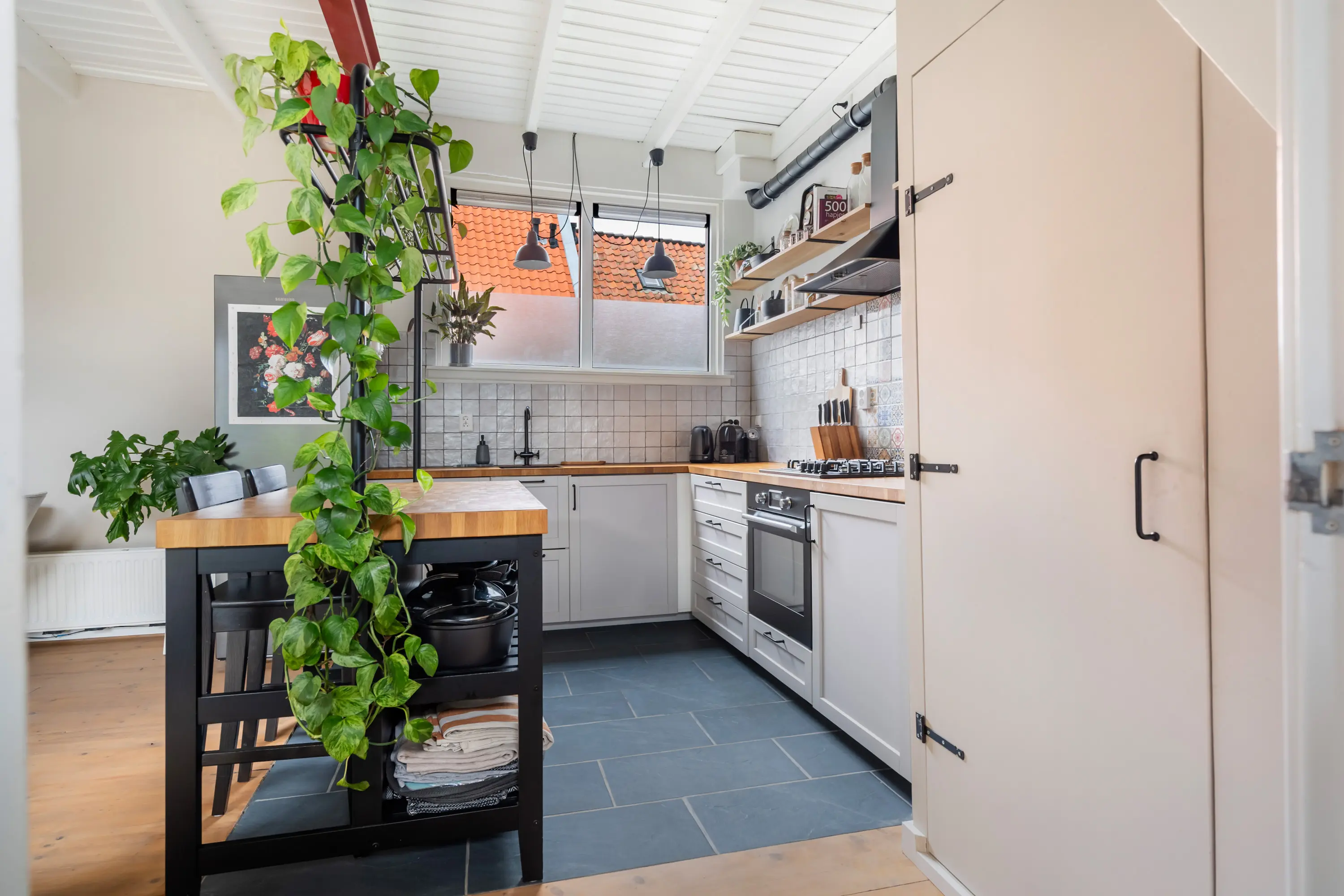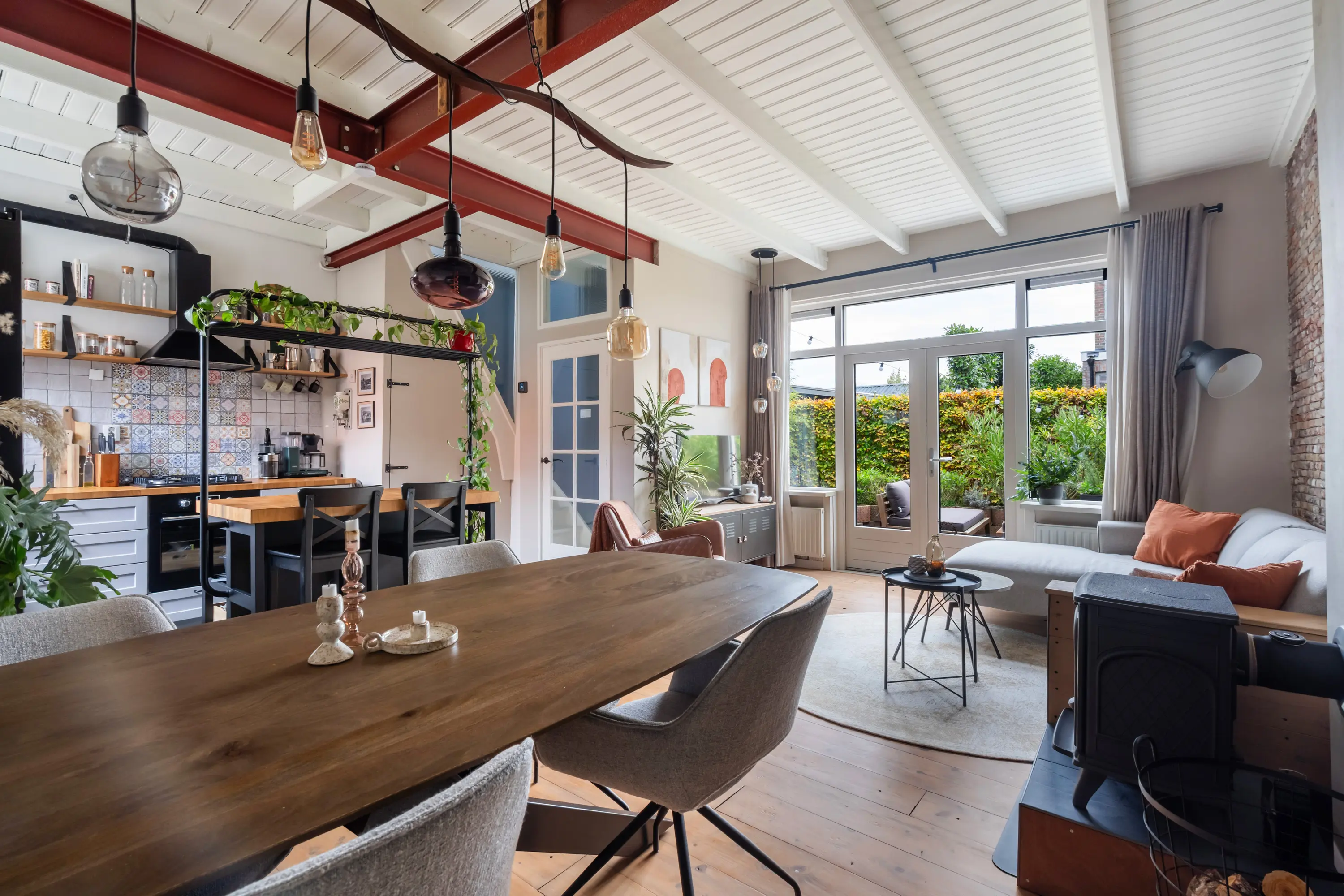 Via de entree kom je in de hal met toilet. De woonkamer ademt direct sfeer dankzij het fraaie metselwerk en de zichtbare balken. De open keuken (2019) sluit hier naadloos op aan en is uitgerust met alle gemakken: een 4-pits gasfornuis, oven, afzuigkap, vaatwasser en – ter overname – een koel-vriescombinatie. Onder de trap bevindt zich een praktische provisie- en meterkast. Vanuit de zithoek geniet je van het uitzicht op de voortuin en het rustige straatje, bereikbaar via openslaande deuren.