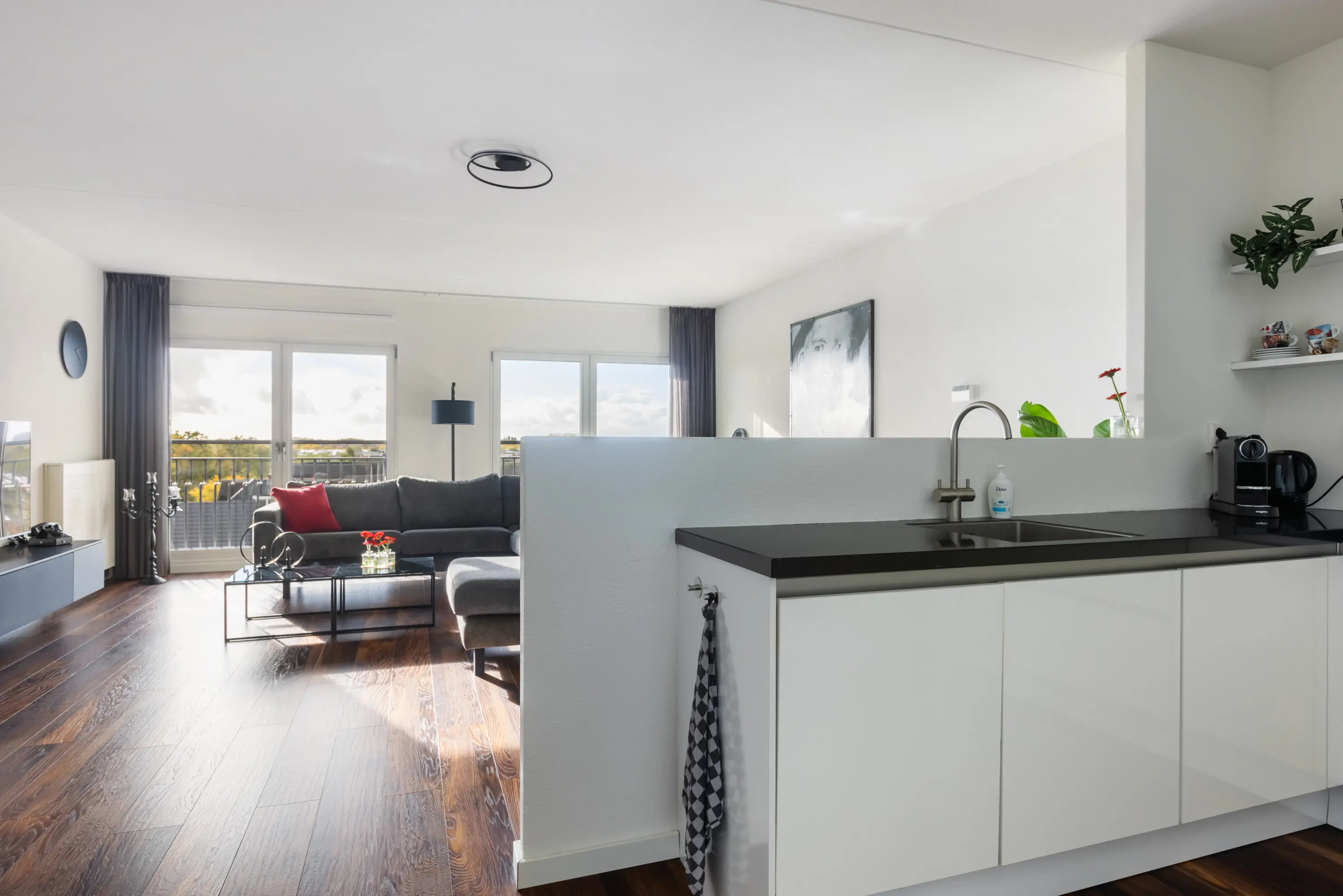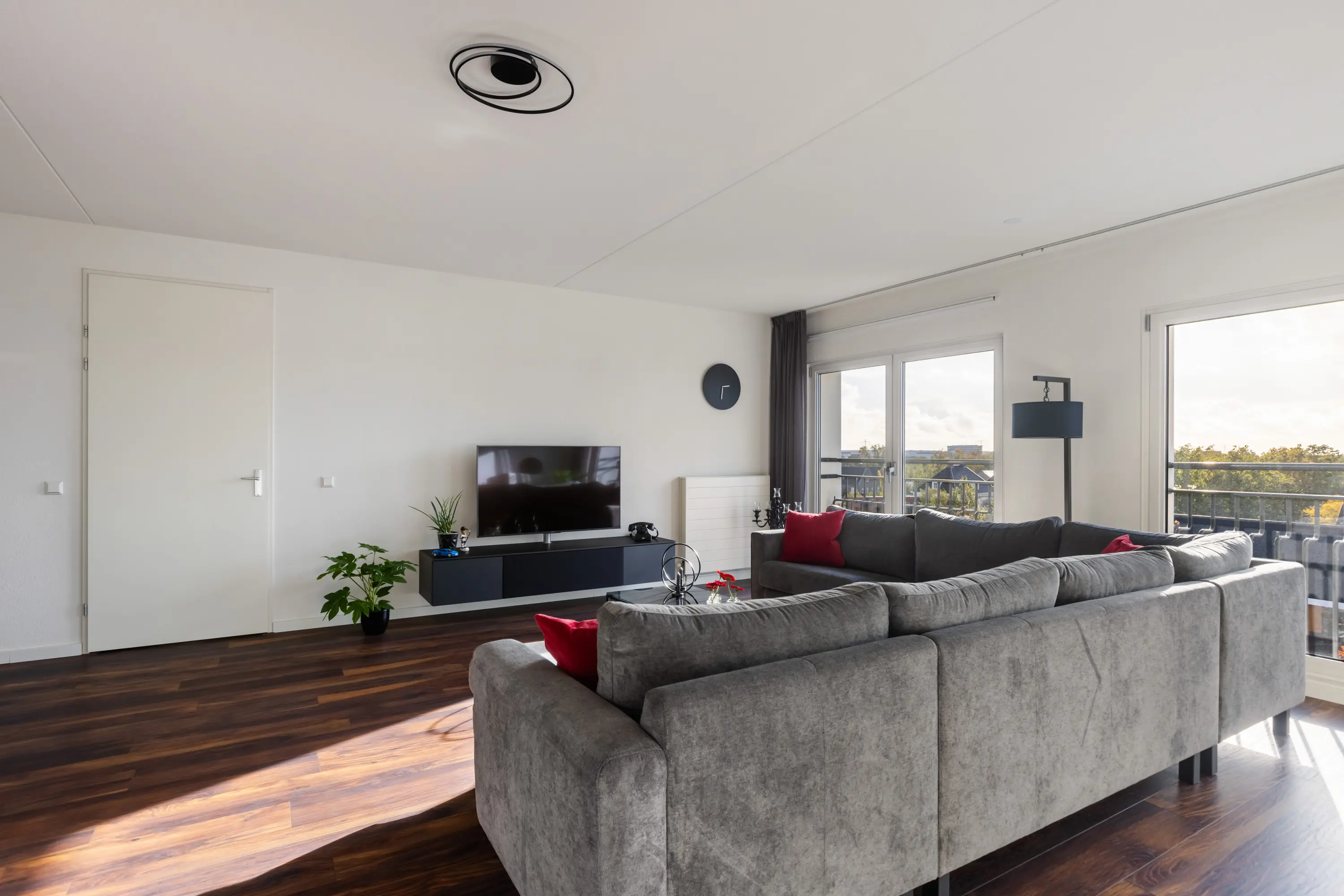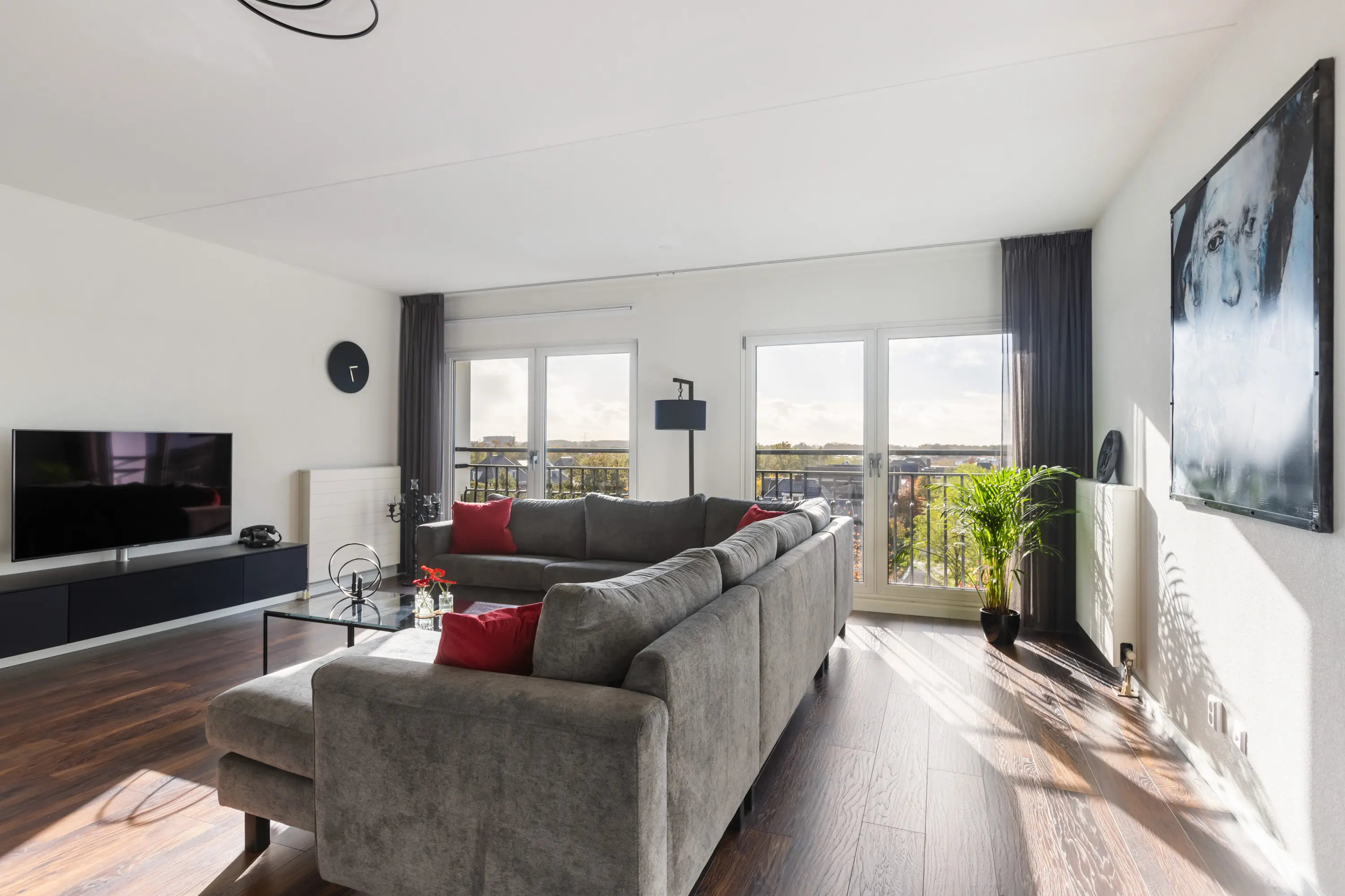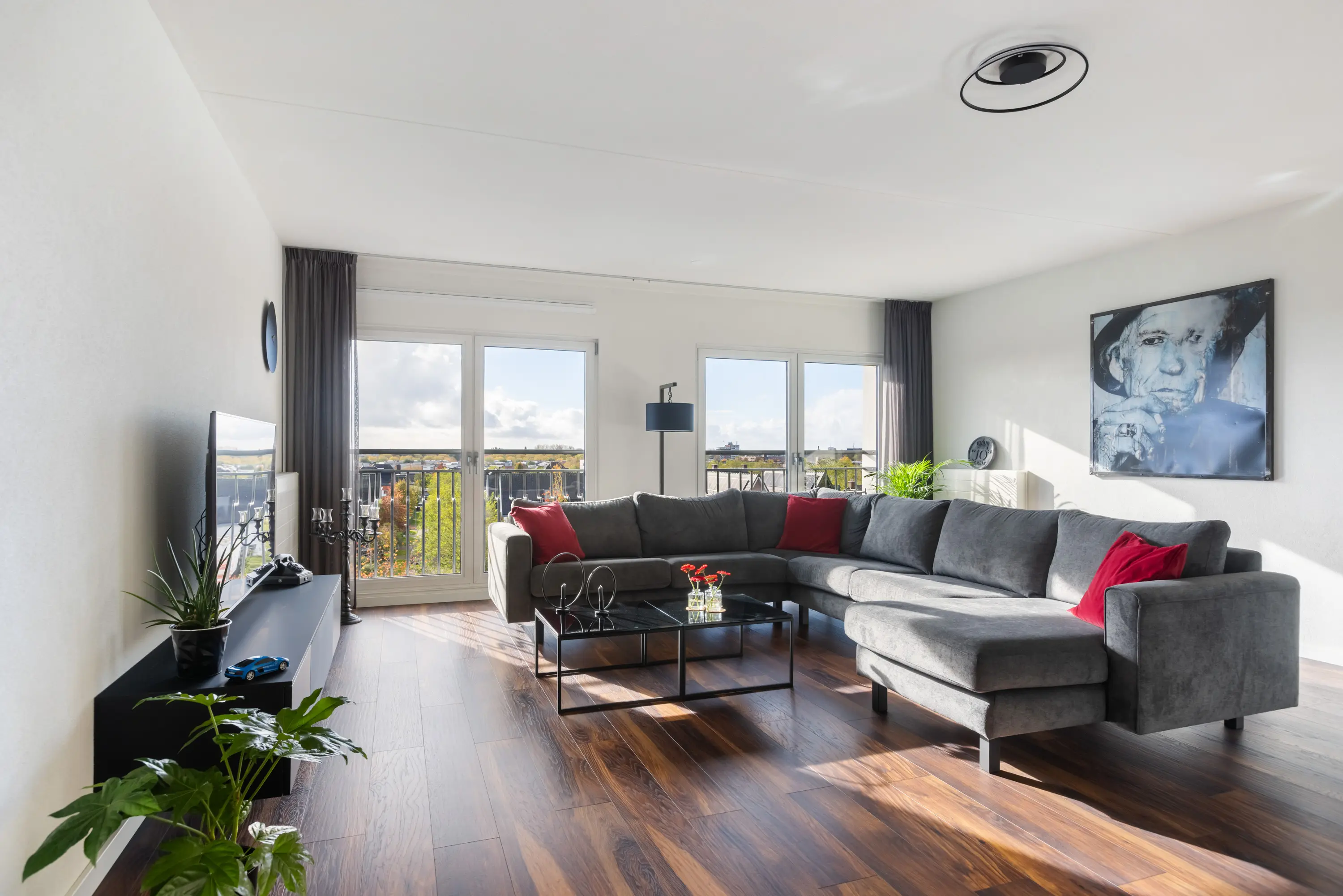 Zowel de woonkamer als de drie slaapkamers zijn voorzien van Franse balkons, gestuukte wanden en een fraaie houtlook laminaatvloer.