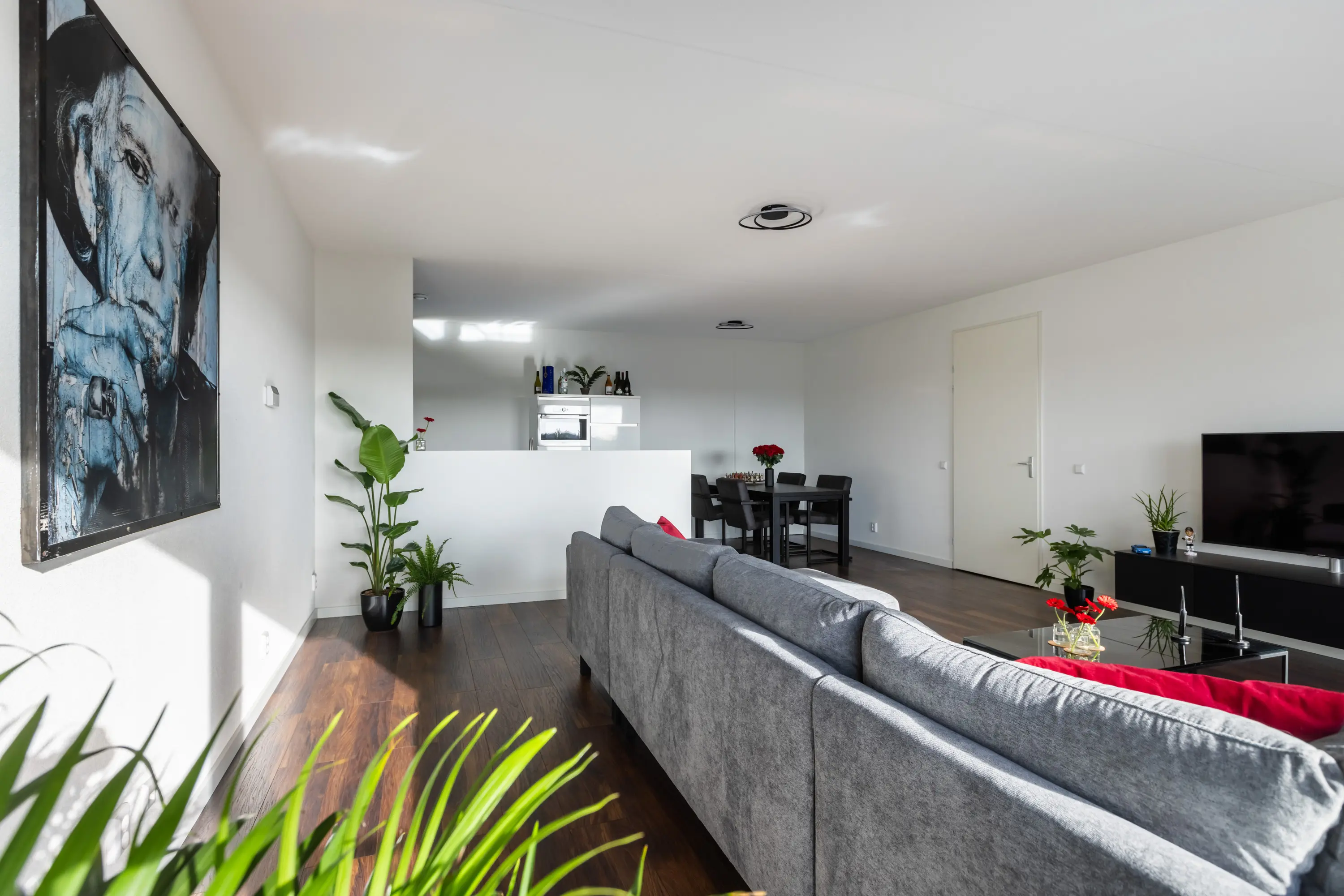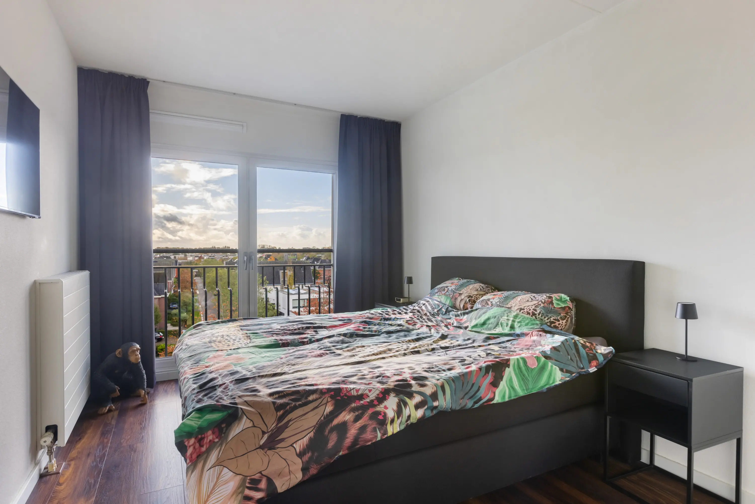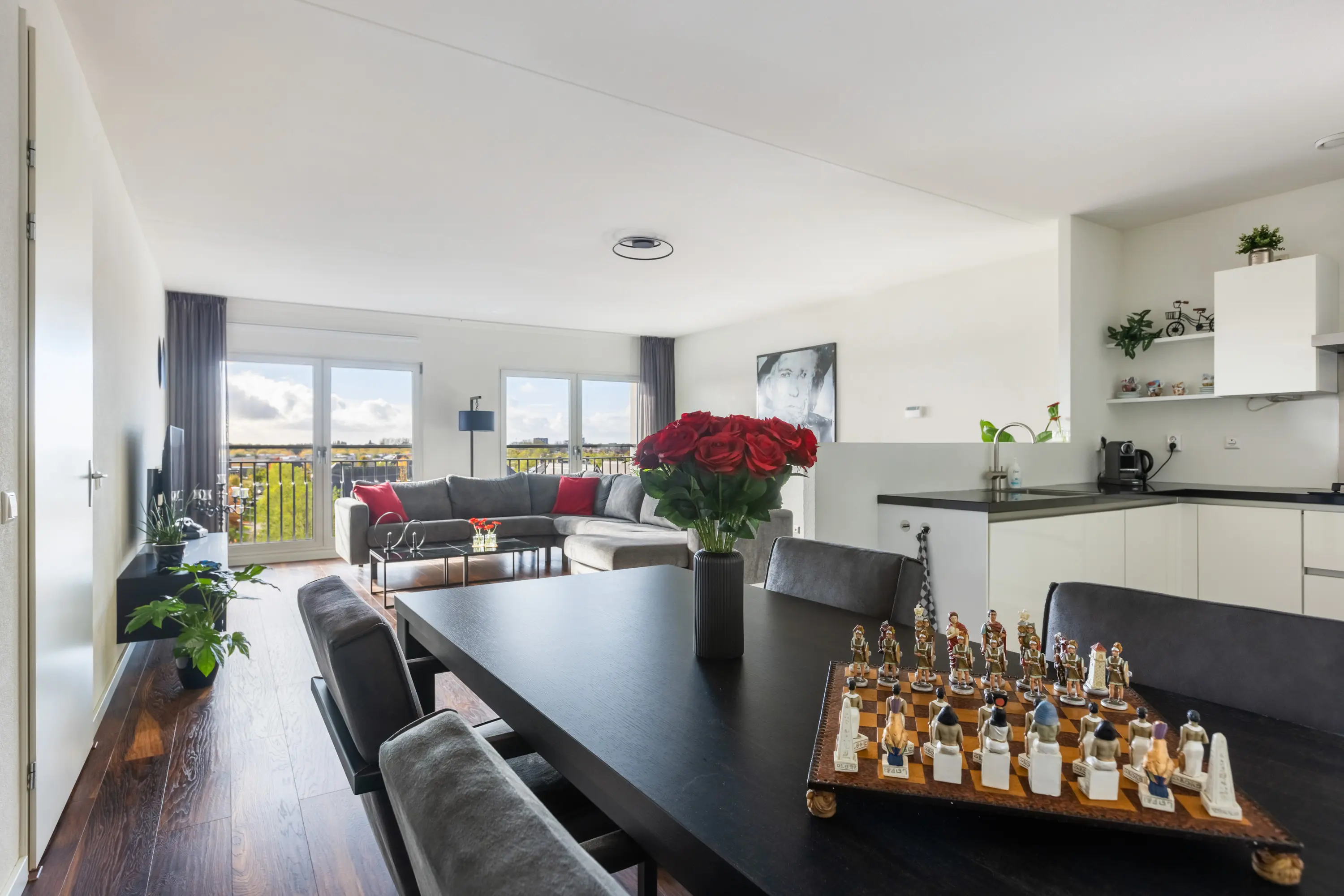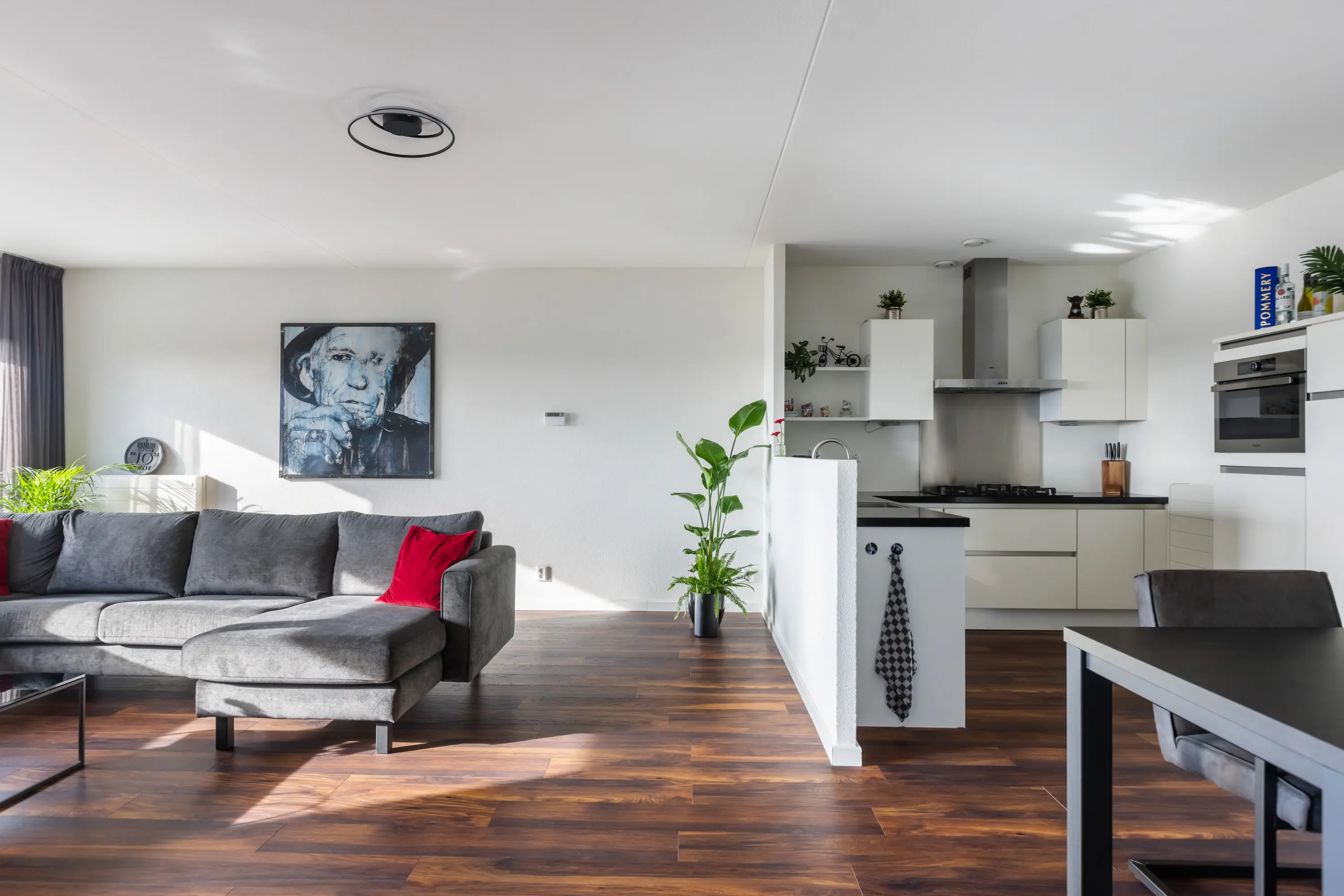 Zowel de woonkamer als de drie slaapkamers zijn voorzien van Franse balkons, gestuukte wanden en een fraaie houtlook laminaatvloer.