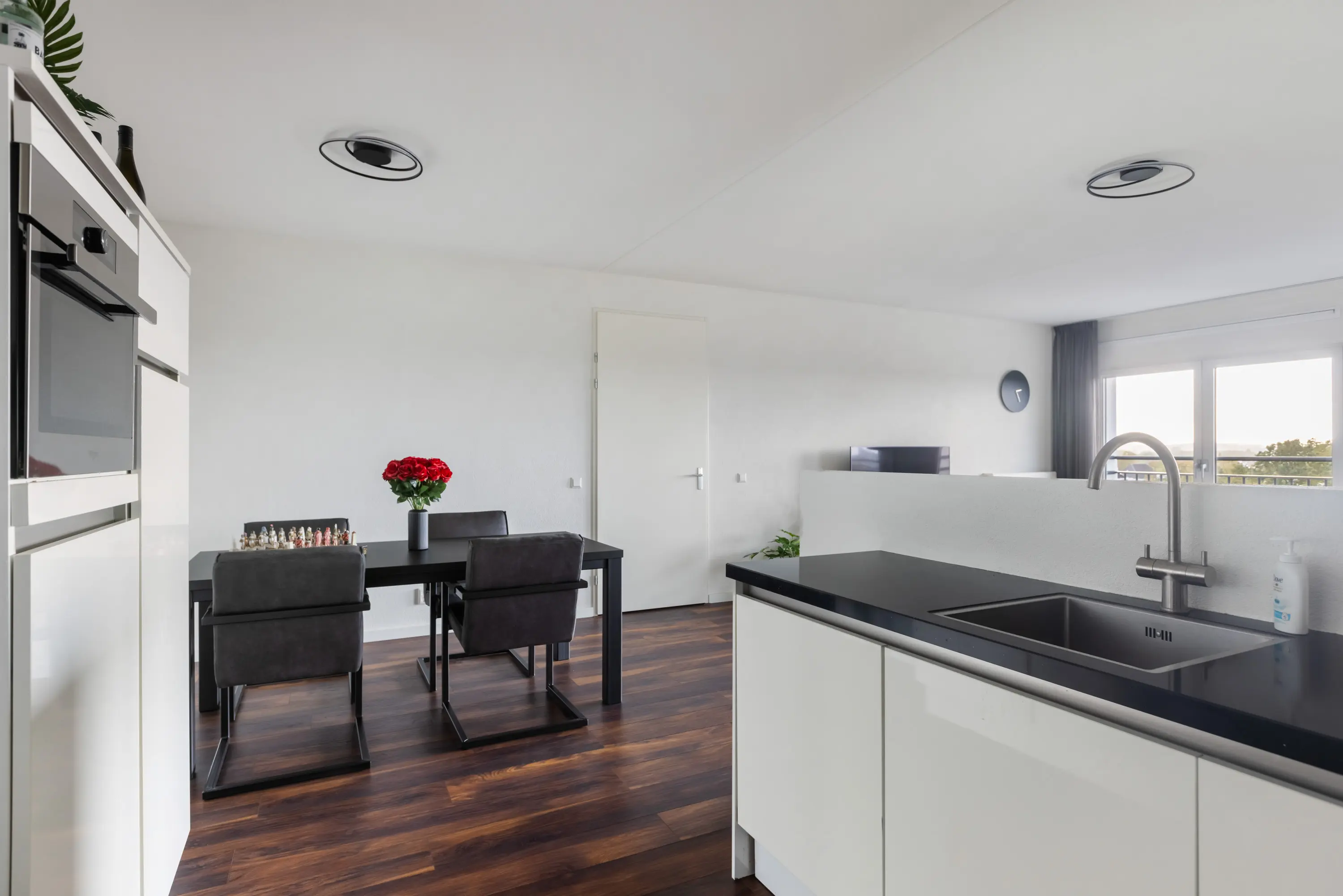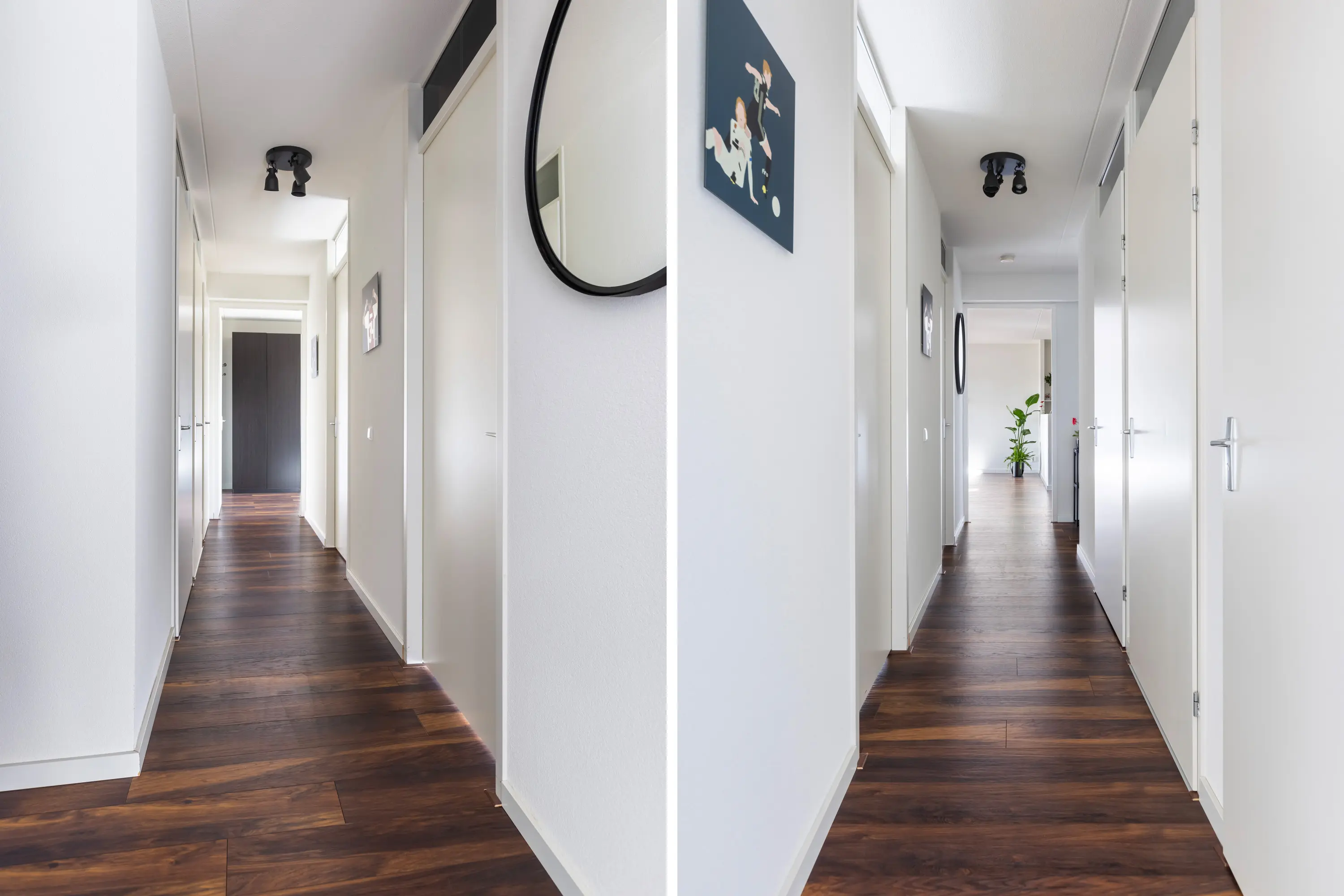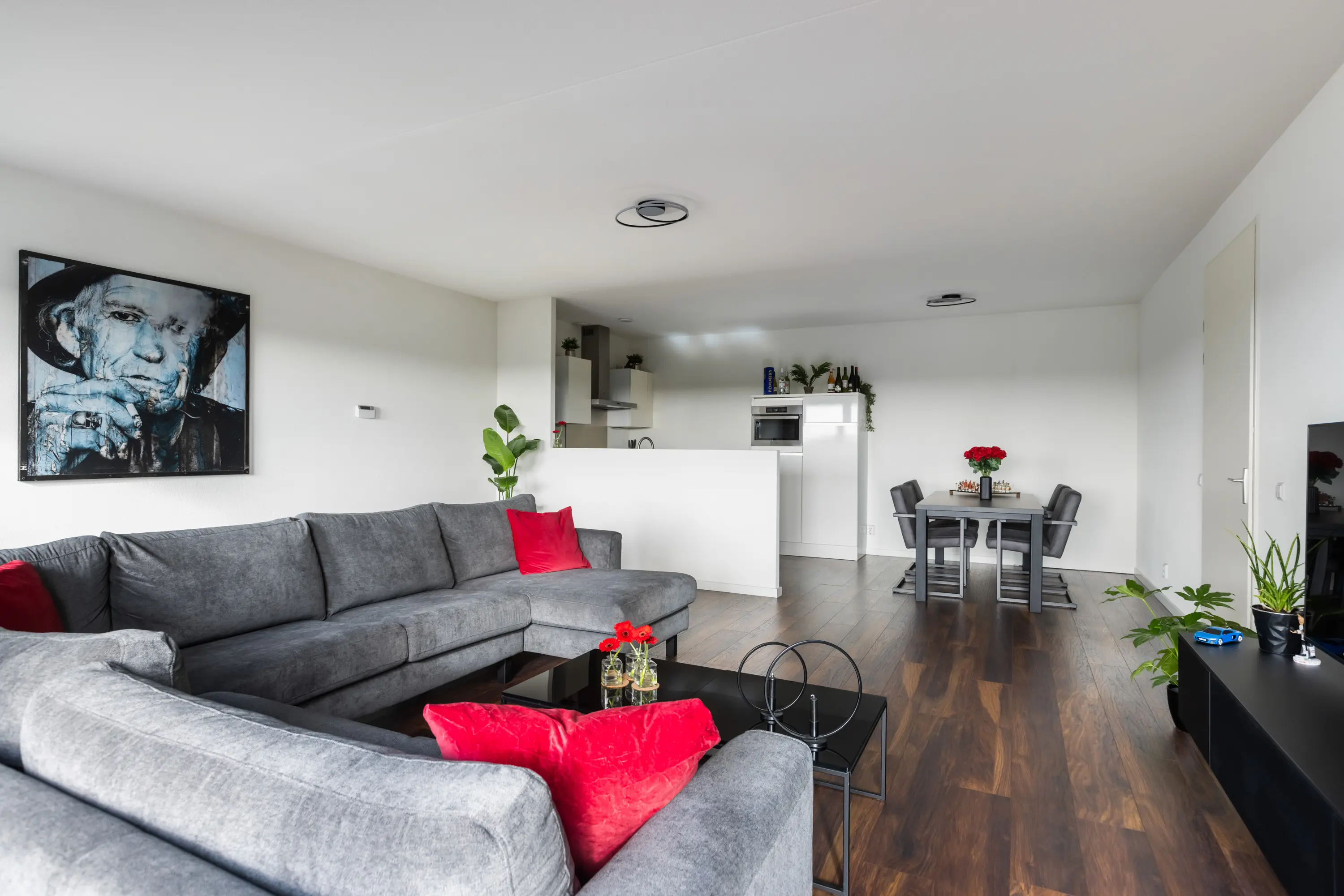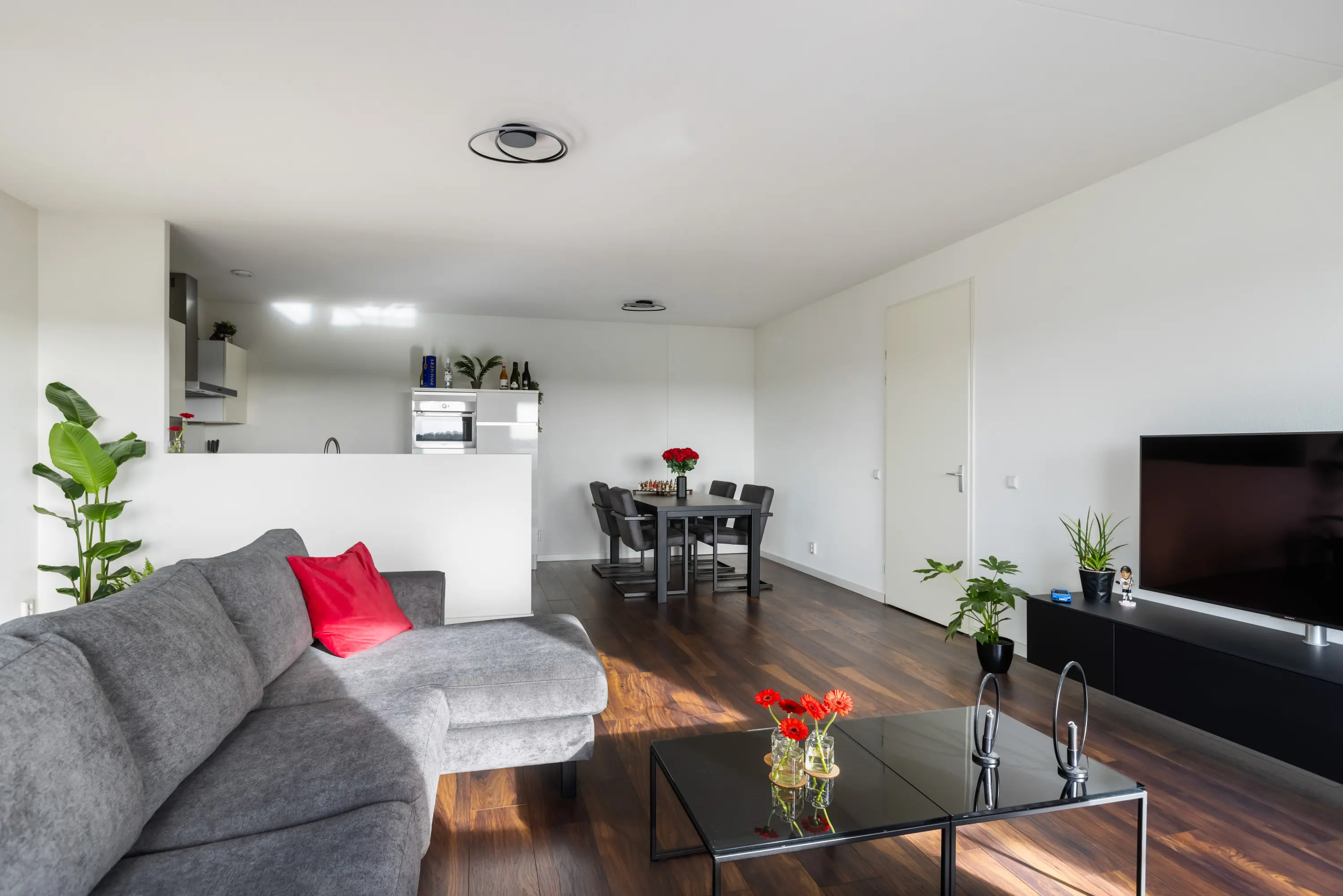 Zowel de woonkamer als de drie slaapkamers zijn voorzien van Franse balkons, gestuukte wanden en een fraaie houtlook laminaatvloer.