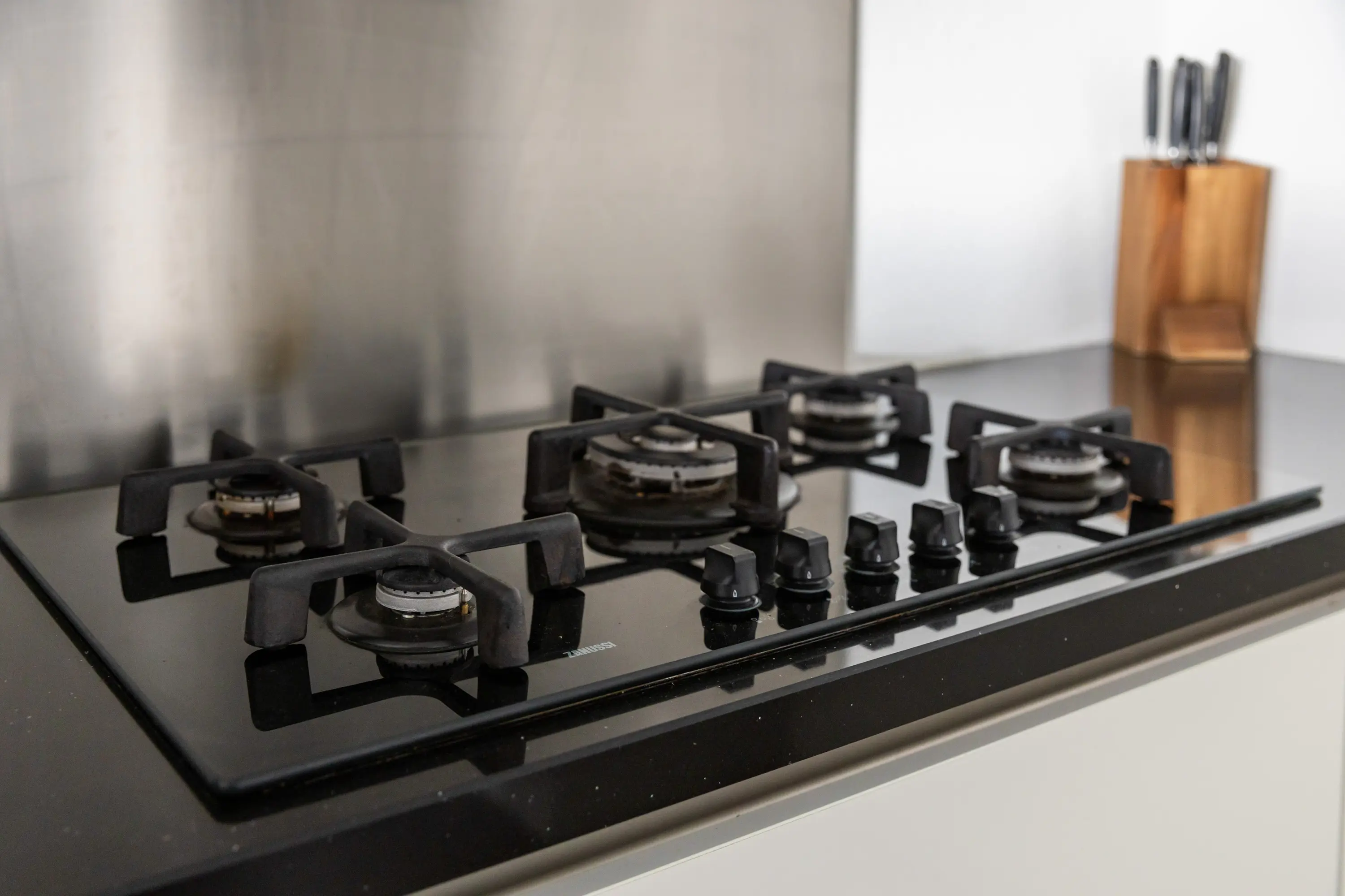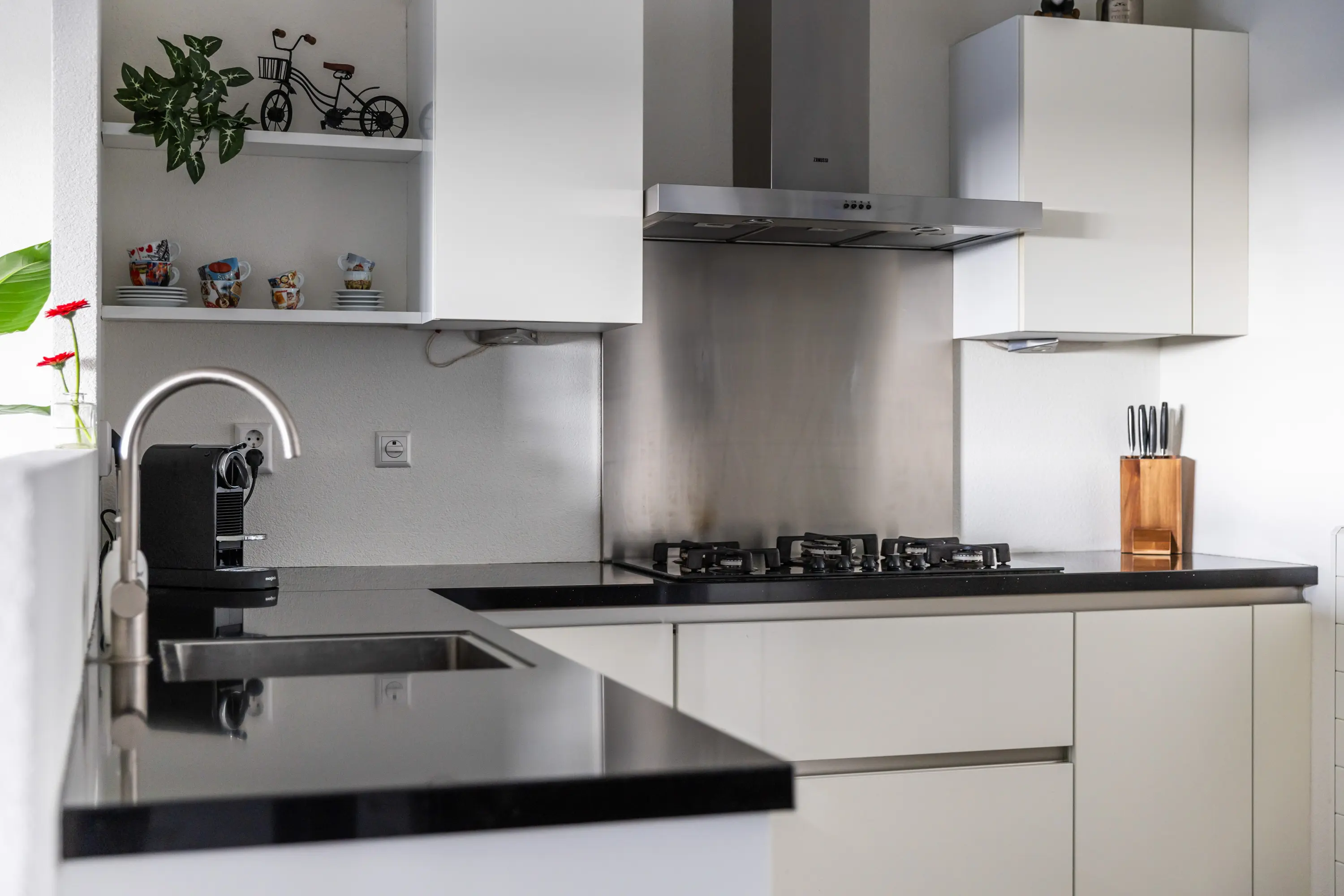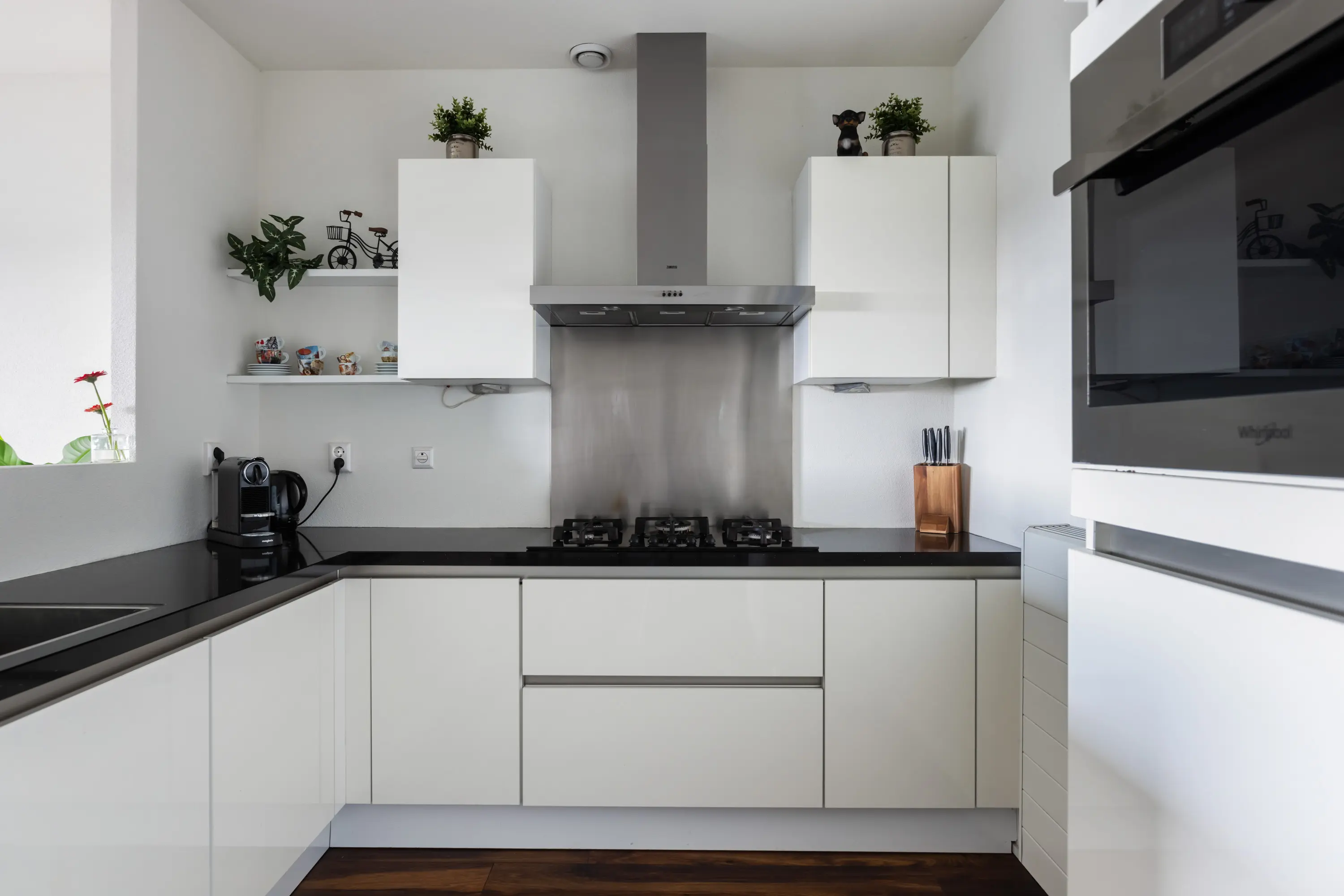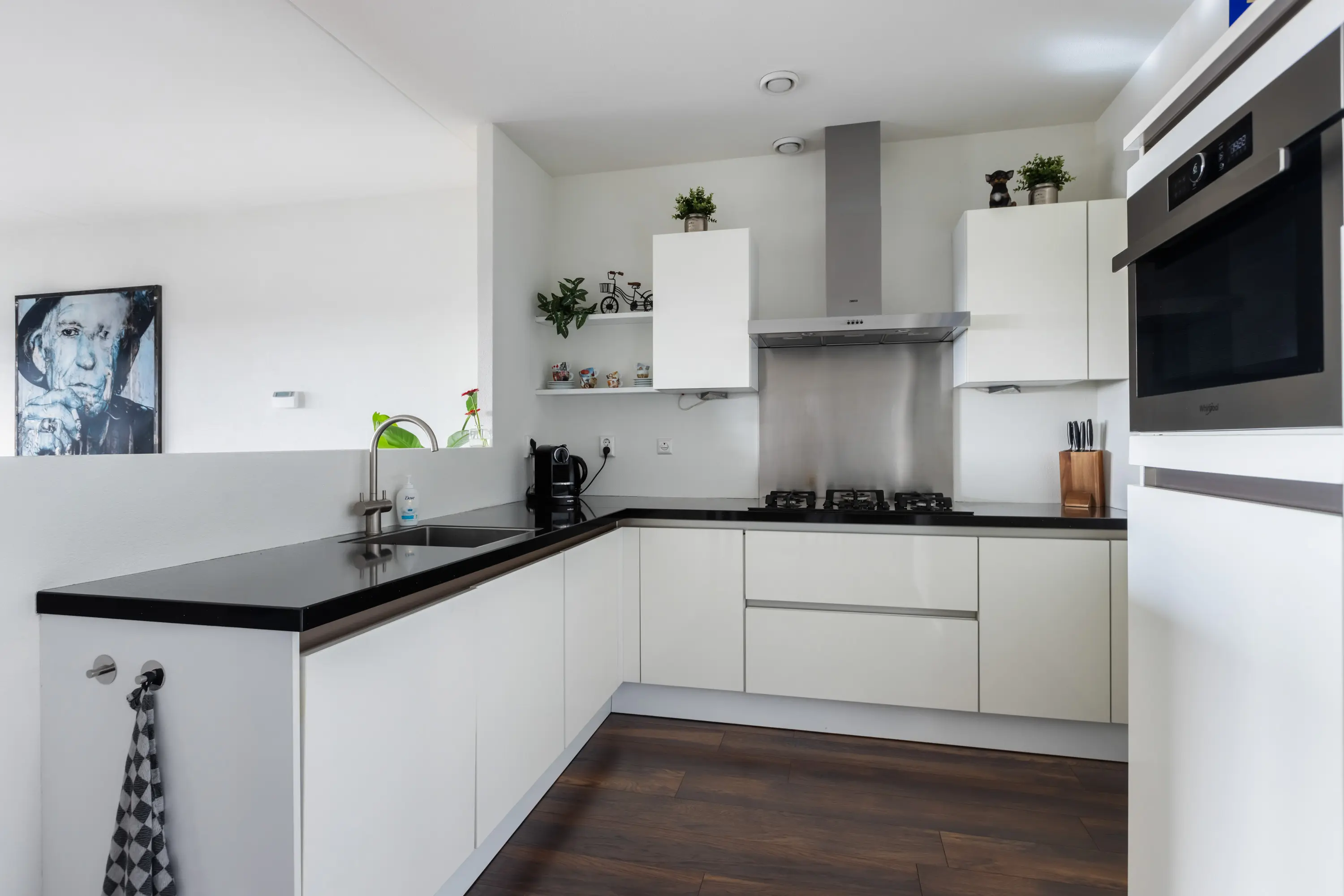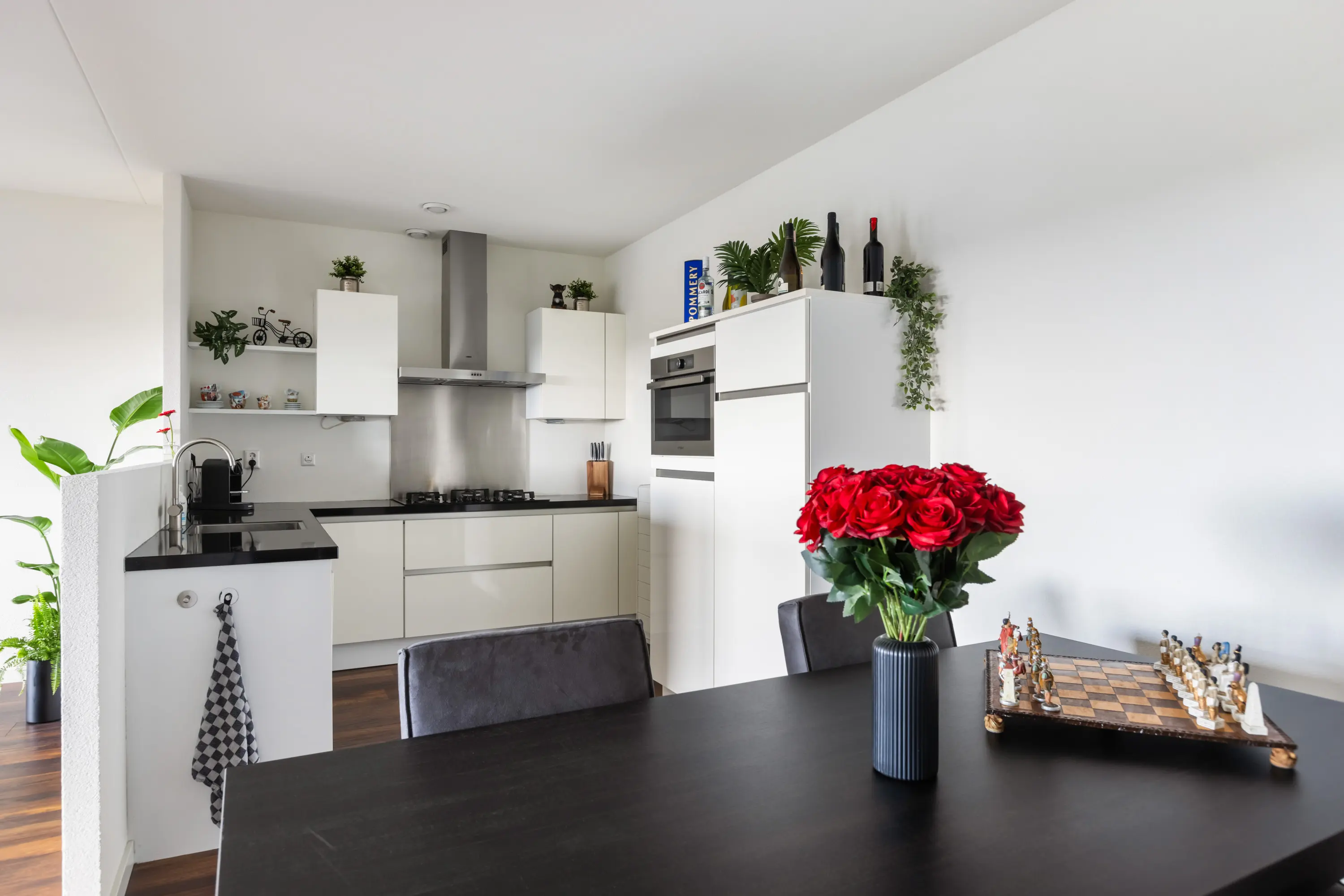 De hoekkeuken is modern en compleet uitgerust met een gas-op-glas kookplaat, afzuigkap, combi-oven/magnetron, koelkast, vriezer en vaatwasser.
